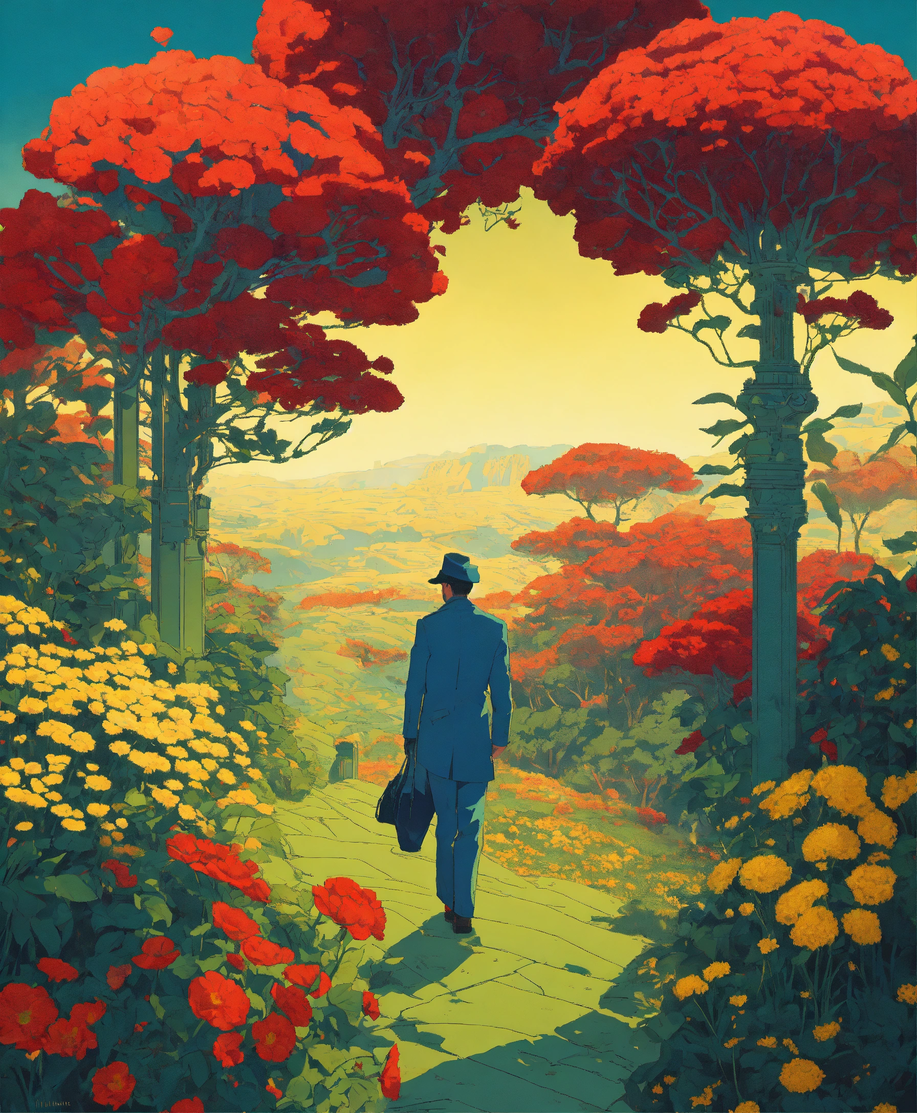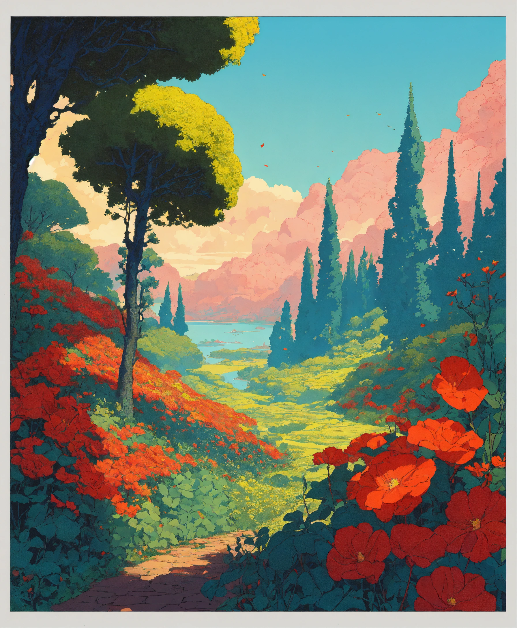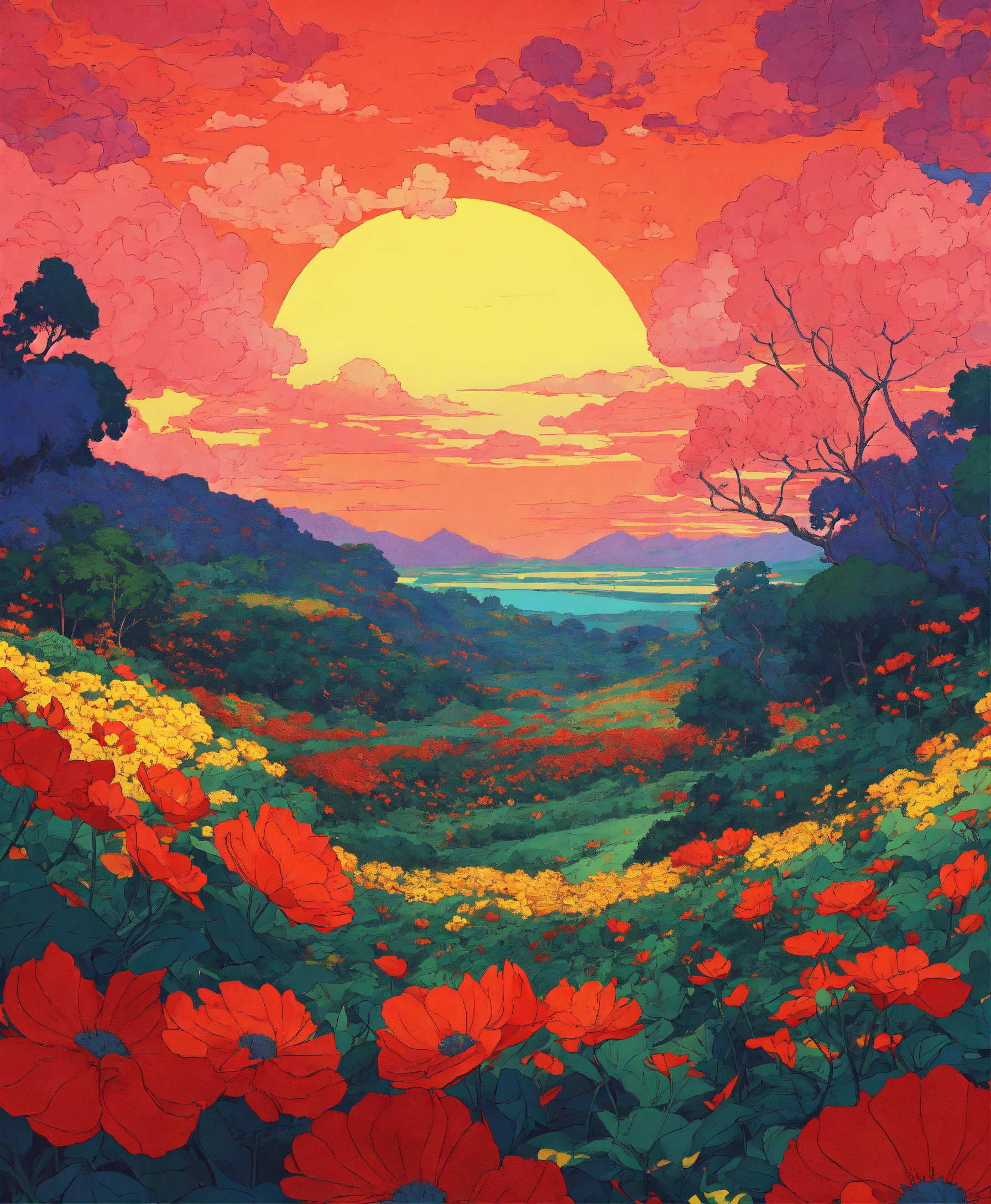 Beautiful and lush landscape with big blue, yellow and red flowers, green leaves, by kilian eng, dynamic lighting, digital art, art by james jean, inkpunk minimalism