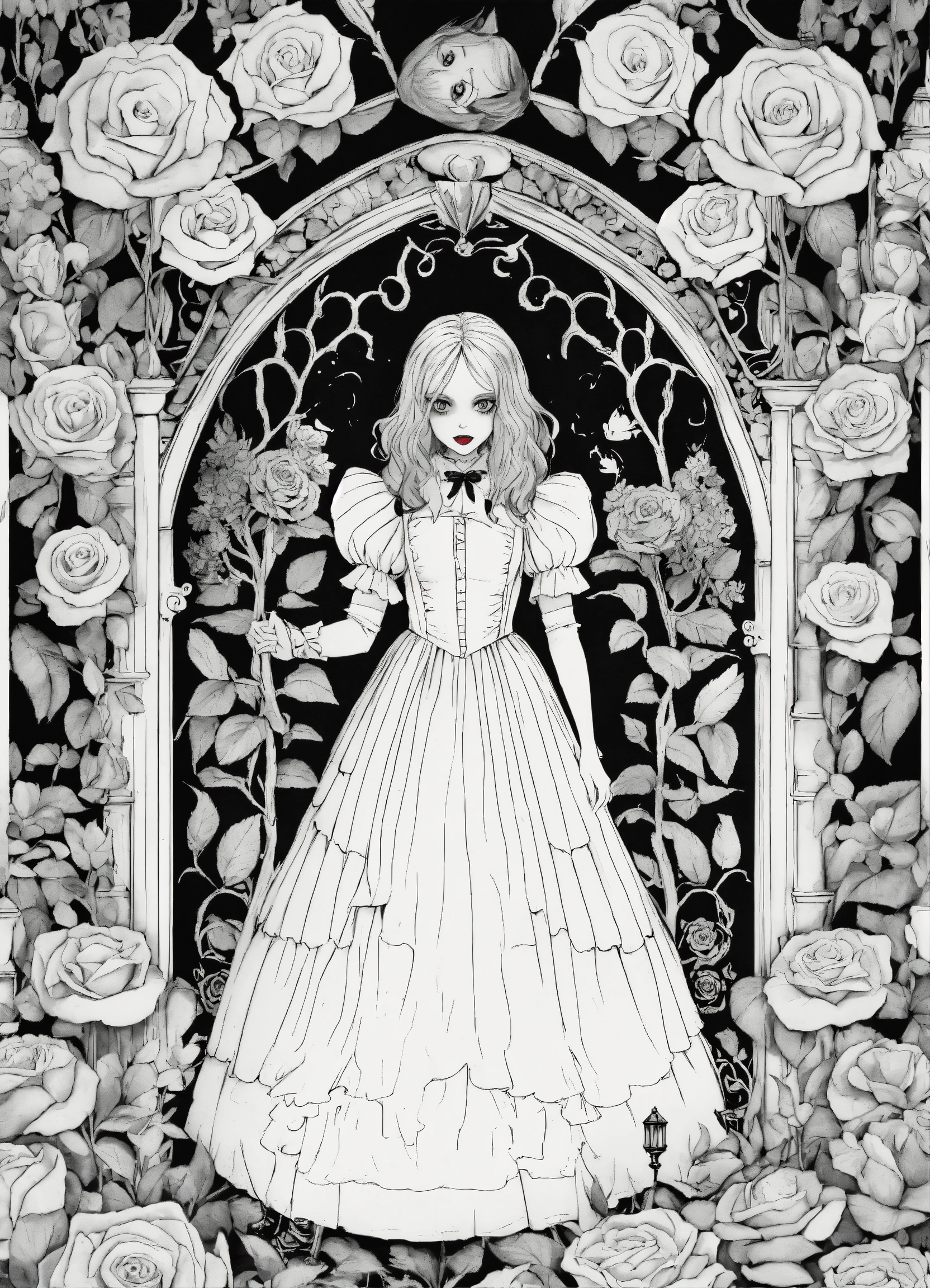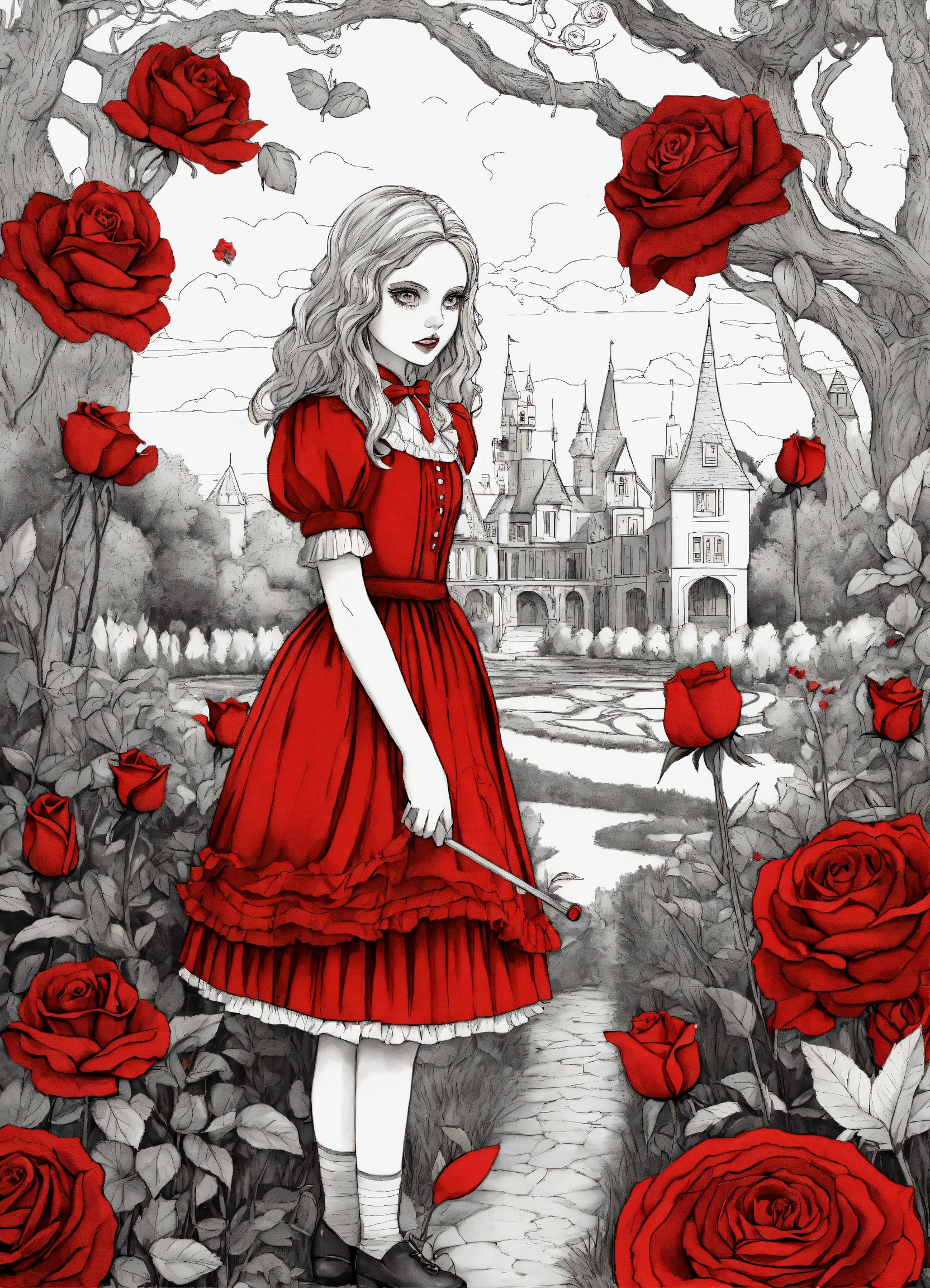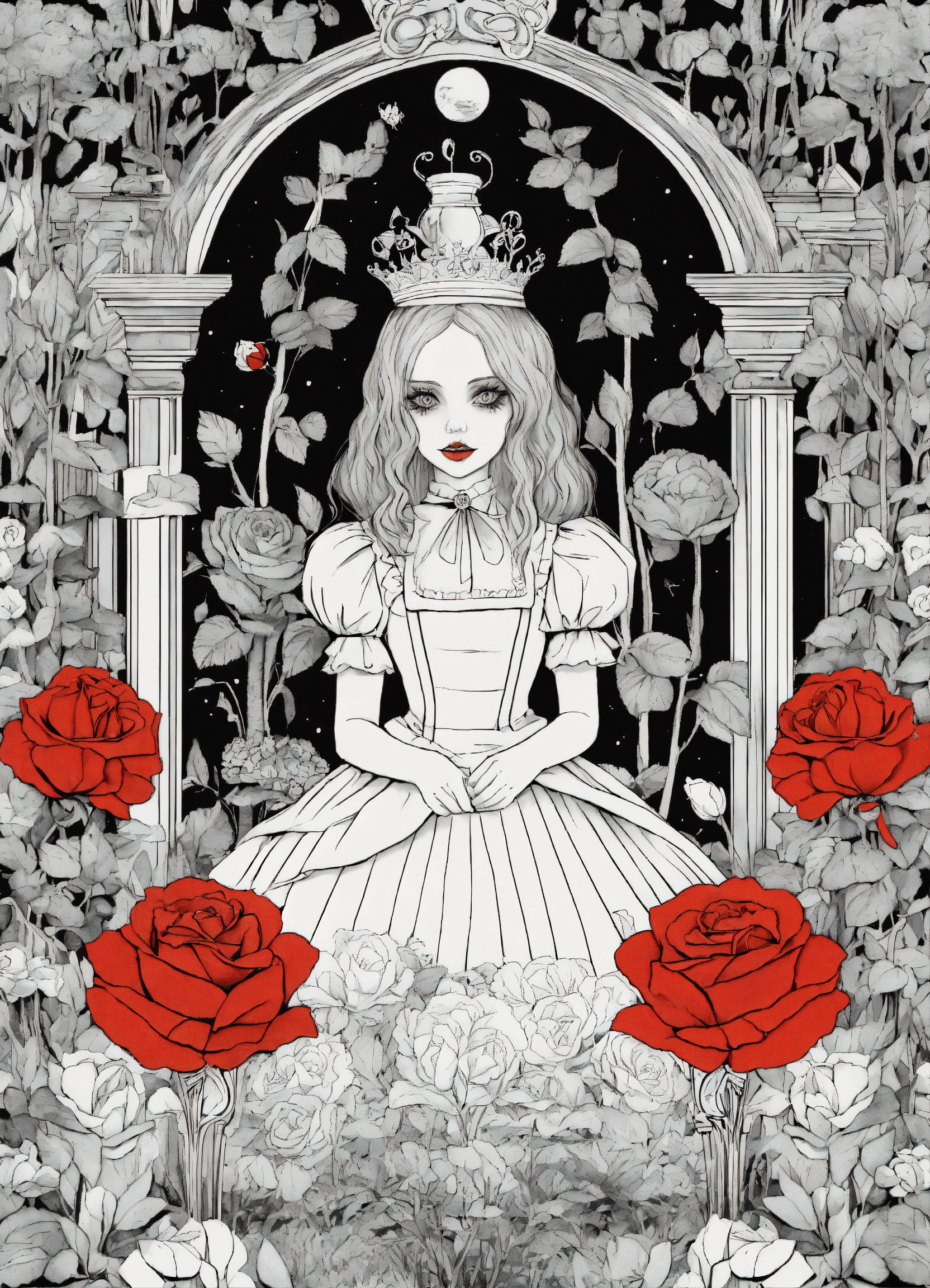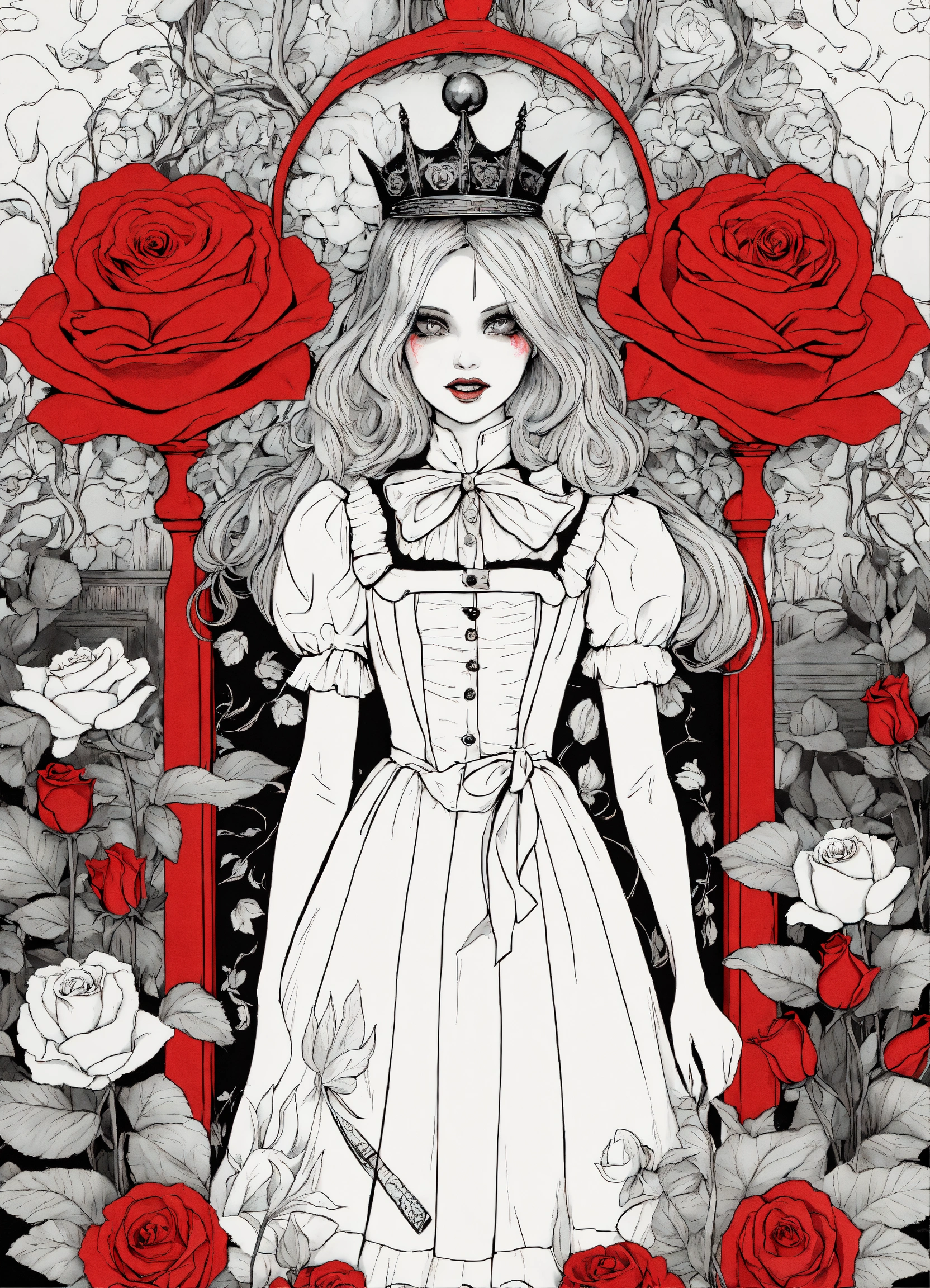 Creepy coloring book for adults, black and white, alice's adventures in wonderland, rose garden with red queen, terrifying.
