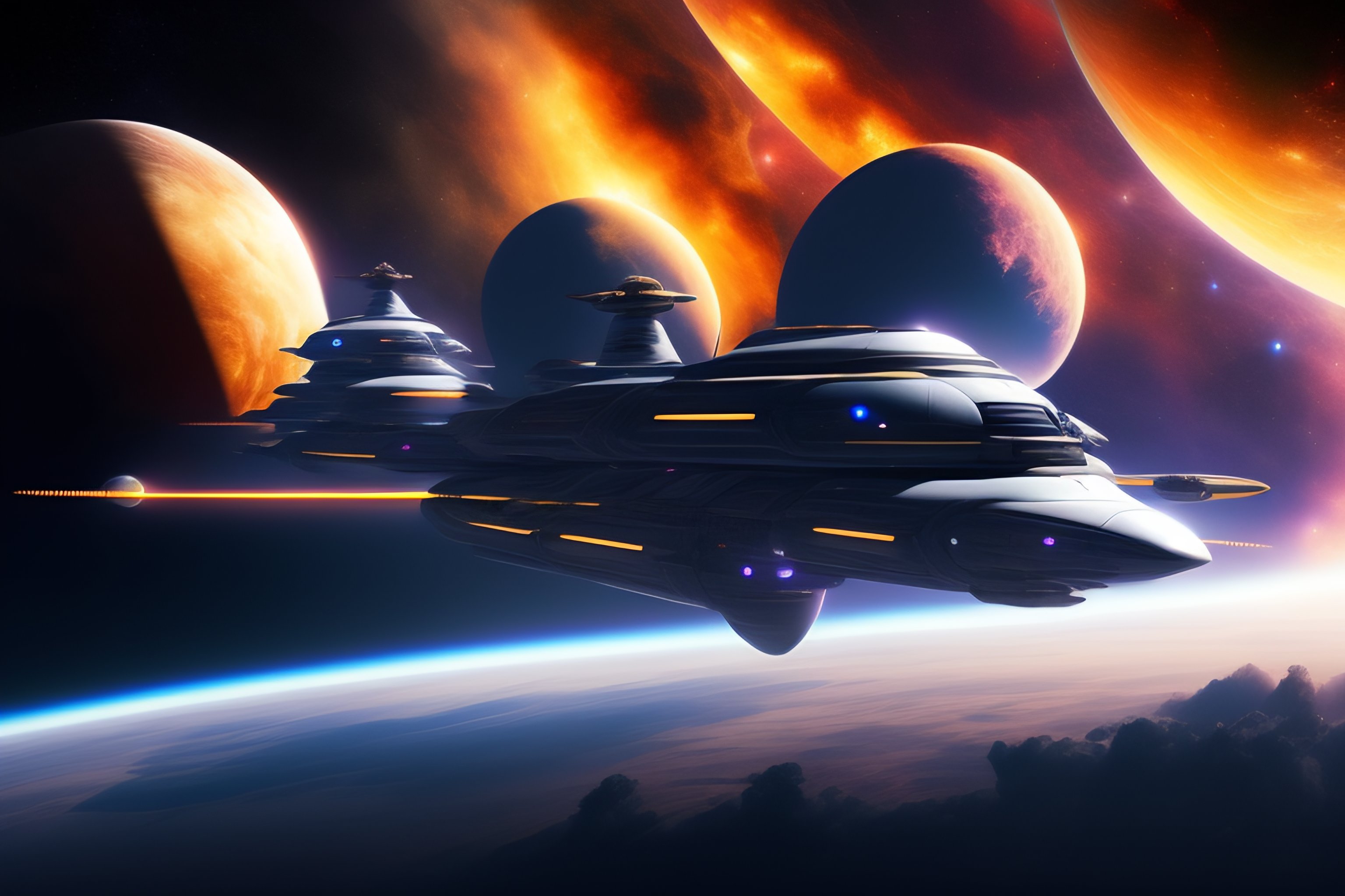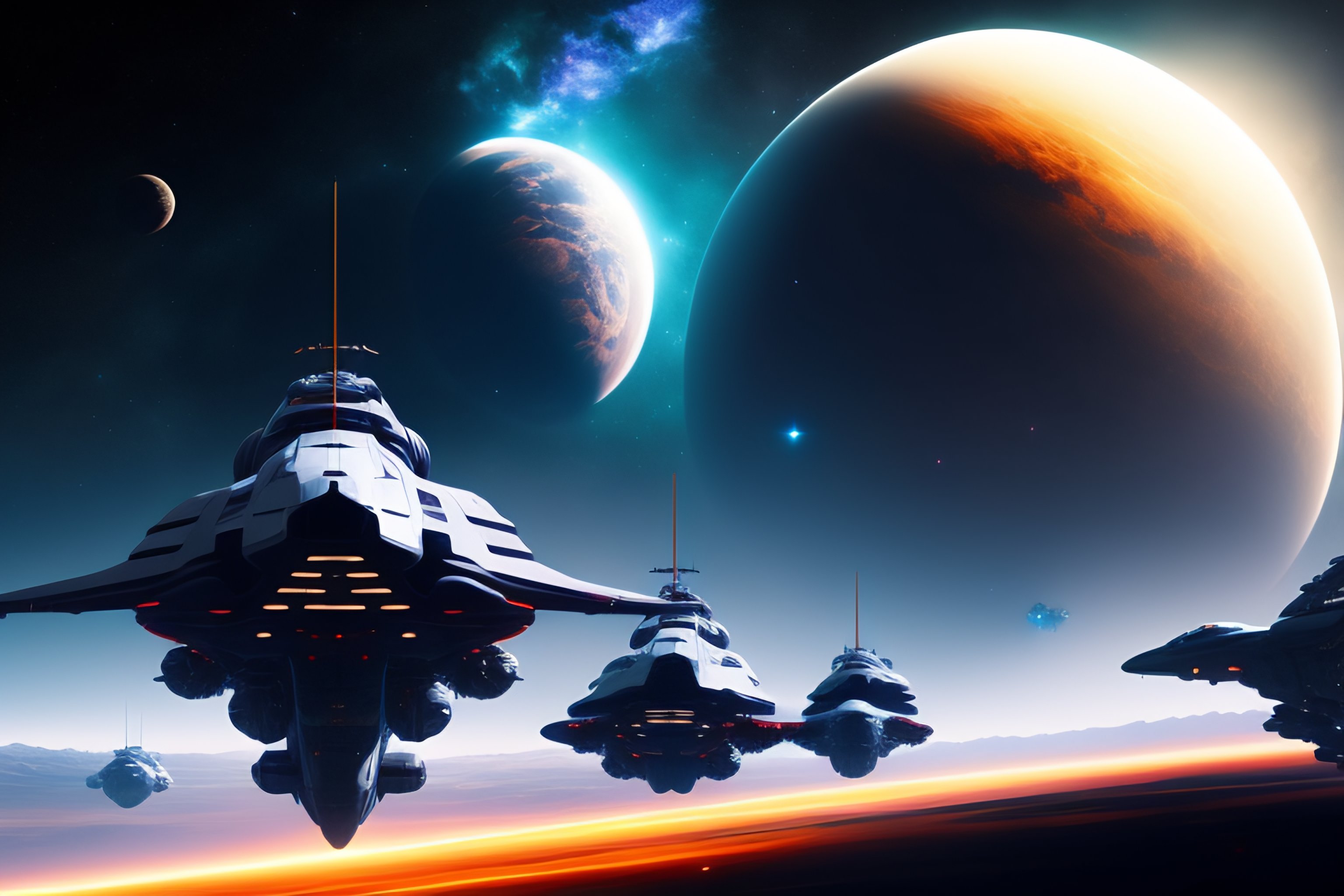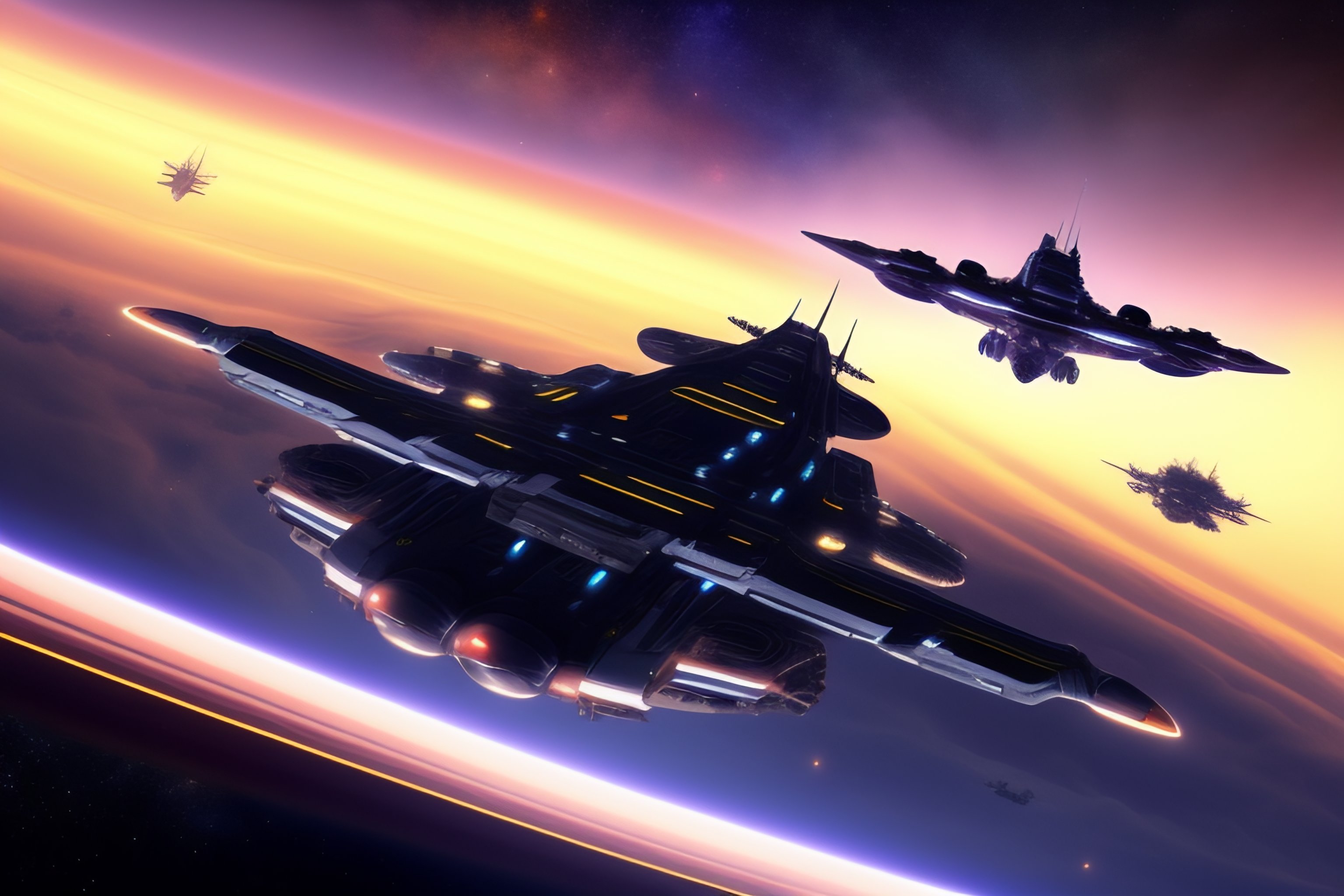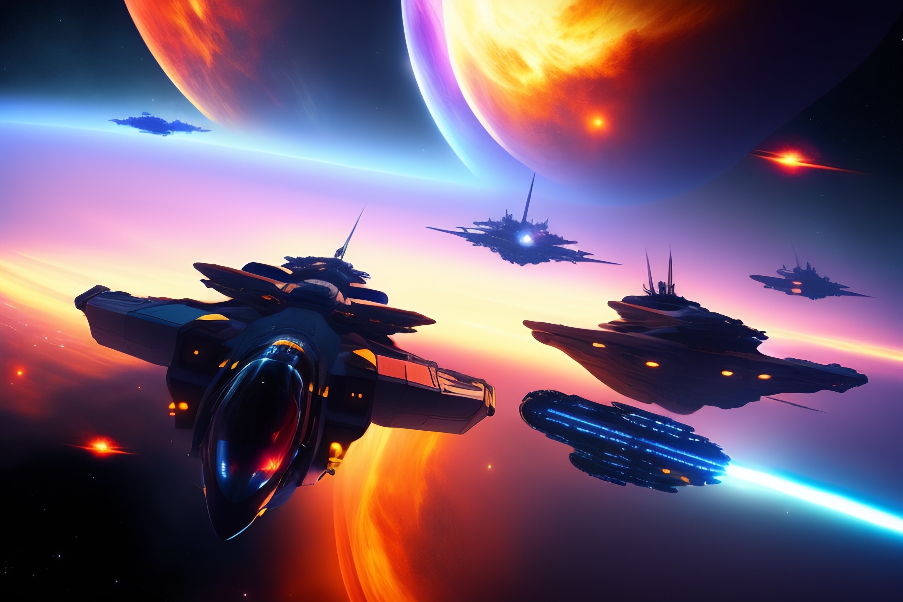 Space battle in combat realistic multiple space fighter ships with bigger ships in background