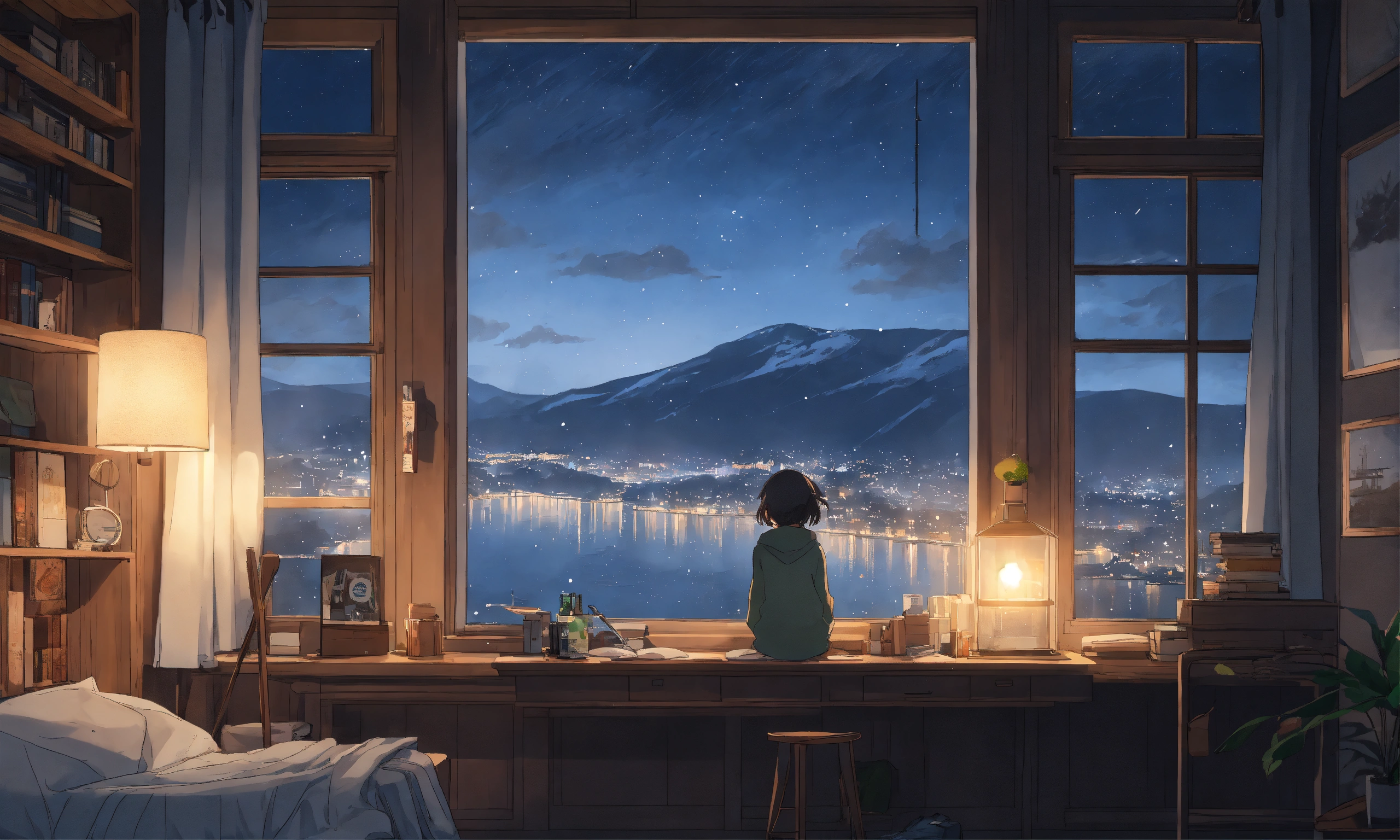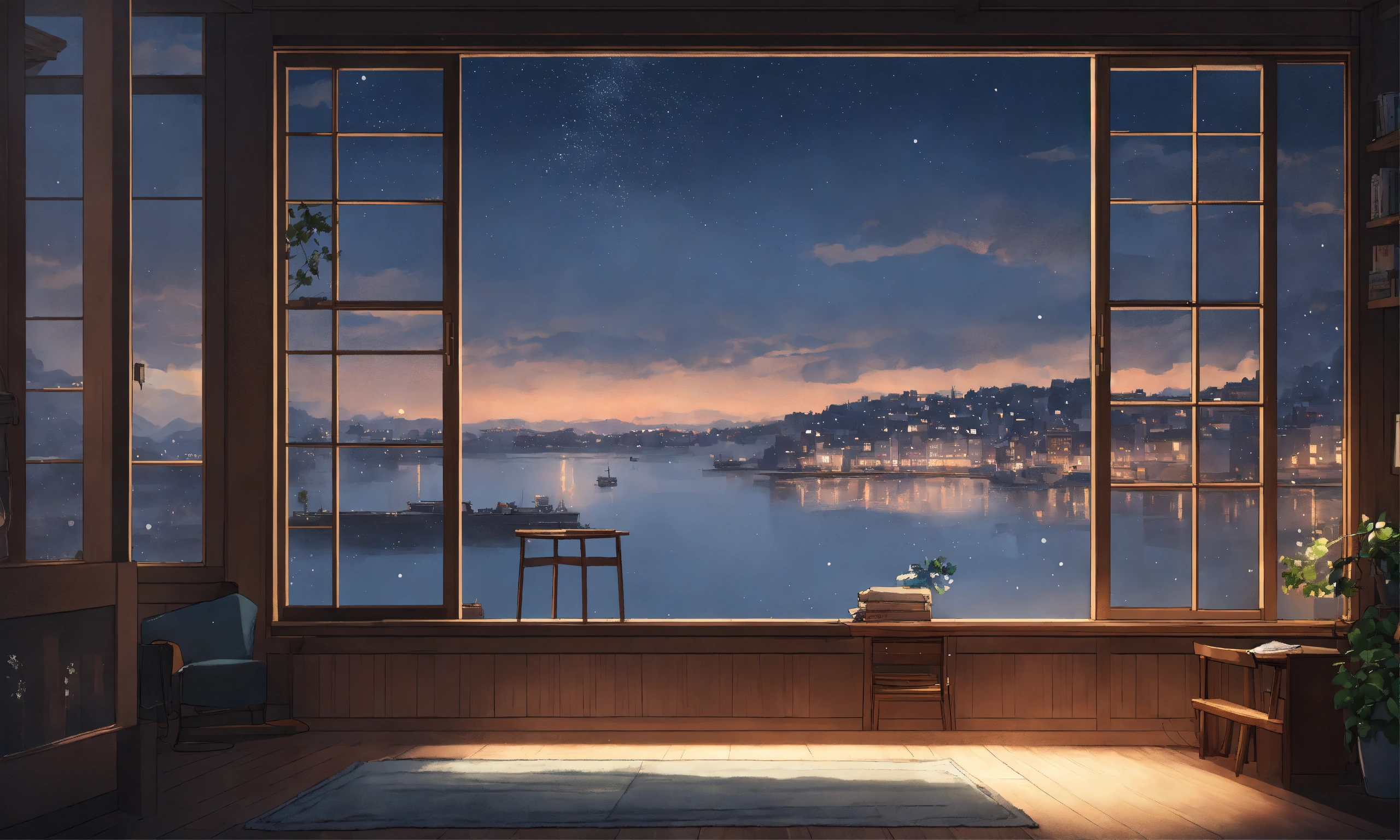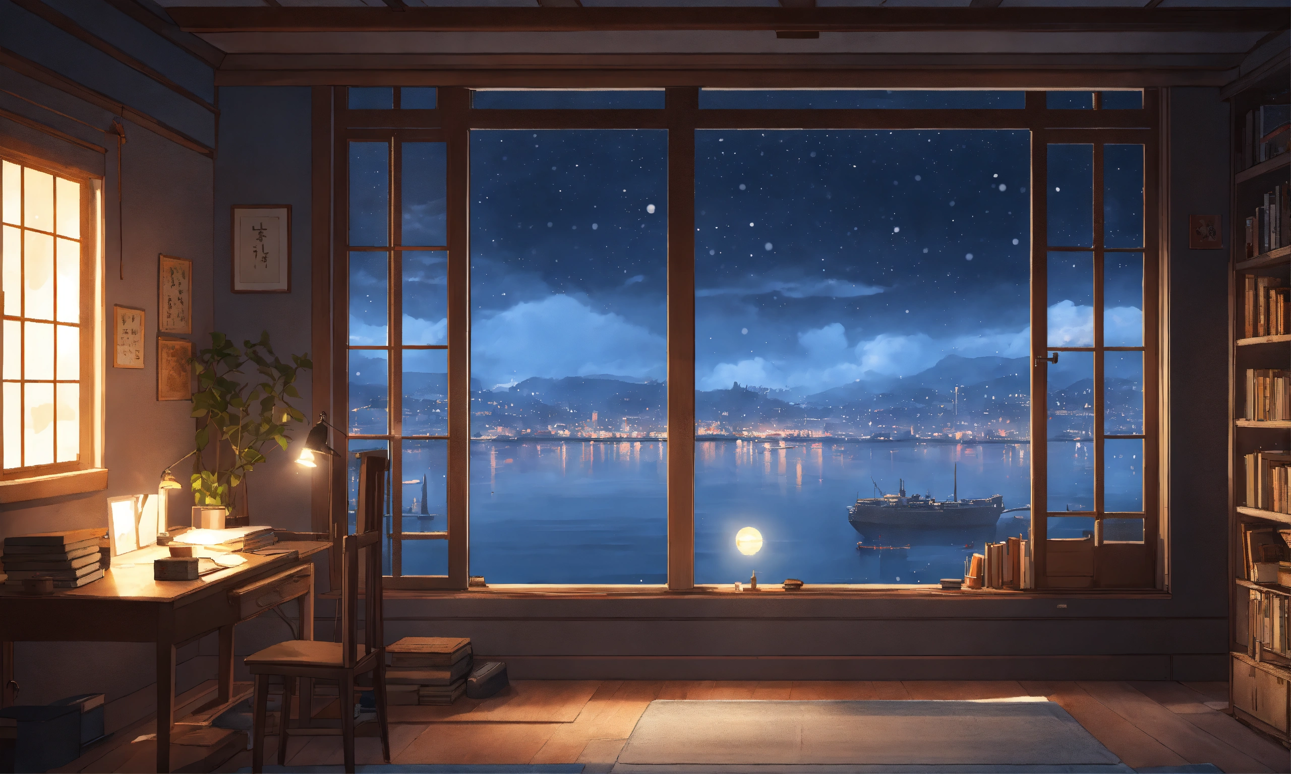 Cozy study room, studio ghibli, minimalistic, grey washed wooden colors, clearn night sky, big centered window with view of harbour and lake with city buildings, snowing outside, winter night, anime/lofi style, minimalistic design