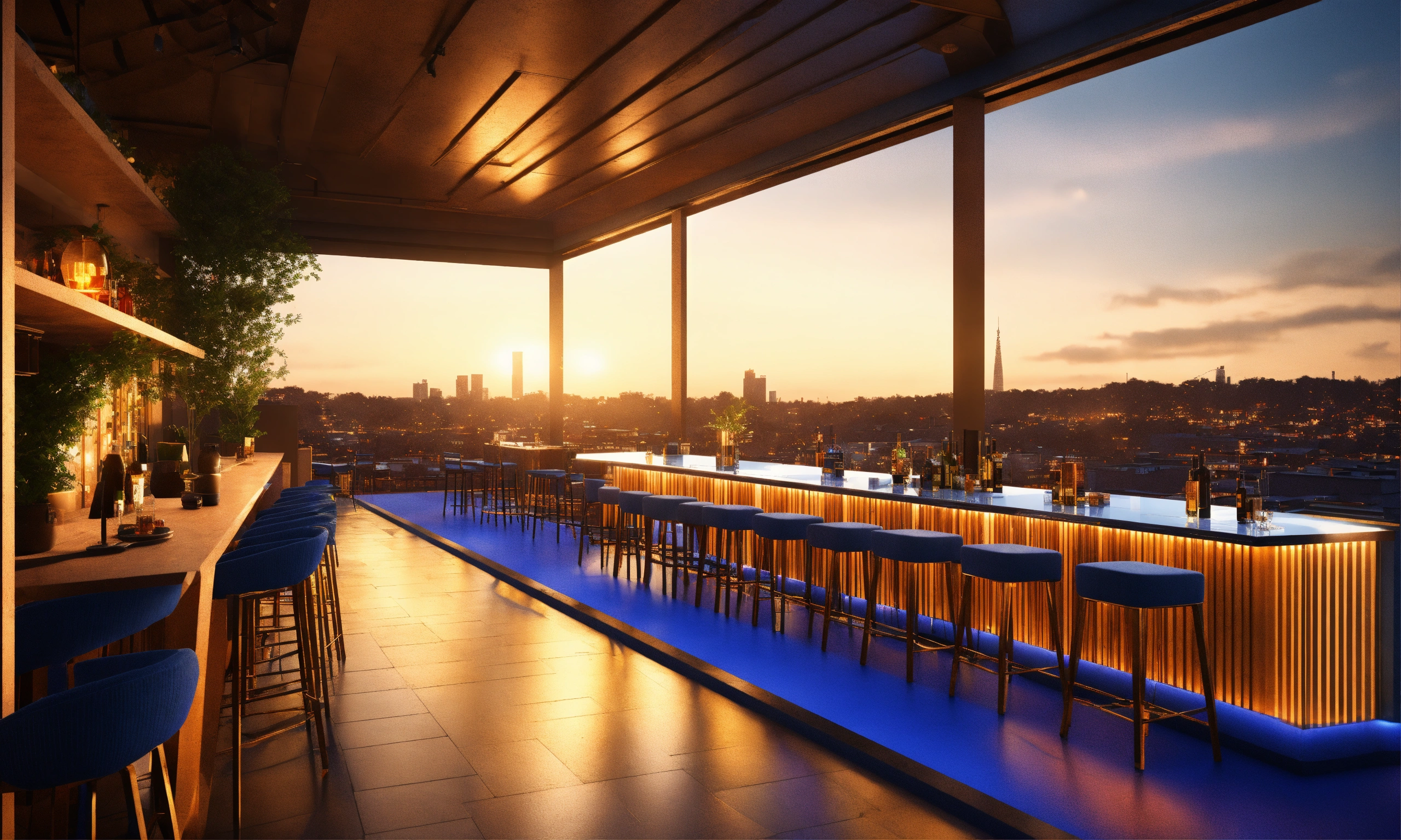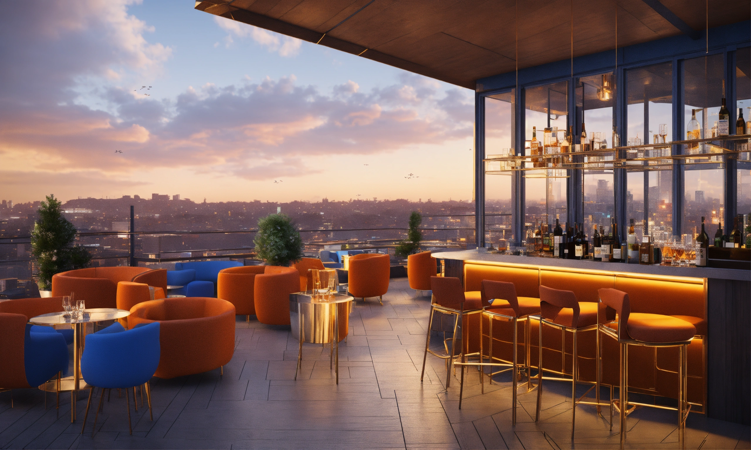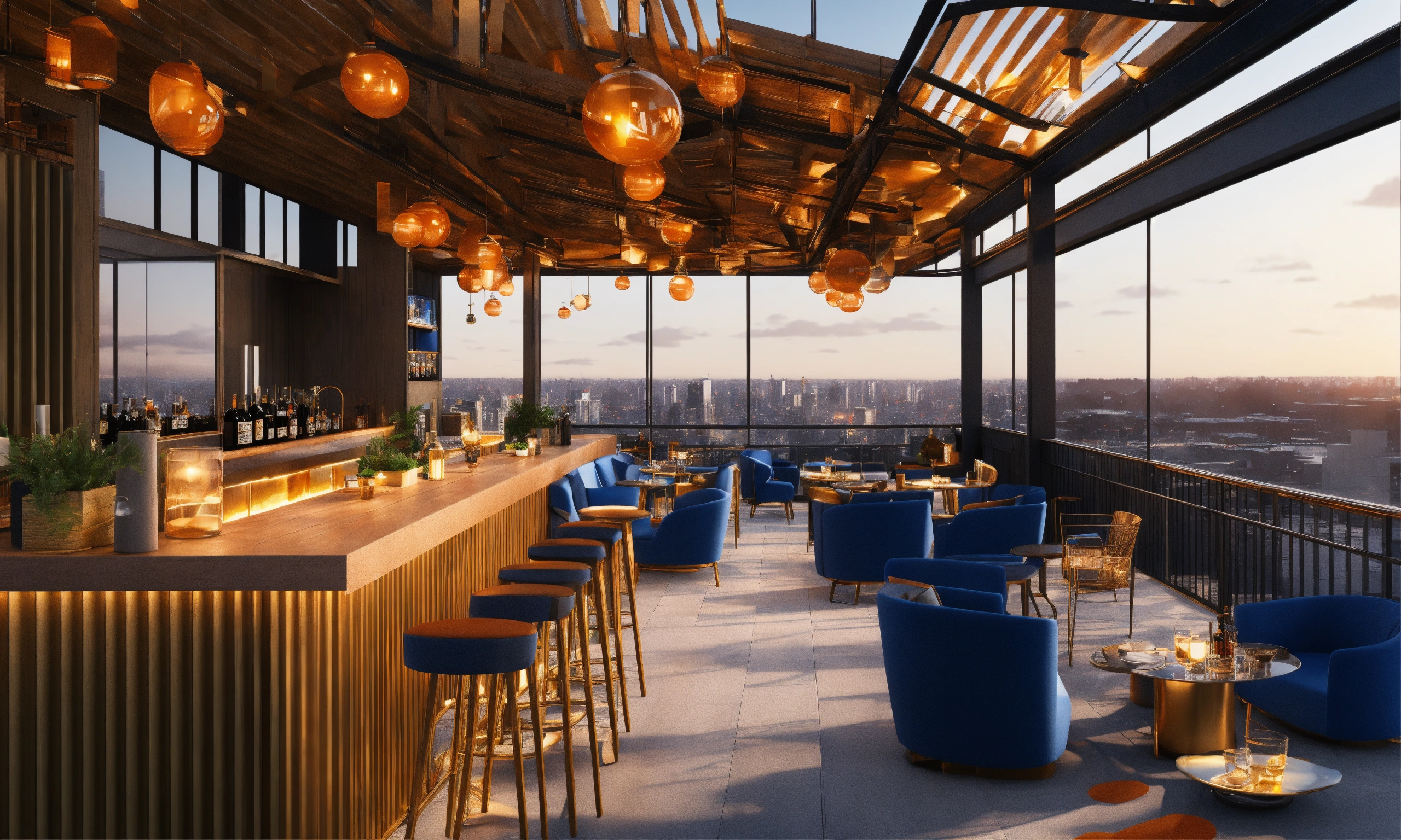 A rooftop bar with blue chairs in large windows, in the style of d5 render, vray tracing, modern urban, dark orange and light gold, daz3d, landscapist, nature-inspired, environmentally inspired