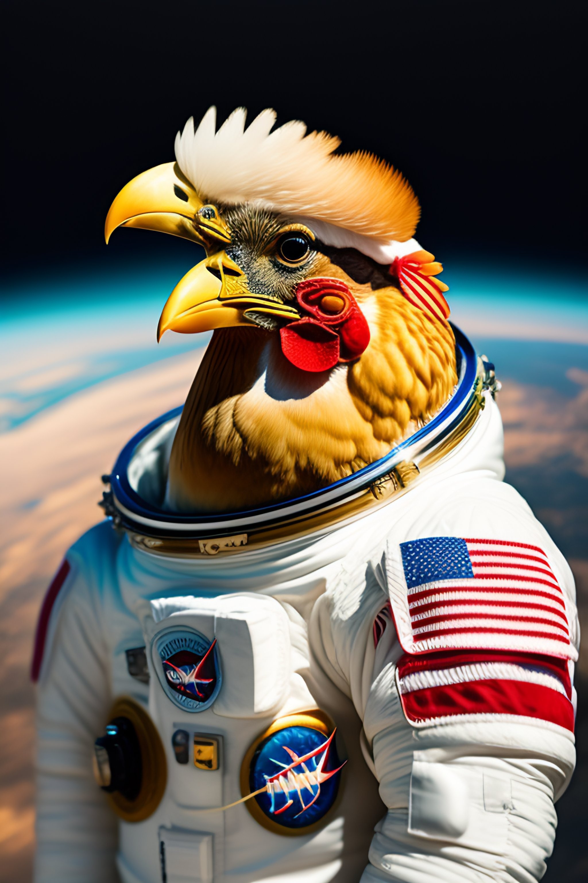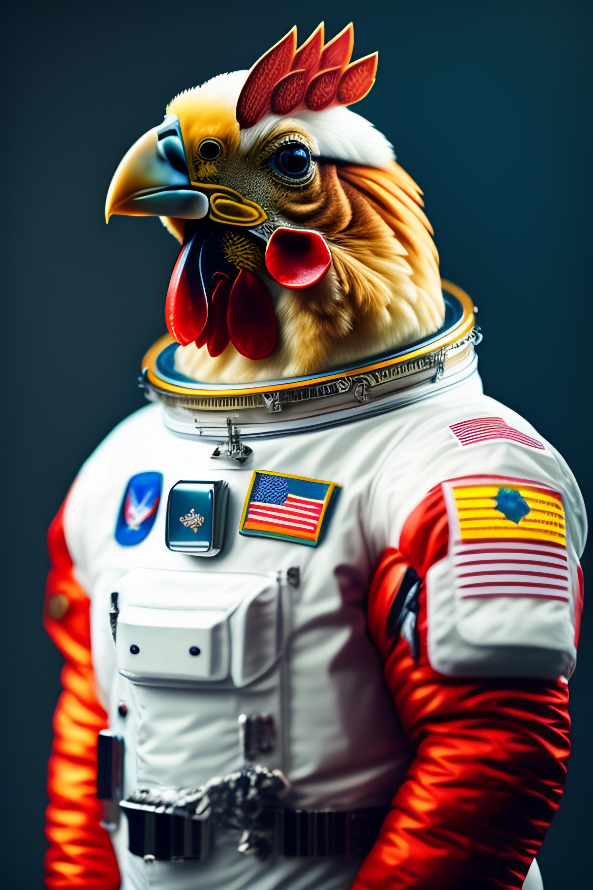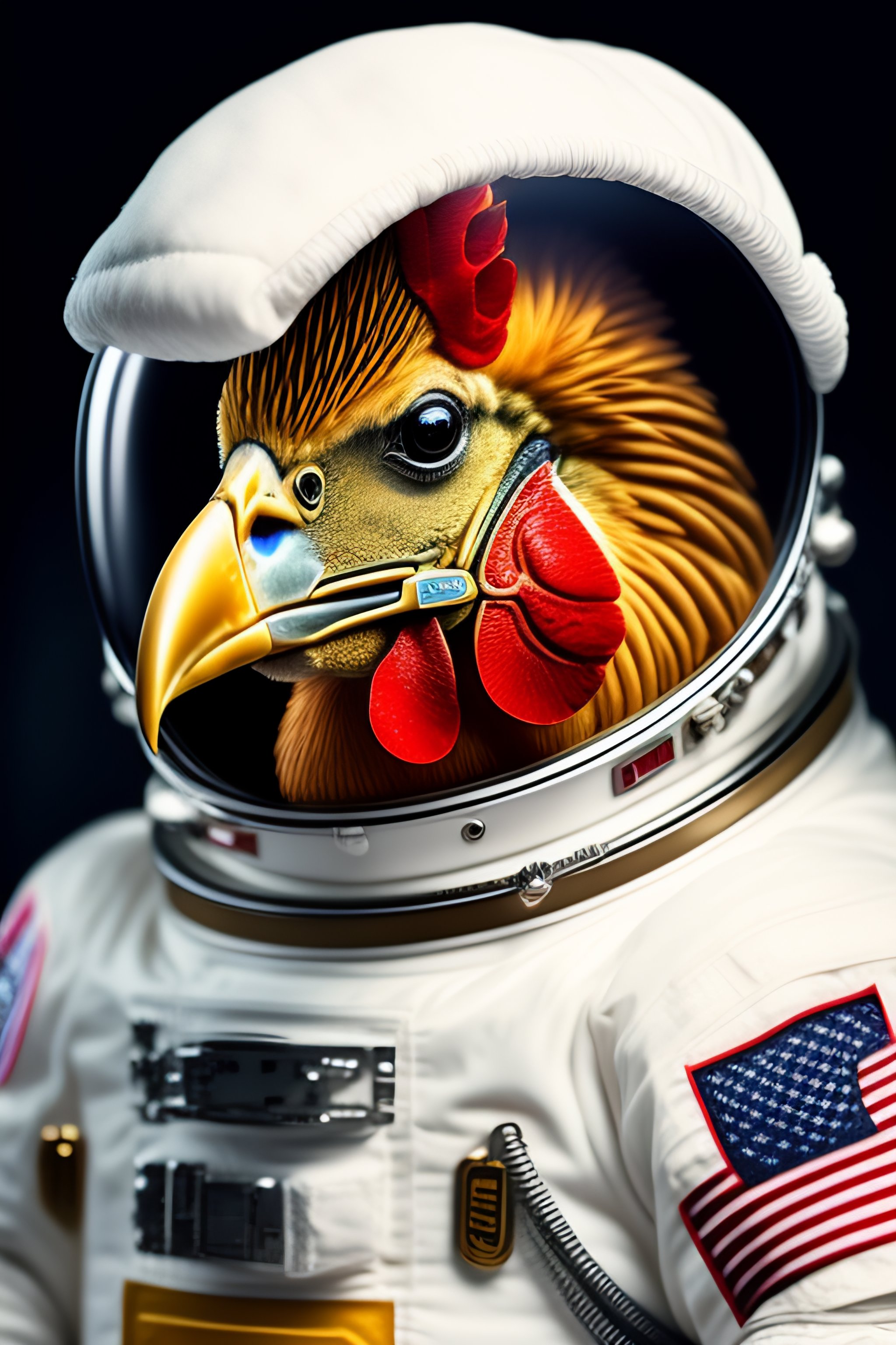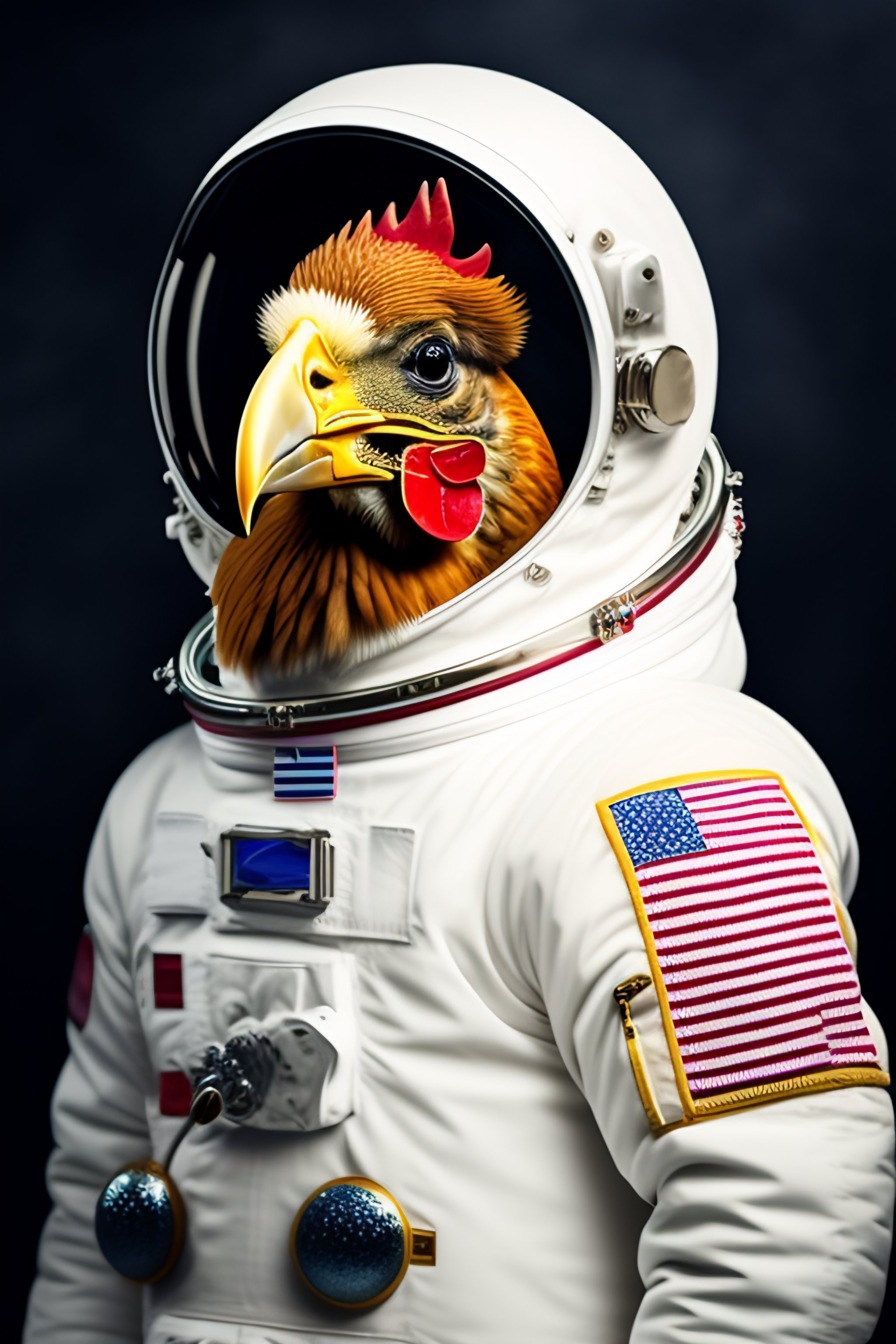 Portrait of a chicken in an astronaut suit
