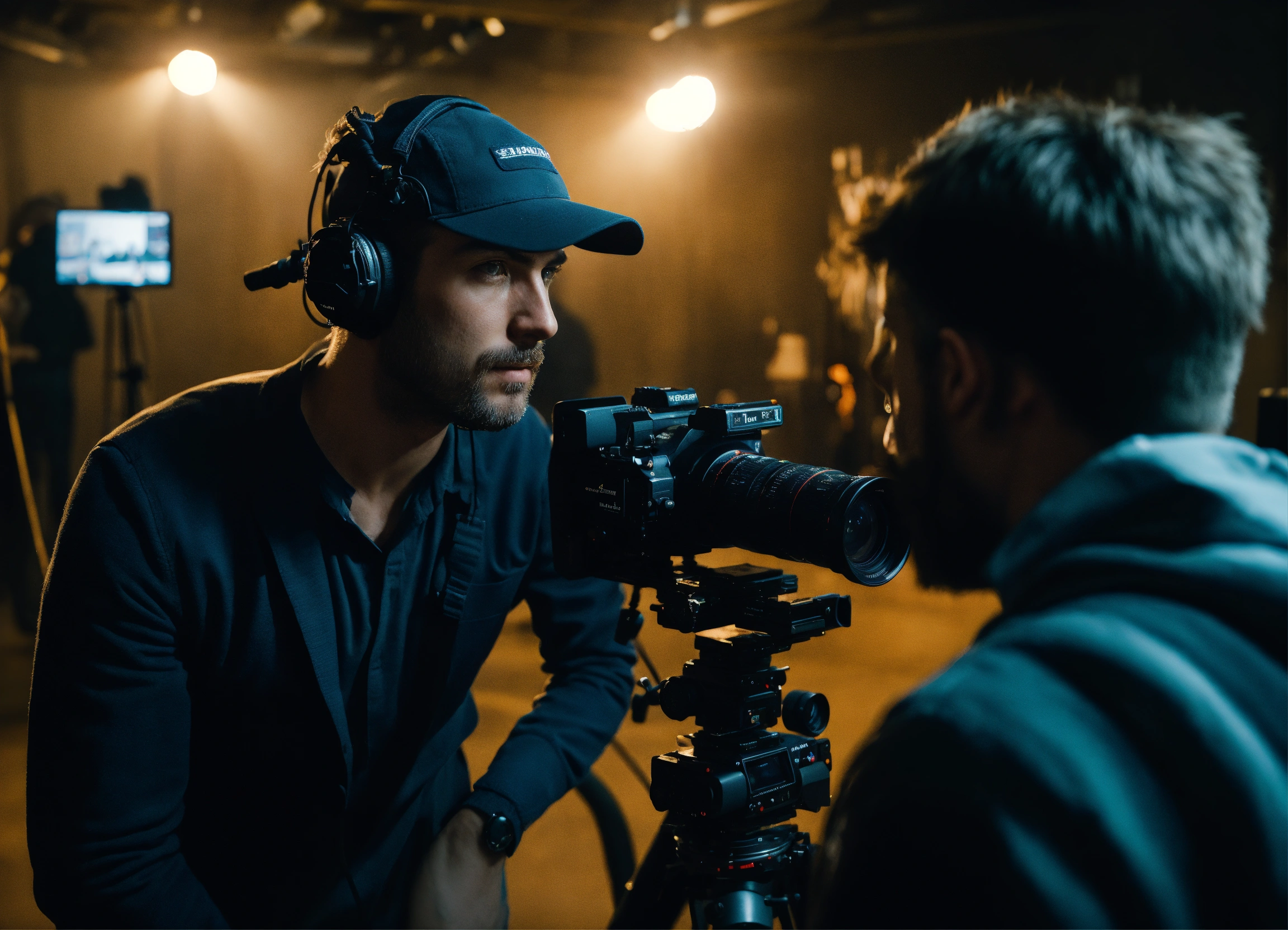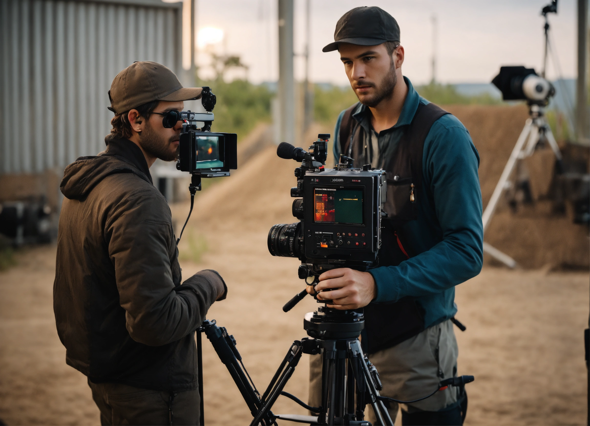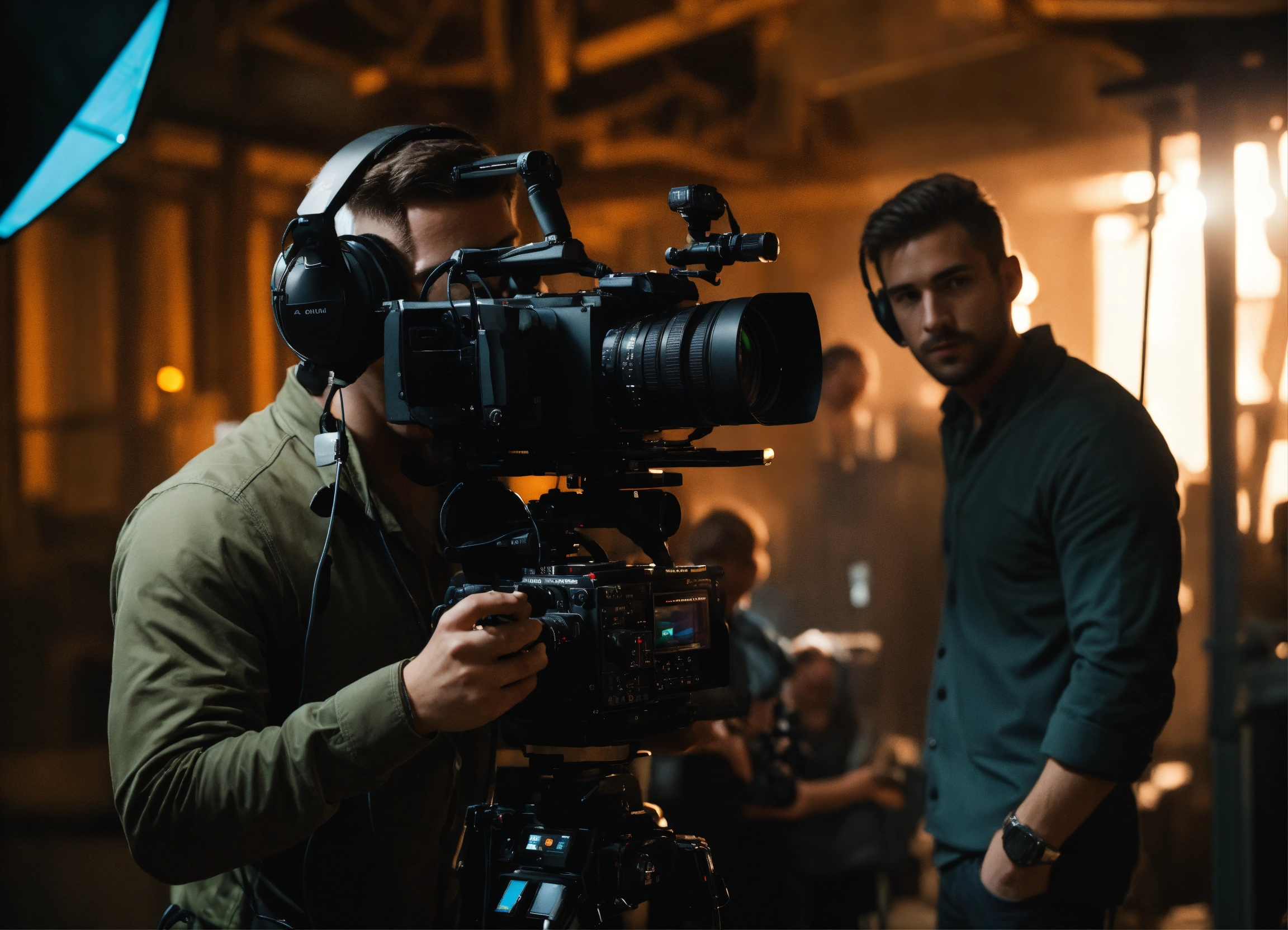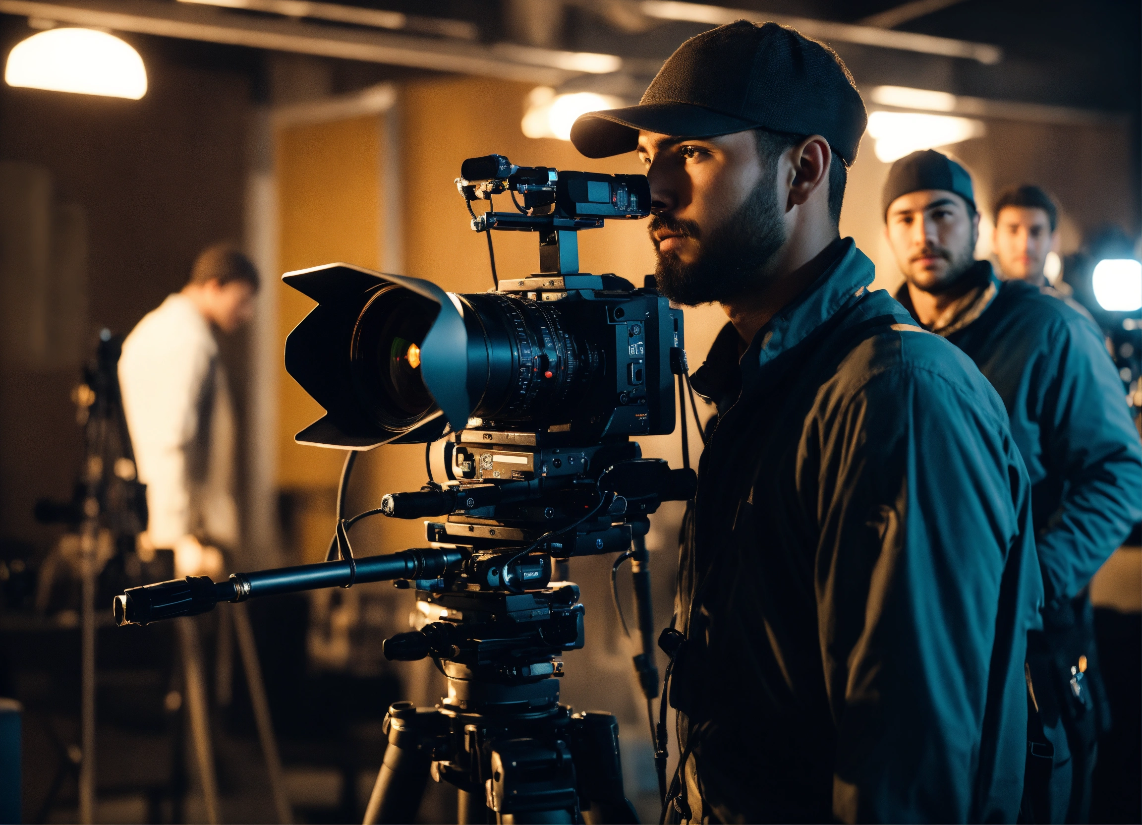 The operator looks directly into the viewfinder, he is under the camera. an assistant is standing next to him. realistic. a clear focus. beautiful male faces. realistic shadows. super detailed. the film making. there are two more people on the site an assistant operator and a sound engineer, they are next to the operator.