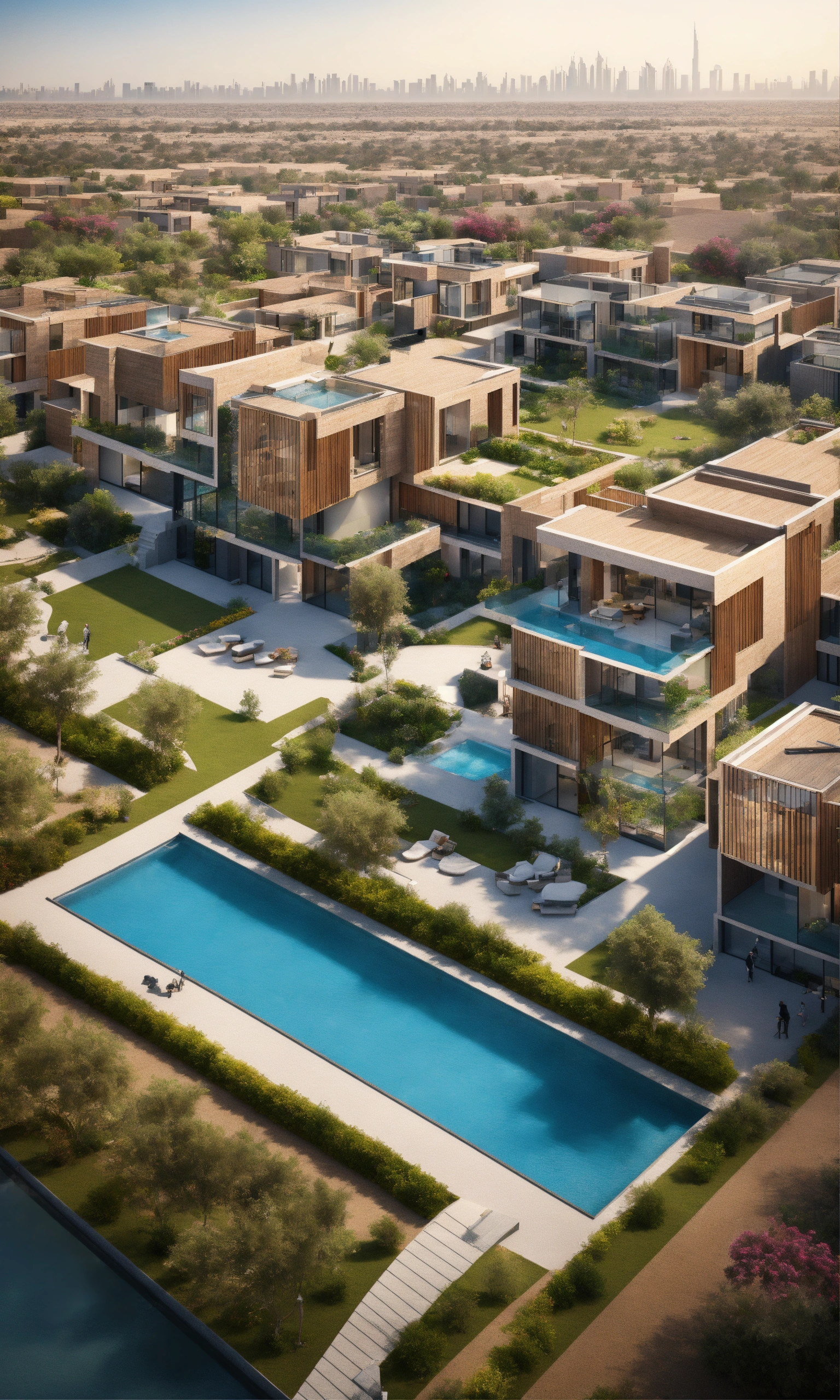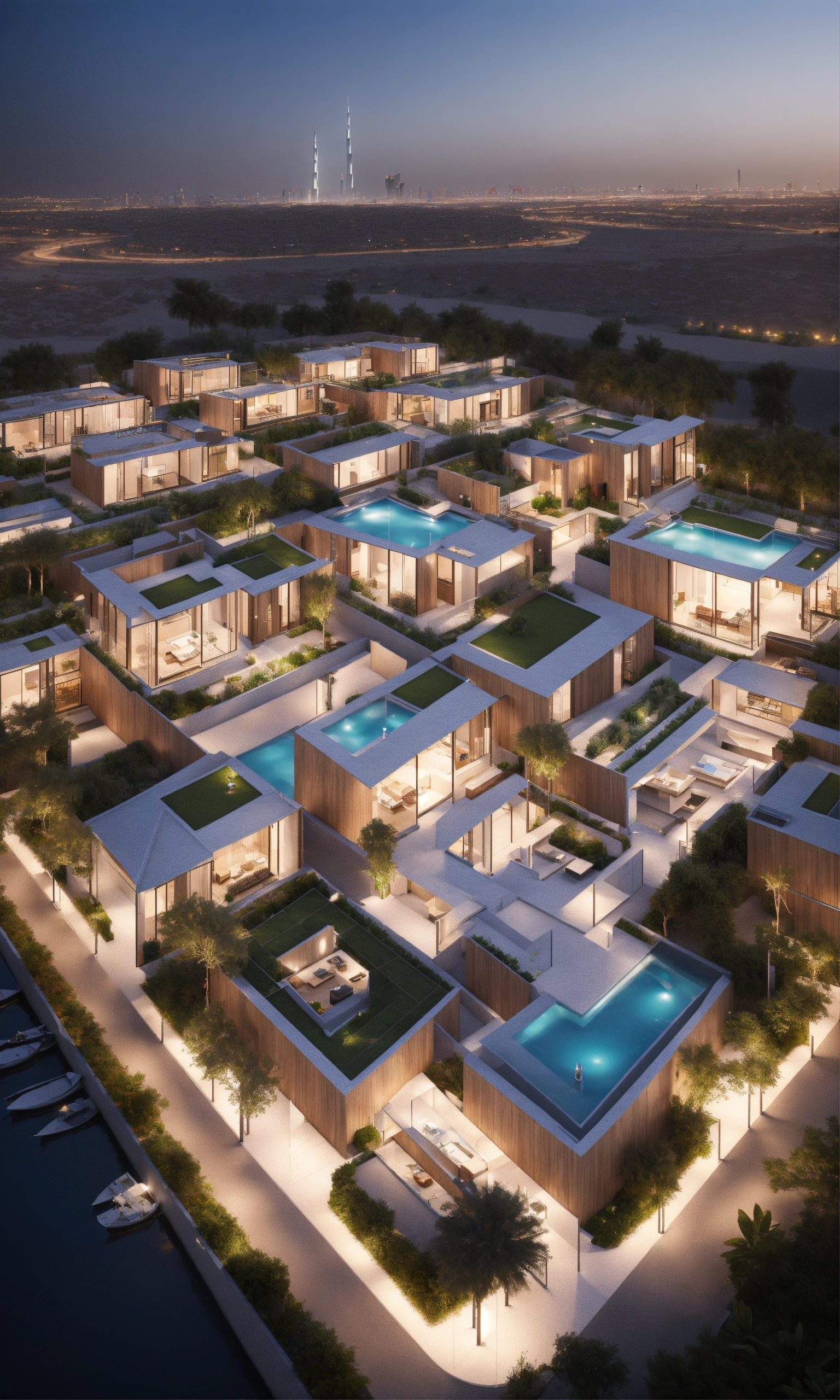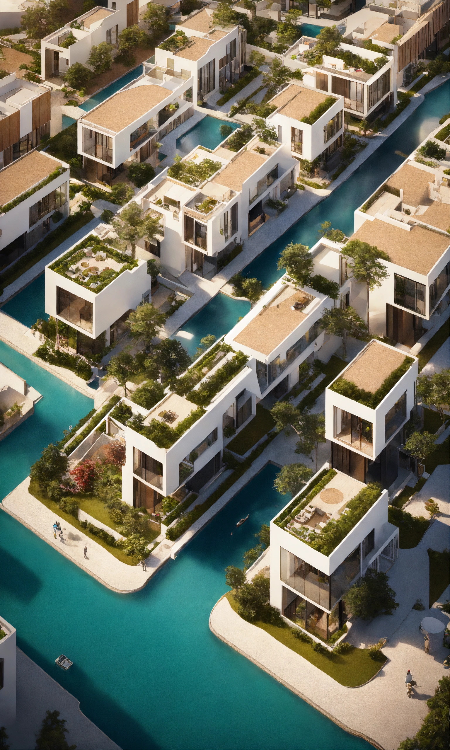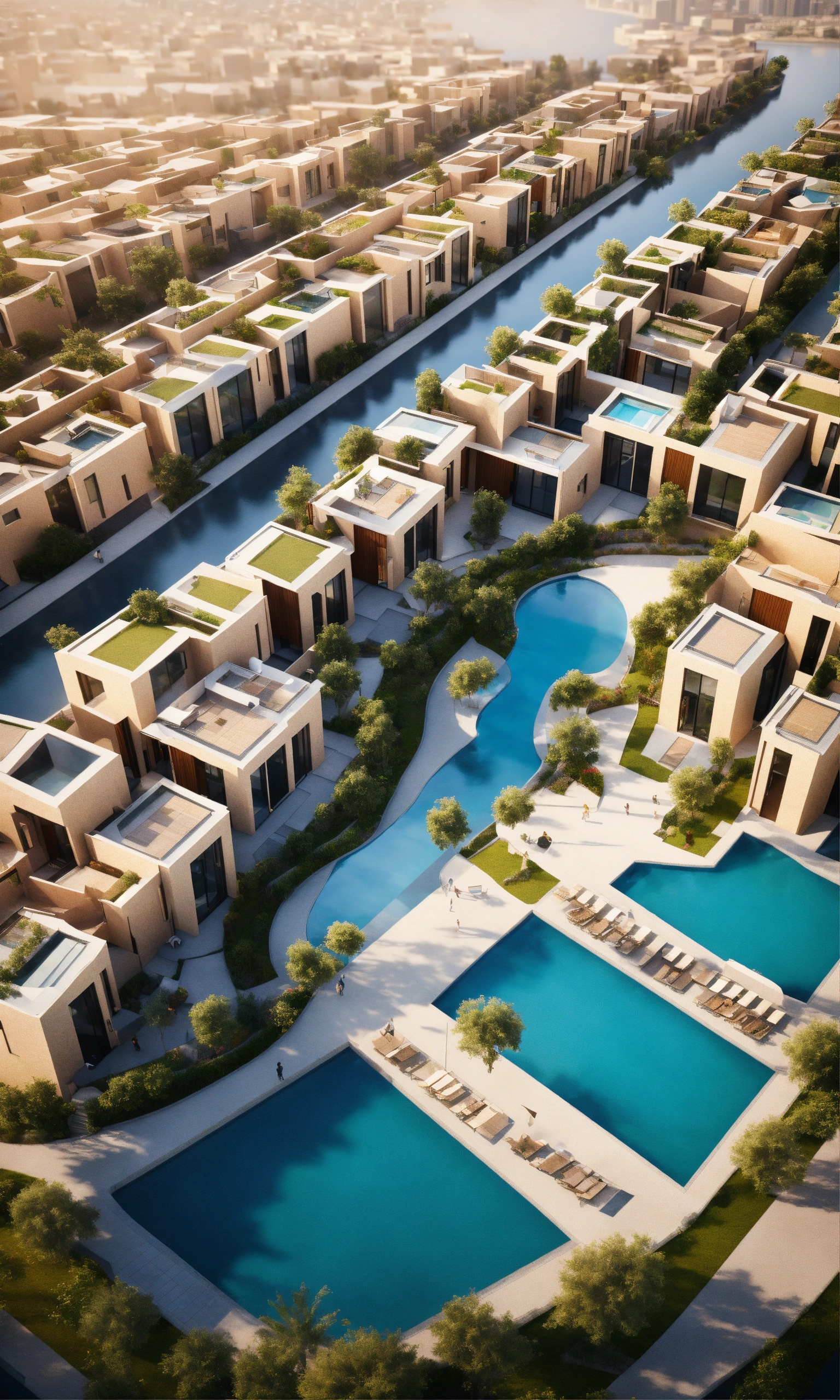 Aerial render of a group of modern houses in dubai made with modern architectural style, near the river, with big courtyards in the center of each house, closed walls, full of people