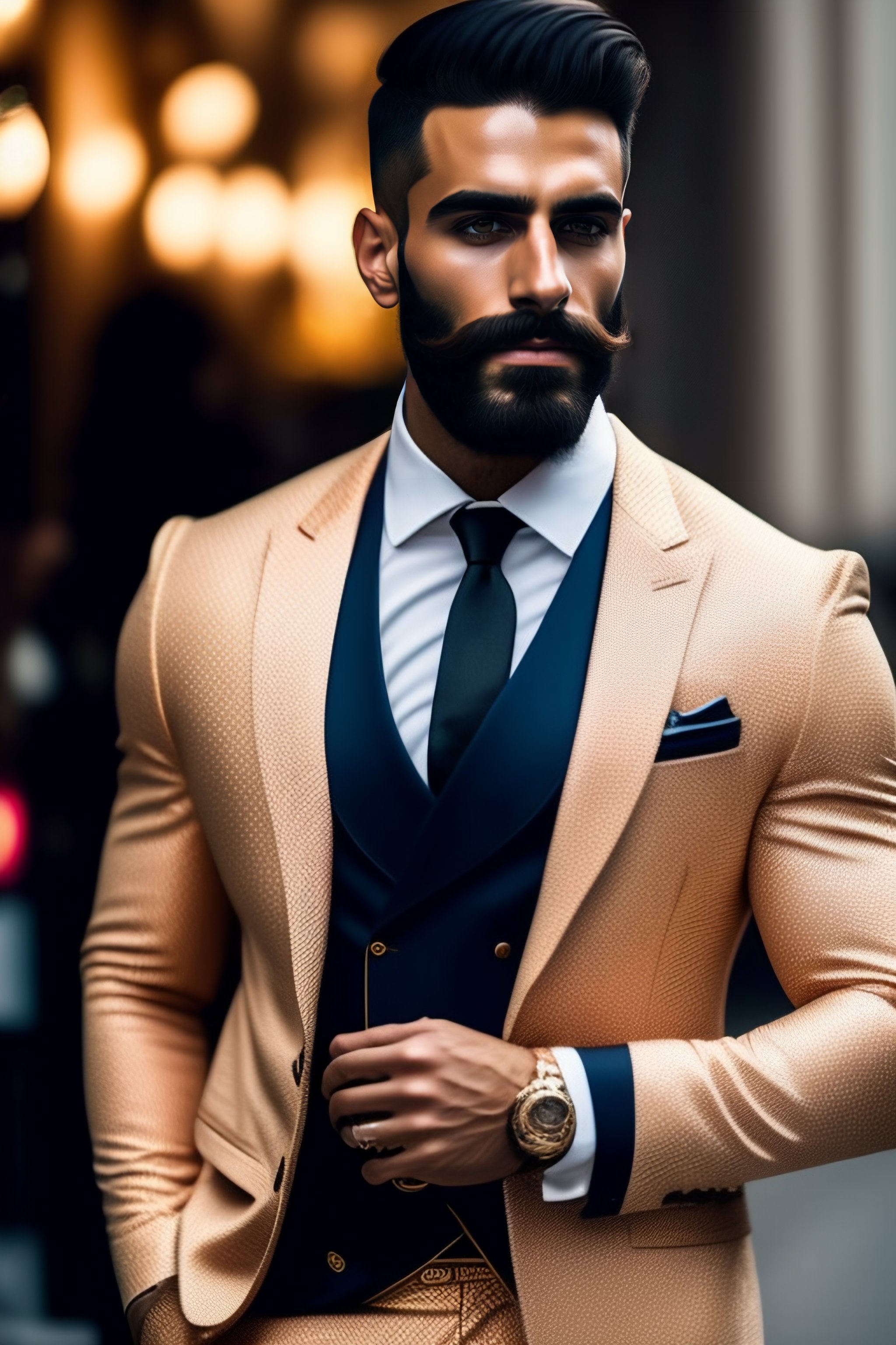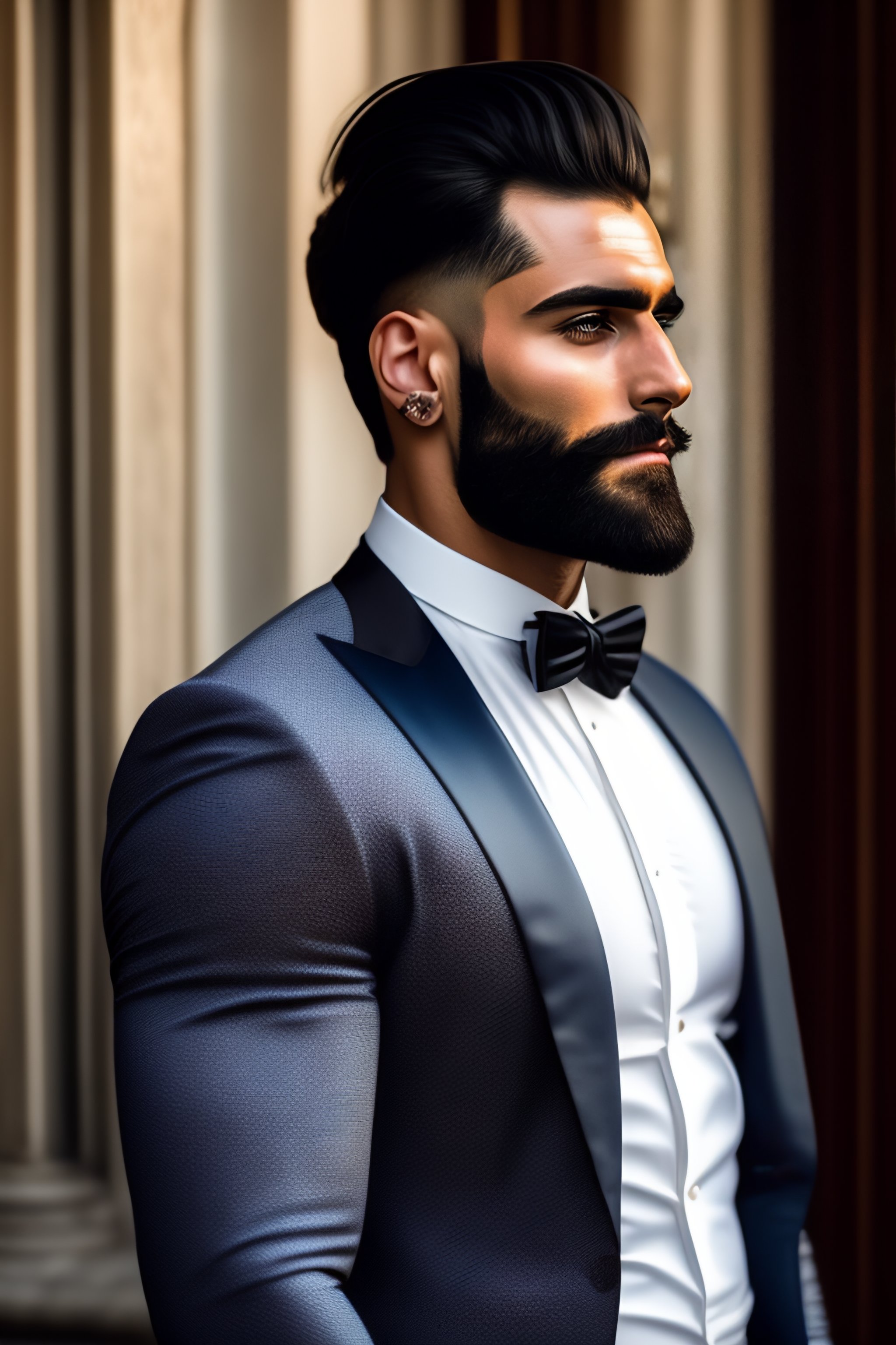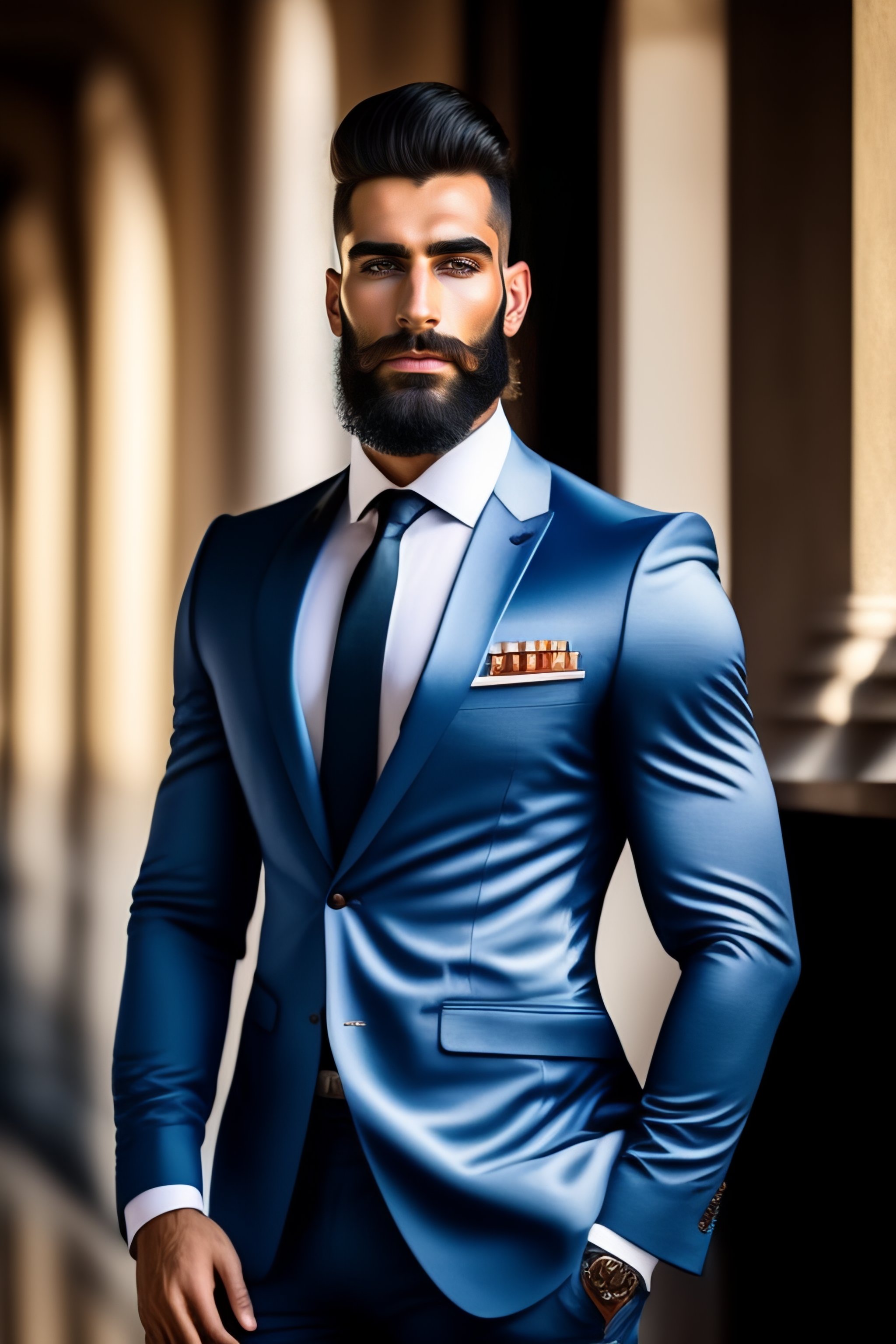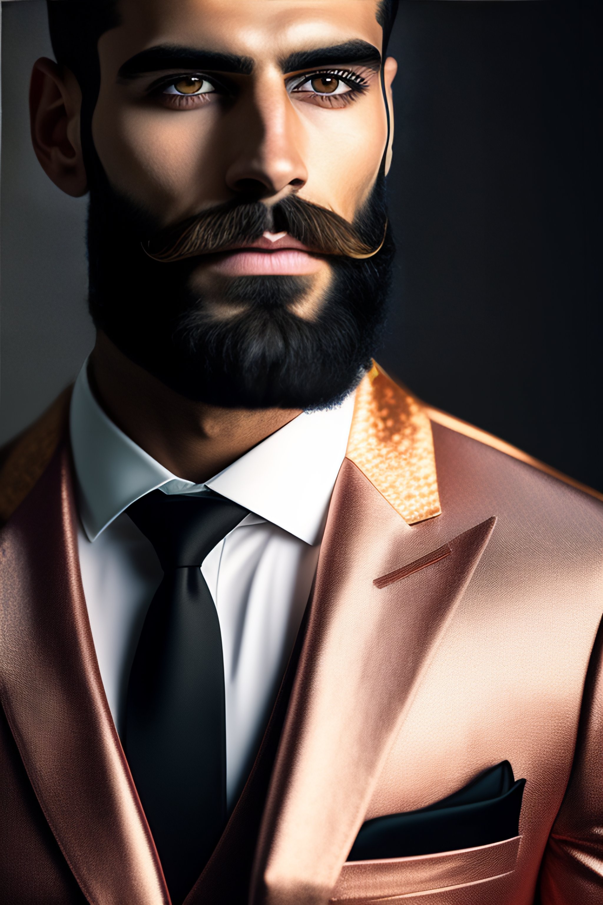 Kurdish german 28 year old model hirsute long beard wearing an expensive italian suit in the style of tom of finland