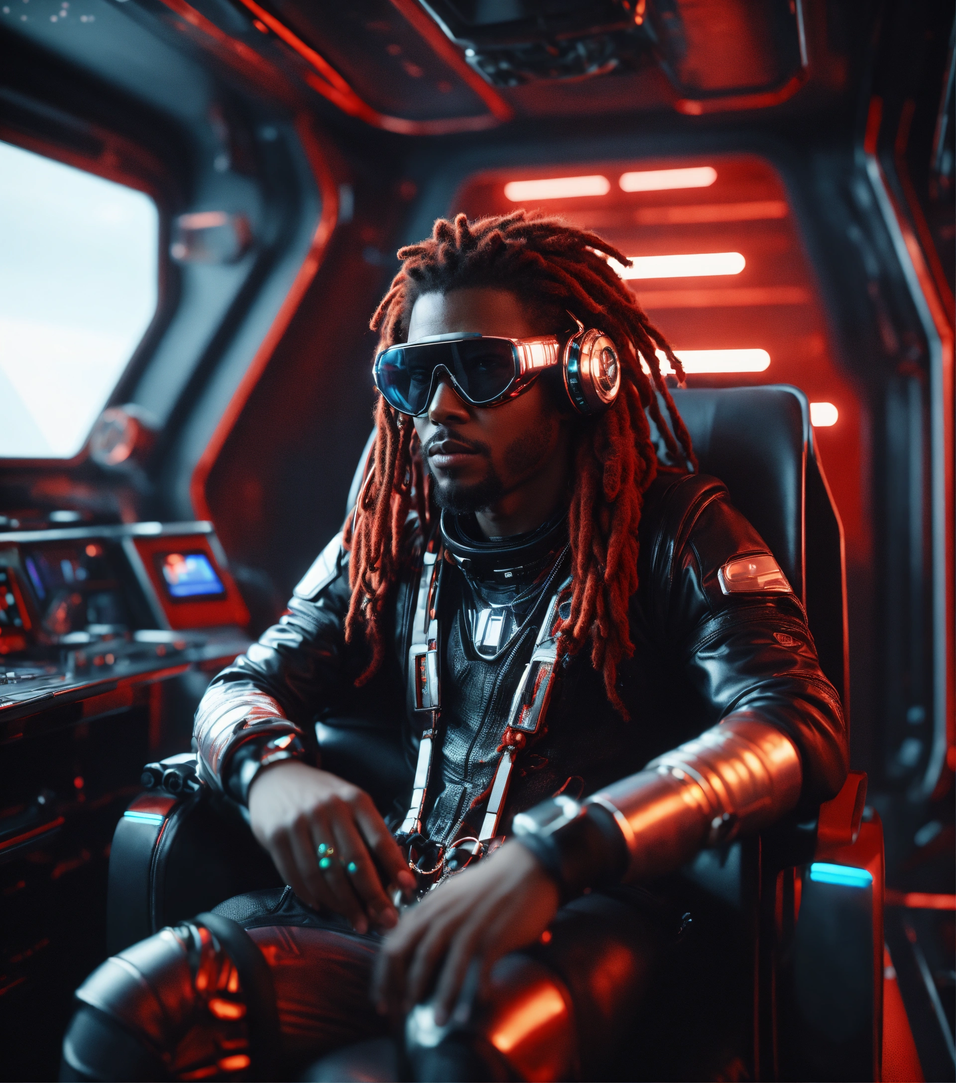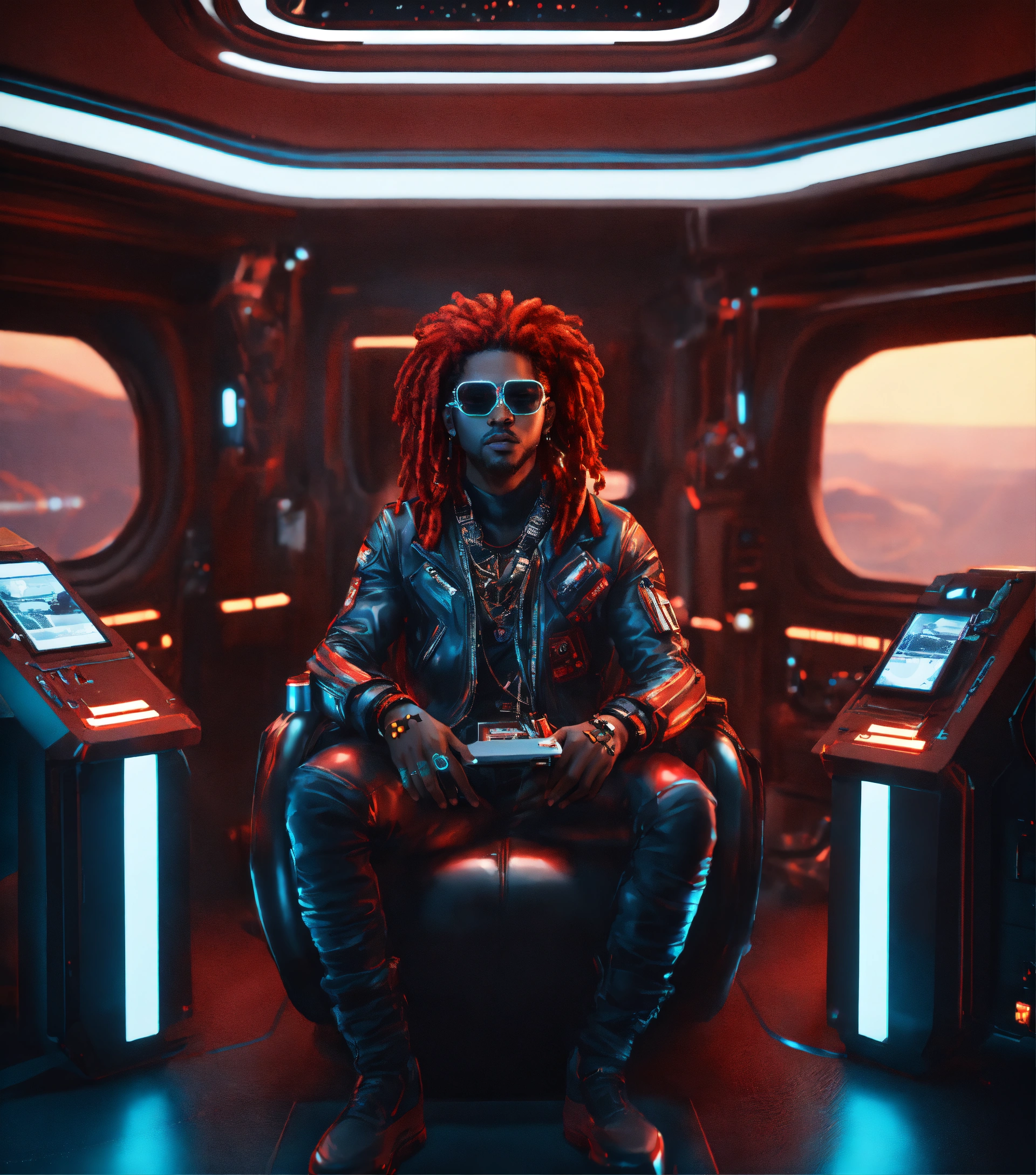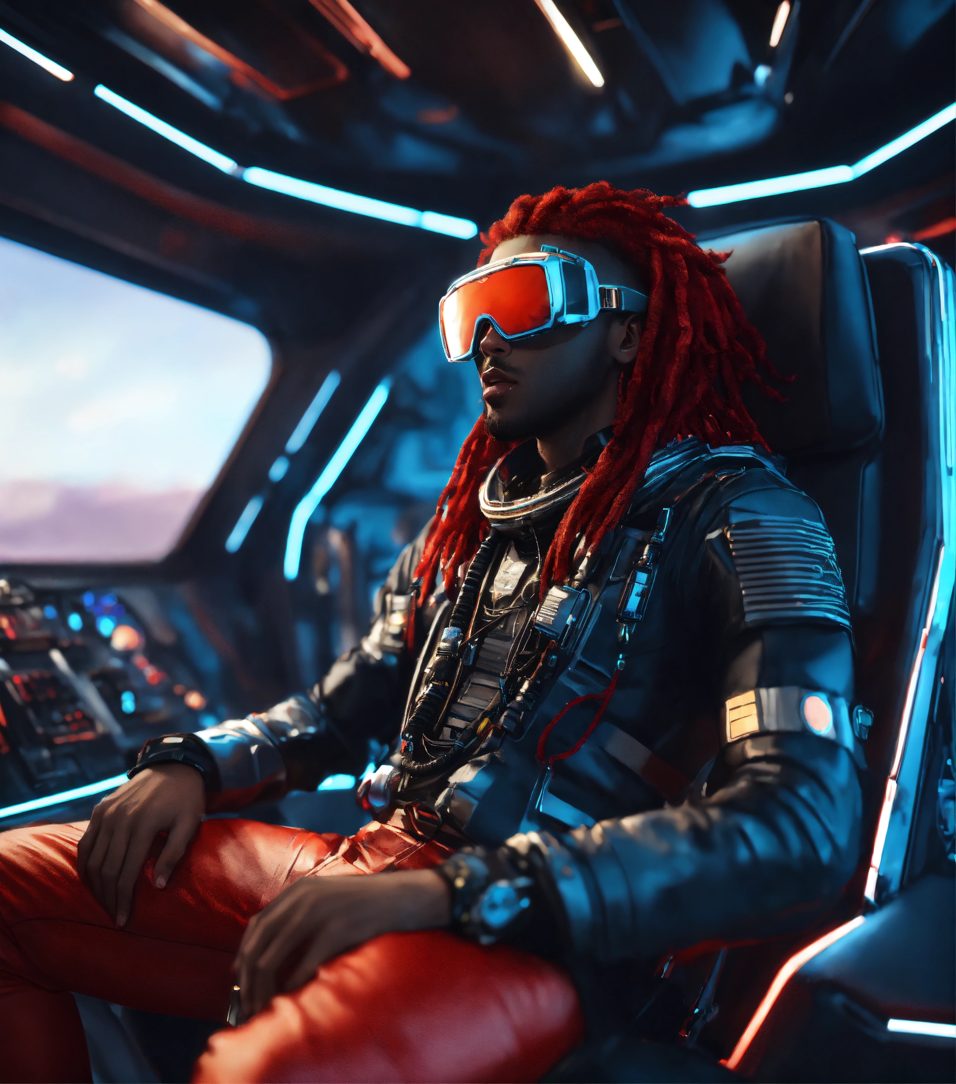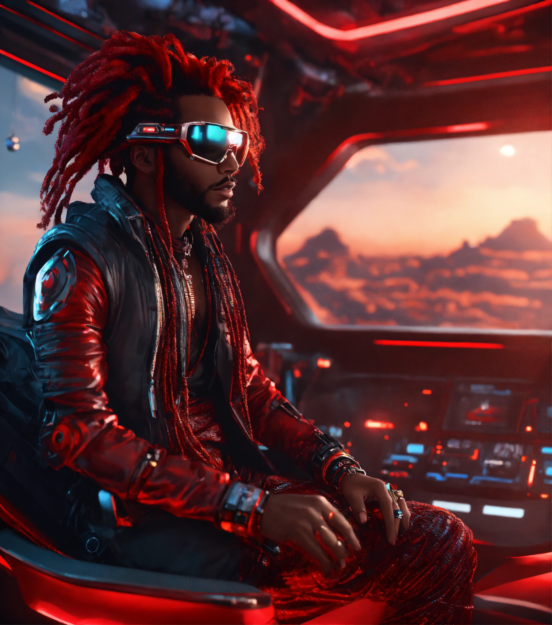 Zoom out of a black alien male rockstar with ar glasses and red dreadlocks wearing cool hi-tech space clothing and jewelry is lounging in a luxurious futuristic space yacht, realistic, futuristic, sci-fi, 8k, unreal engine