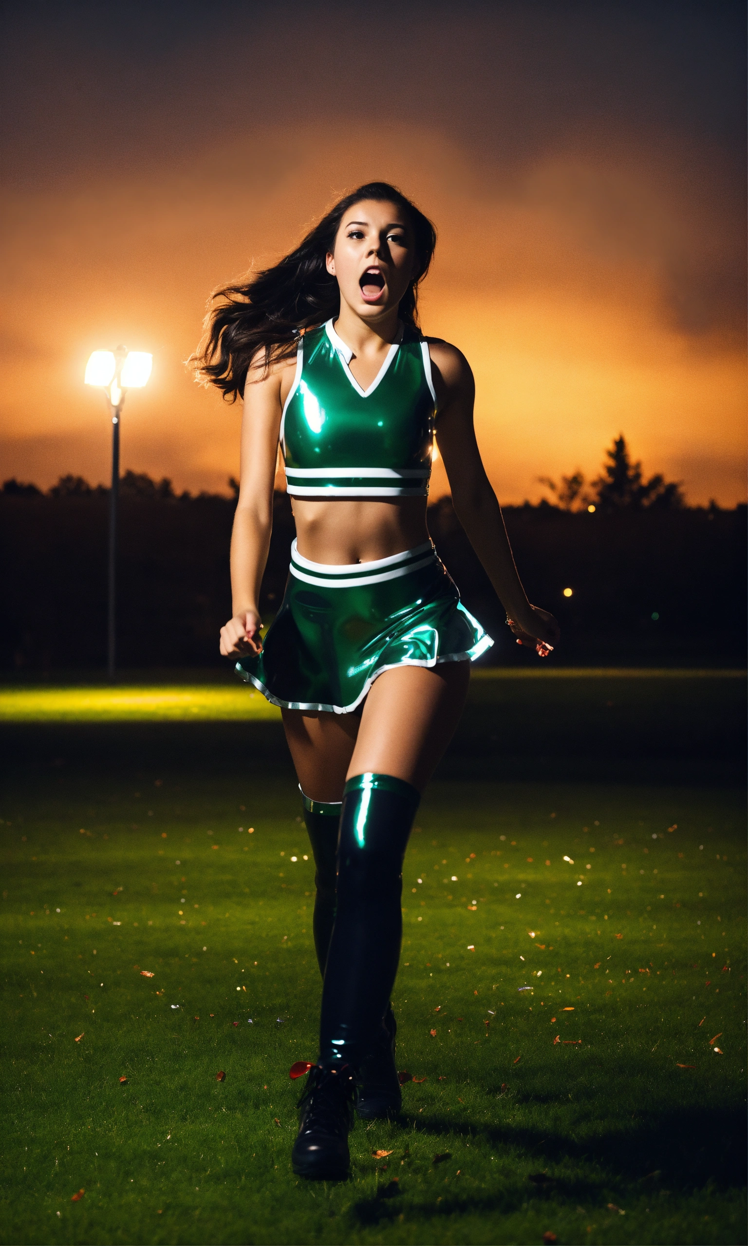 Beautiful university student, female, 19, dressed in shiny latex cheerleader costume, scared, worried, shocked, running across huge empty lawn at night, dark, spotlight