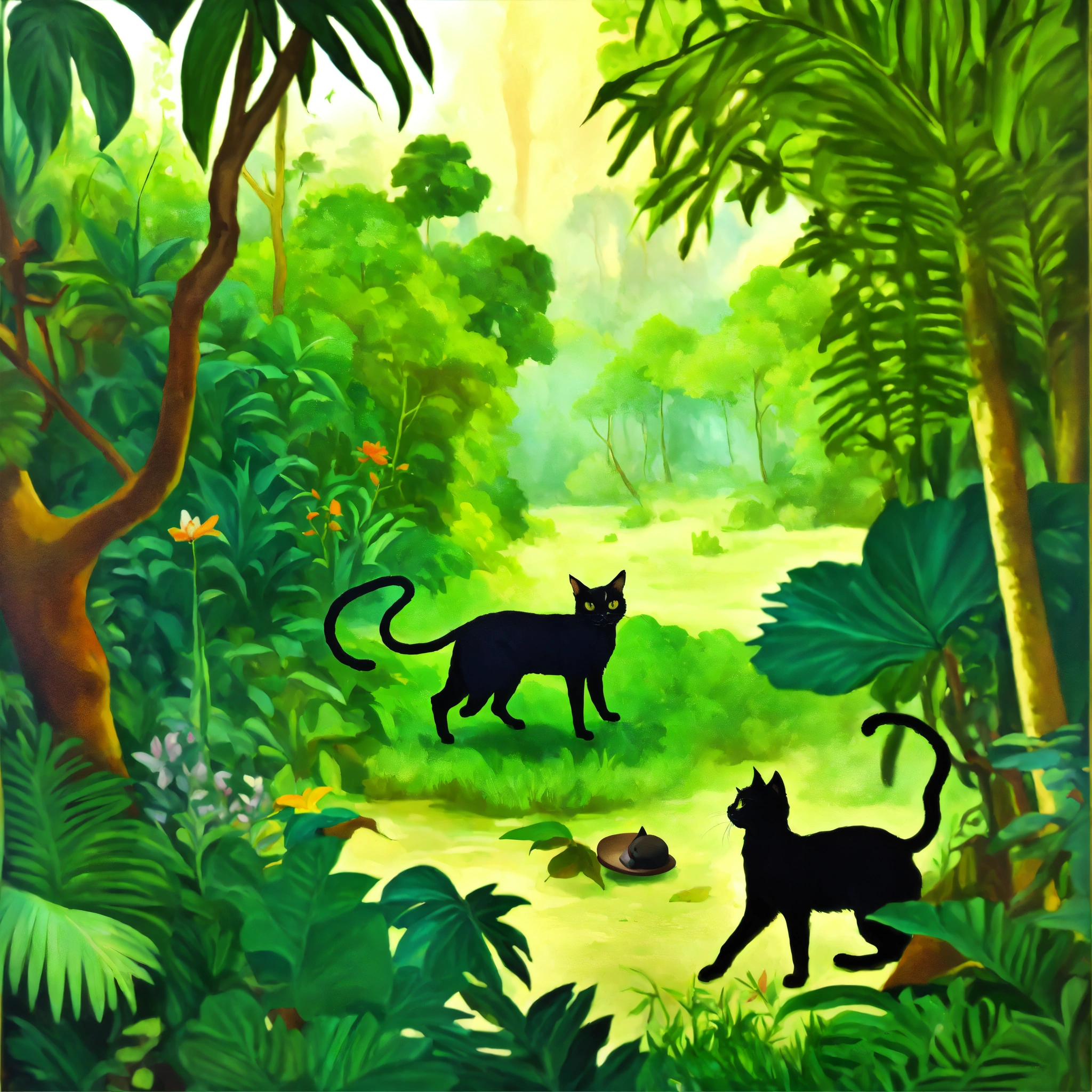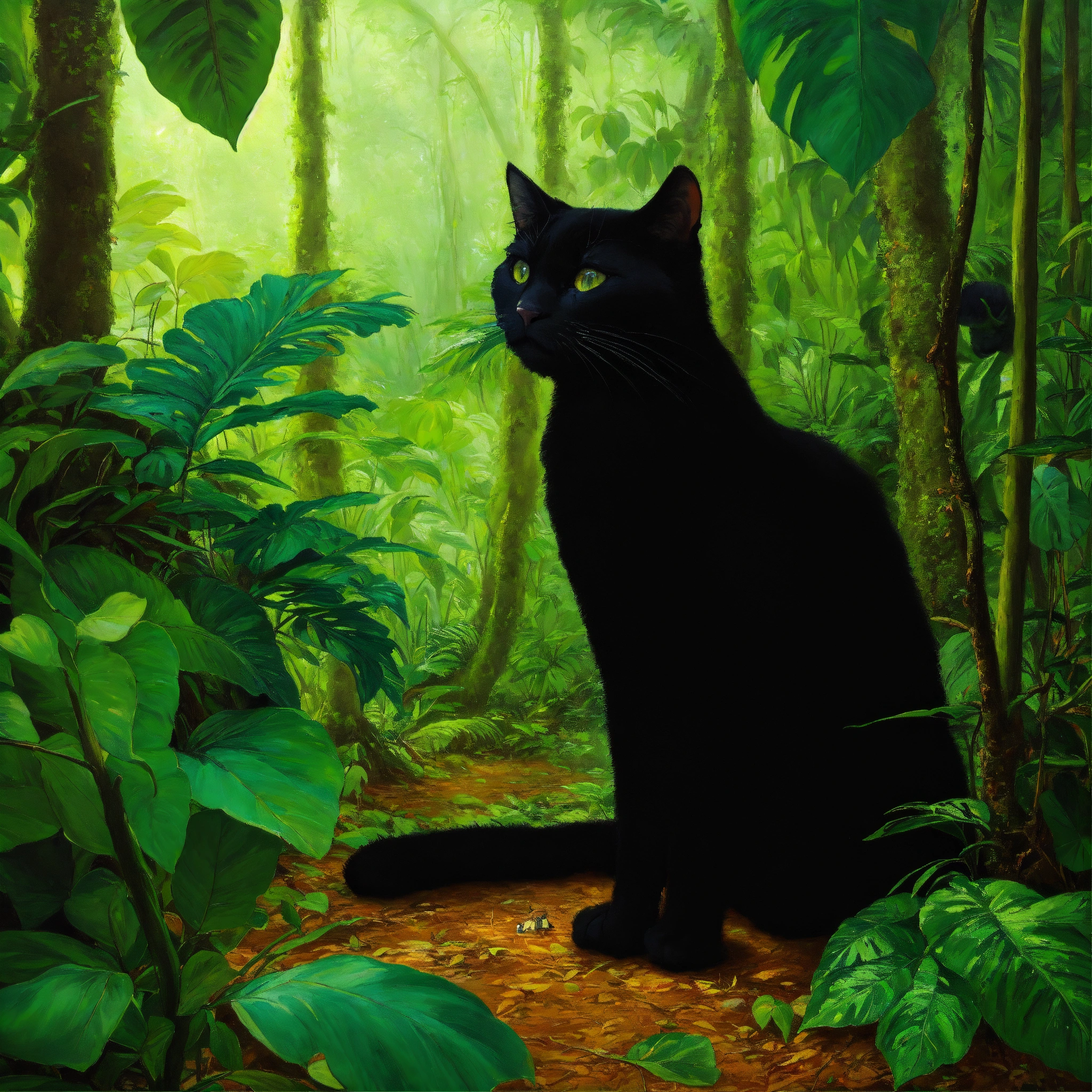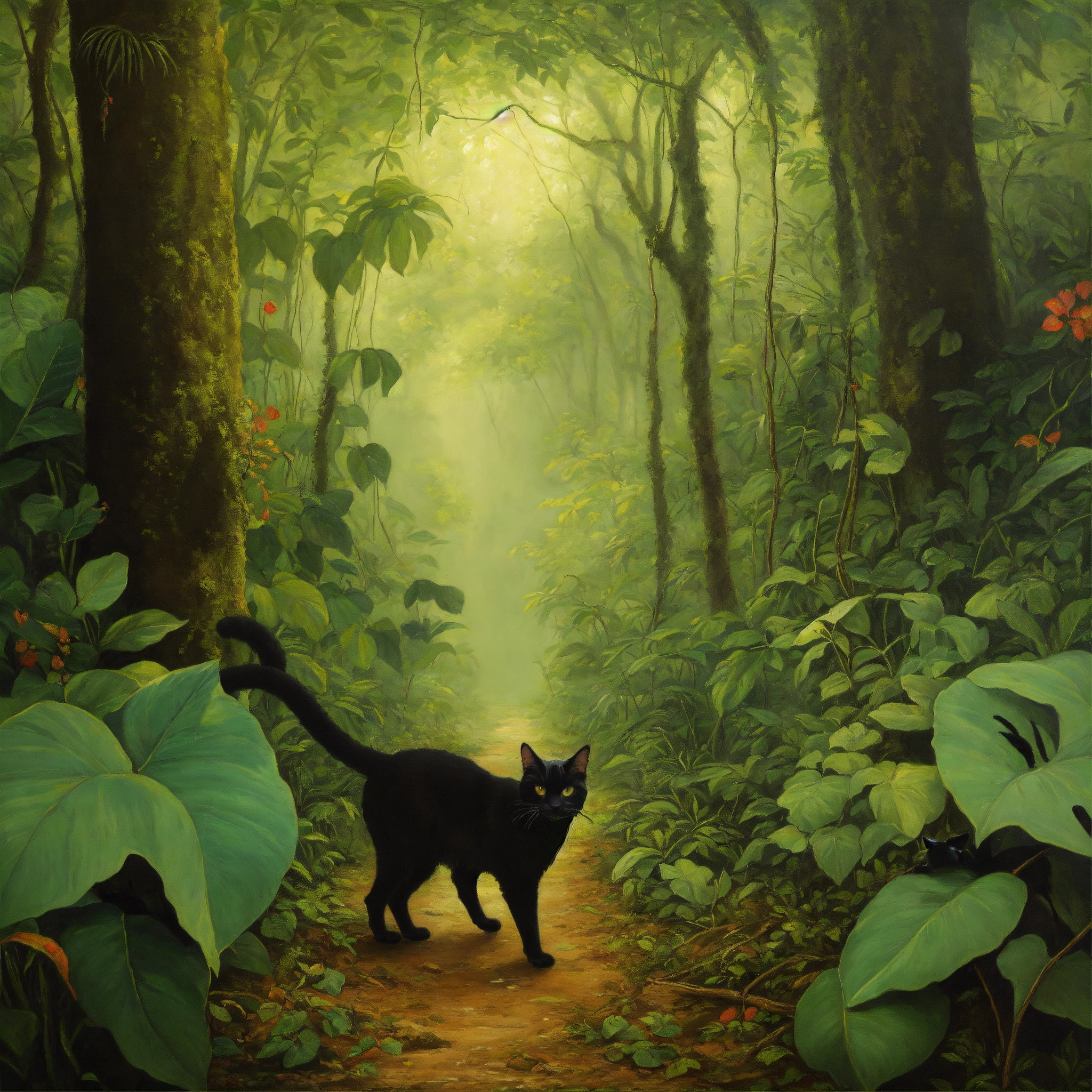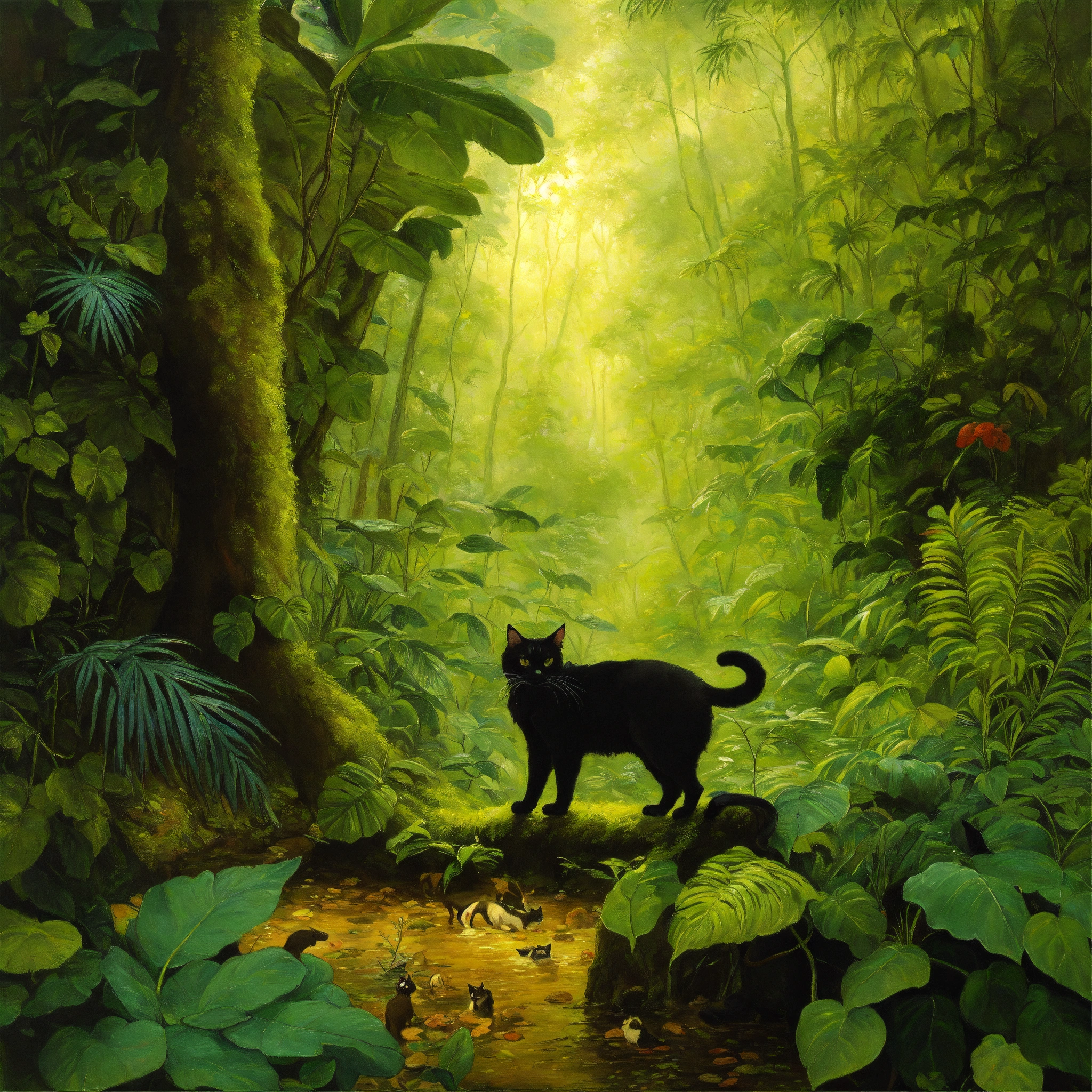 Pieter bruegel the elder, oil painting, brushtrokes, oil on canvas, realistic, highly detailed painting, soft glow, vivid colors, highly detailed rainforest landscape, dense landscape painting of a rainforest, mist, soft glow, highly detailed, complex, vivid green, vines, lush, tropical, hidden black cat with a leaf on its head, cute black cat in a jungle hiding with a big leaf on his head, distant dumbfounded black cat hiding in the rainforest with a leaf hat, far away confused black cat with a leaf on his head, hiding black cat standing in the jungle with a big lead hat, intense green, bright green, lush, dense rainforest, streams.