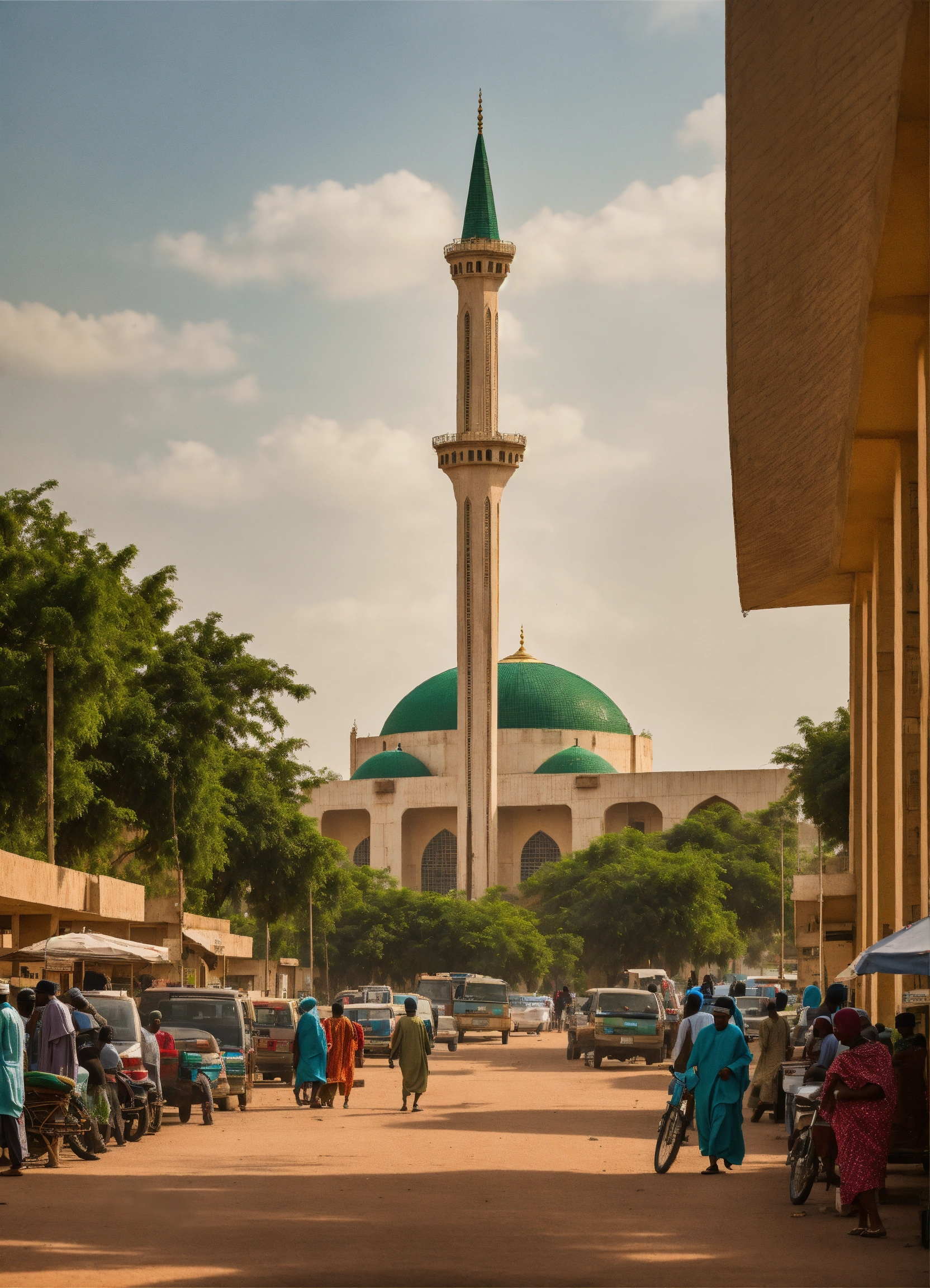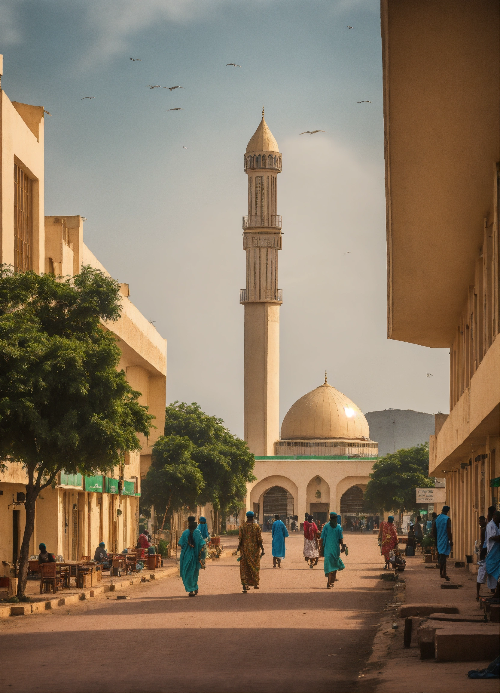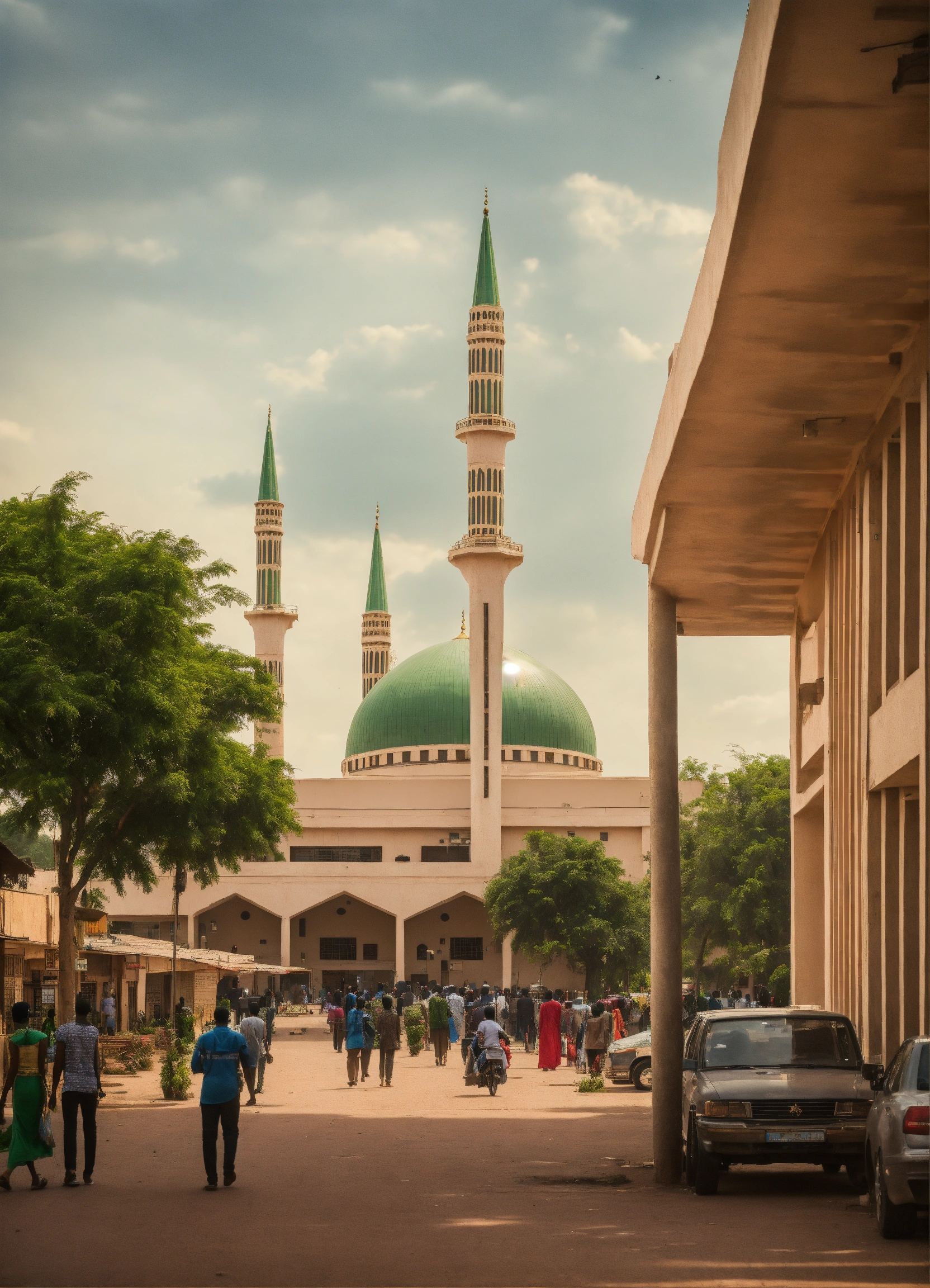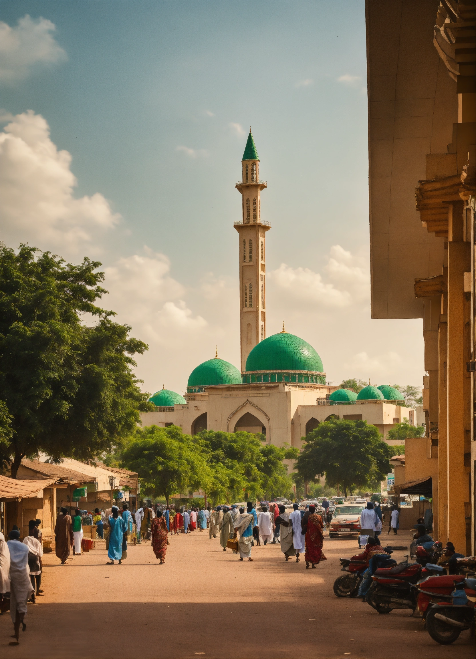 Abuja cityscape, include abuja national mosque with gold dorm at distance view, nigeria atmosphere, photo realistic, extremely detail building and people, daily life, city neighborhood, include abuja style cafe and stores at a near distance, cinematic, lots of people, 8k photo, maximal