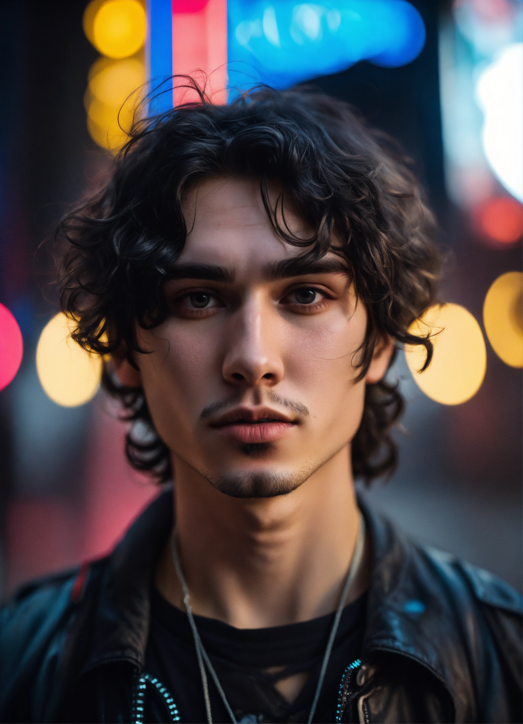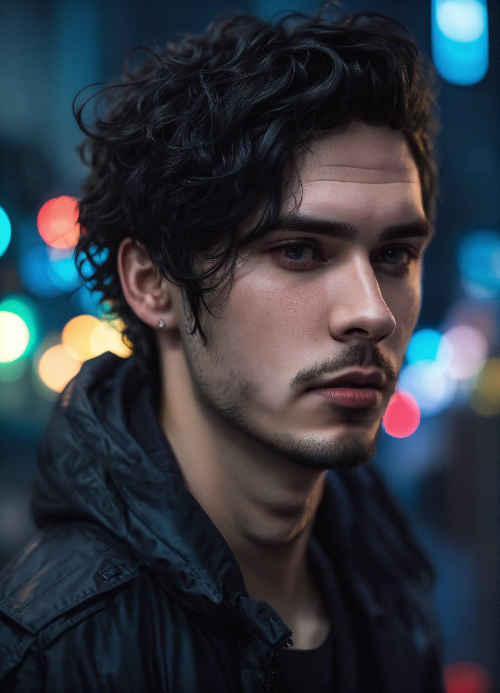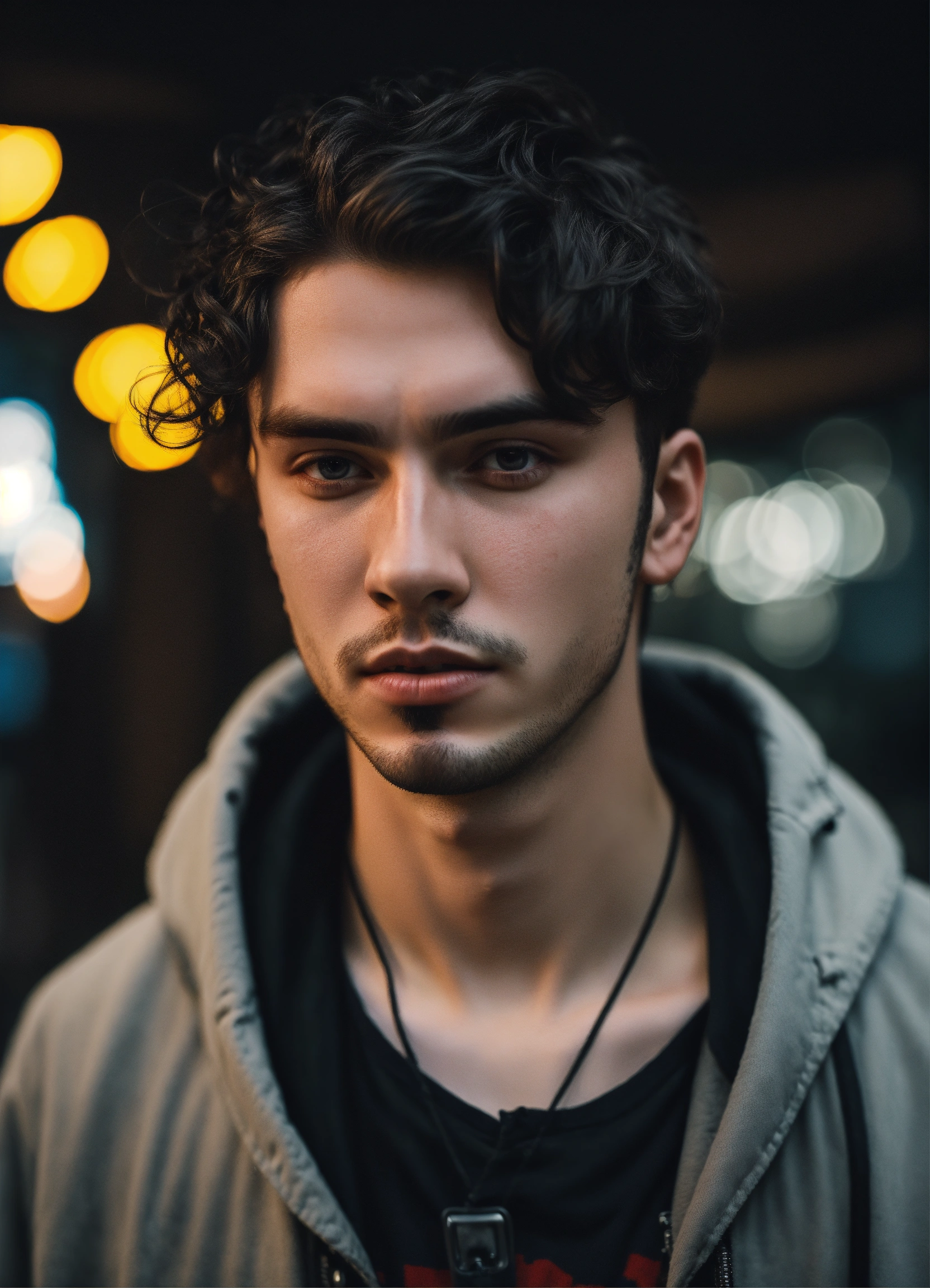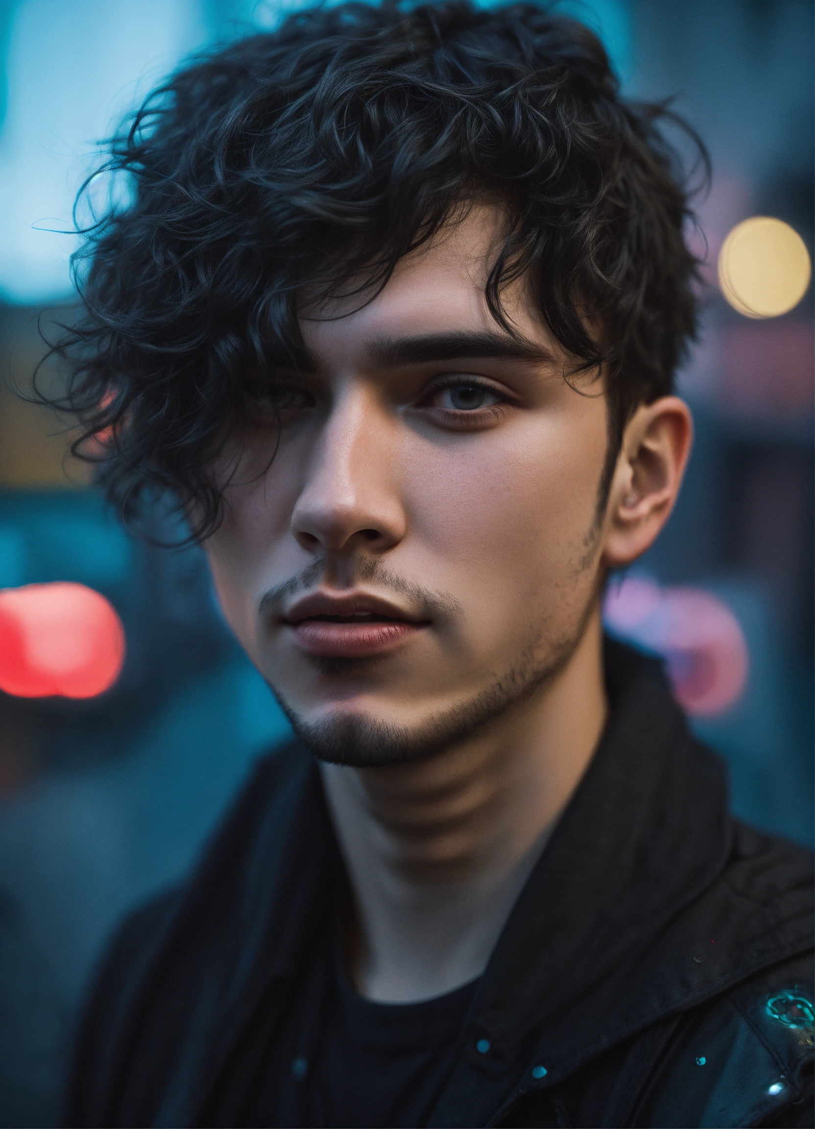 Highly detailed portrait of russian young man 28 years old, ashy black hair wavy, black stweetwear, cyberpunk, cartoon realism, black, grunge aesthetic!!! bokeh