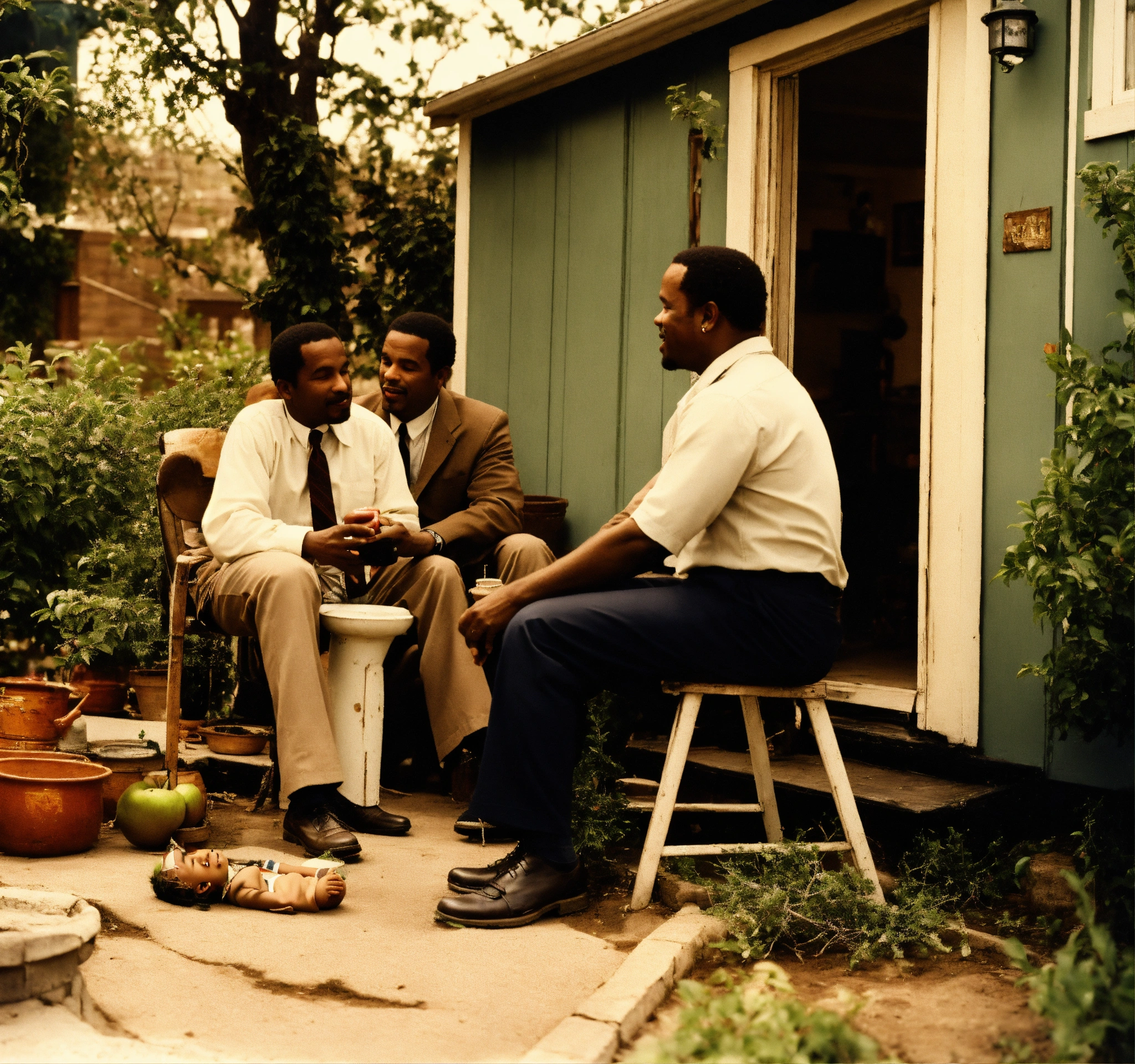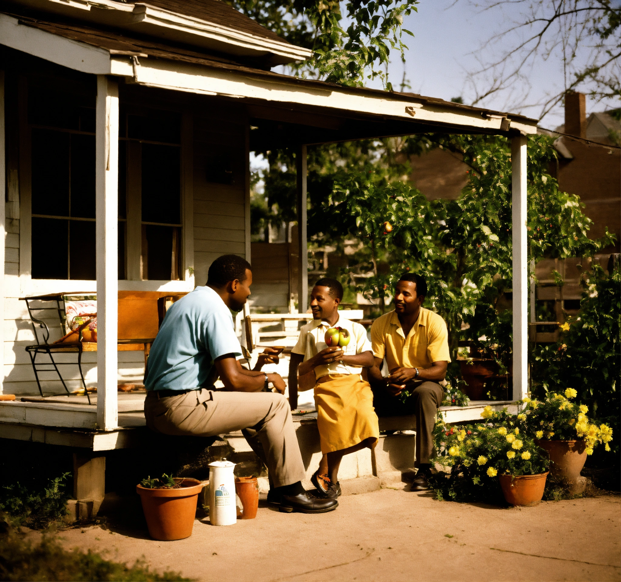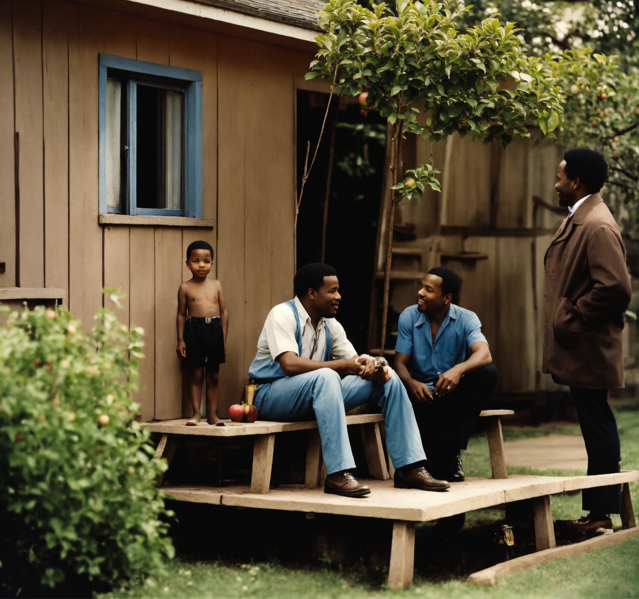 Setting 1960s backyard and porch of a urban home. in the foreground a medium-skinned 55-year-old man is seated on the porch. he is holding a brown-skinned five-year-old on his lap. in the background two black men are having a conversation by themselves. they stand next to a well-grown apple tree, possibly discussing it. their expressions are relaxed, indicating a casual chat. technical specifications steps 20 sampler dpm++ 2m karras cfg scale 15 desired output size 1024x960 pixels
