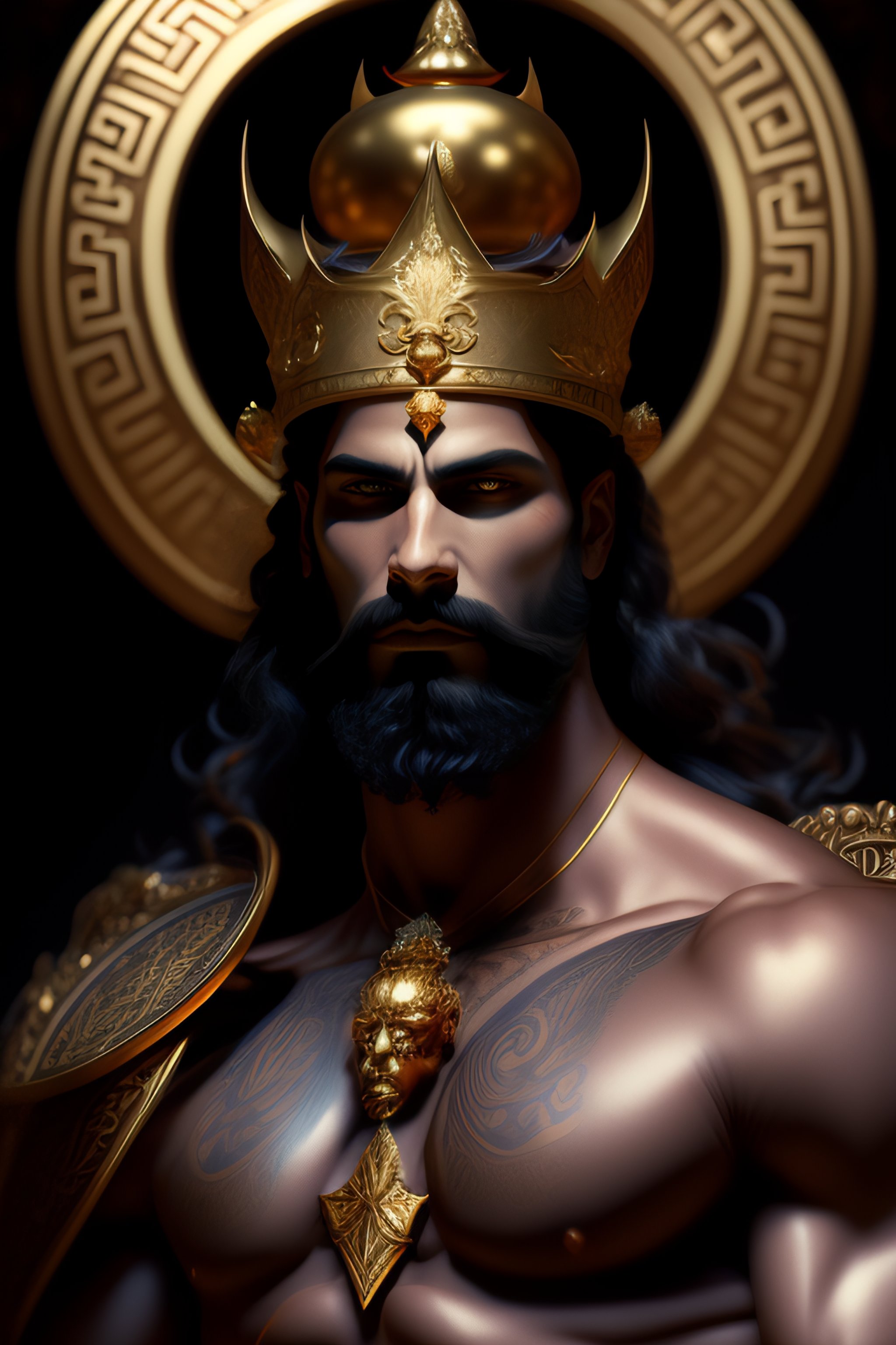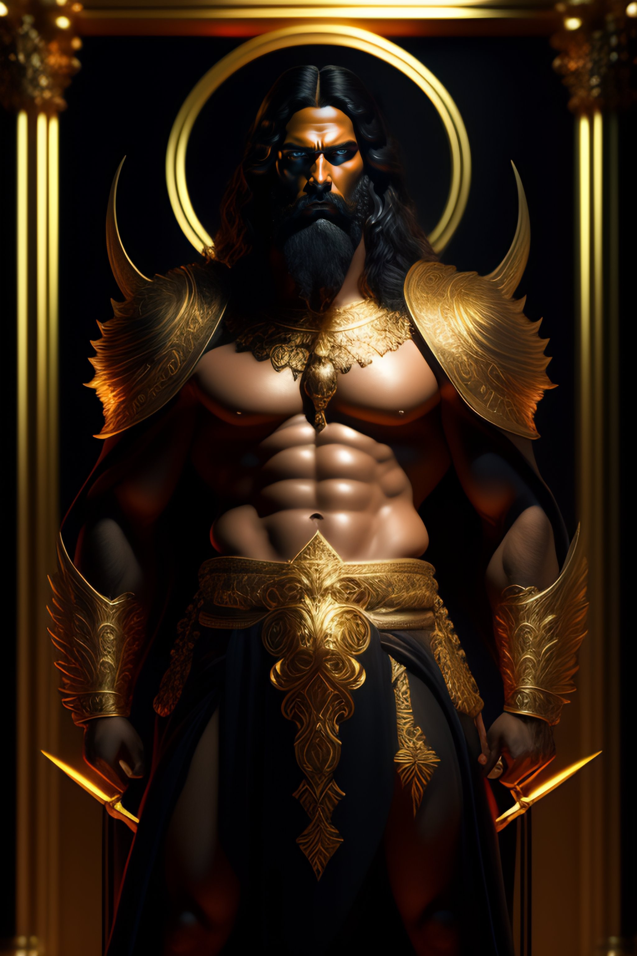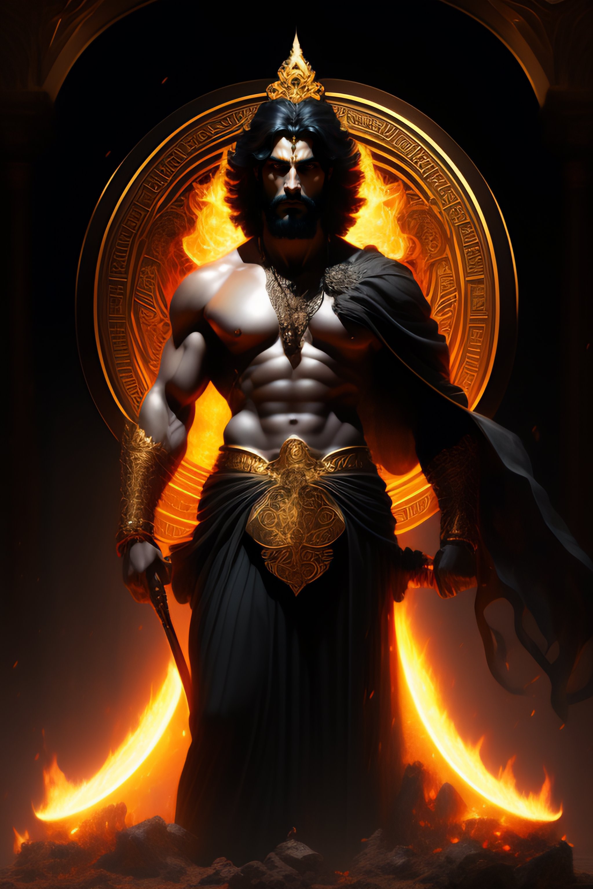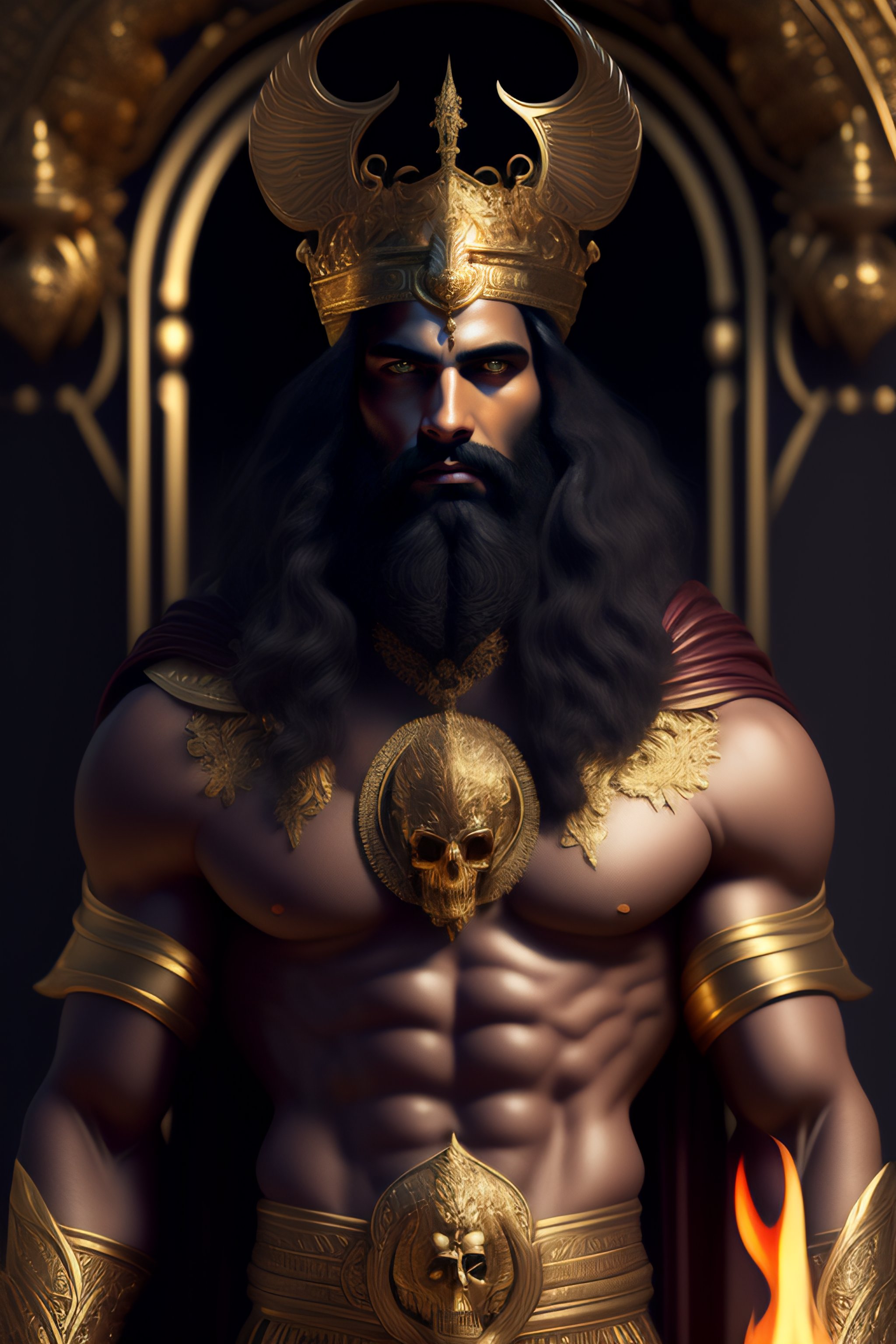 Perfectly detailed greek god hades surrounded by a brilliantly beautiful palace of gold, carrying a two-pronged pitchfork!! blessed by hell with physical perfection man with black beard, intricate and highly detailed dark painting, divine hellenic perfection. digital painting, art station, concept art, sharp soft focus, illustration, art by artgerm and greg rutkowski and alphonse mucha, dante scene, dark portrait. fire, death, skulls and bones, light dark, black clothing