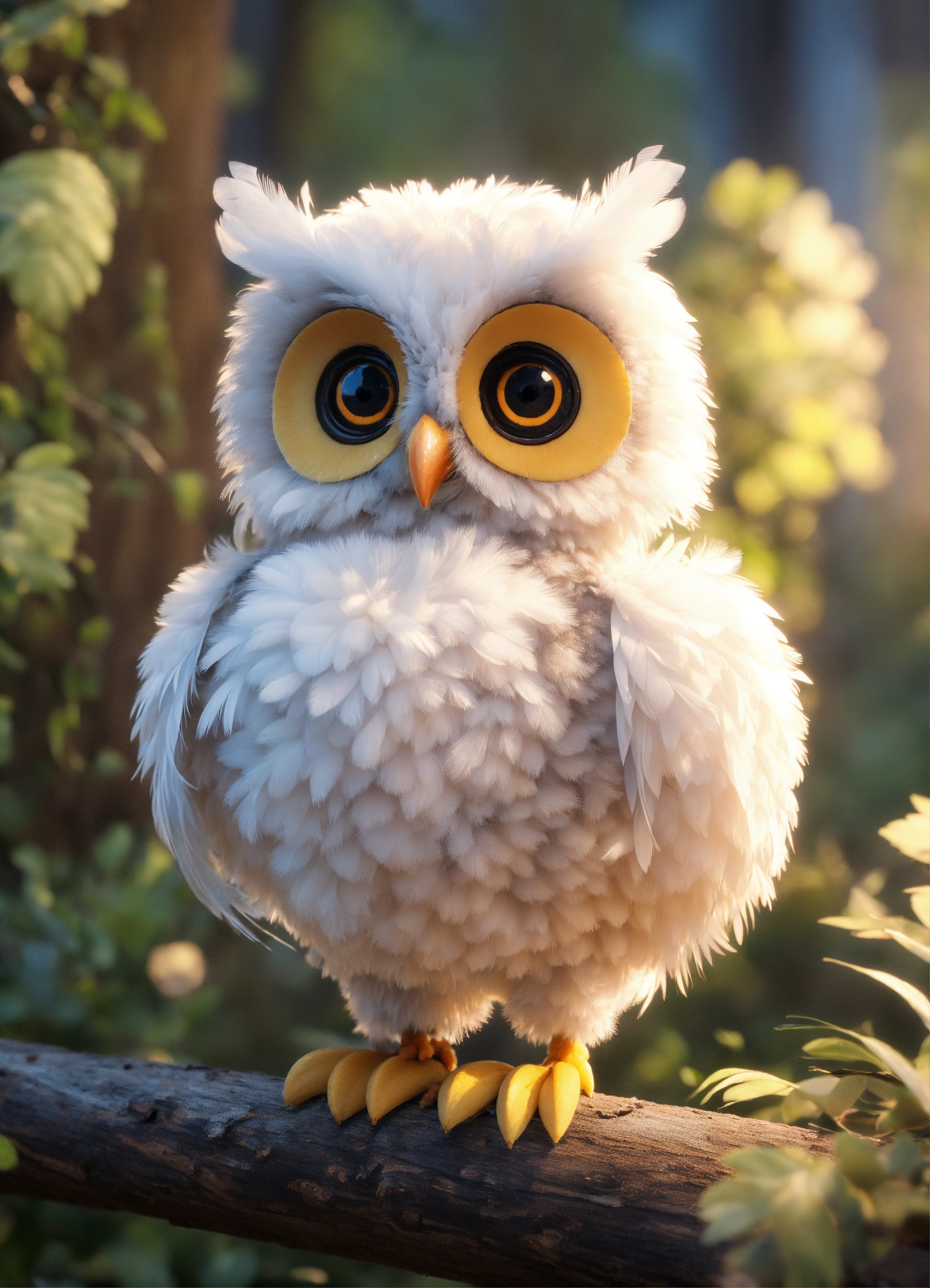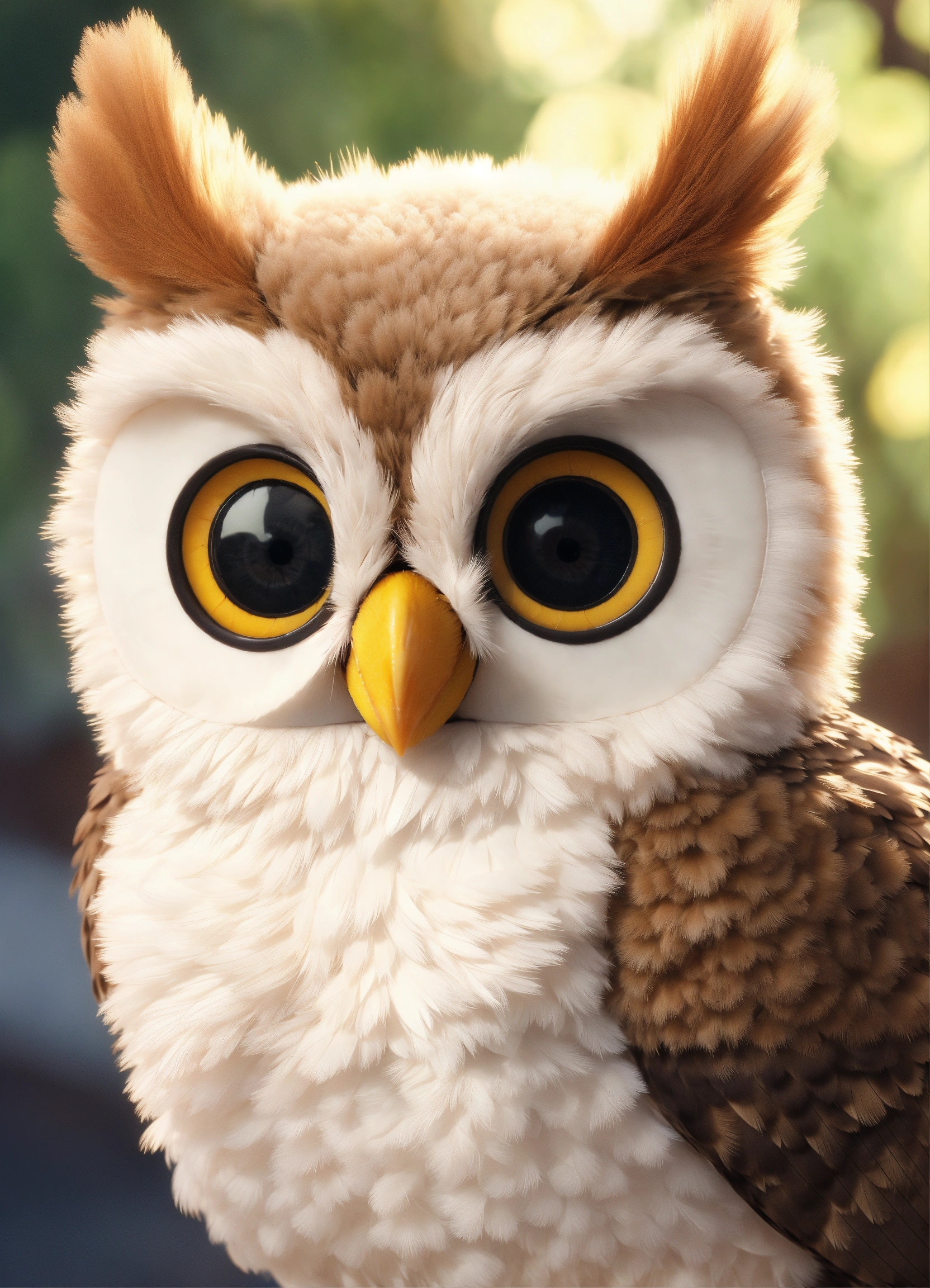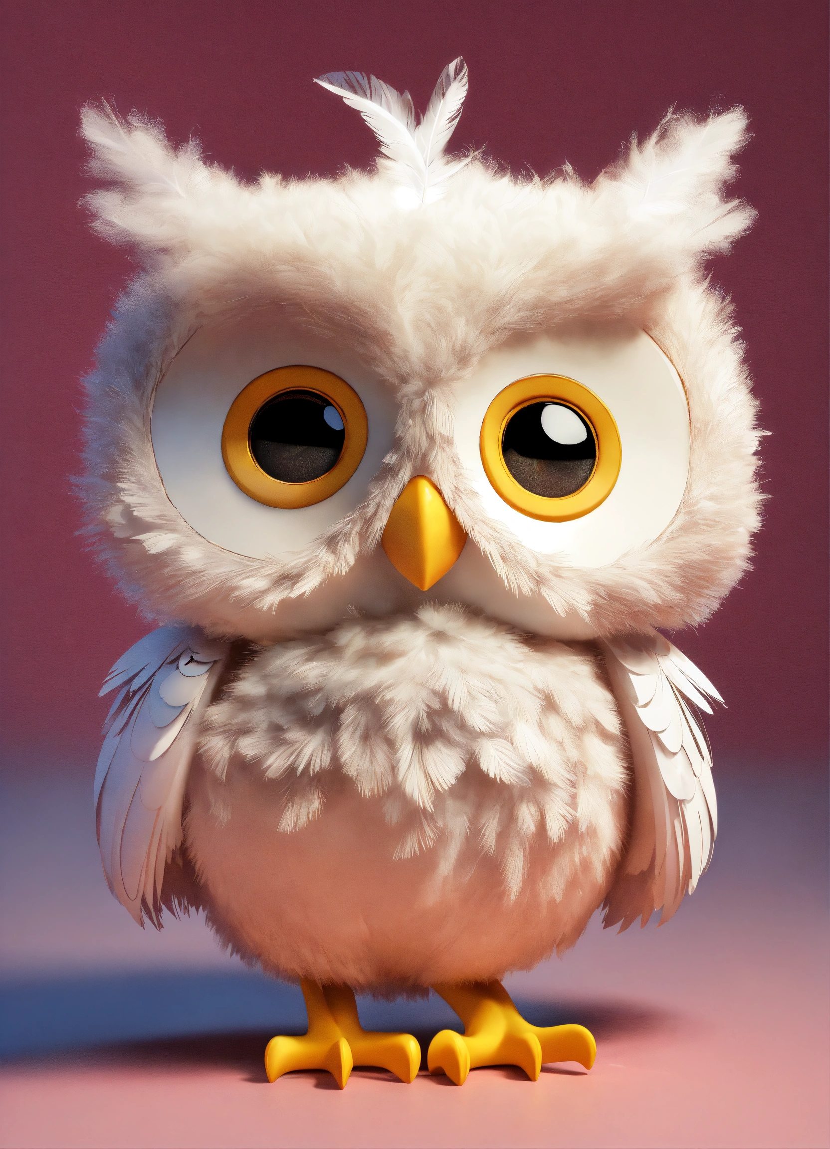 Create a cute and fluffy owl chick with cute eyes, and white feathers looking in front of the camera and smiling in 3d