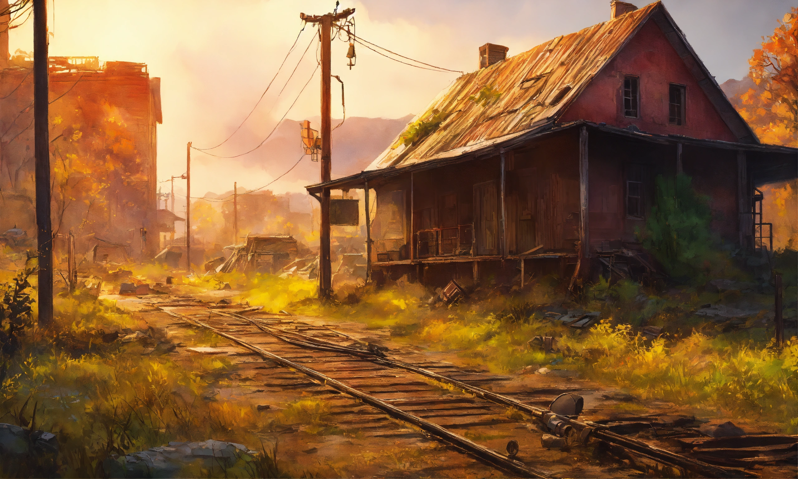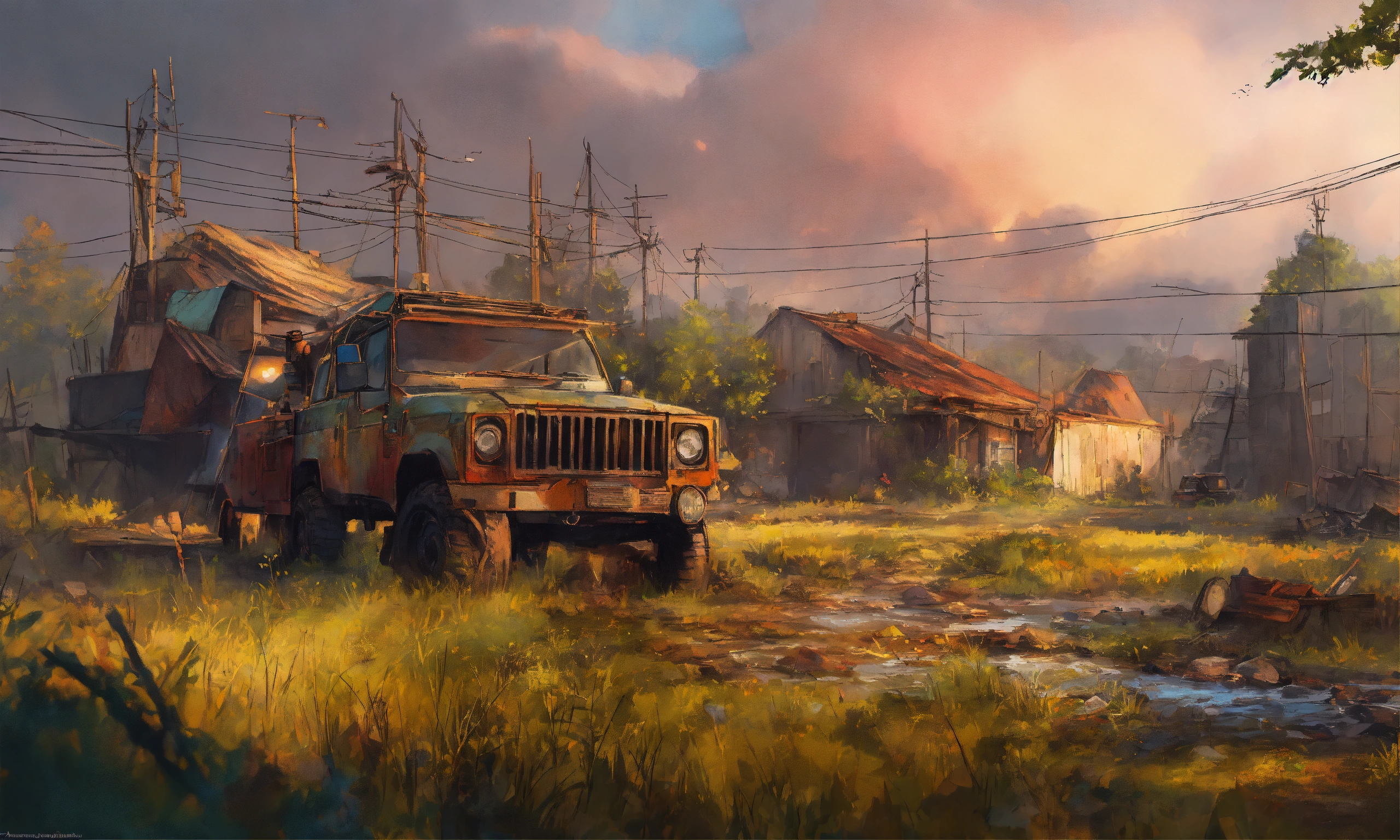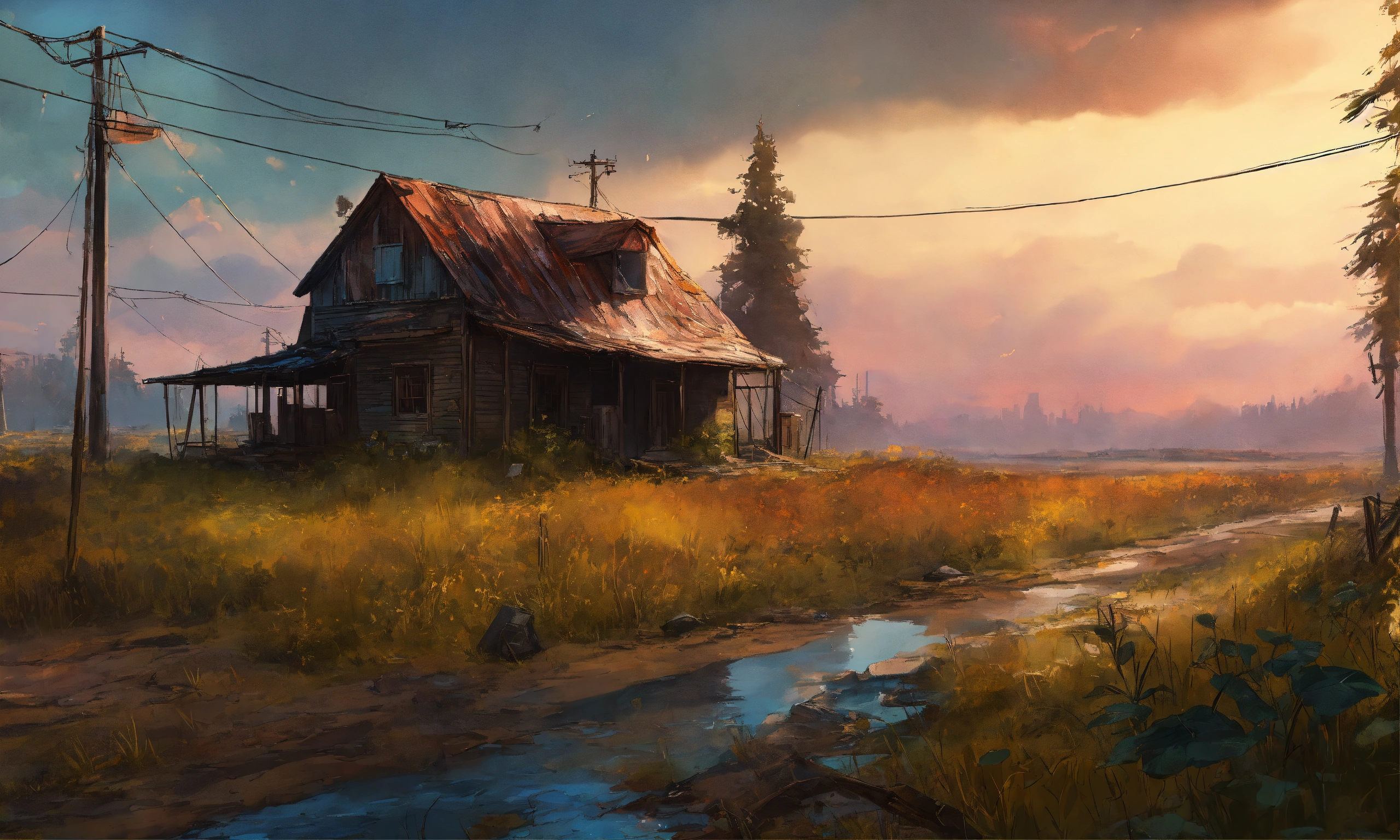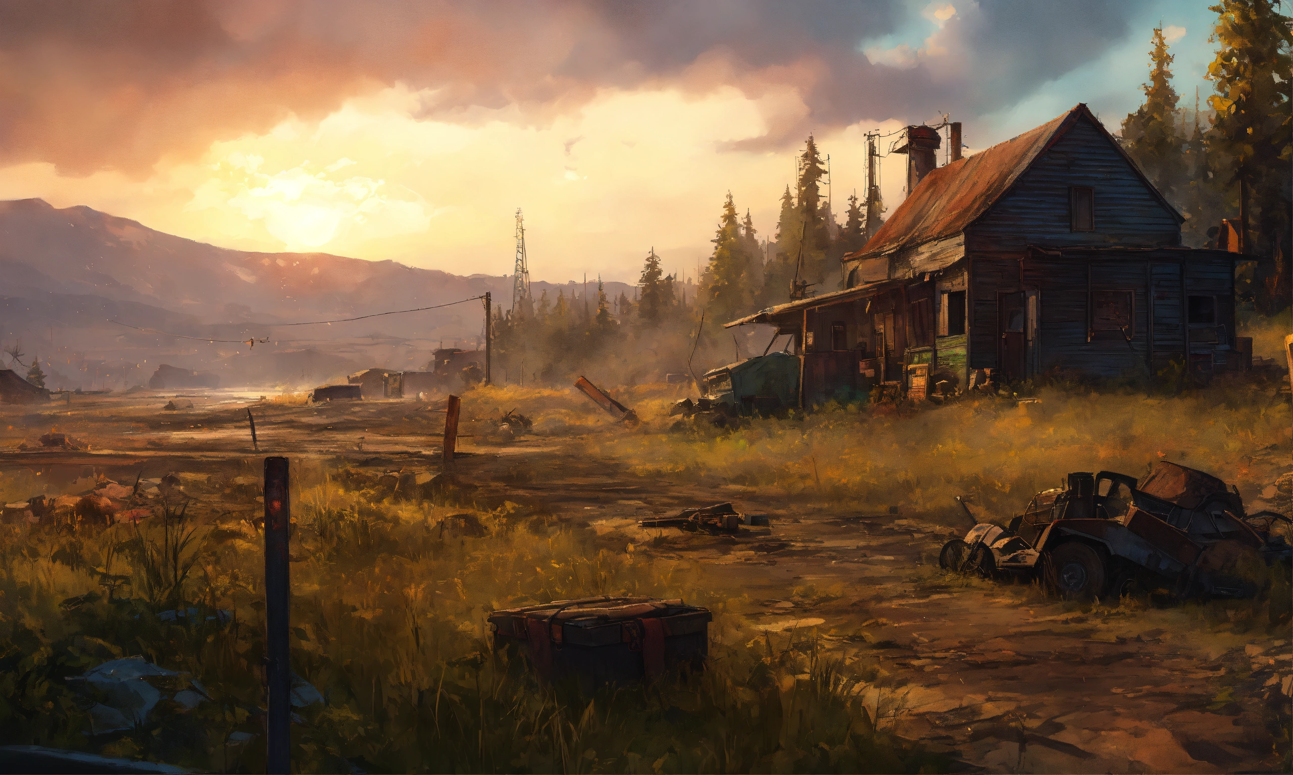 Post-apocalyptic landscape from movie last of us, realistic cartoon oil paint, 2d illustration style, sharp focus, bright color, digital paint game design, trending on artstation, volumetric details, simple lines, outpaiting, art by viktoria gavrilenko, josé luis ágreda, greg rutkowsk, magali villeneuve, camilla d'errico and artgem