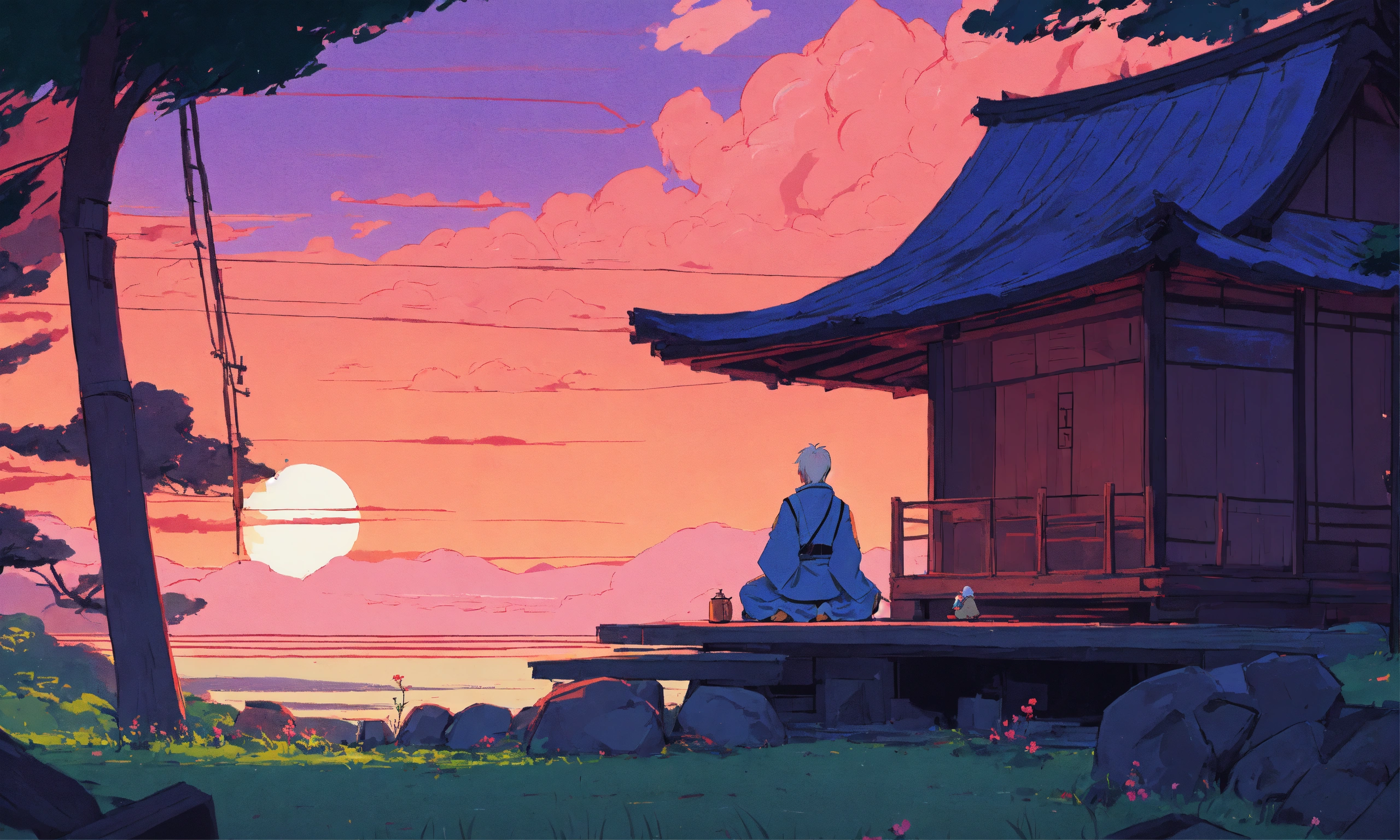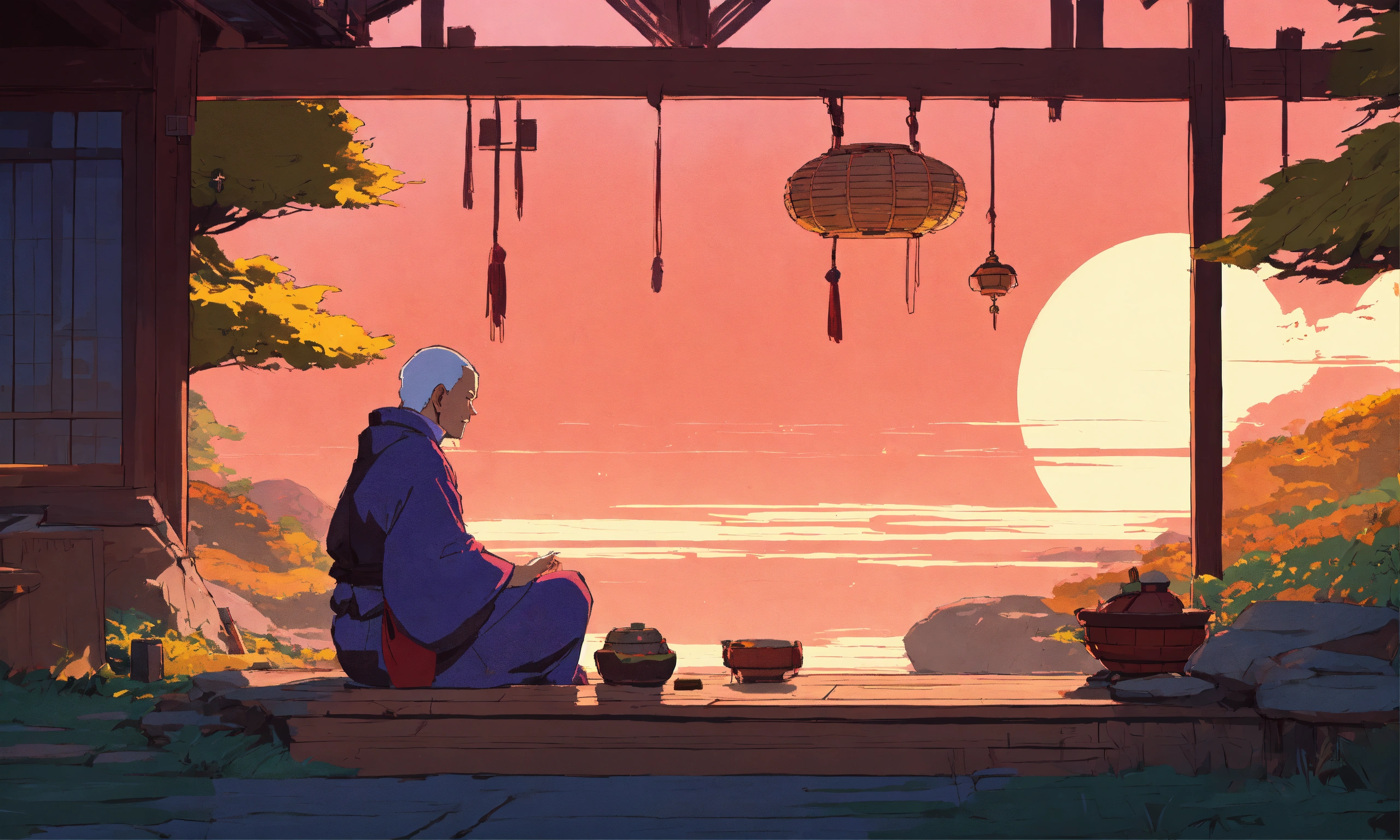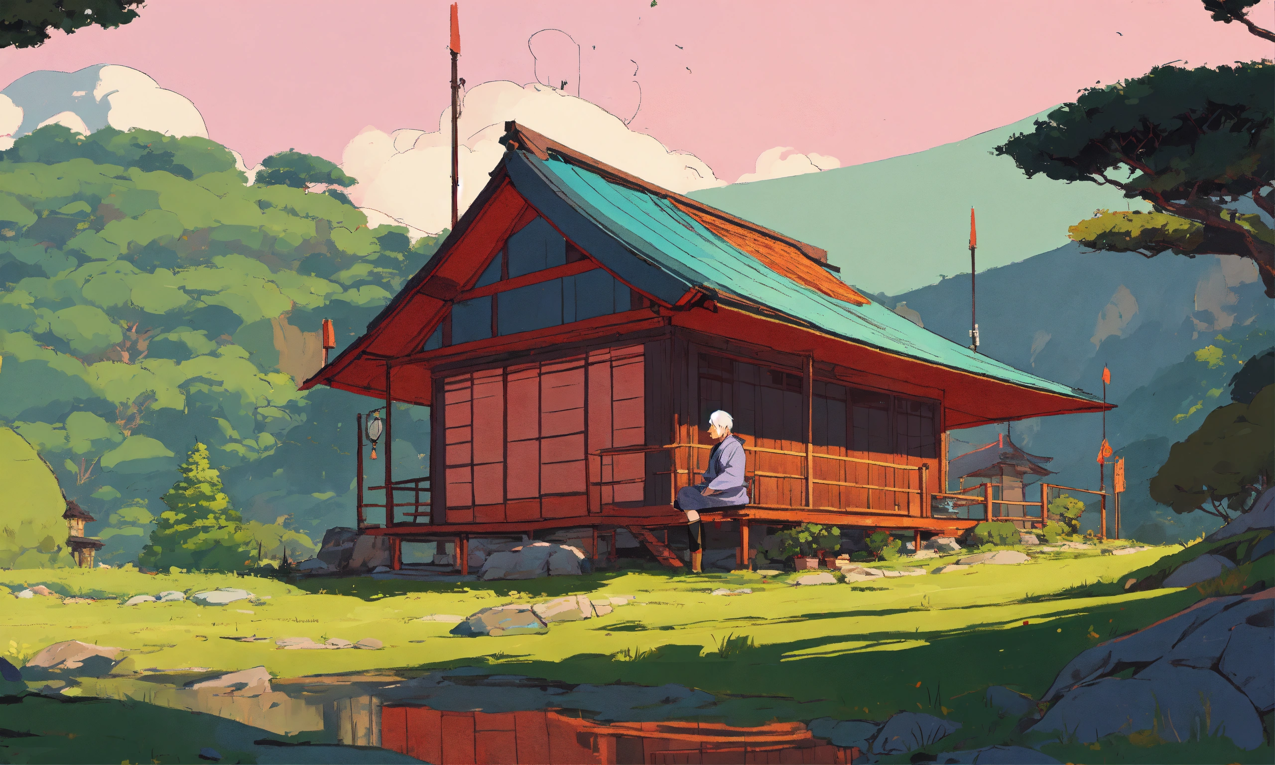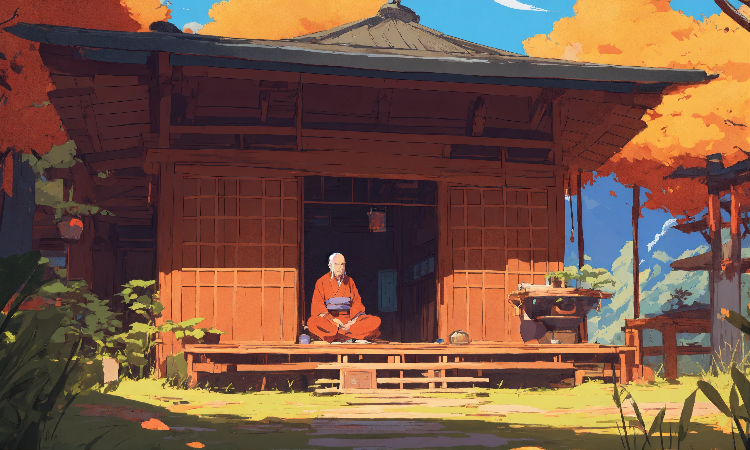 Digital art of a zen master sitting near a hut, cartoony style of laurie greasley, studio ghibli, akira toriyama, james gilleard, genshin impact, trending pixiv fanbox, acrylic palette knife, 4k, vibrant colors, devinart, trending on artstation, low details