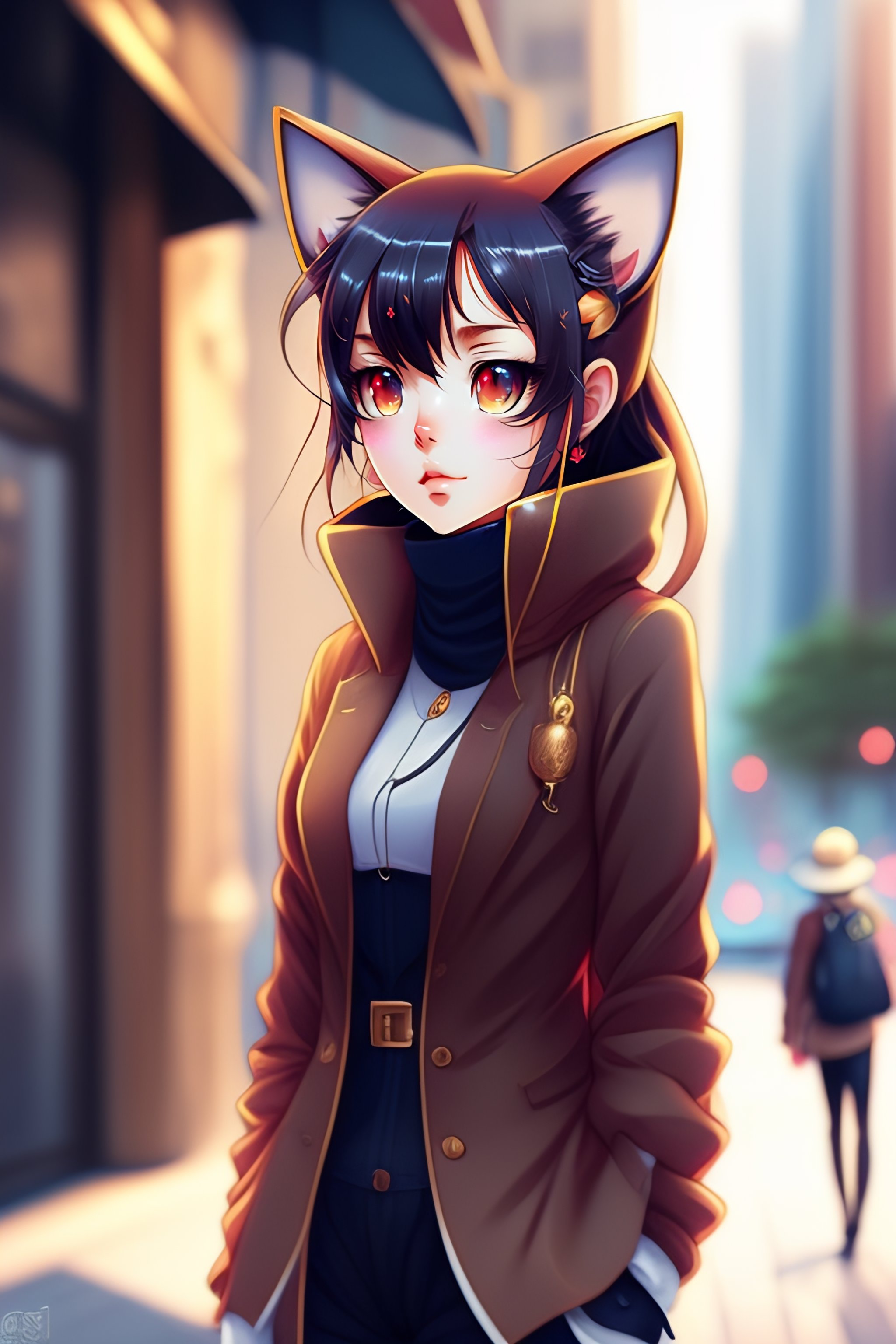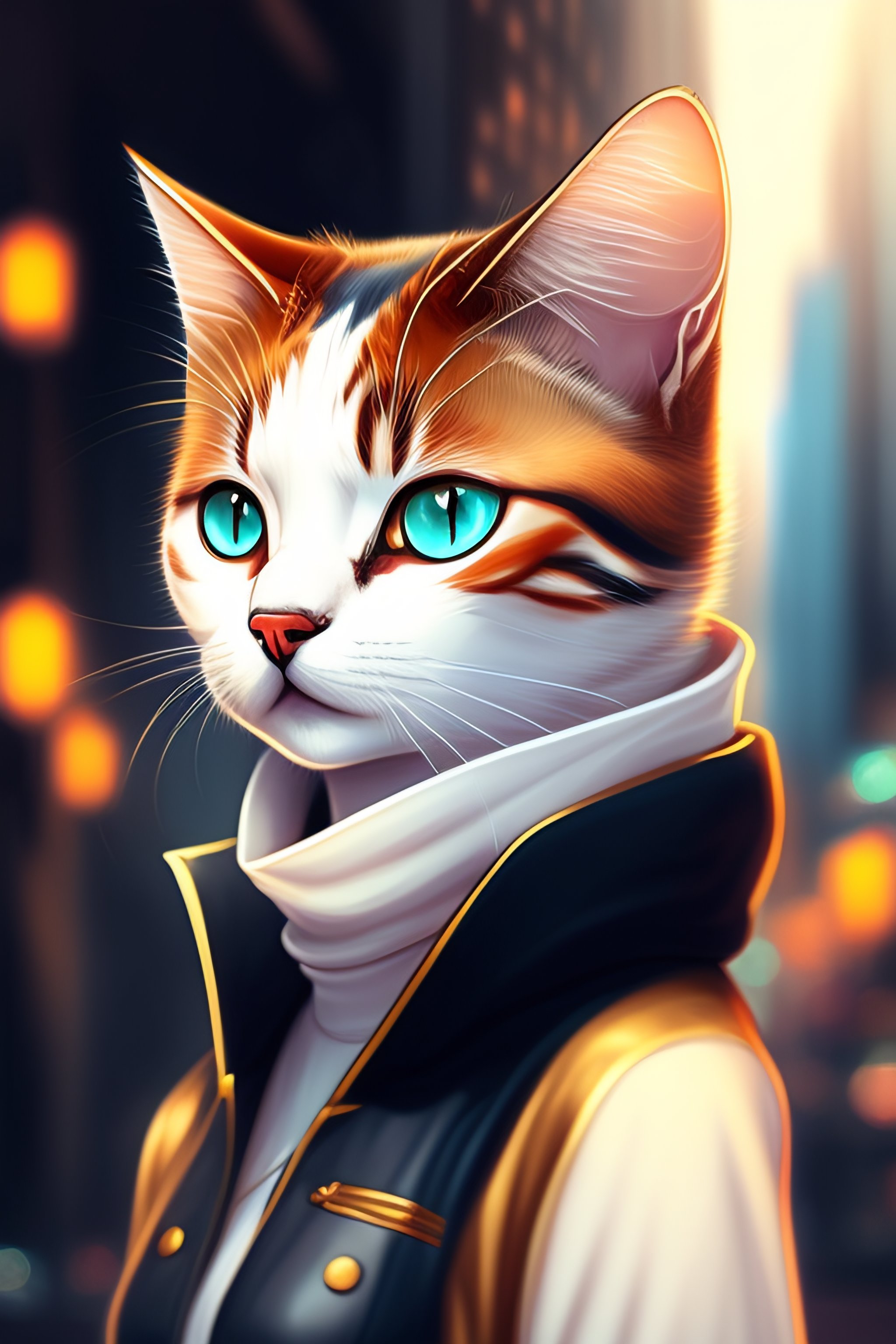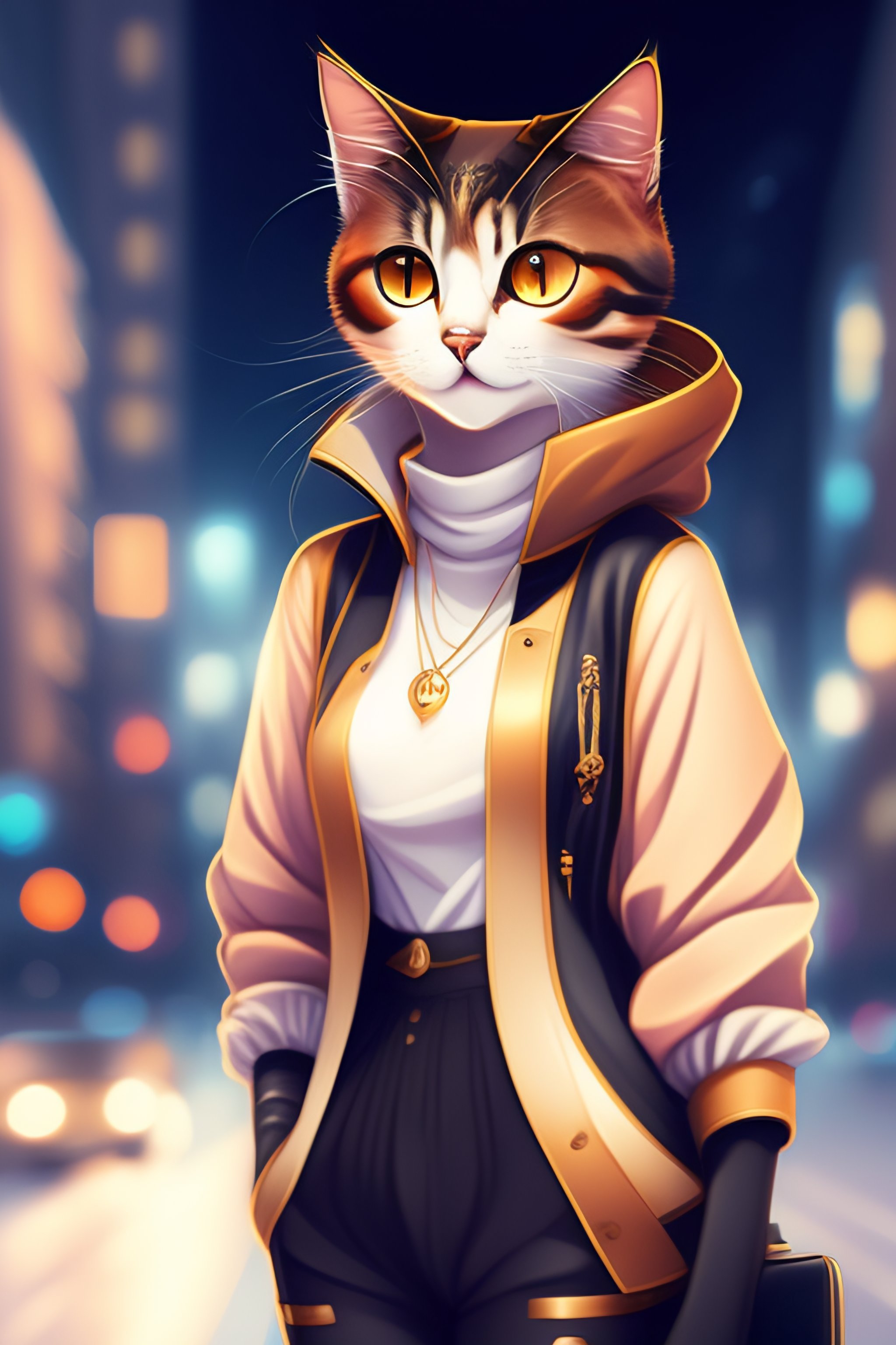 Anime style elegant cat in urban outfit, cute fine face, rounded eyes, digital painting, fan art, pixiv