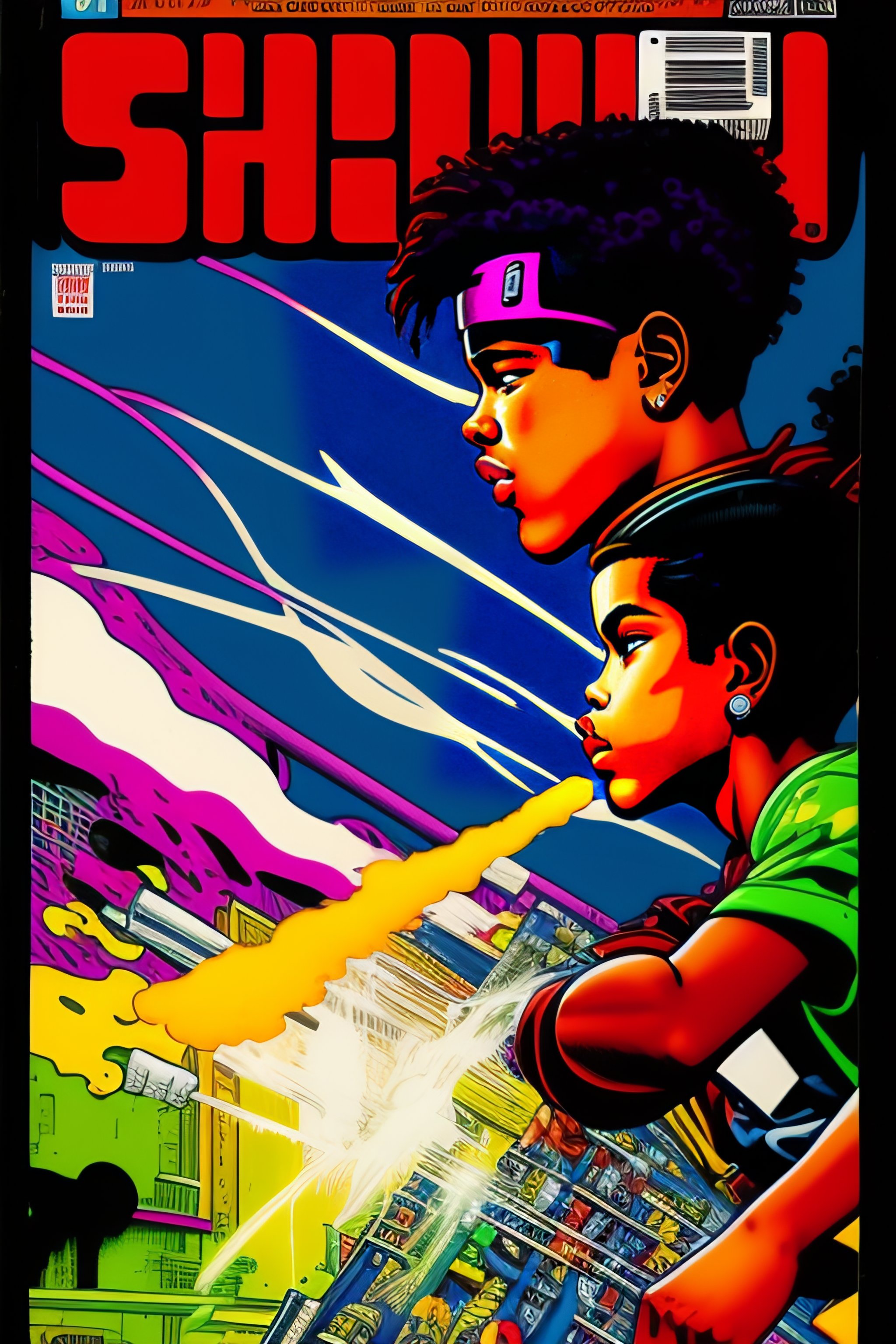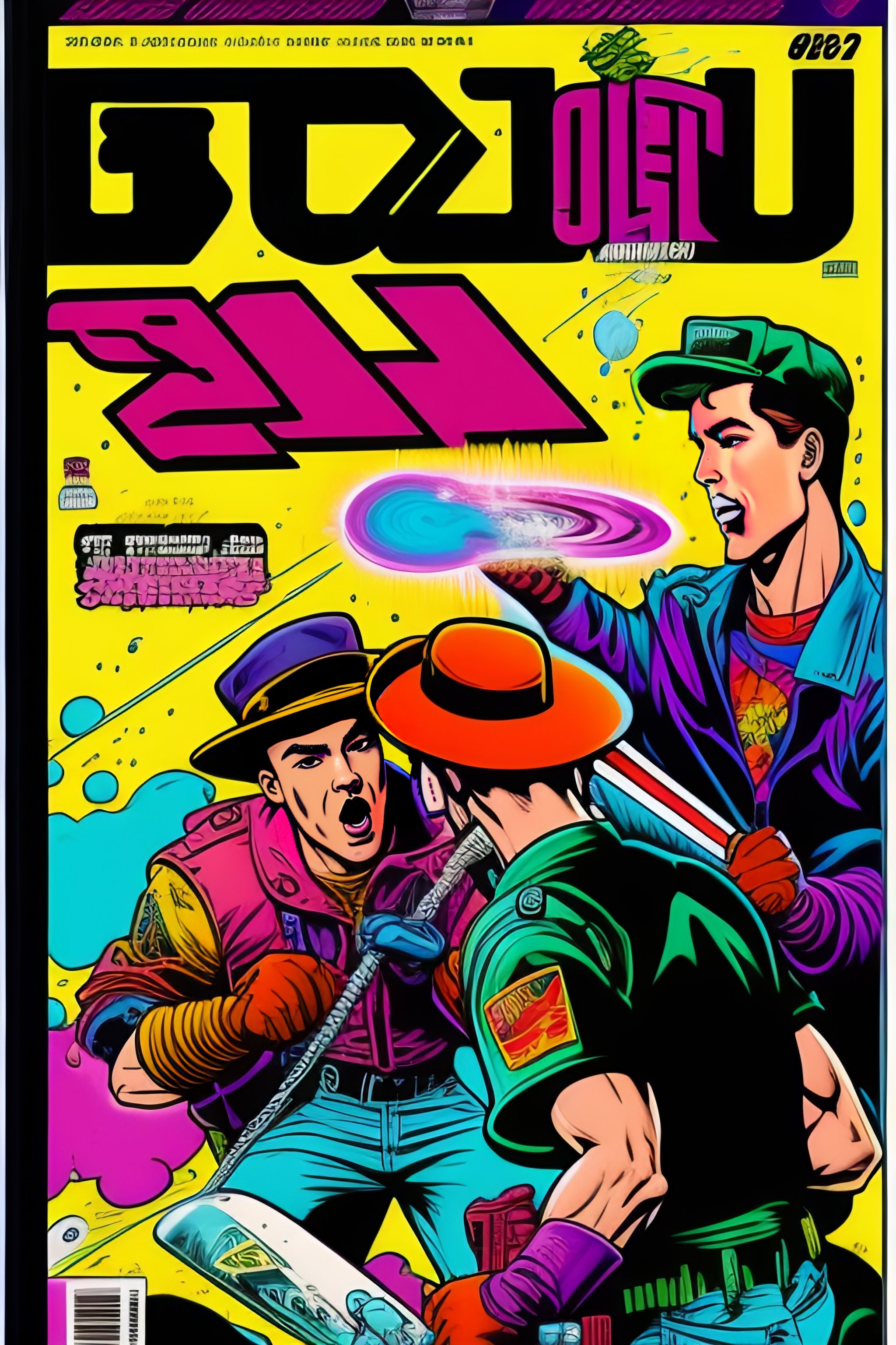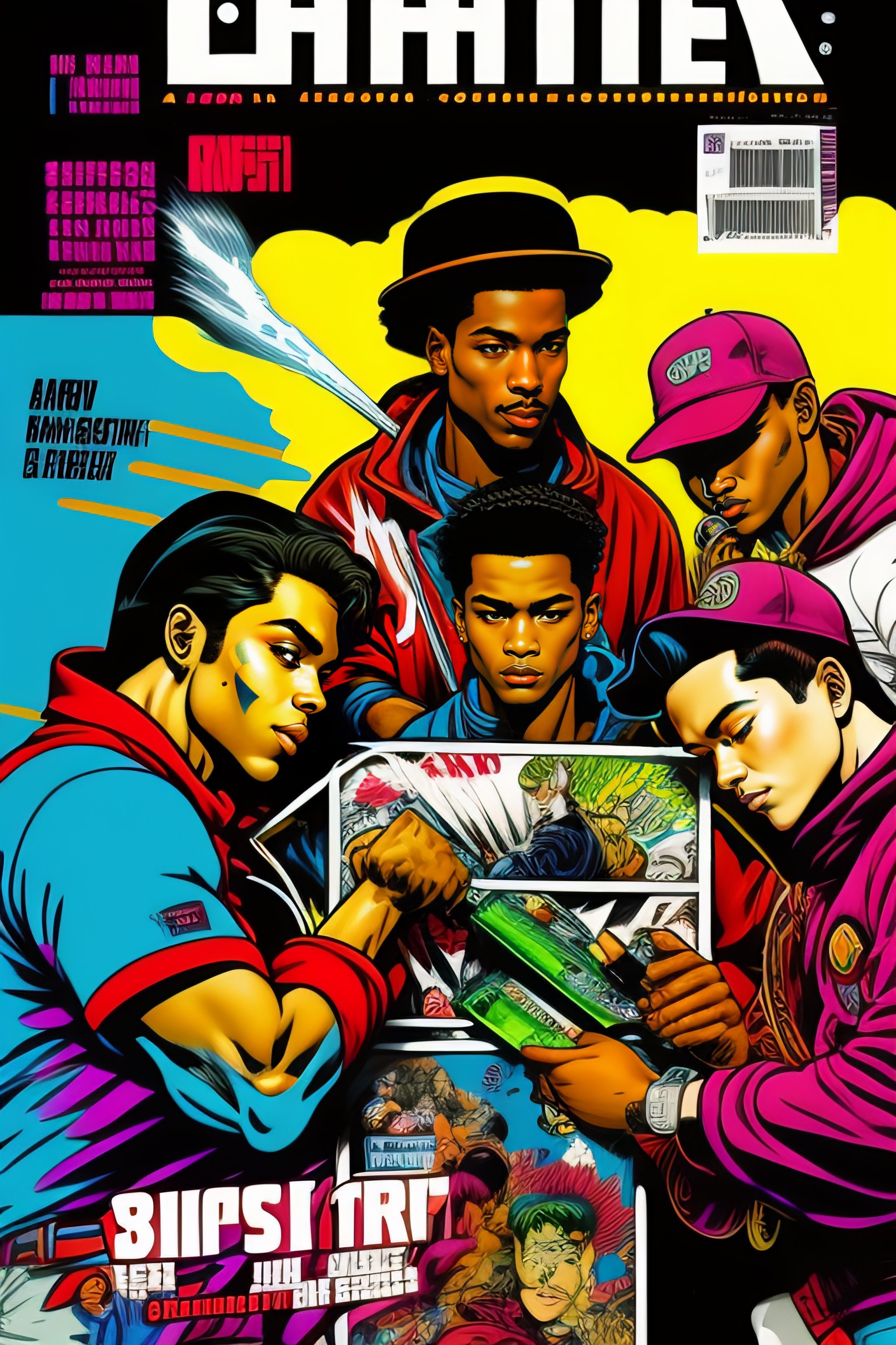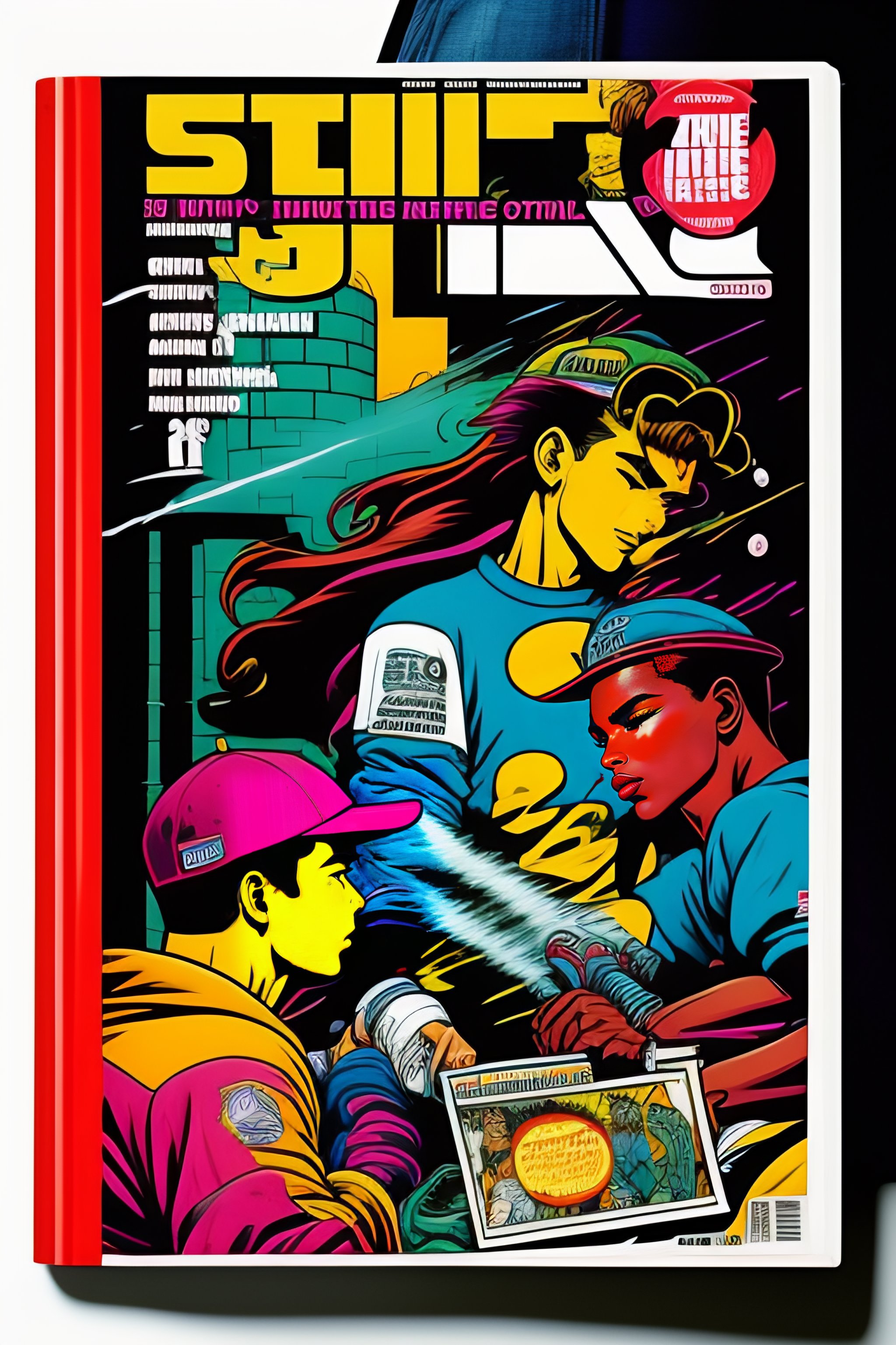 90s magazine comic art of a group of friends spraying graffiti magazine cover