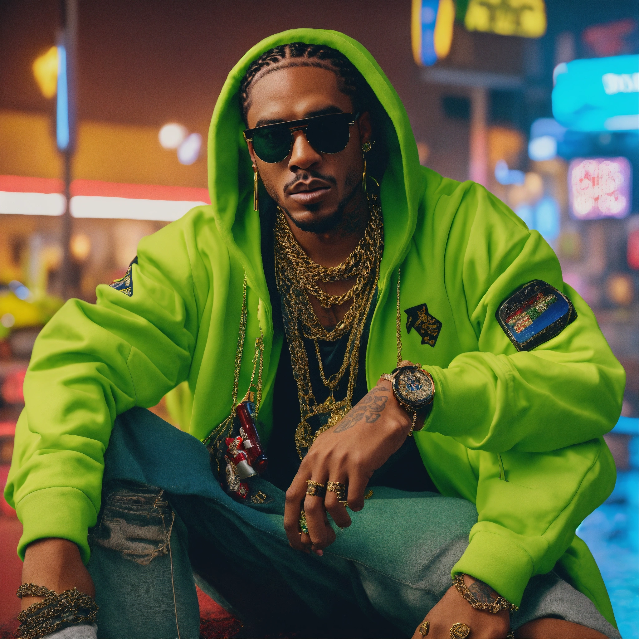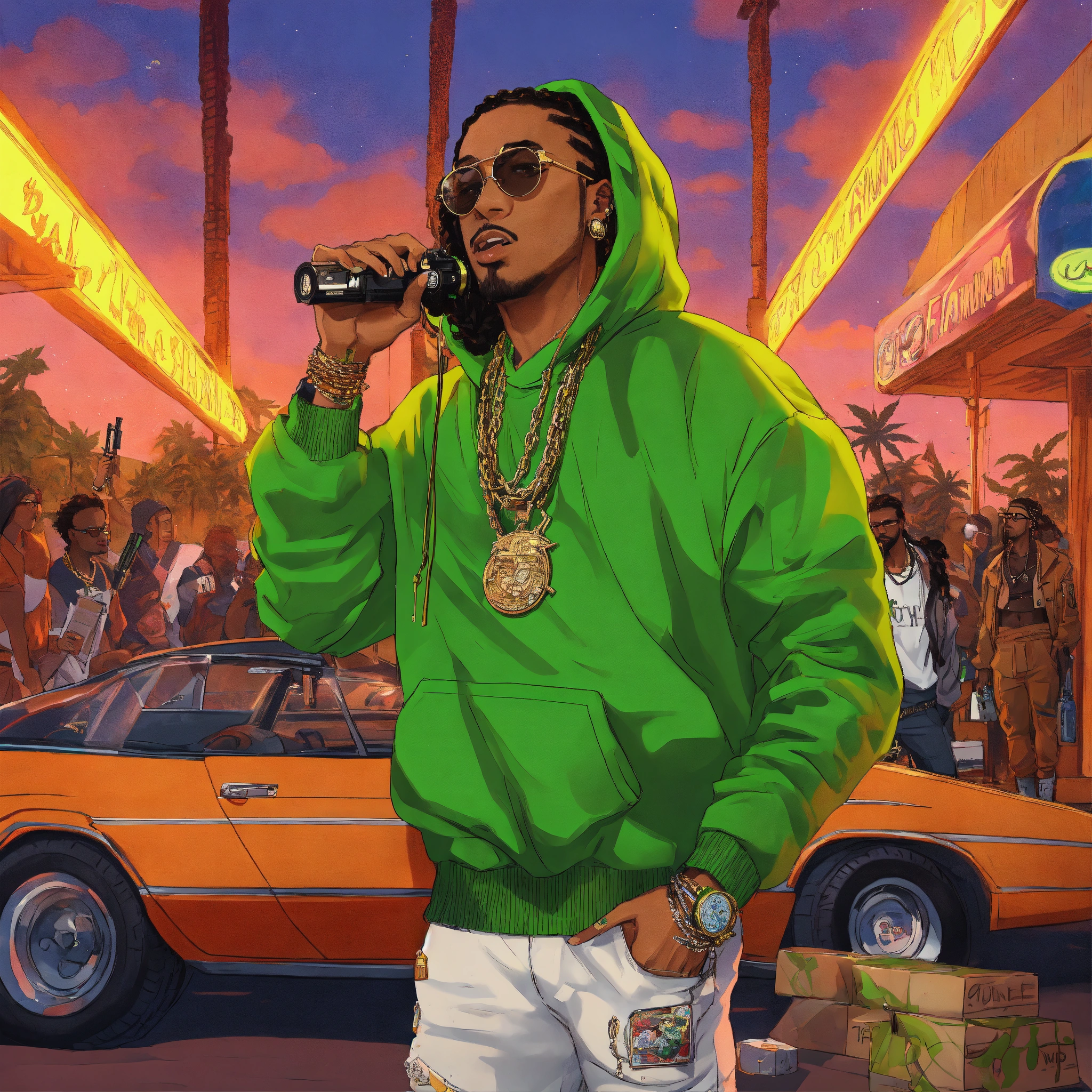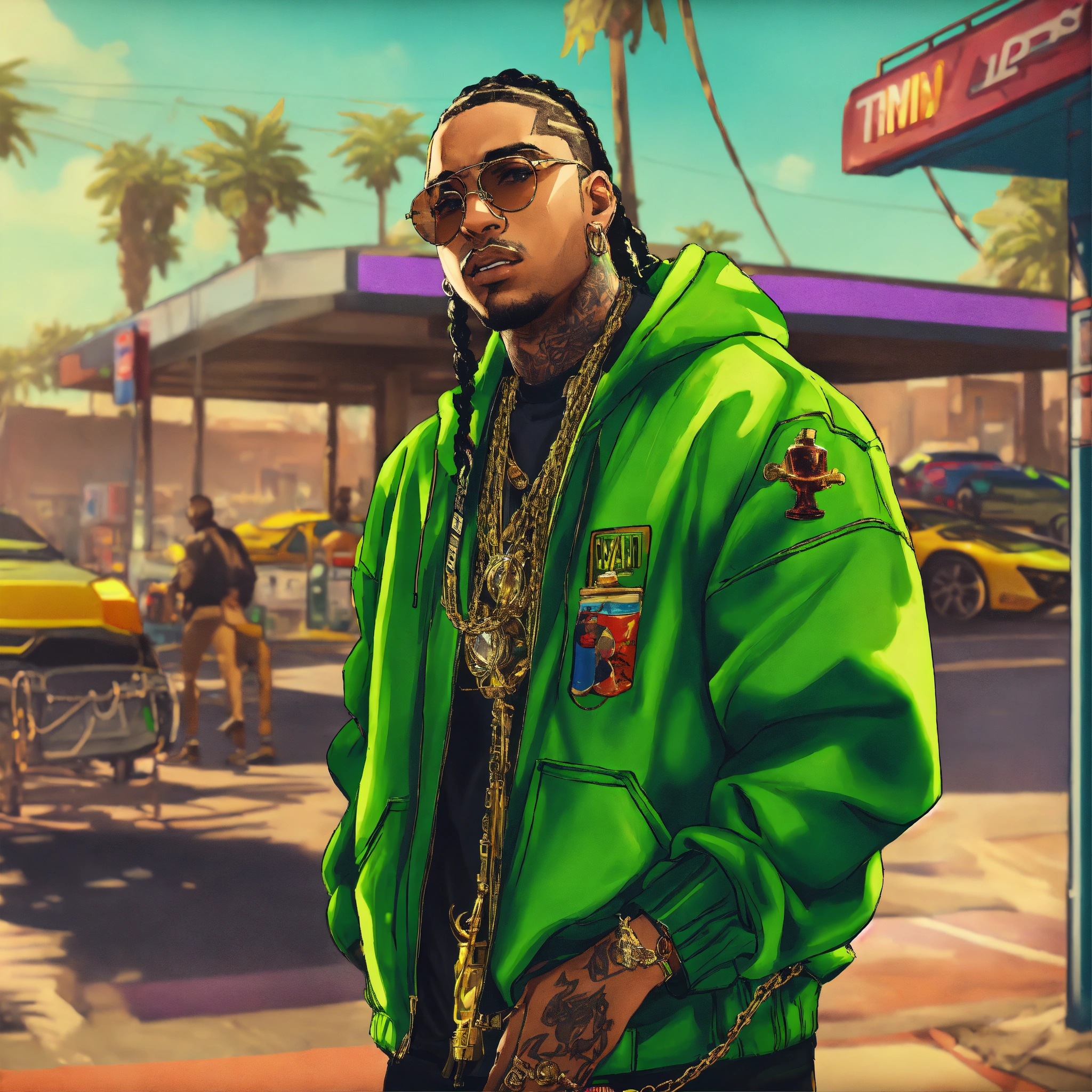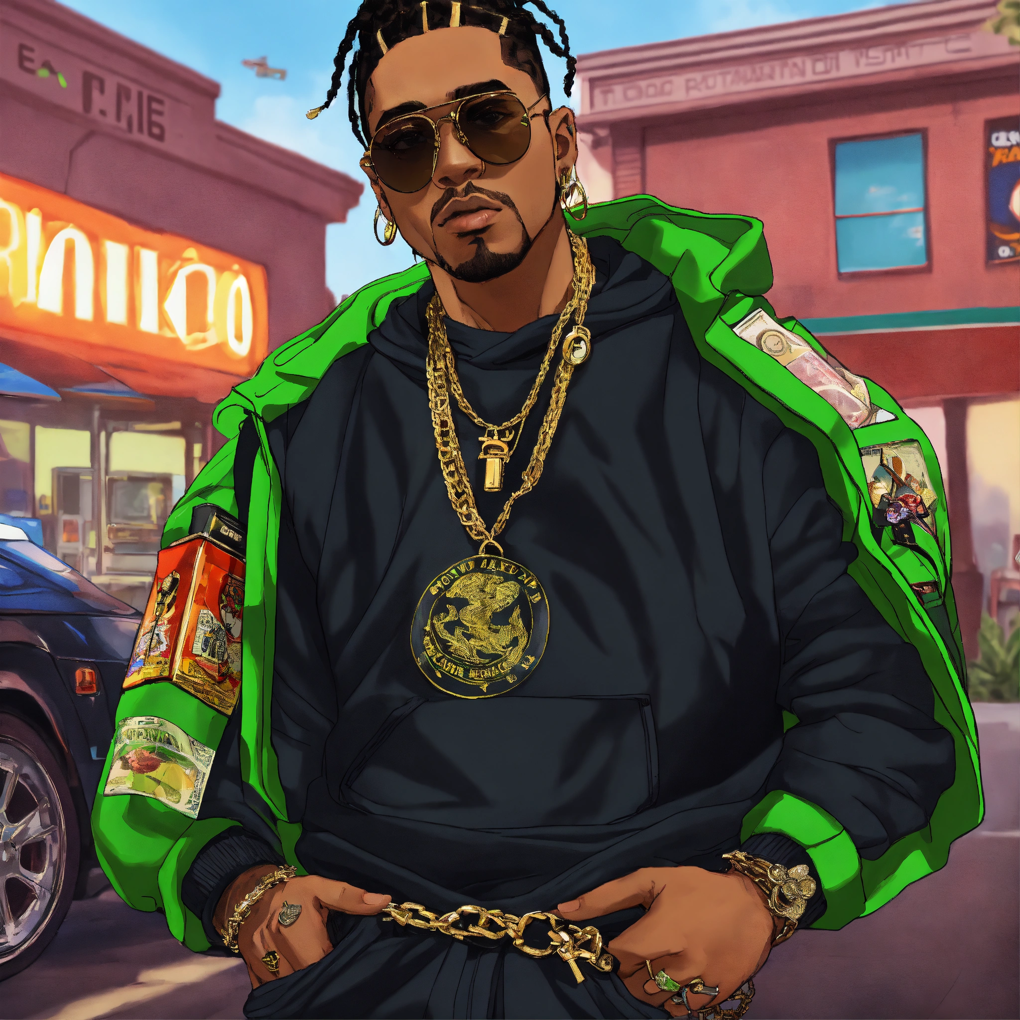 Hd, 4k, background is a gas station with luxury trap scene like grand theft auto in the background of trap rapper-type images (guns & bullets, cough syrup, cash, weed, people shooting dice, lime green lambo etc). rapper who is mexican light skin with skinny braided hair which goes down to his stomach. he is wearing a fendi brand hoodie. he has 2 chains on. one chain has a pendant that says "tmh" and the other is a circle pendant. he is the rapper known as ramzydaplug. nose hoop ring in. dolce and gabana glasses. braided hair to chest. he has skinny-braided-hair down to his stomach. black chin hair.