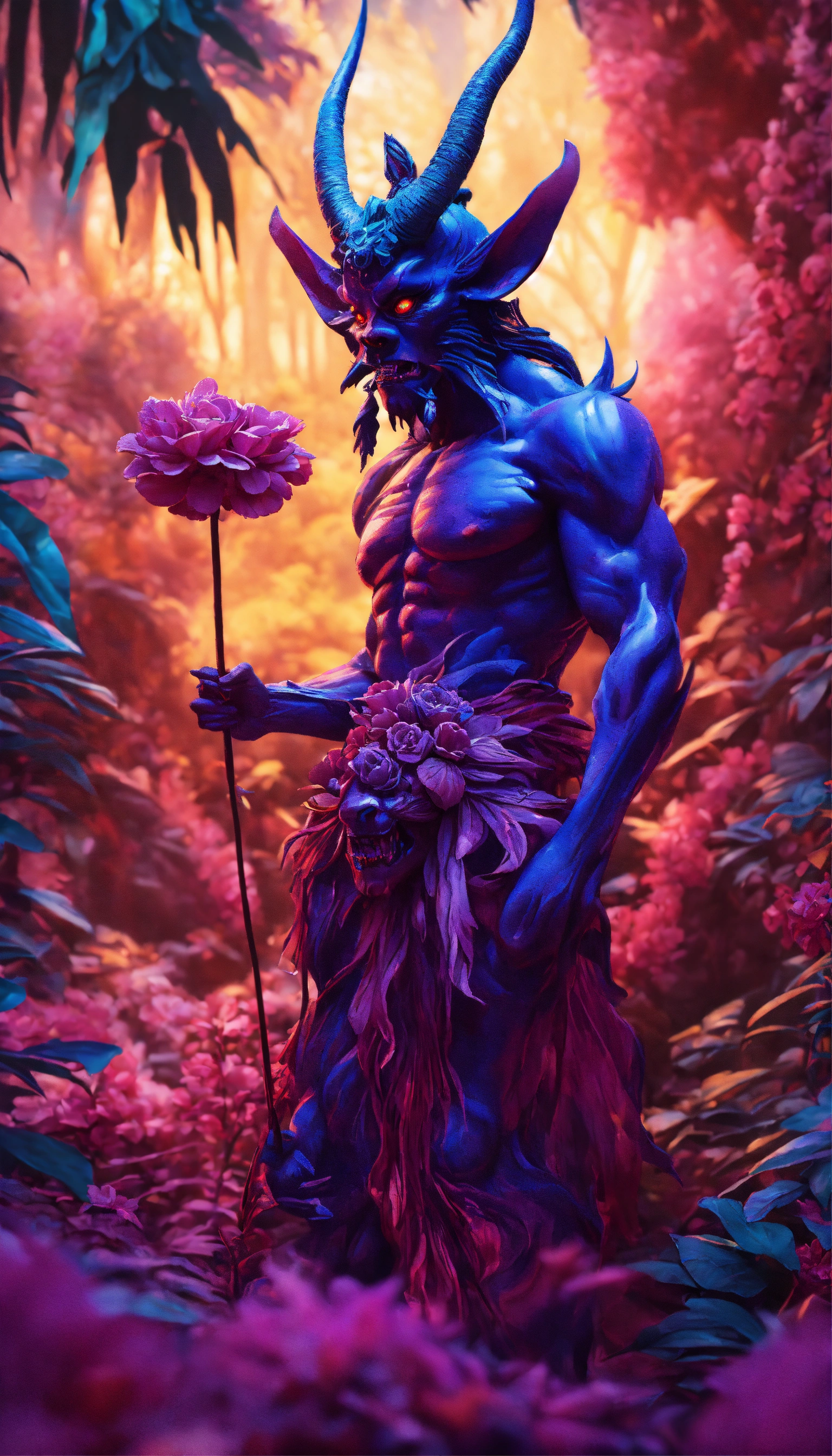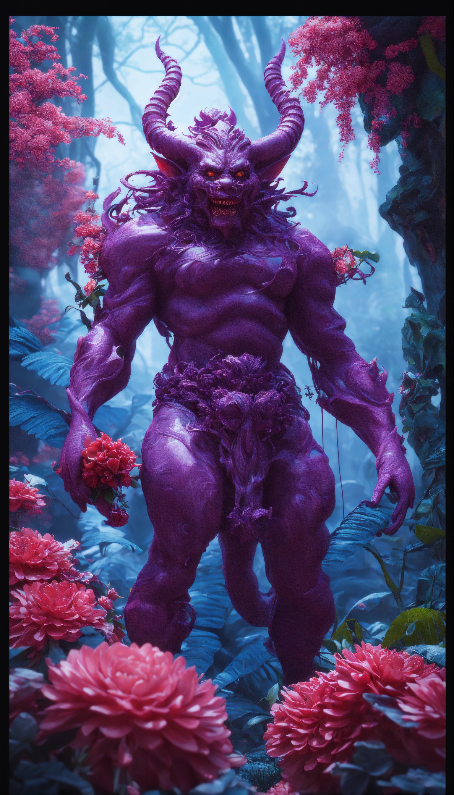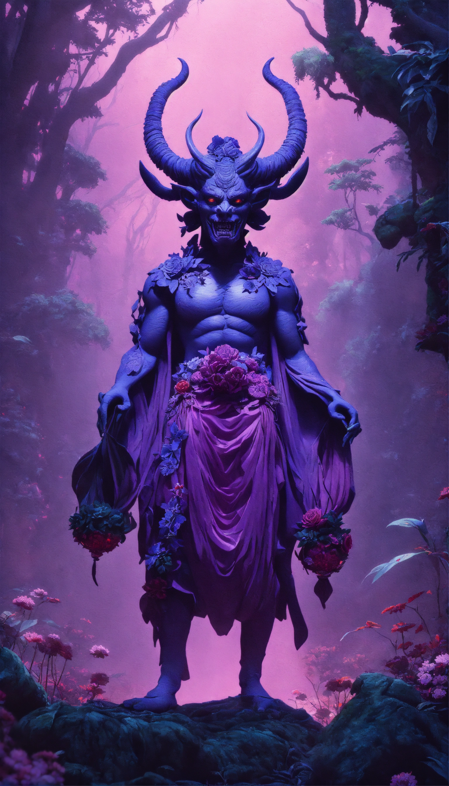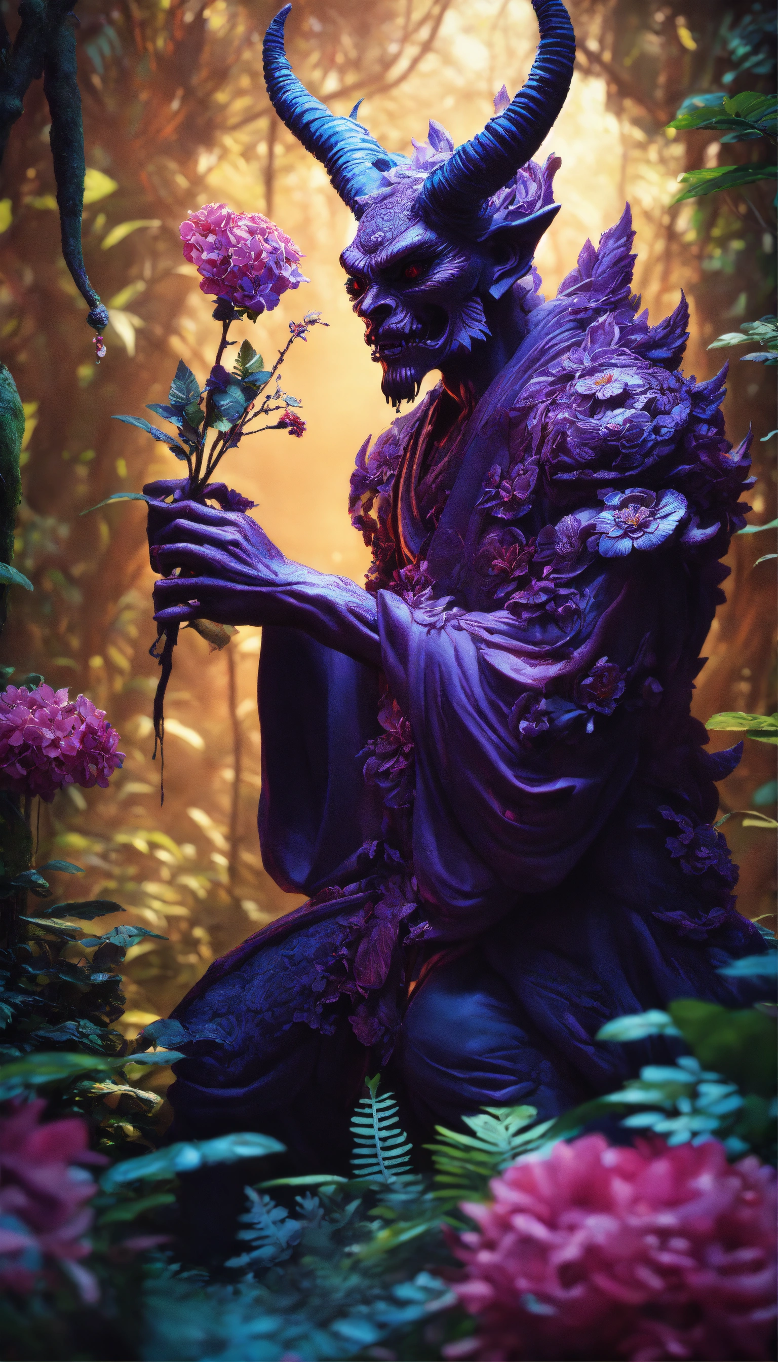 Extremely ultrarealistic photorealistic 3d scary purple japanese demon holding a flower in a vast jungle, by james jean and android jones jeff koons erin hanson joe fenton dan mumford professional photography, natural lighting, volumetric lighting maximalist photoillustration 8k resolution intricately detailed, complex, elegant, expansive, fantastical