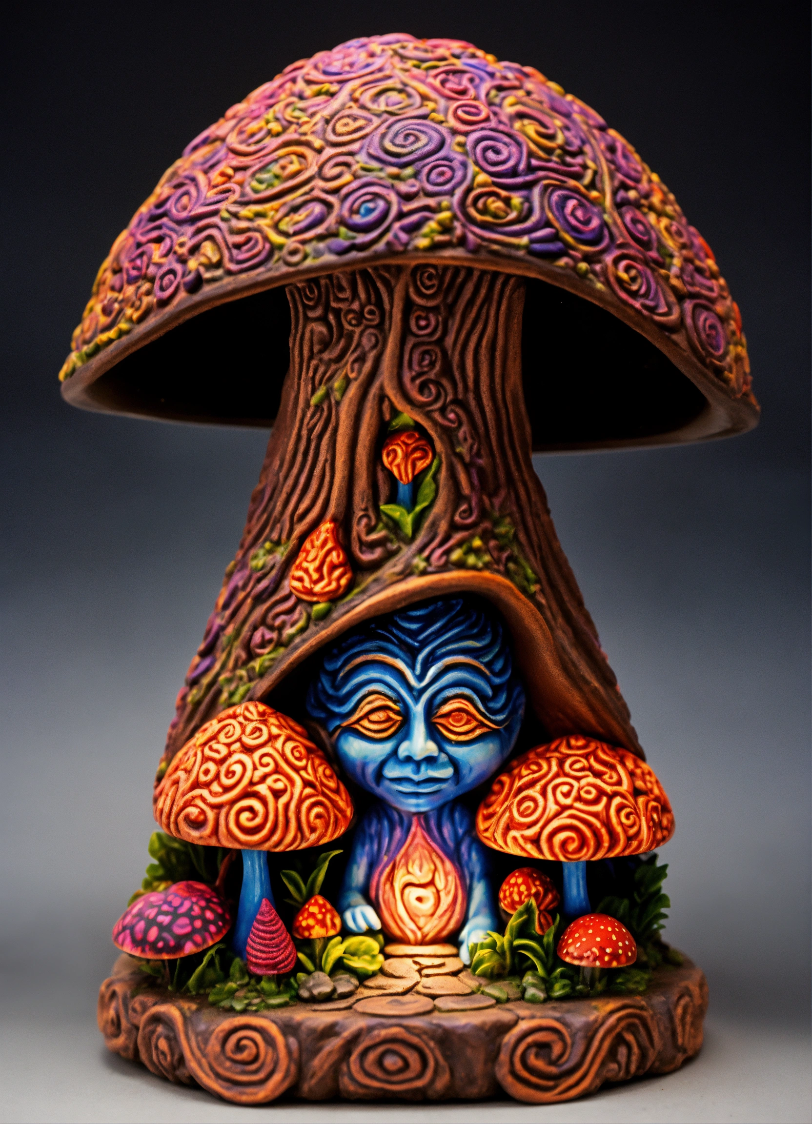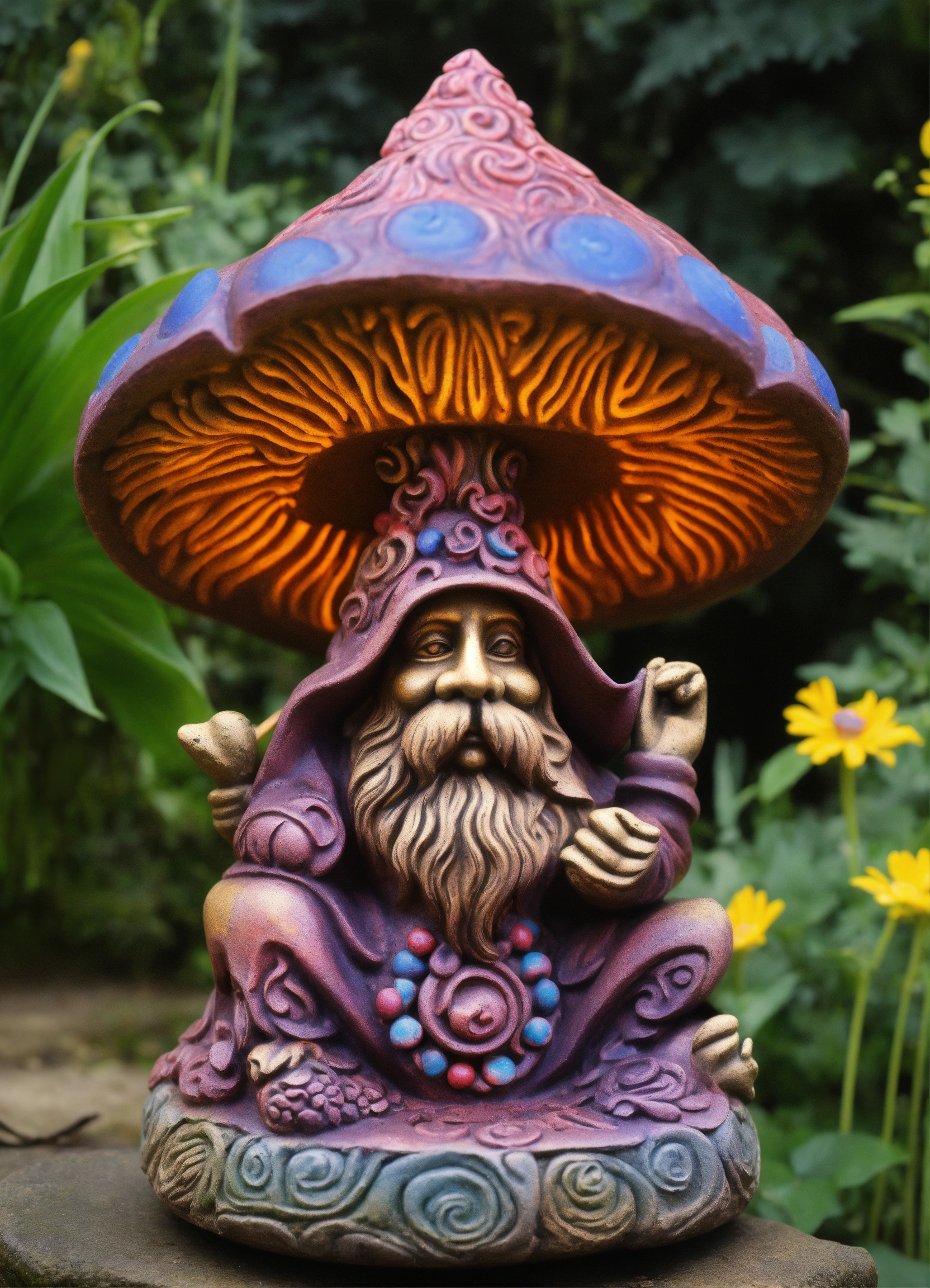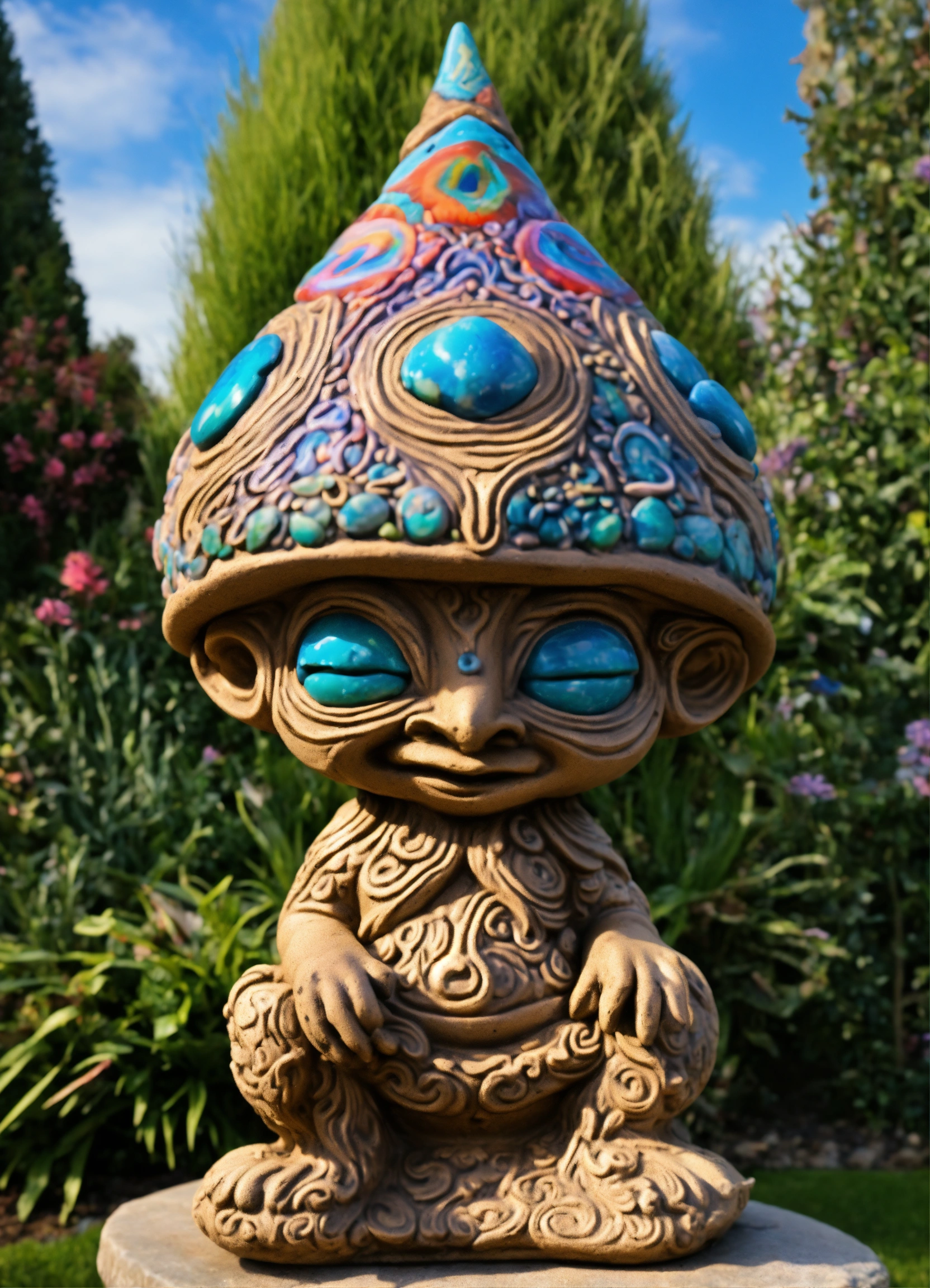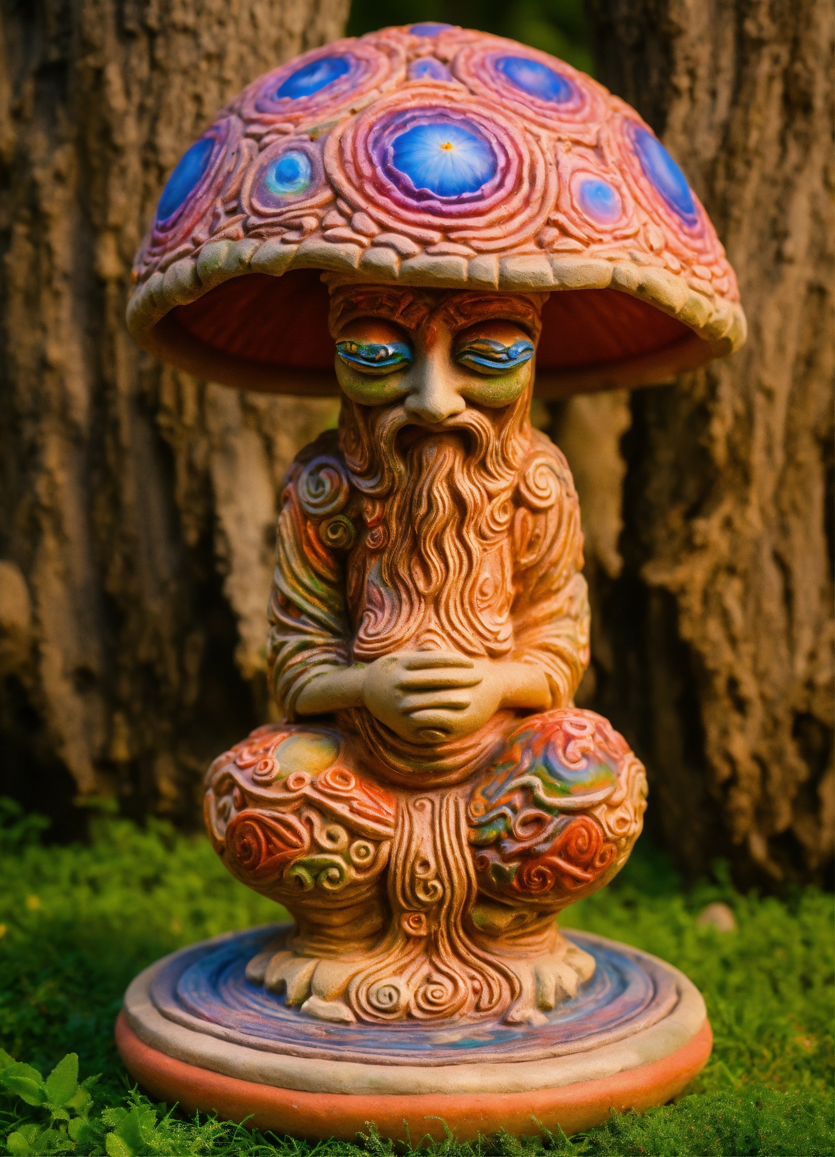 A round shaped ancient stone hand made meditative hooded gnome totem garden sculptured gazeebo in the style of alex grey, magic mushroom, lsd, dmt