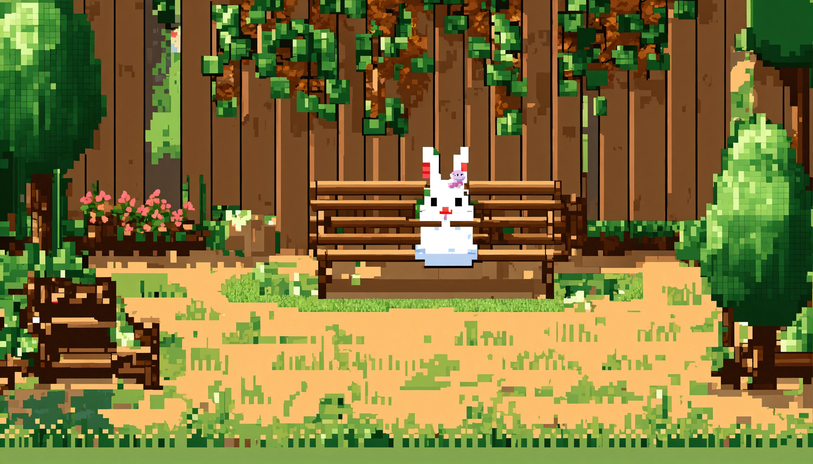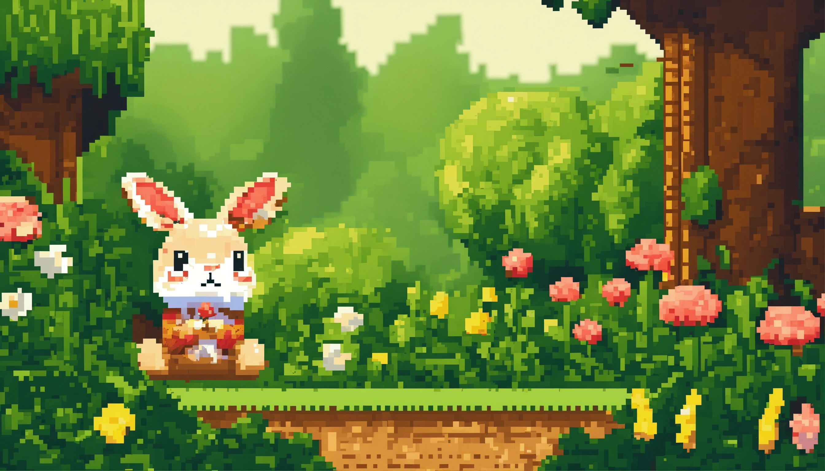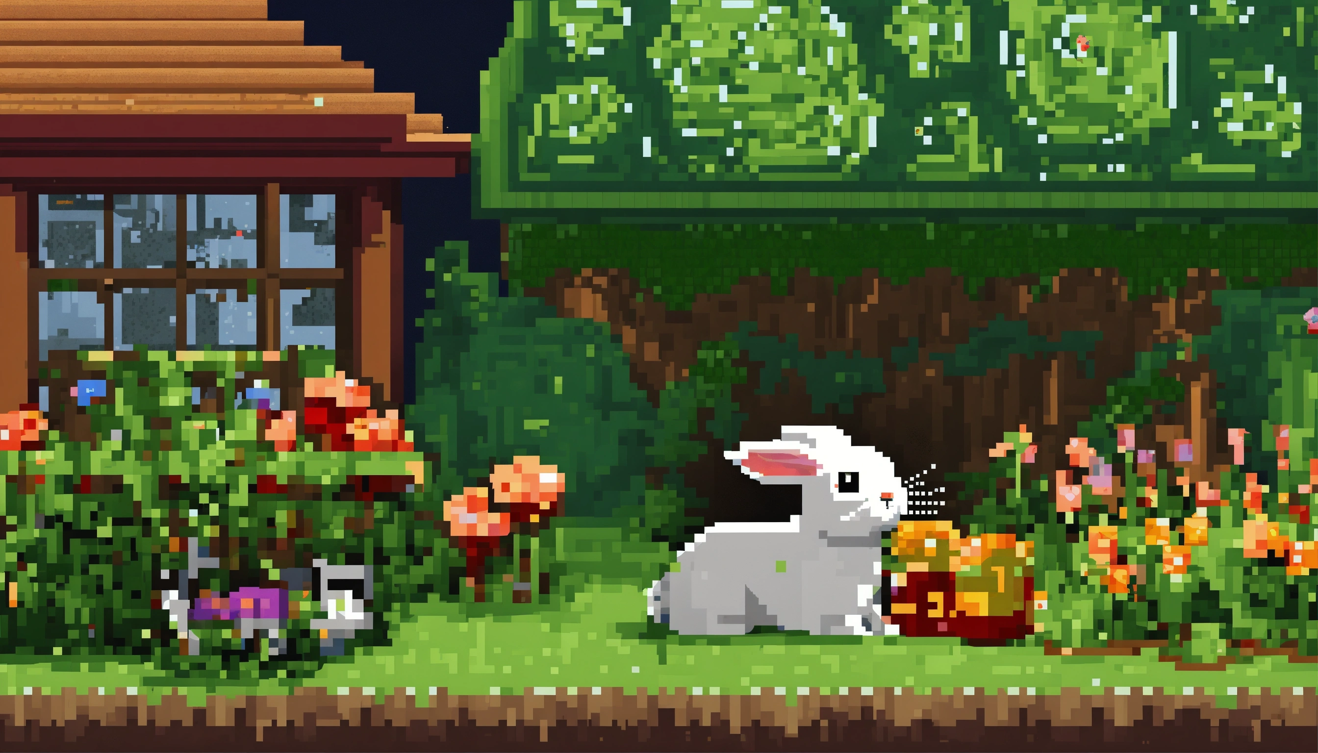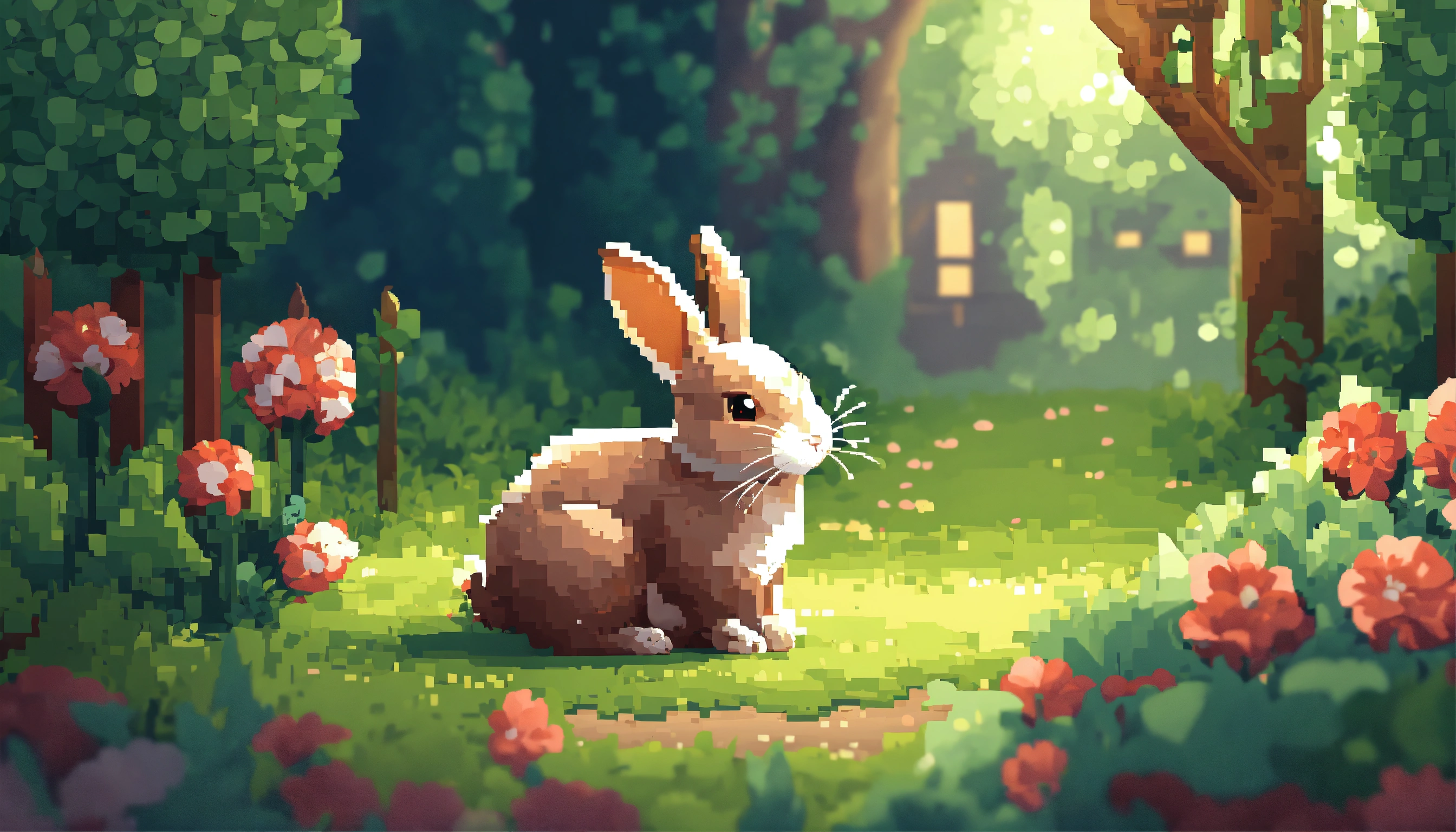 Hello, bunny. he hops in the garden, finding a warm burrow to curl up in. goodnight, little bunny, style of pixel art.