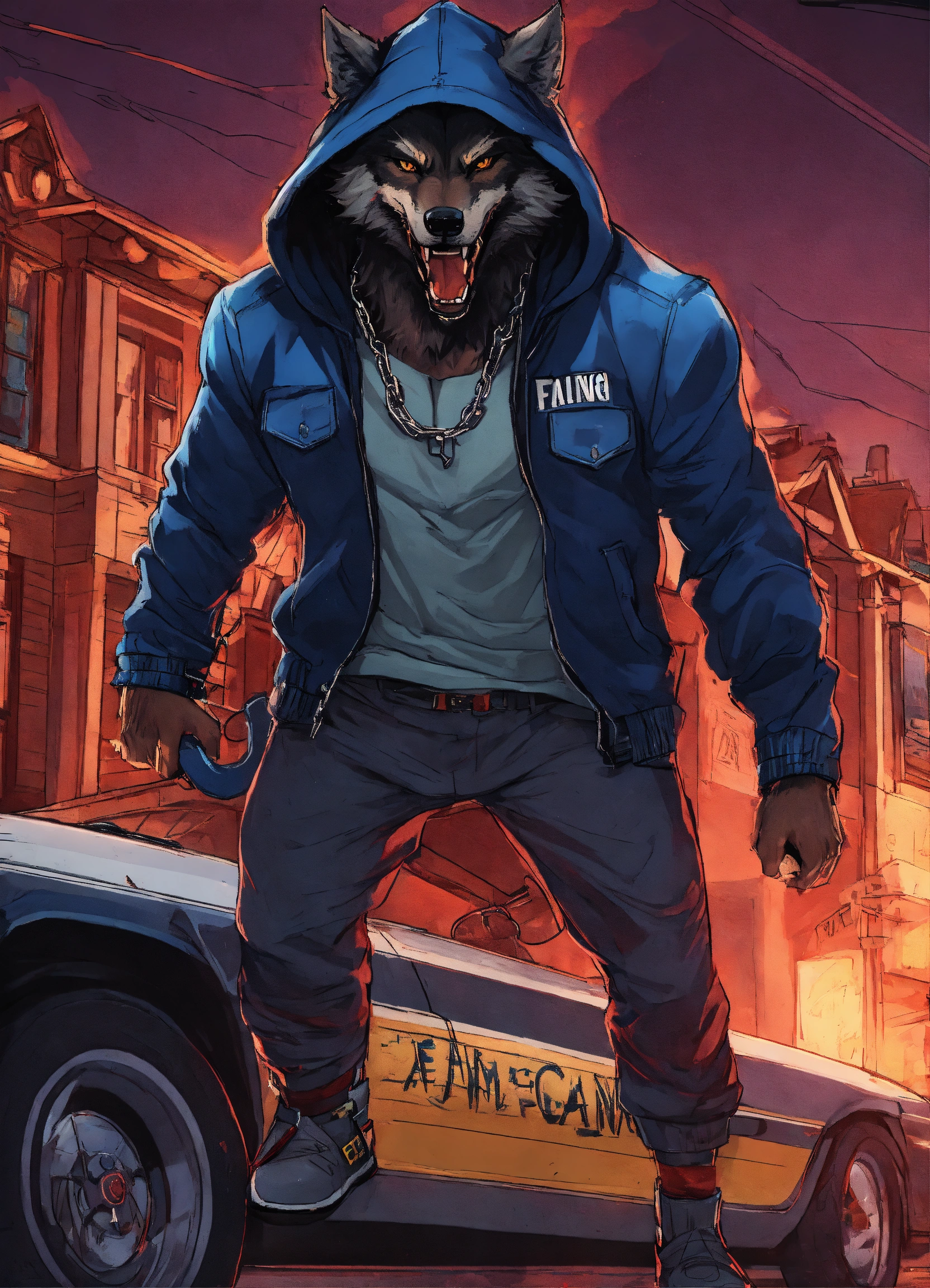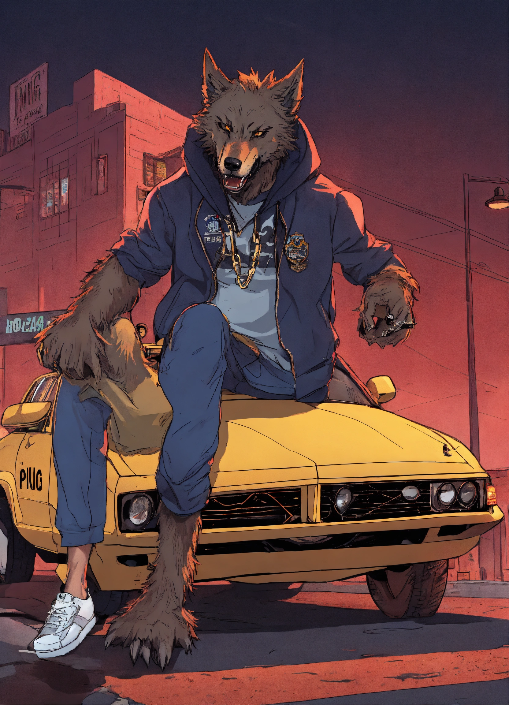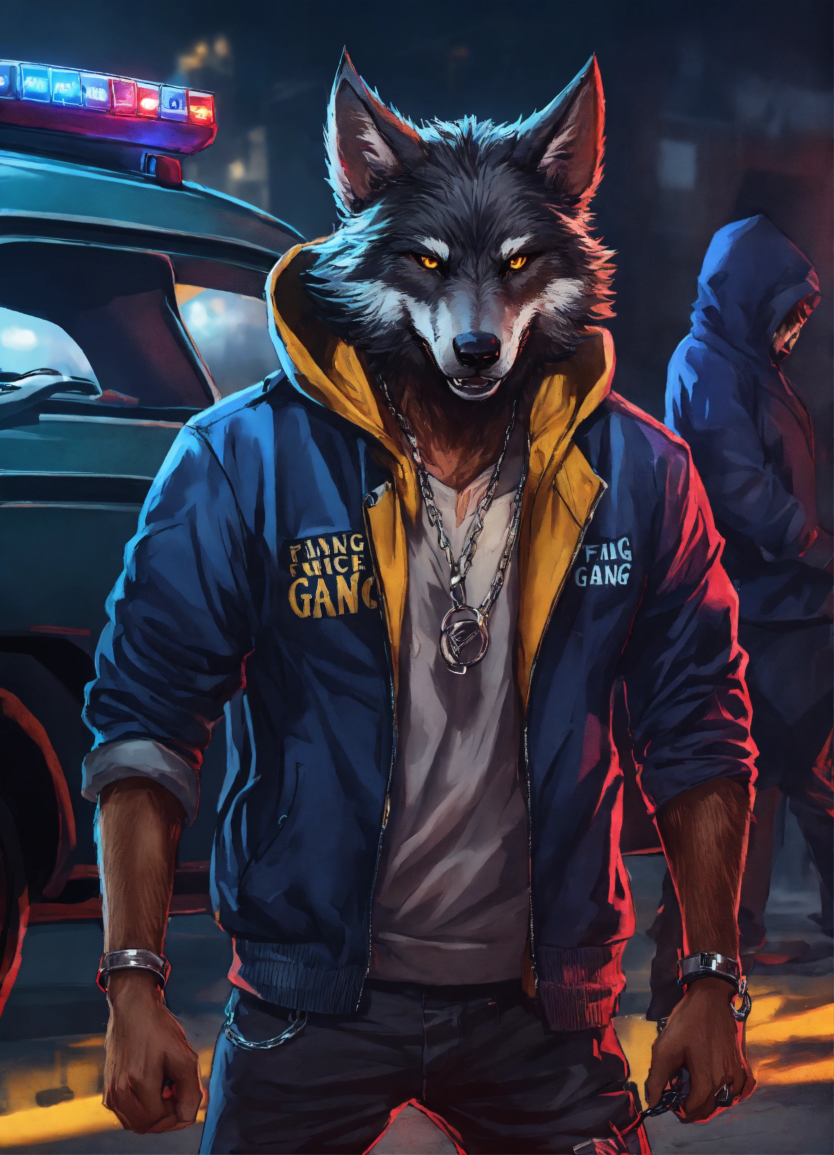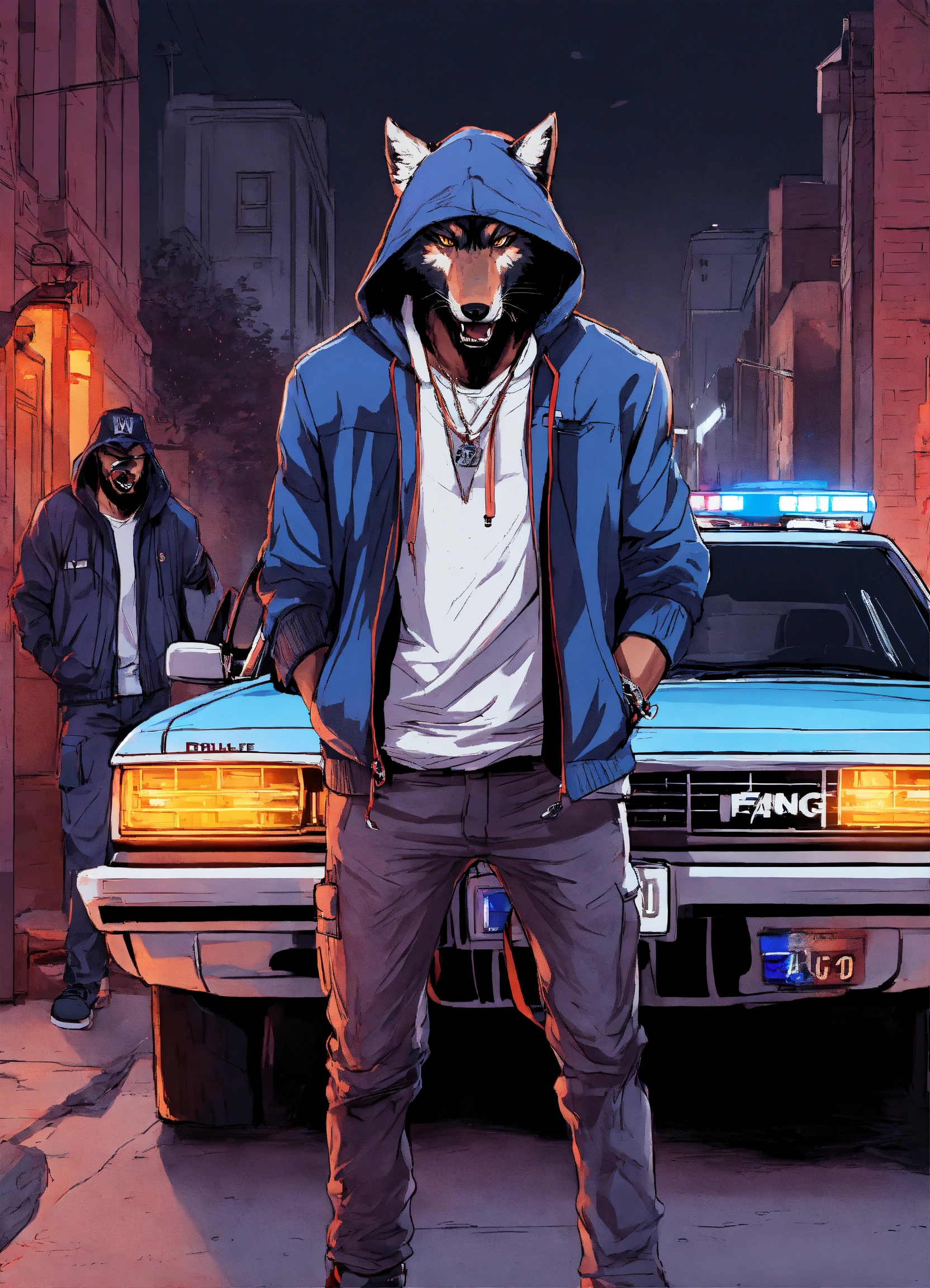 Werewolf detective, gangster werewolf being released from handcuffs, wearing hoodie that say fang gang, police car