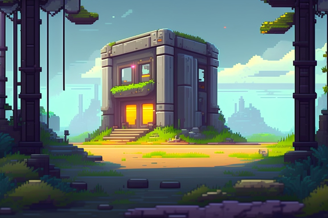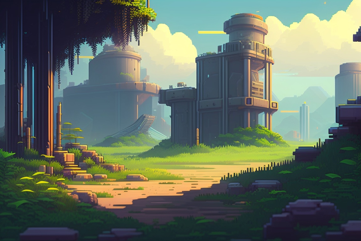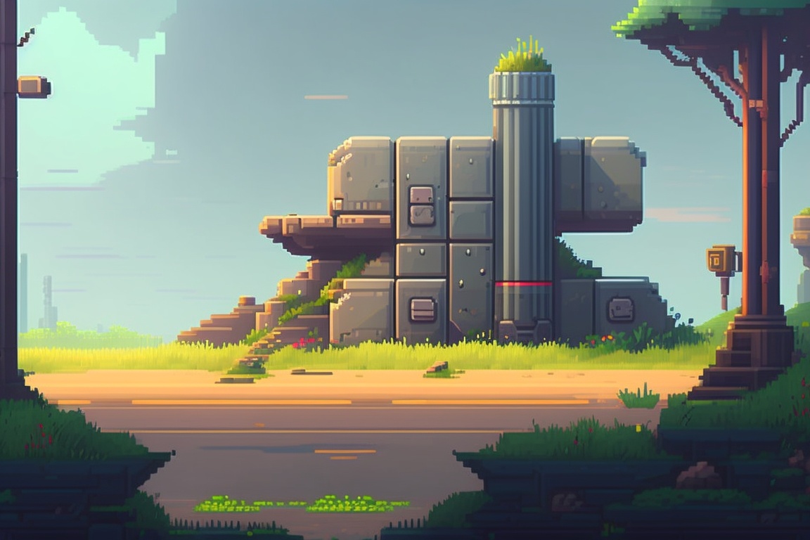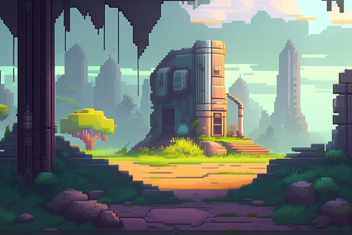 This should be a background for a 2d pixel art style game. the background should depict a destroyed post-apocalyptic city of the 21st century, abandoned long ago, overgrown with vegetation and crumbling due to age. all of this in a somber gray tone and with a slight mist.