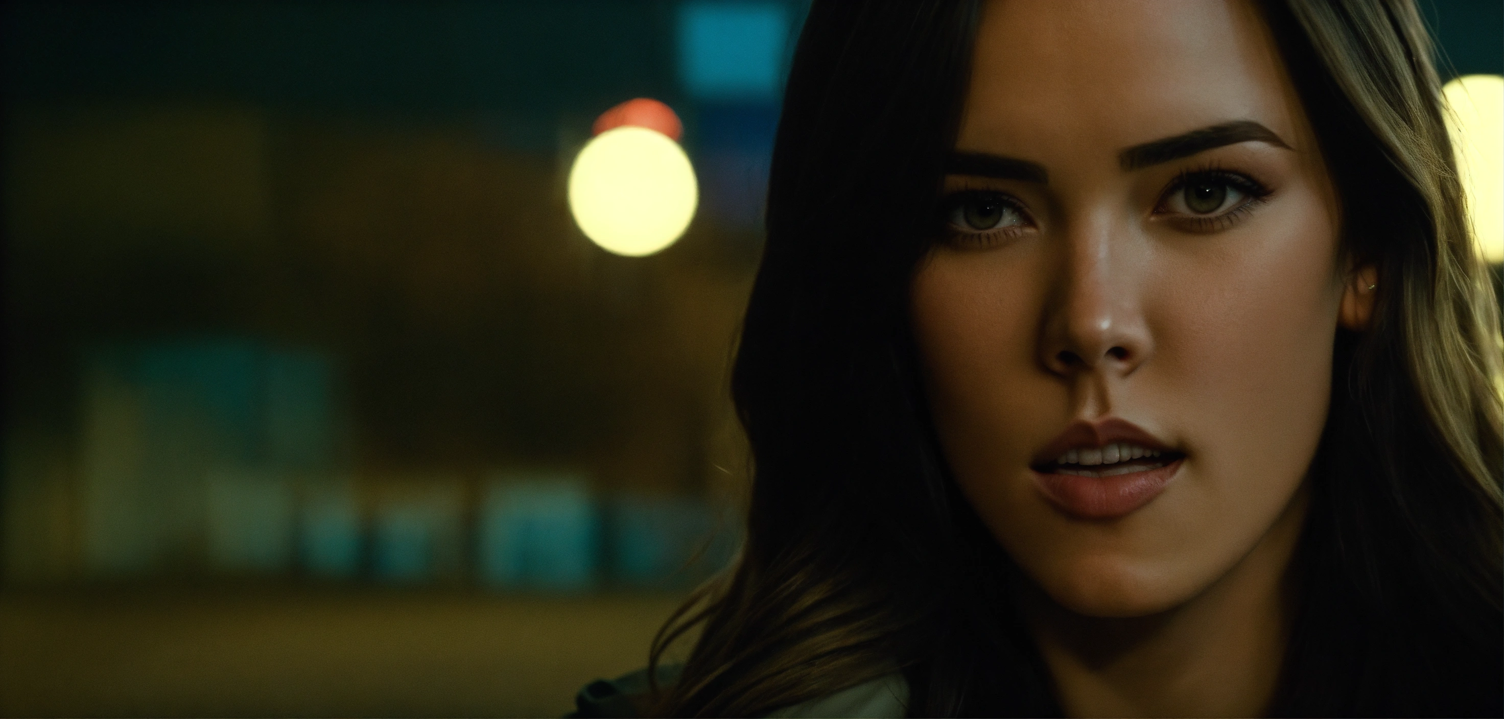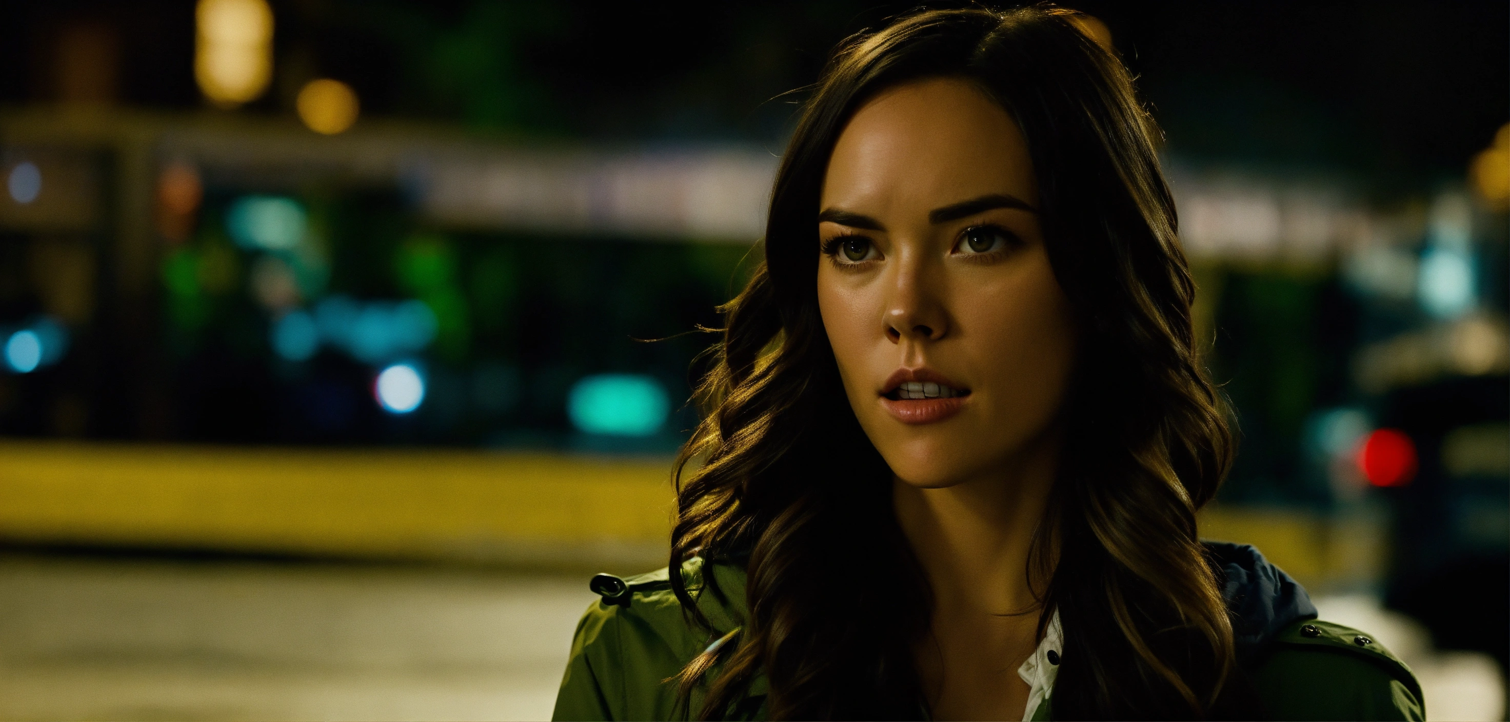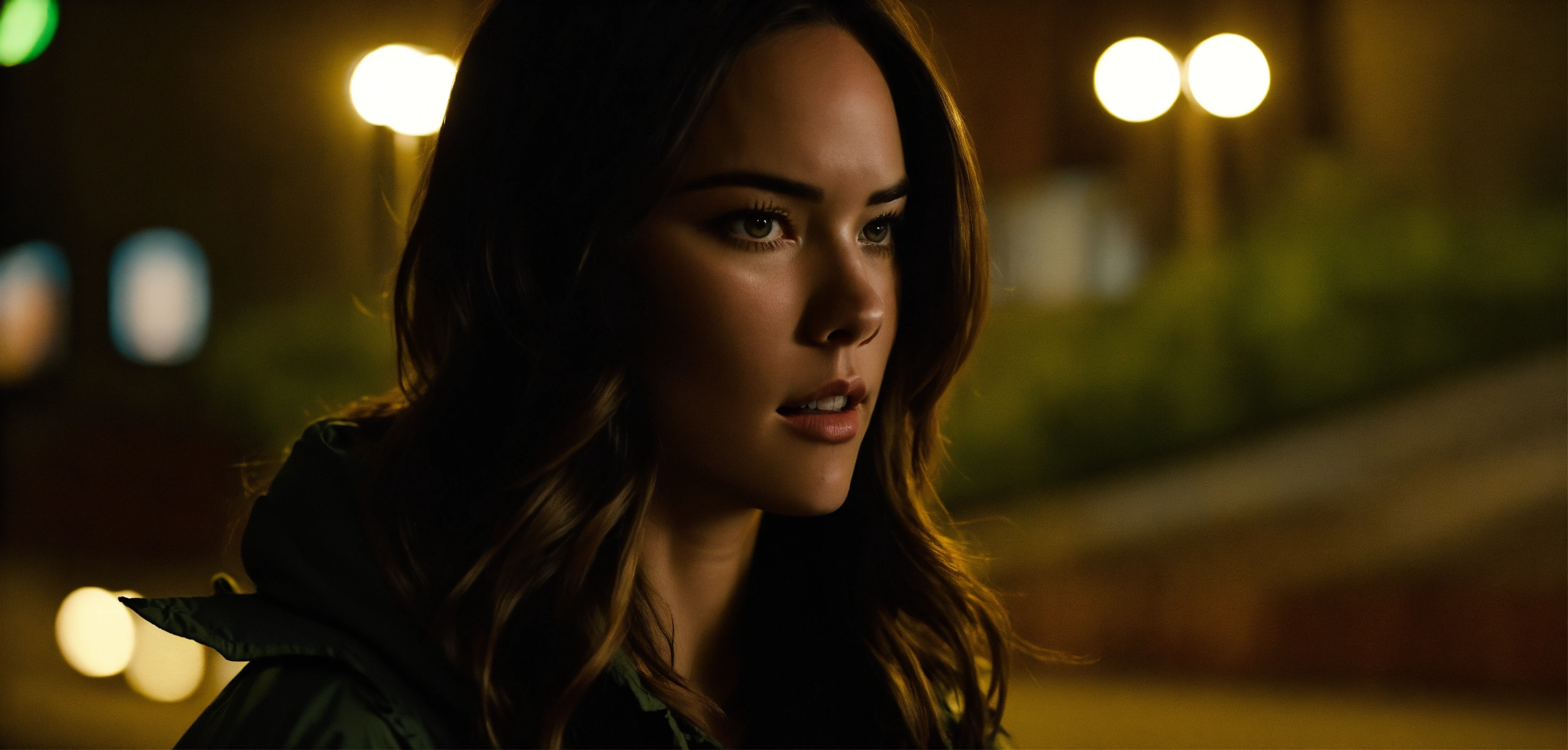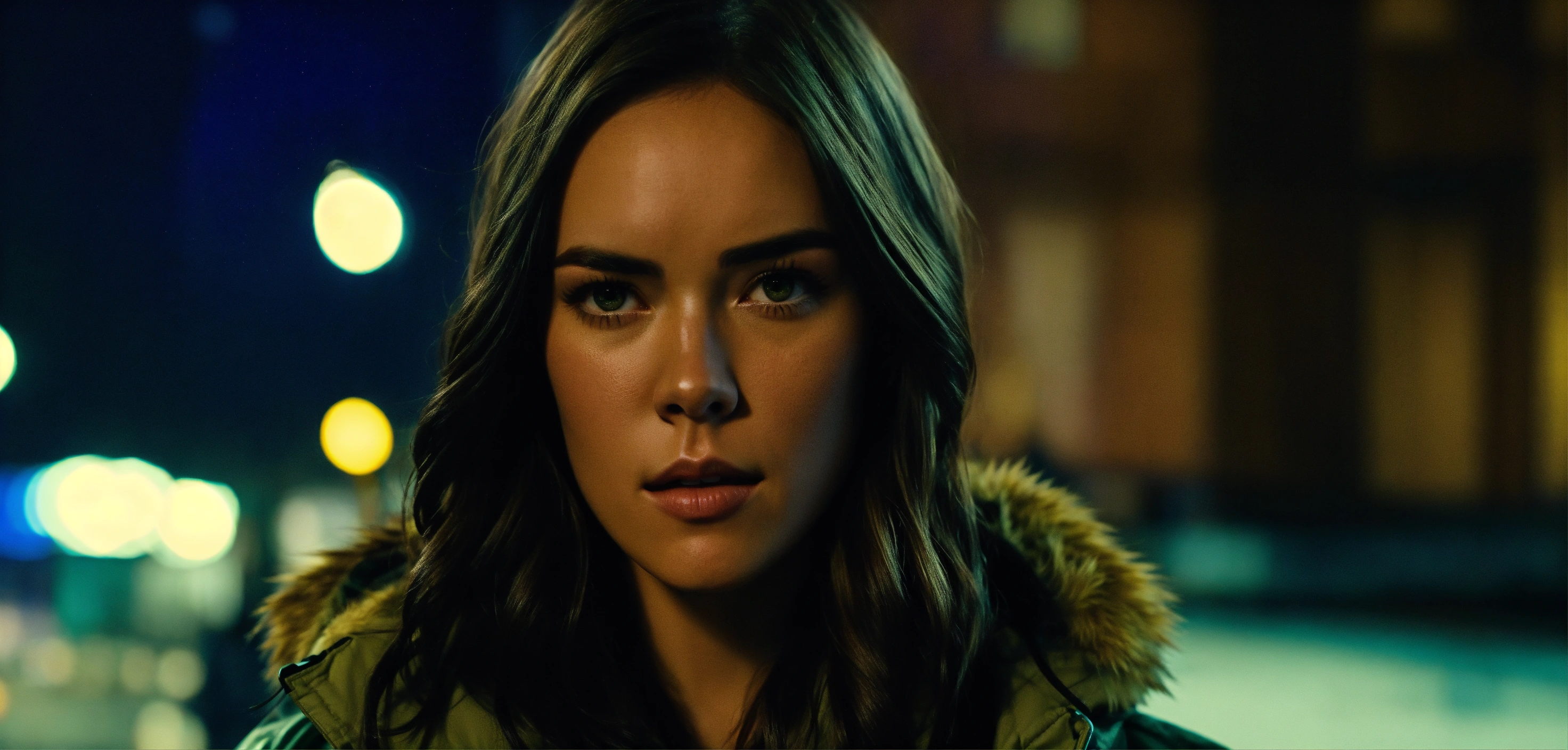 Very beautiful 30 years old odette annable, cute big hazel eyes, long hair, fearless detective, night, city, life-or-death situation, parka, cinematic, realistic walk, closed mouth serious face arrow tv show