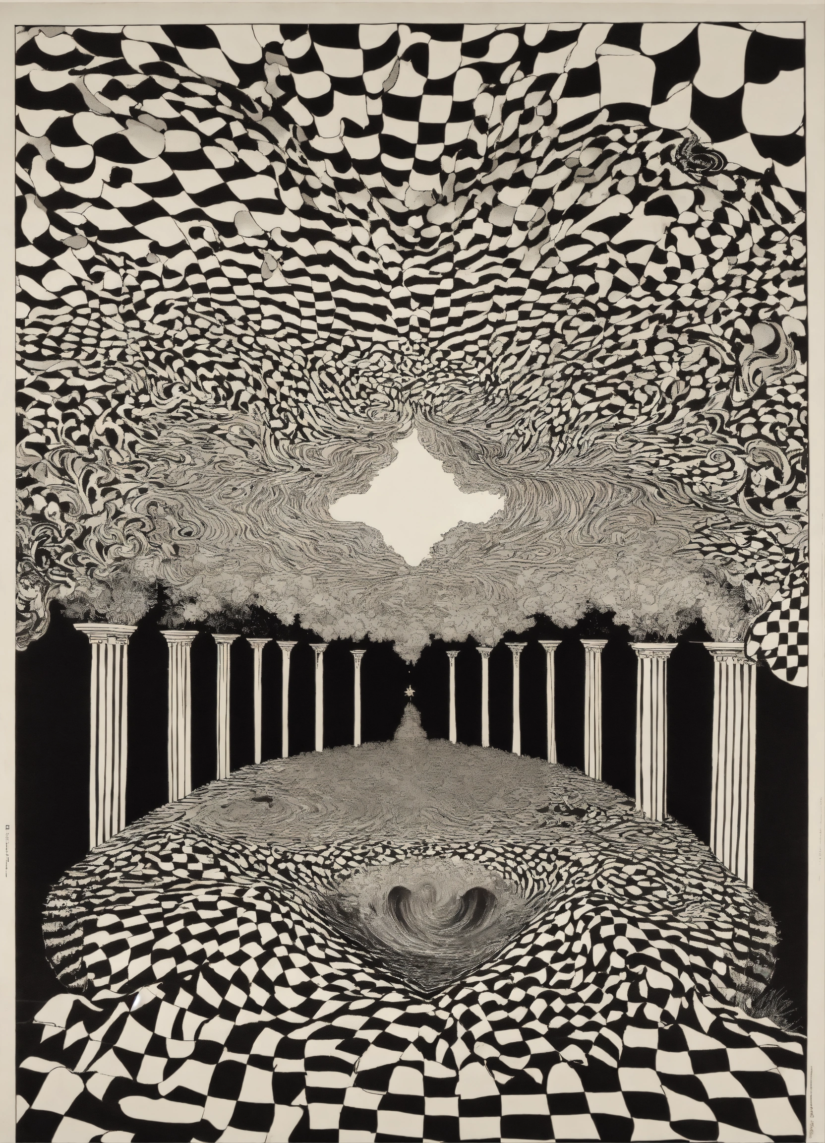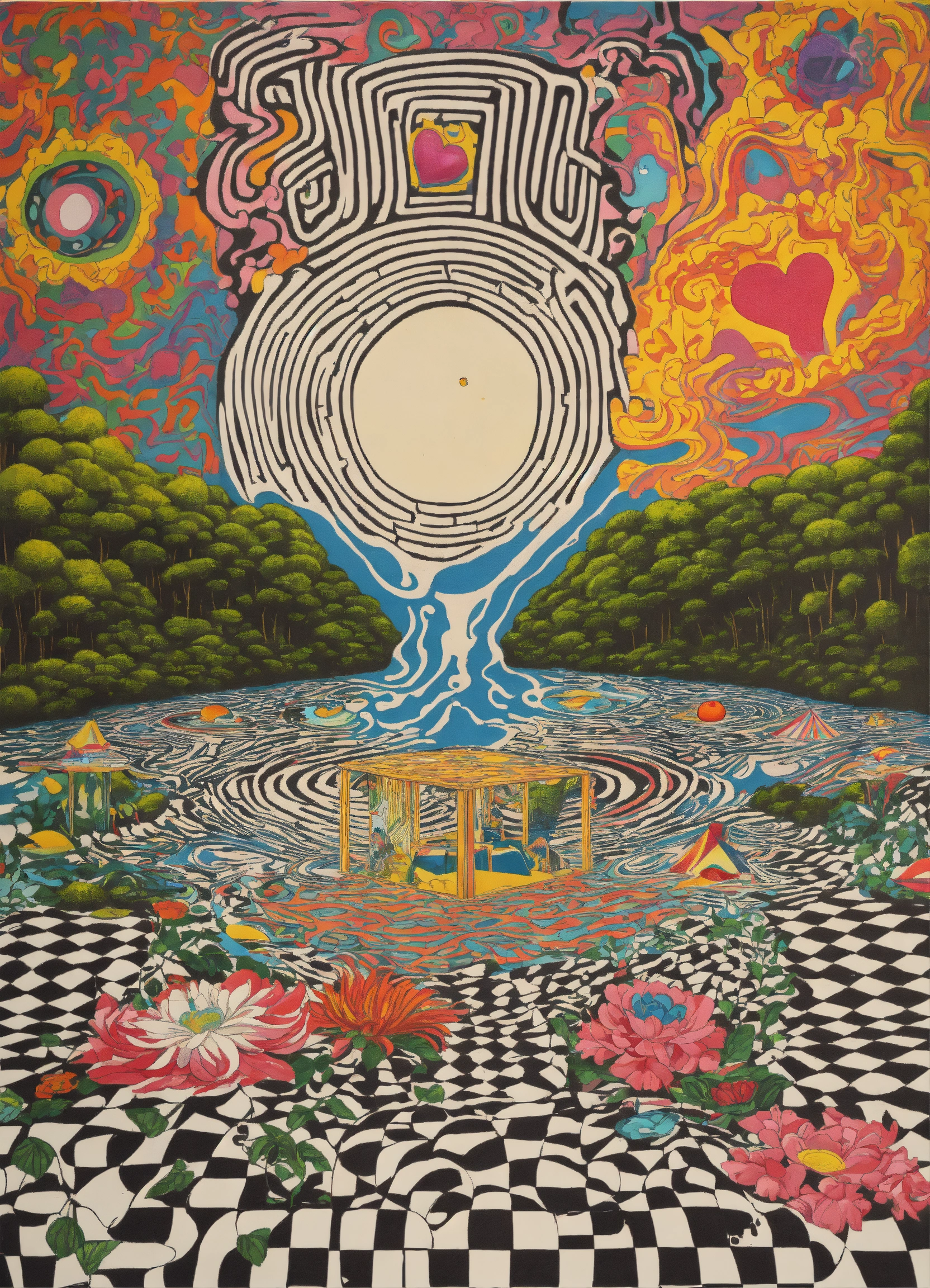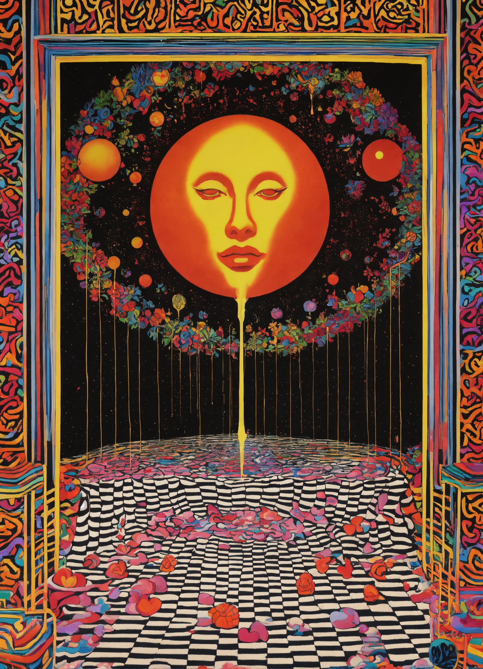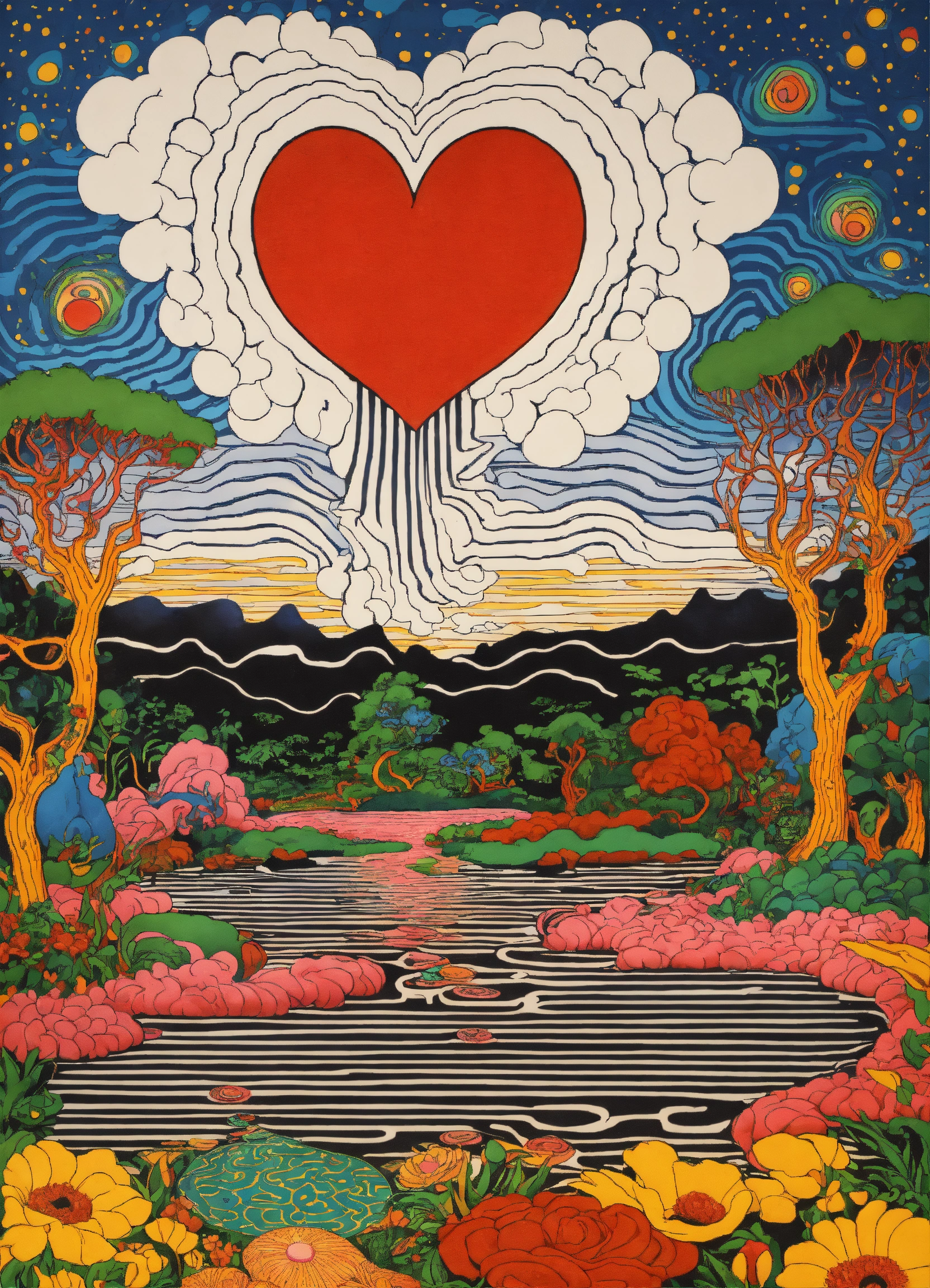 Janpanse groovy retro poster, human body containing god merging with love heart melting merging with oriental the most beautiful cosmos, human body containing abstract psychedelic vortex by keith haring, human body containing symmetrical grid patterns, psychedelic mount melting eyeball merging into dripping love-heart by coogi pattern mount, 5d outline, wavy dream dimension mount frame, chevron florescent geometrical clouds dripping, dense jungle melting into floor, black and white checkerboard patterns dripping by maurits cornelis escher