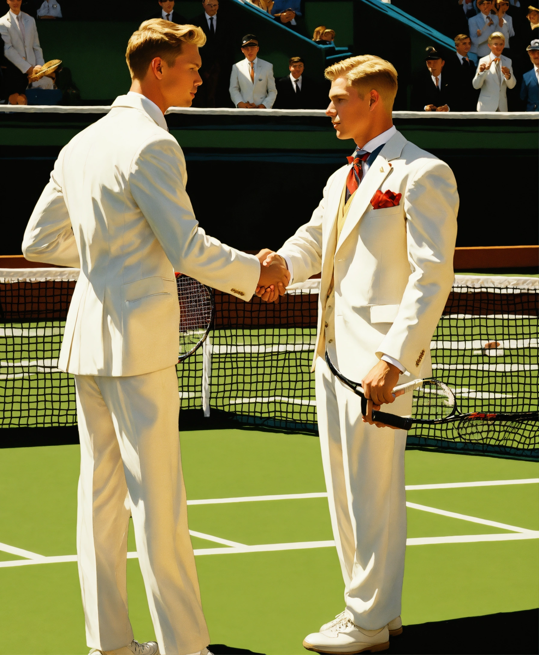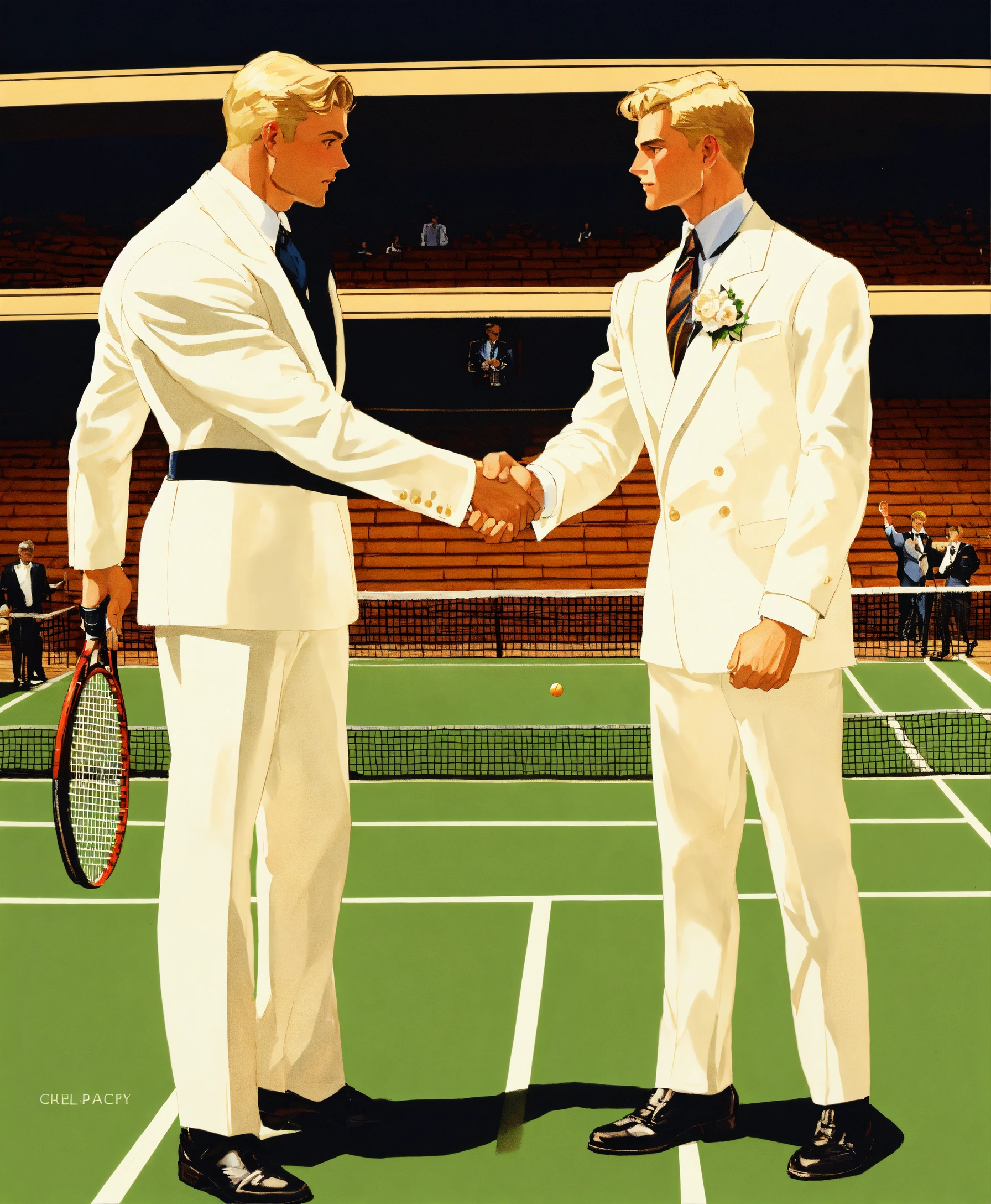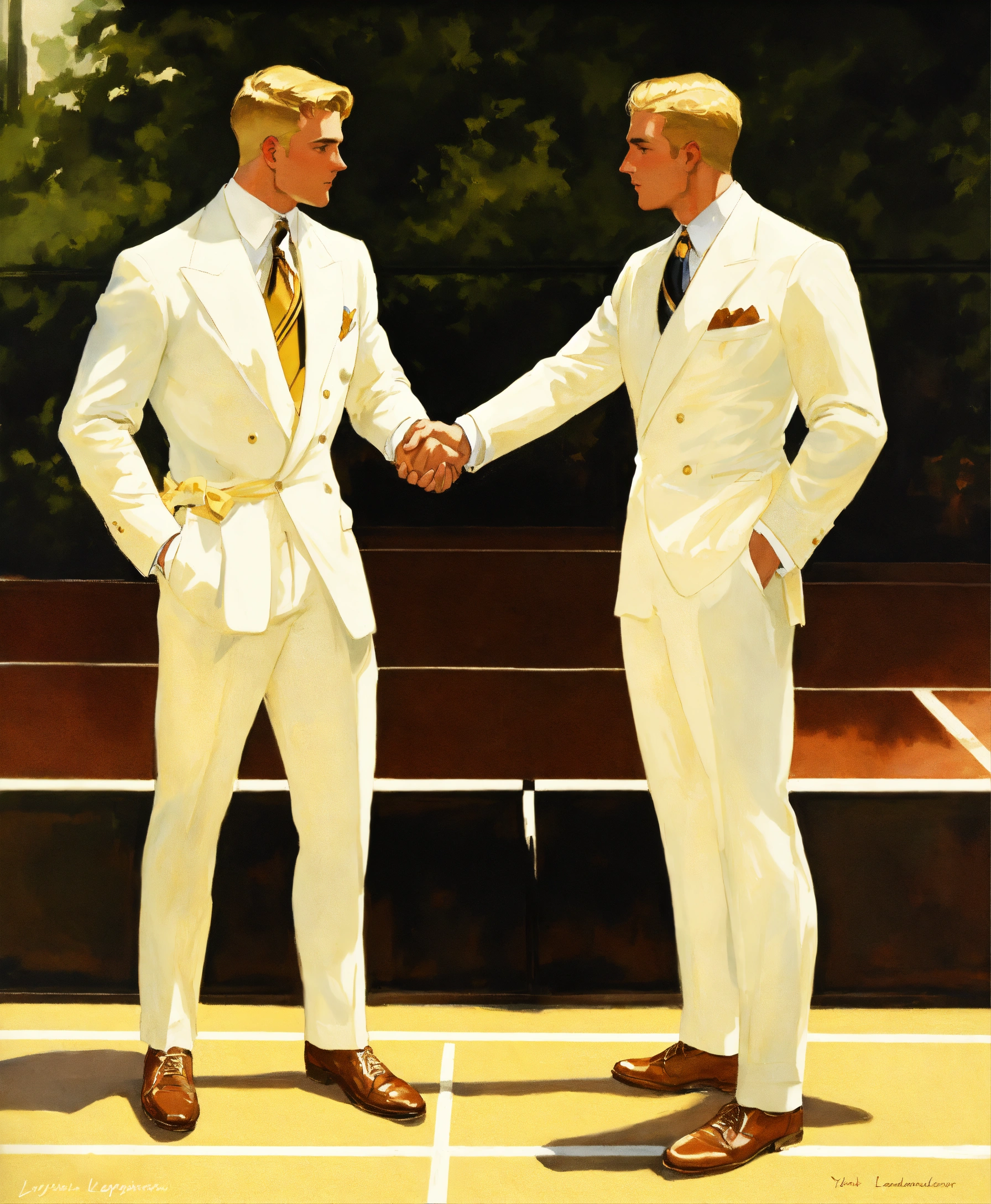 Two blonde muscled sportsmen in white suit, club tie, shaking hands in tennis court, leyendecker style