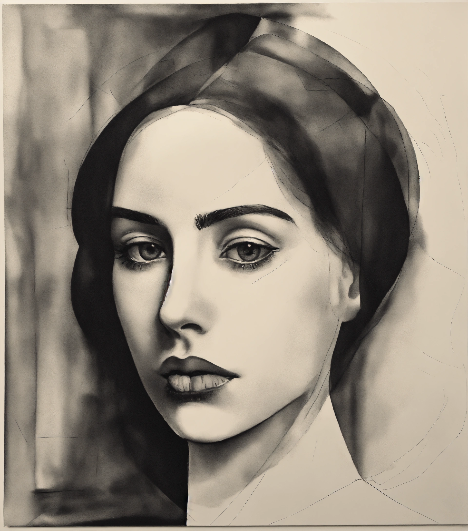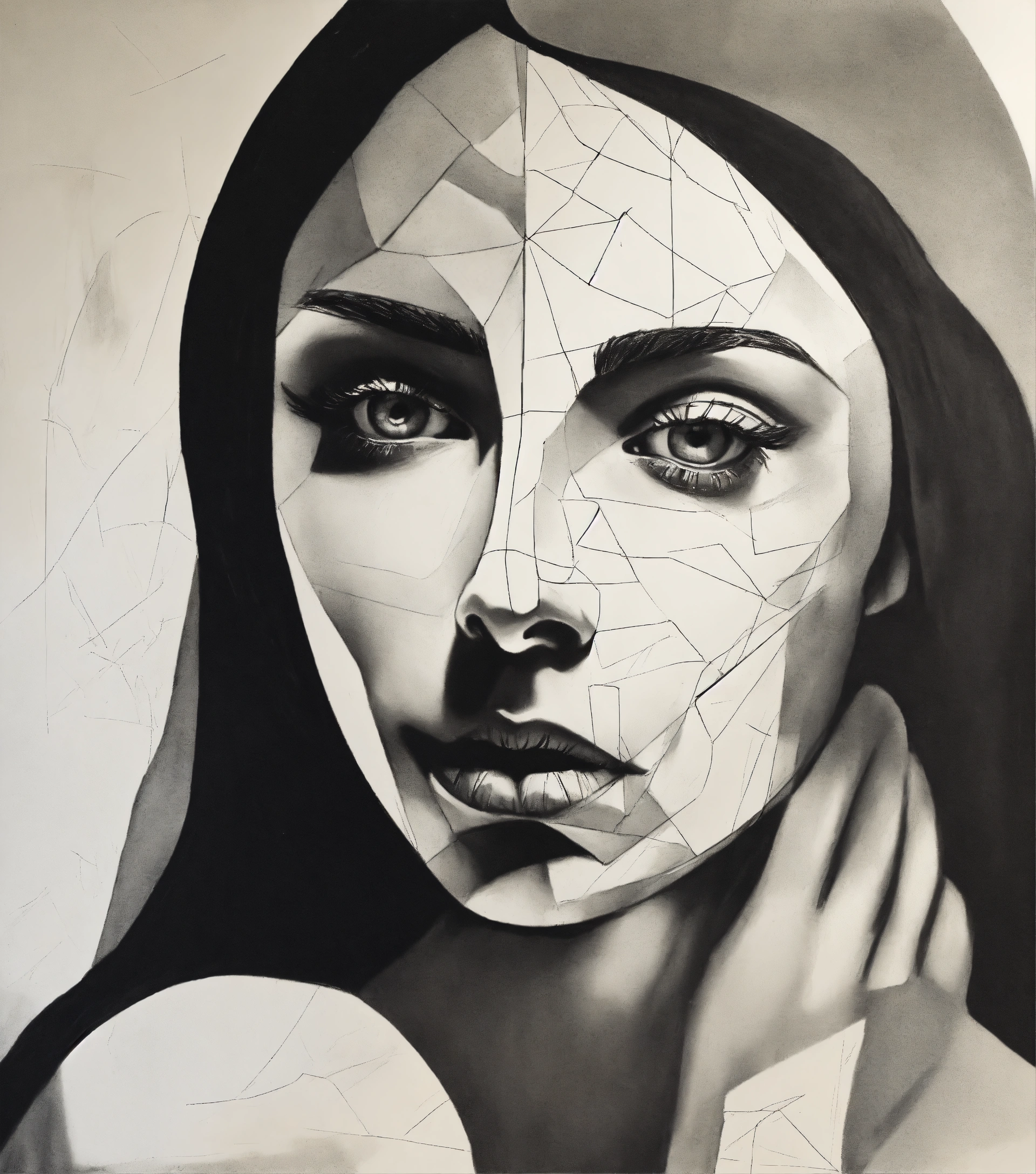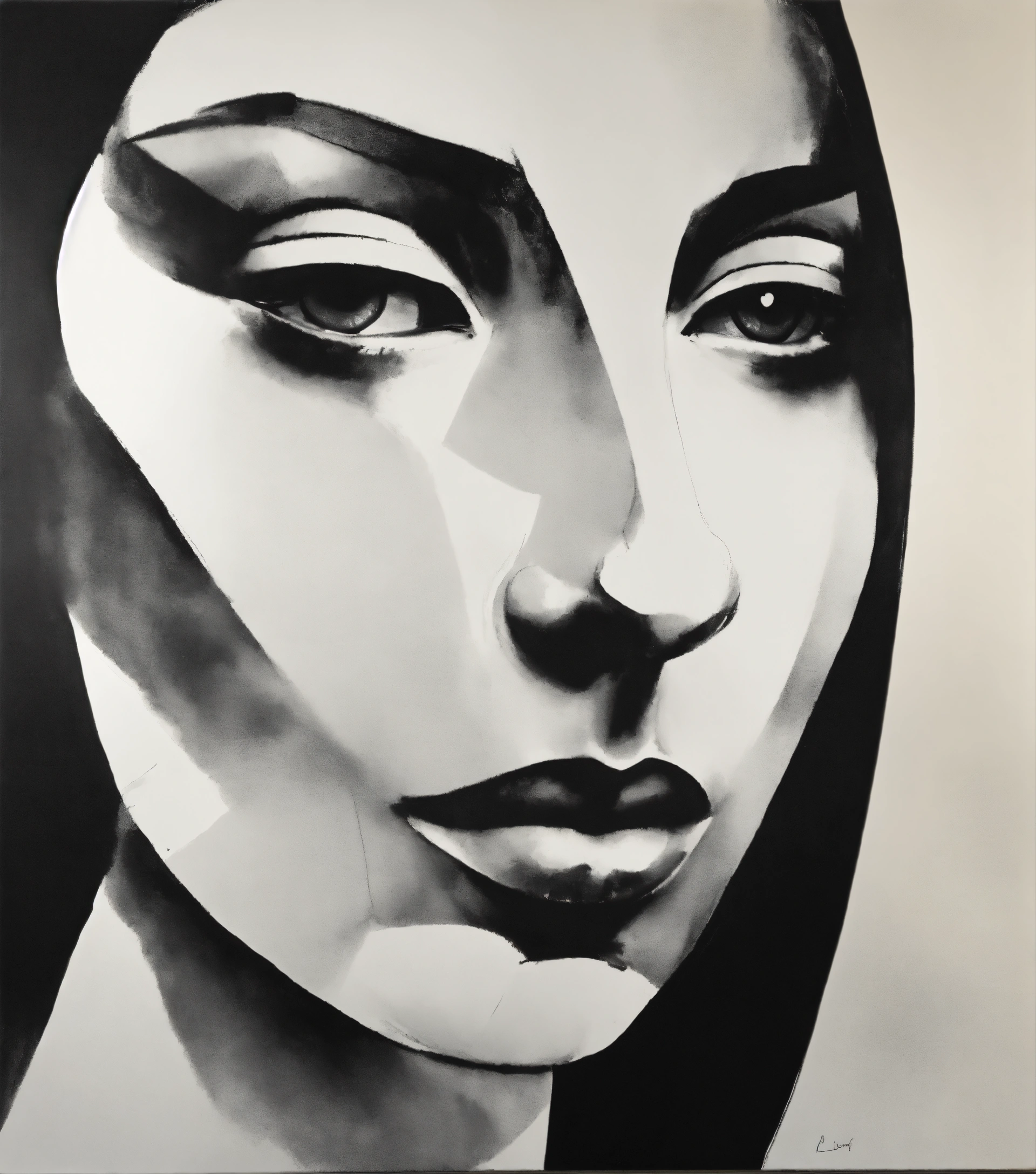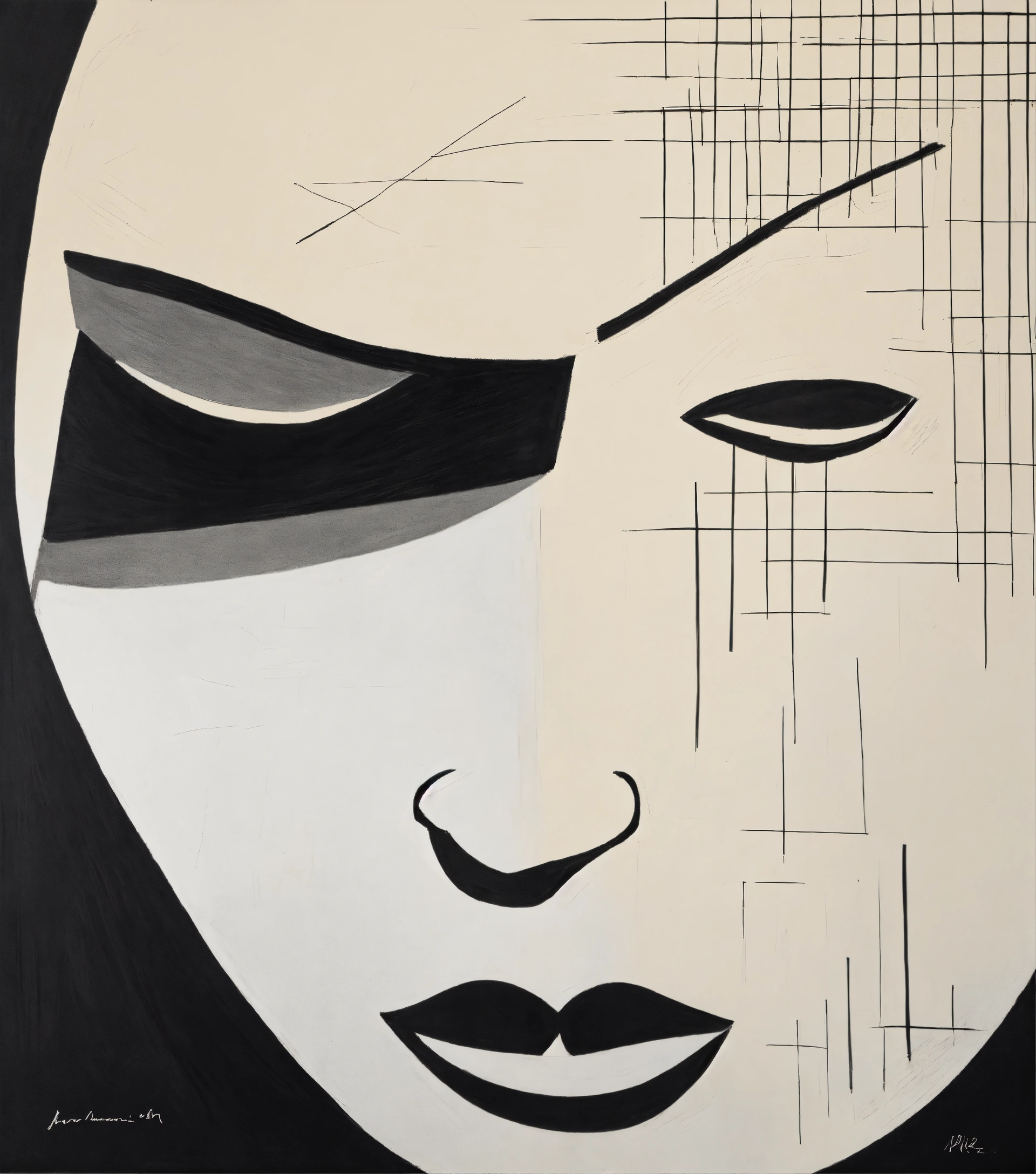 A black and white drawing of a woman's face, a minimalist painting, vorticism, picasso, minimalist, biomorphic