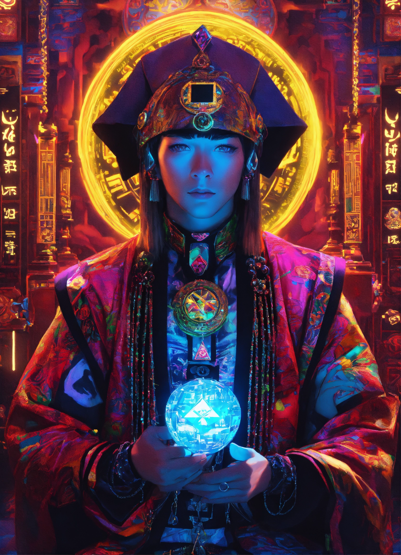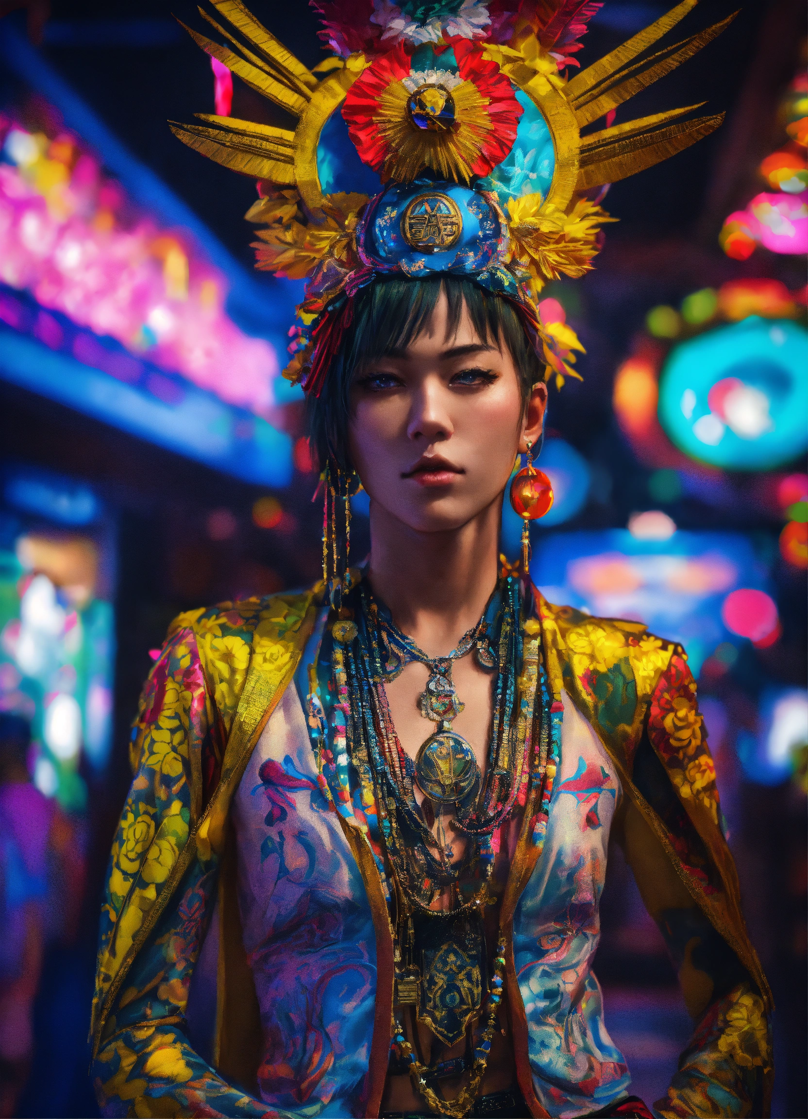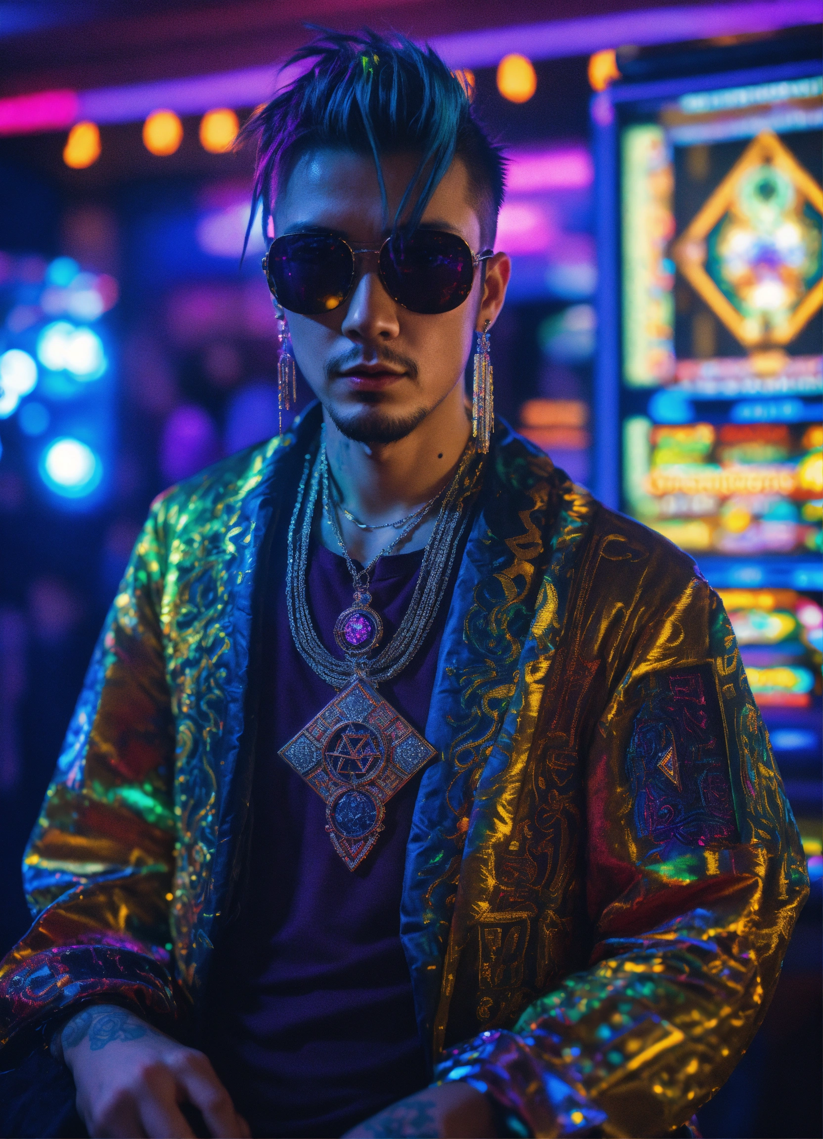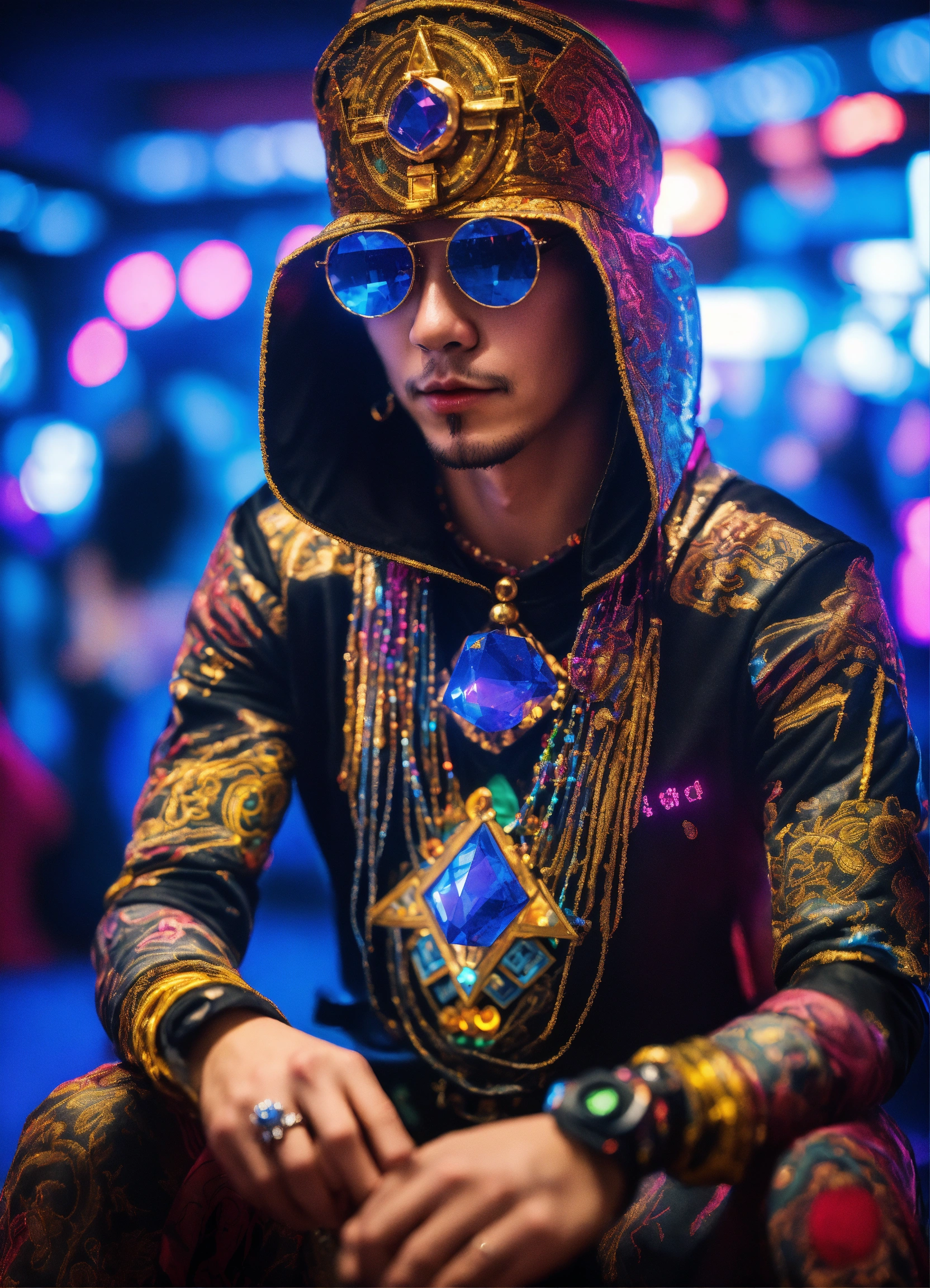 I’m photorealistic portrait of a sapphire freemason occult technology techno raver dmt yakuza ai god punk in folk costume, photorealistic chinese casino in a death note cyberpunk colorado festival raver style with diamonds, of a person in urban dmt qr code wear, techno dmt neon room photorealistic, volumetric lighting, 8k, highly detailed