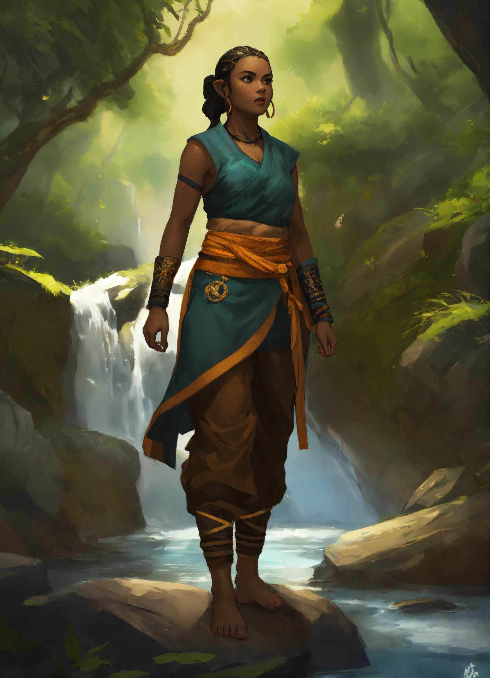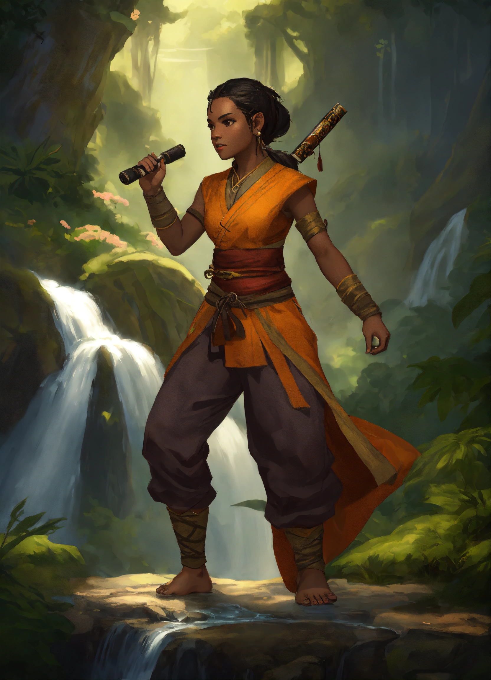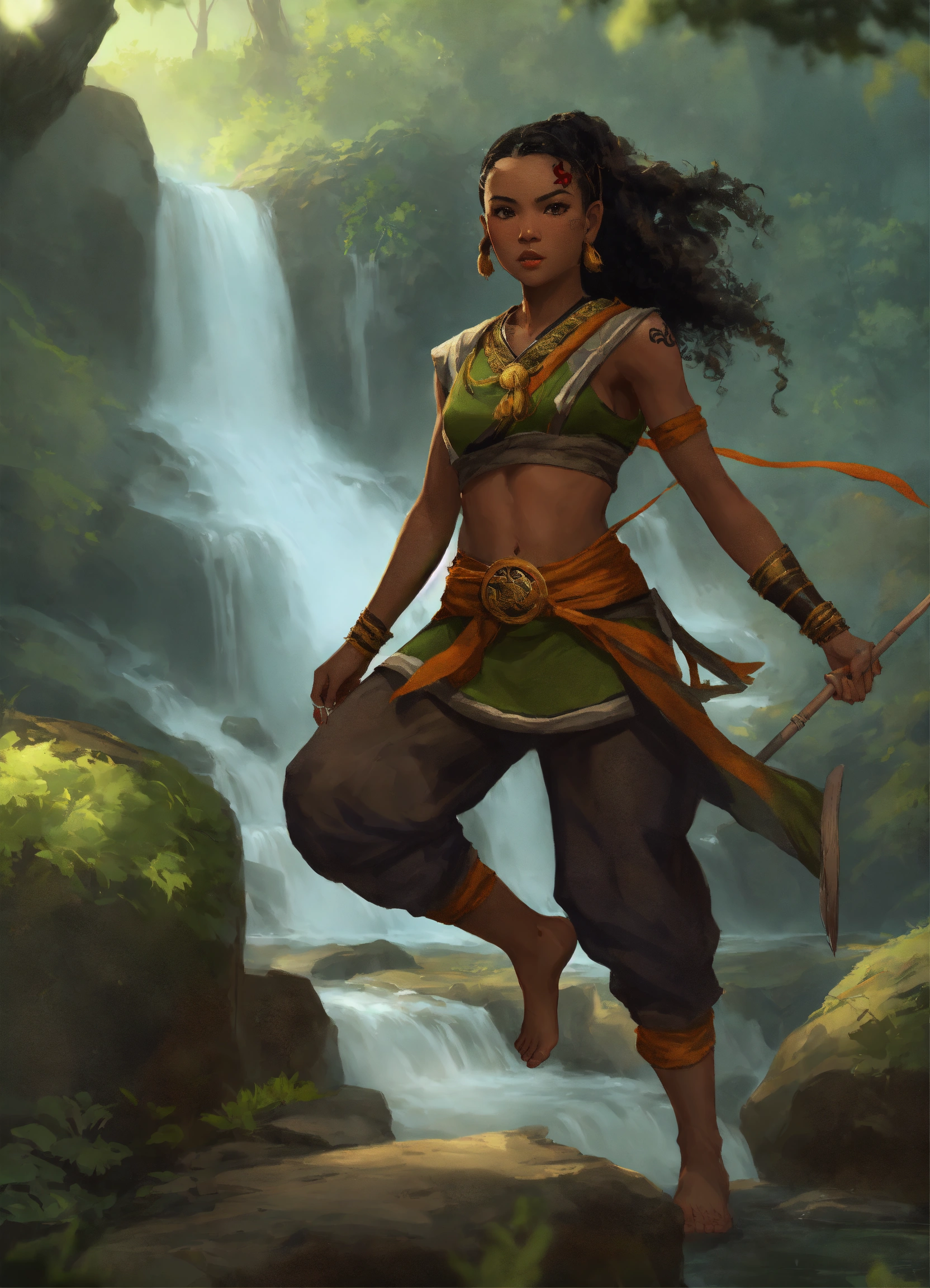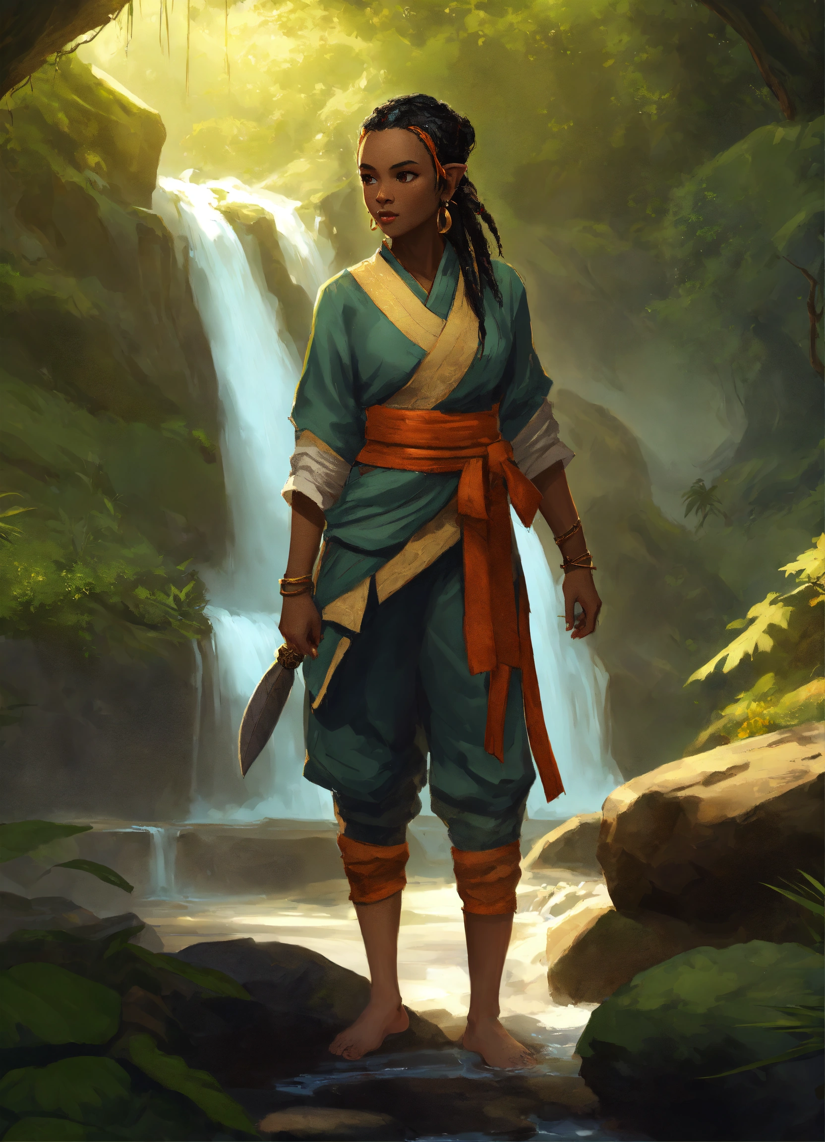 Medium-length shot, female halfling black skin, pointed ears, monk, martial art training, bare feet, kung fu, tai chi, indian tattoo, adventurer, character concept art, artstation, artgem, ancient forest waterfalls background, dark magic, dnd character