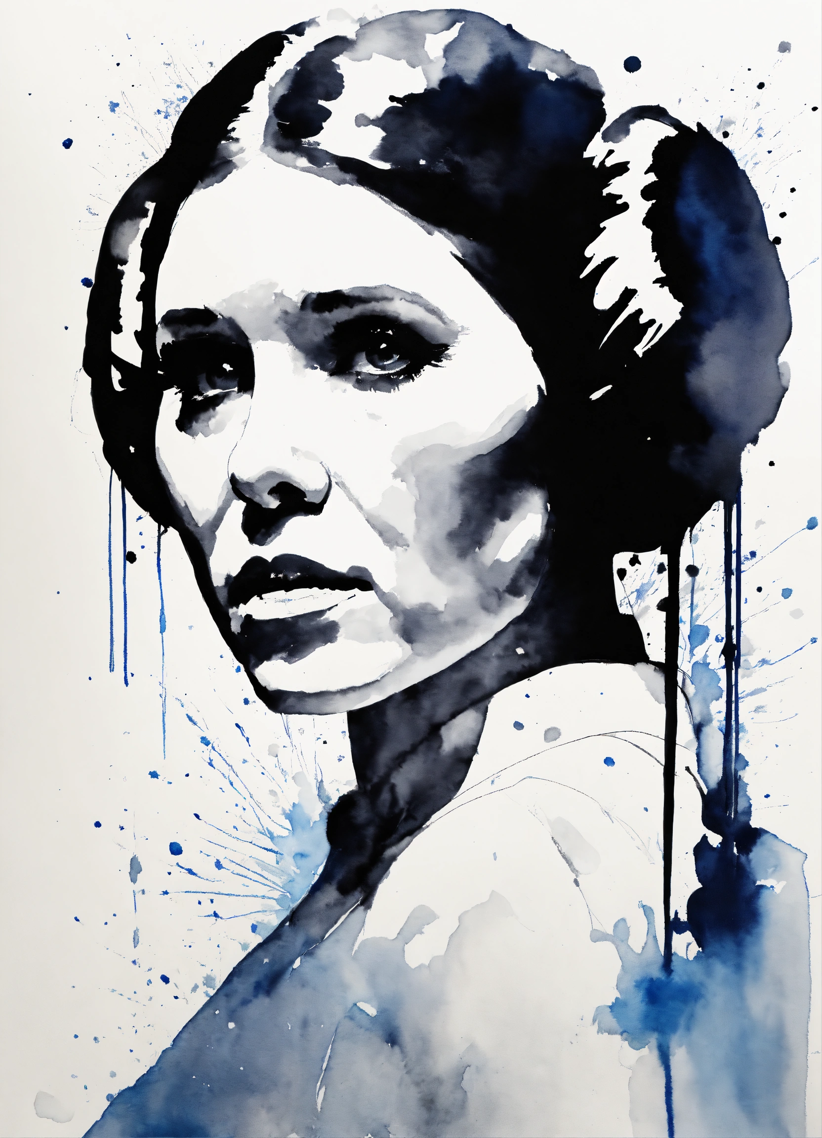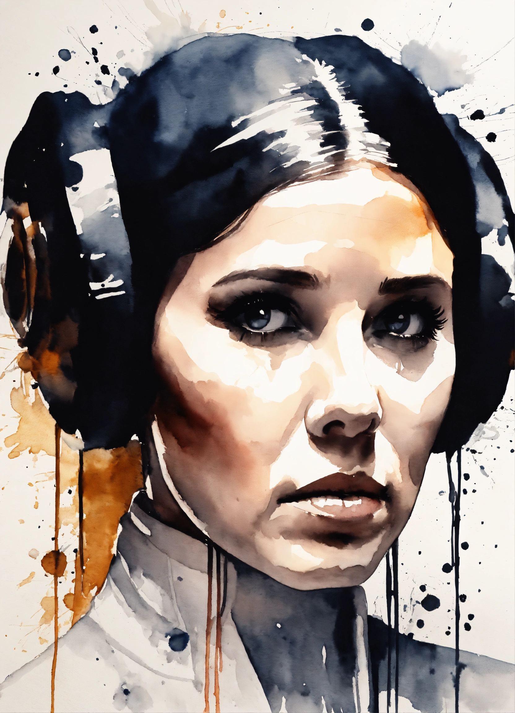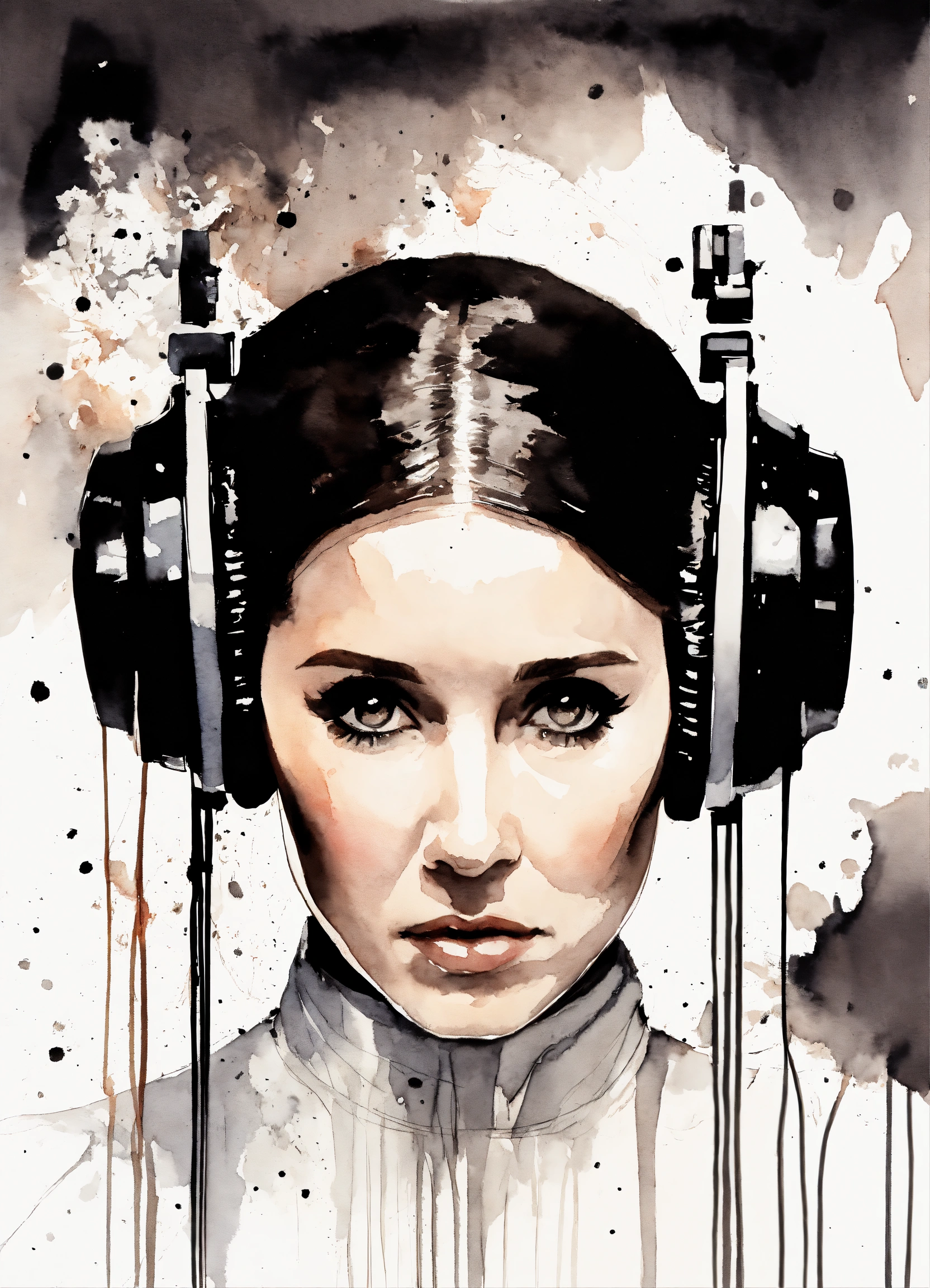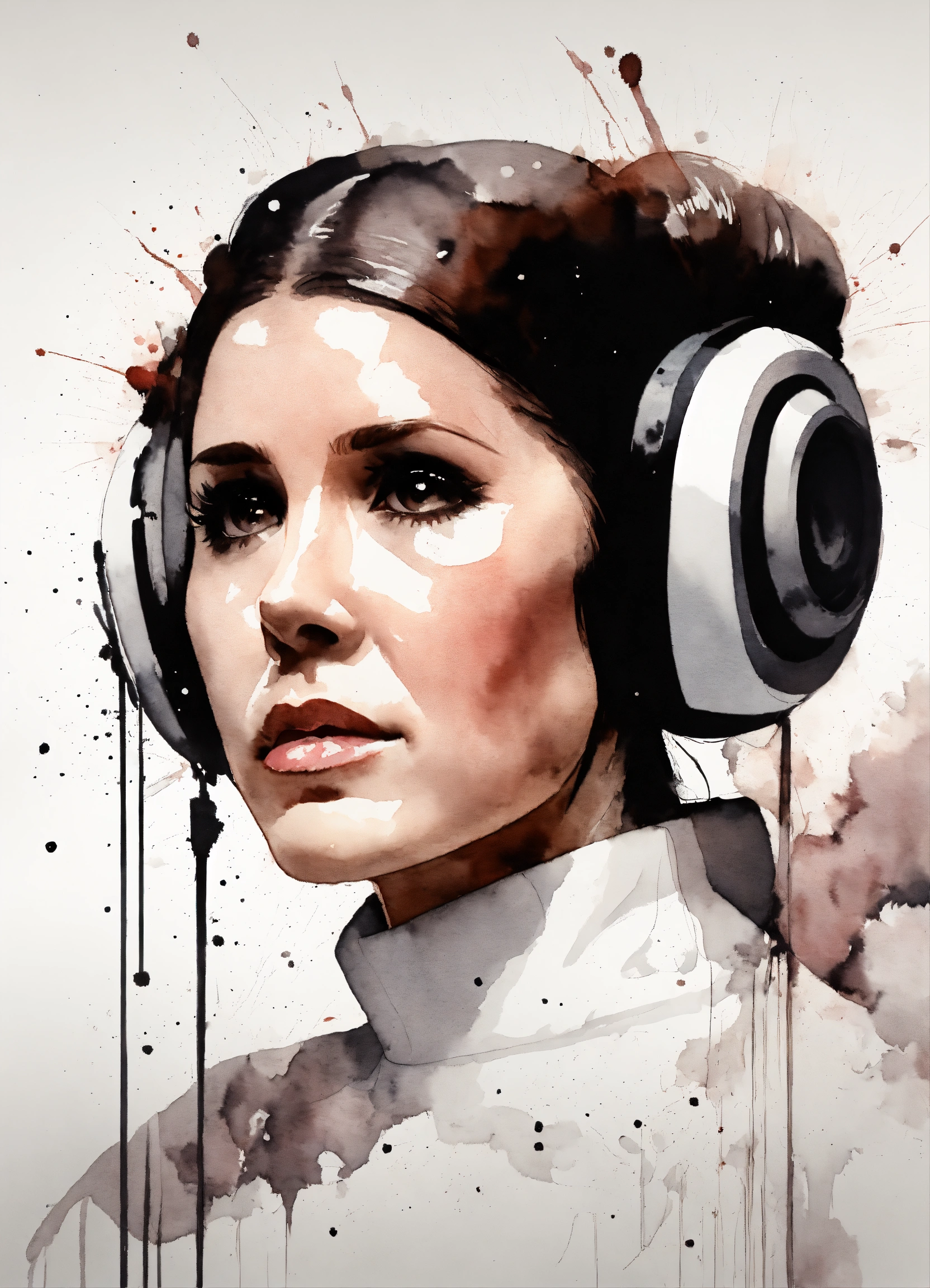 Minimalistic ink drawing style, vanishing point on white paper, princess leia. watercolor splash, but with only a few white and black accents, art incorporated as complementary elements, photo, cinematic, 3d render, illustration