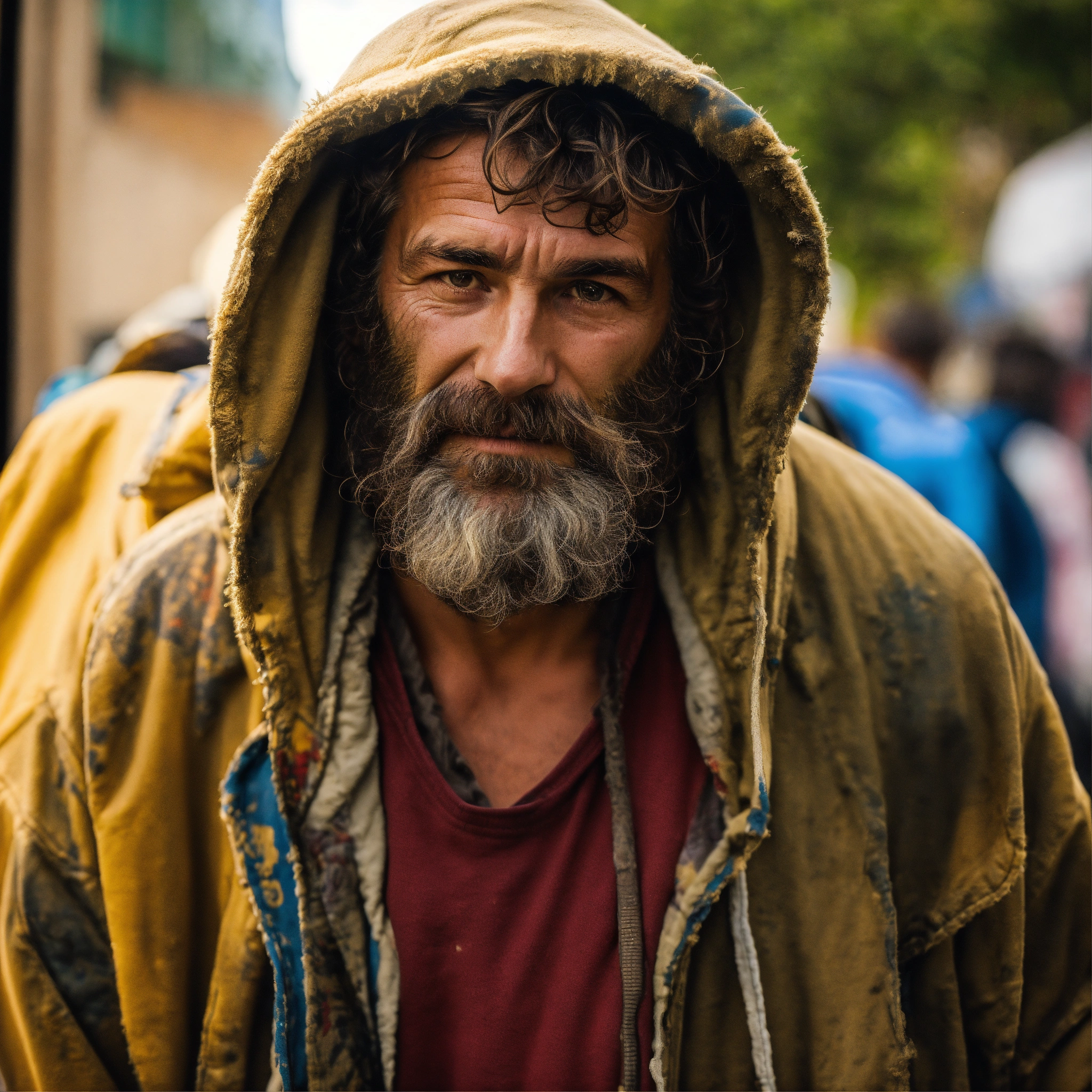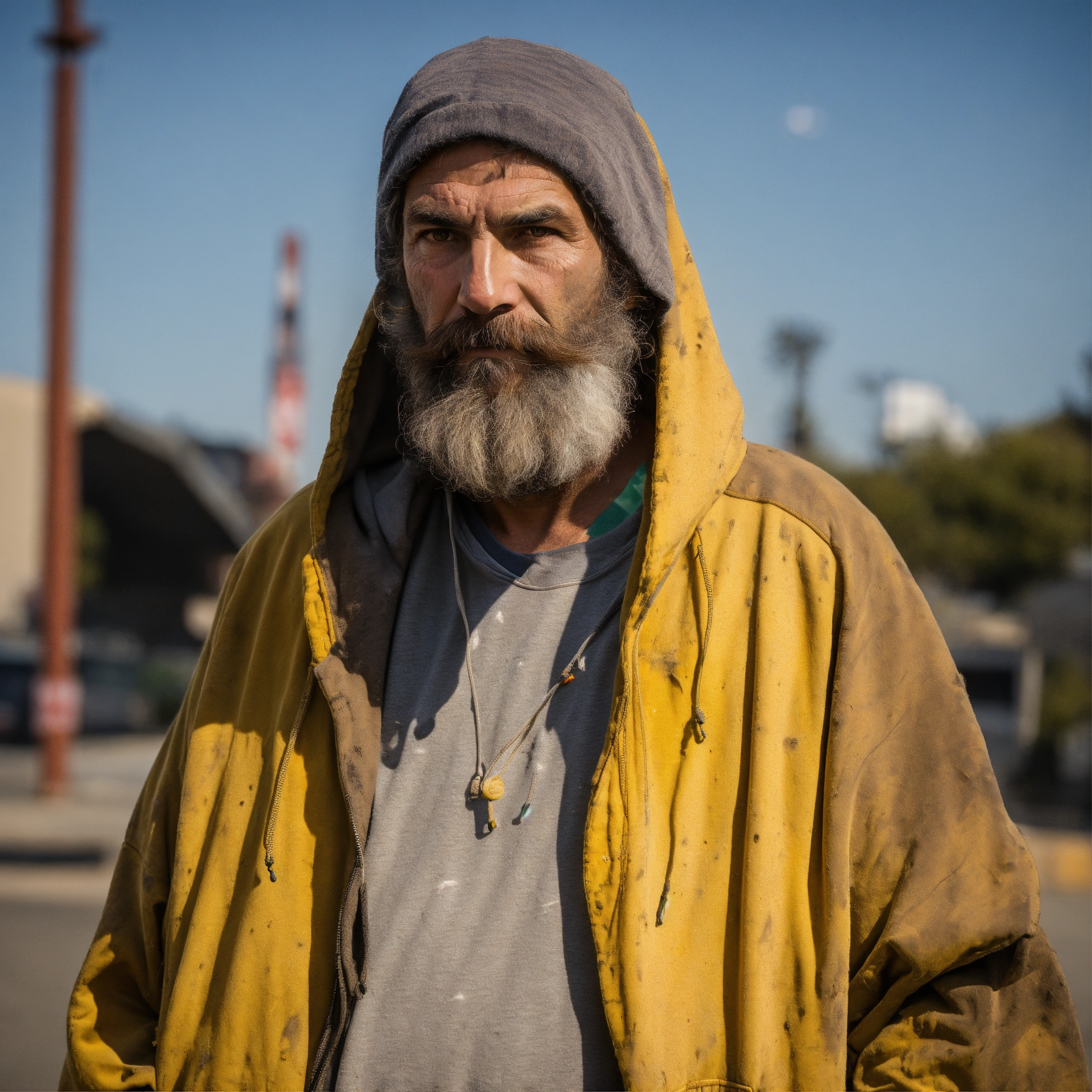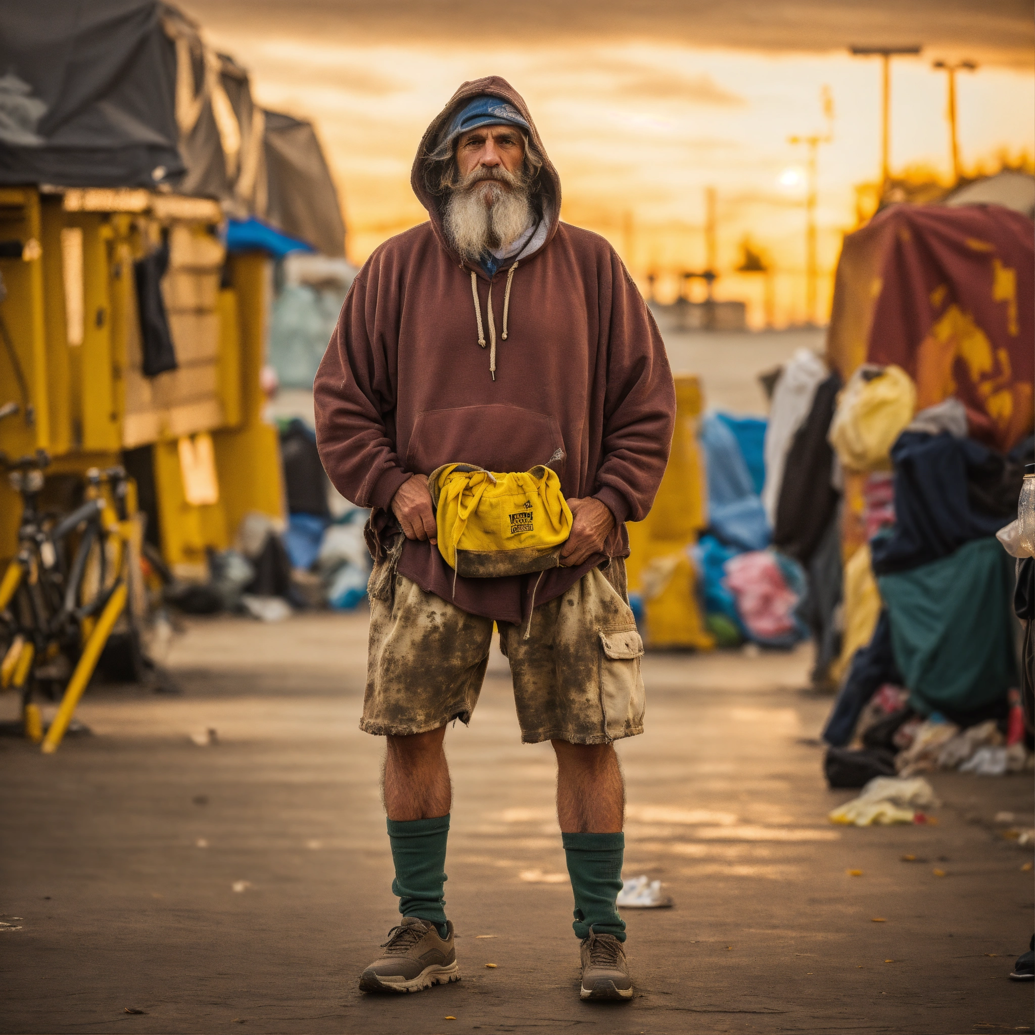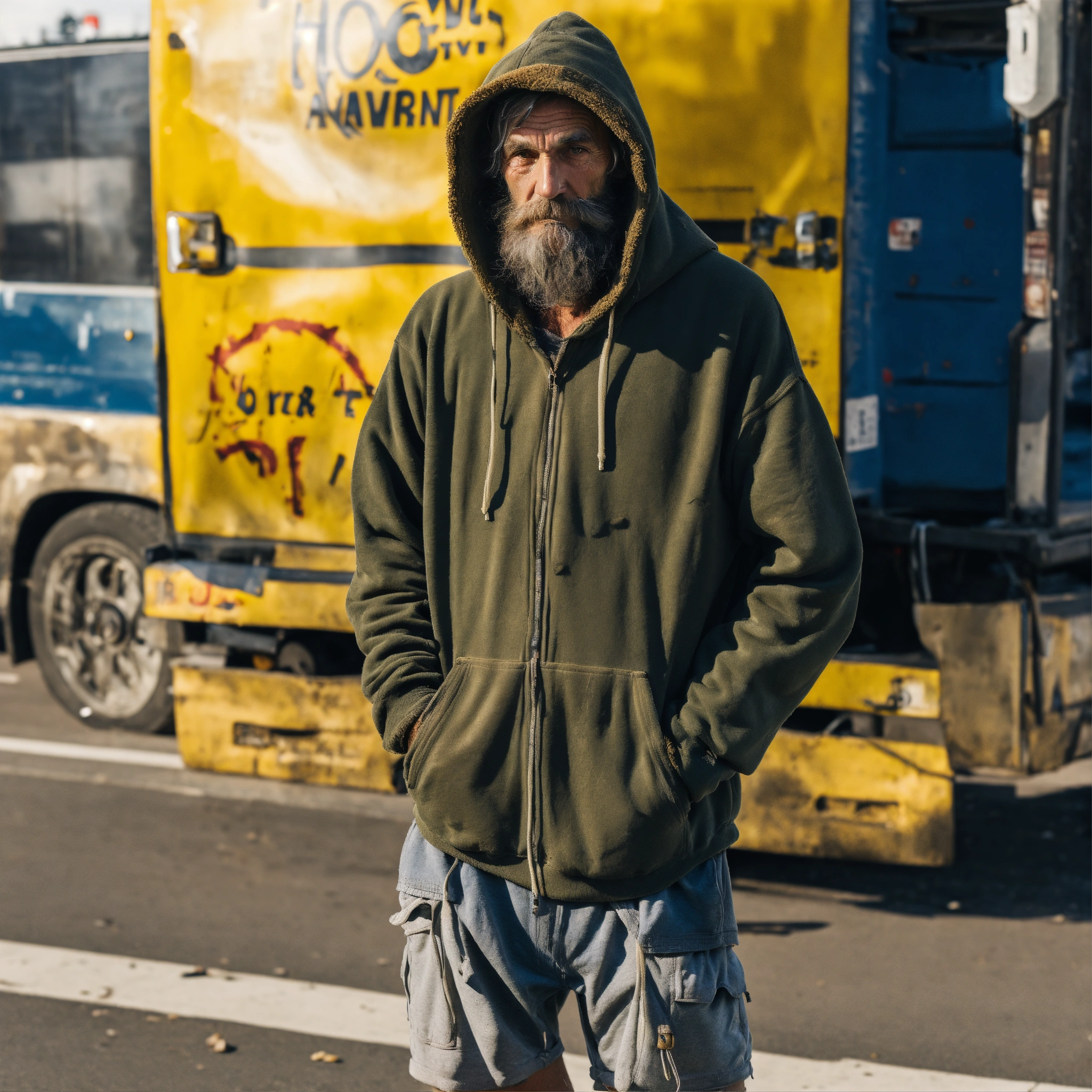 A huge homeless man unshaven wearing dirty shorts and a hoodie