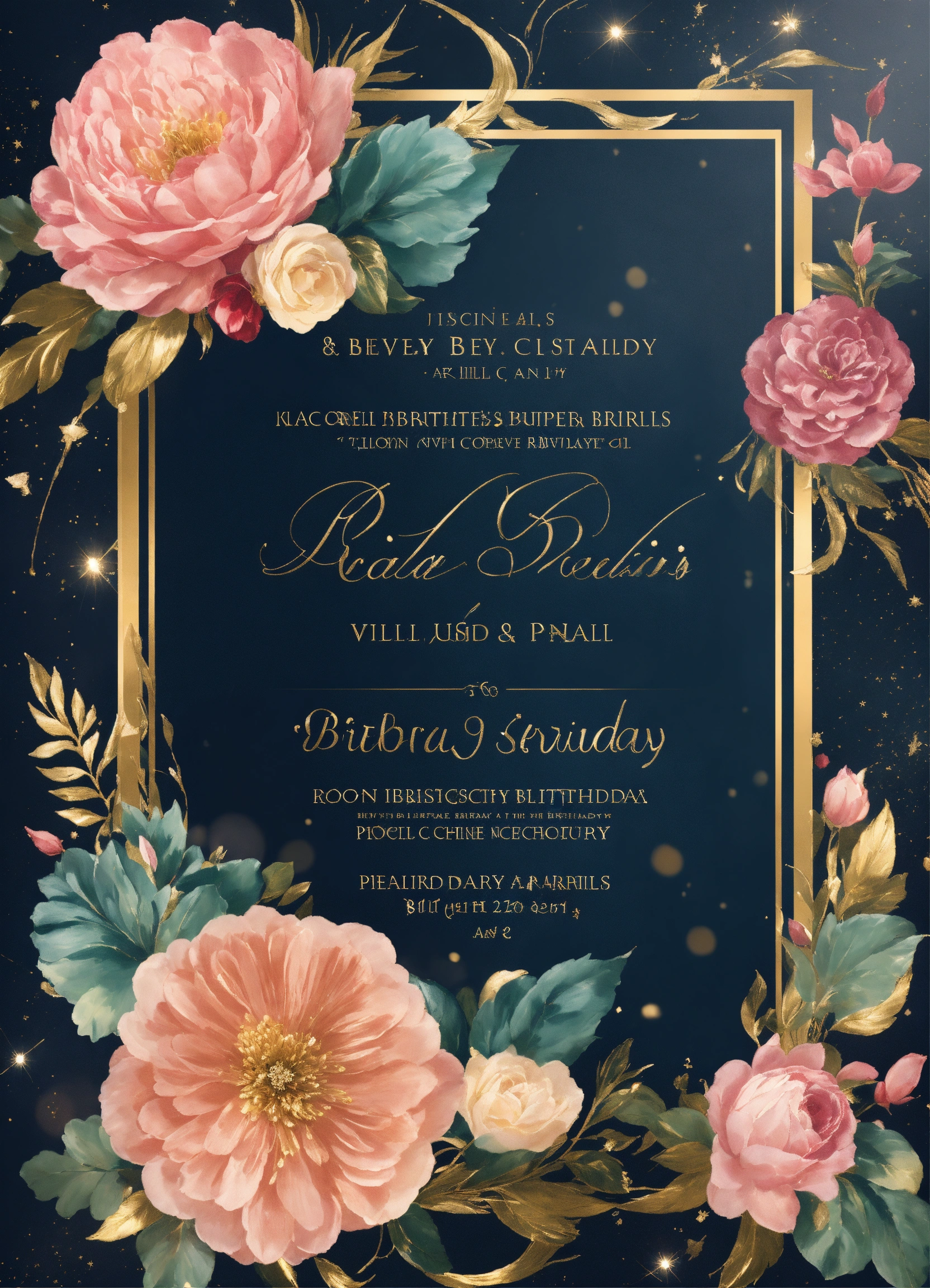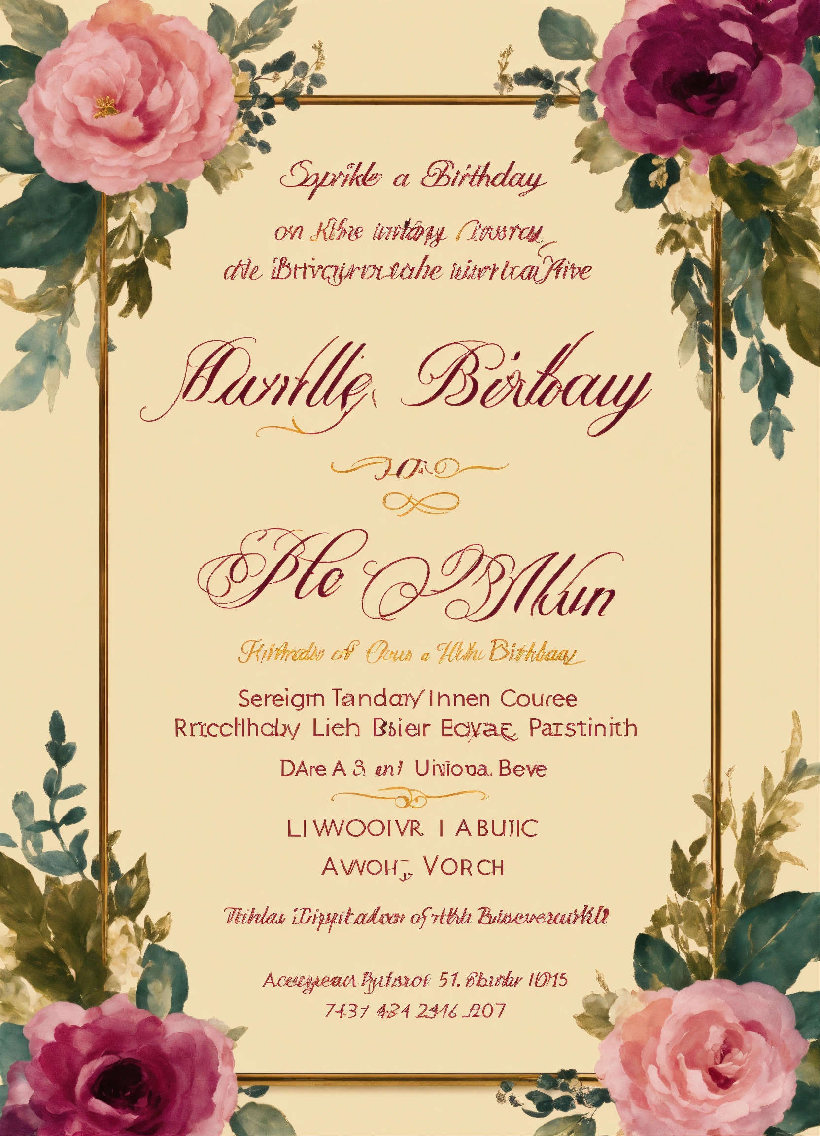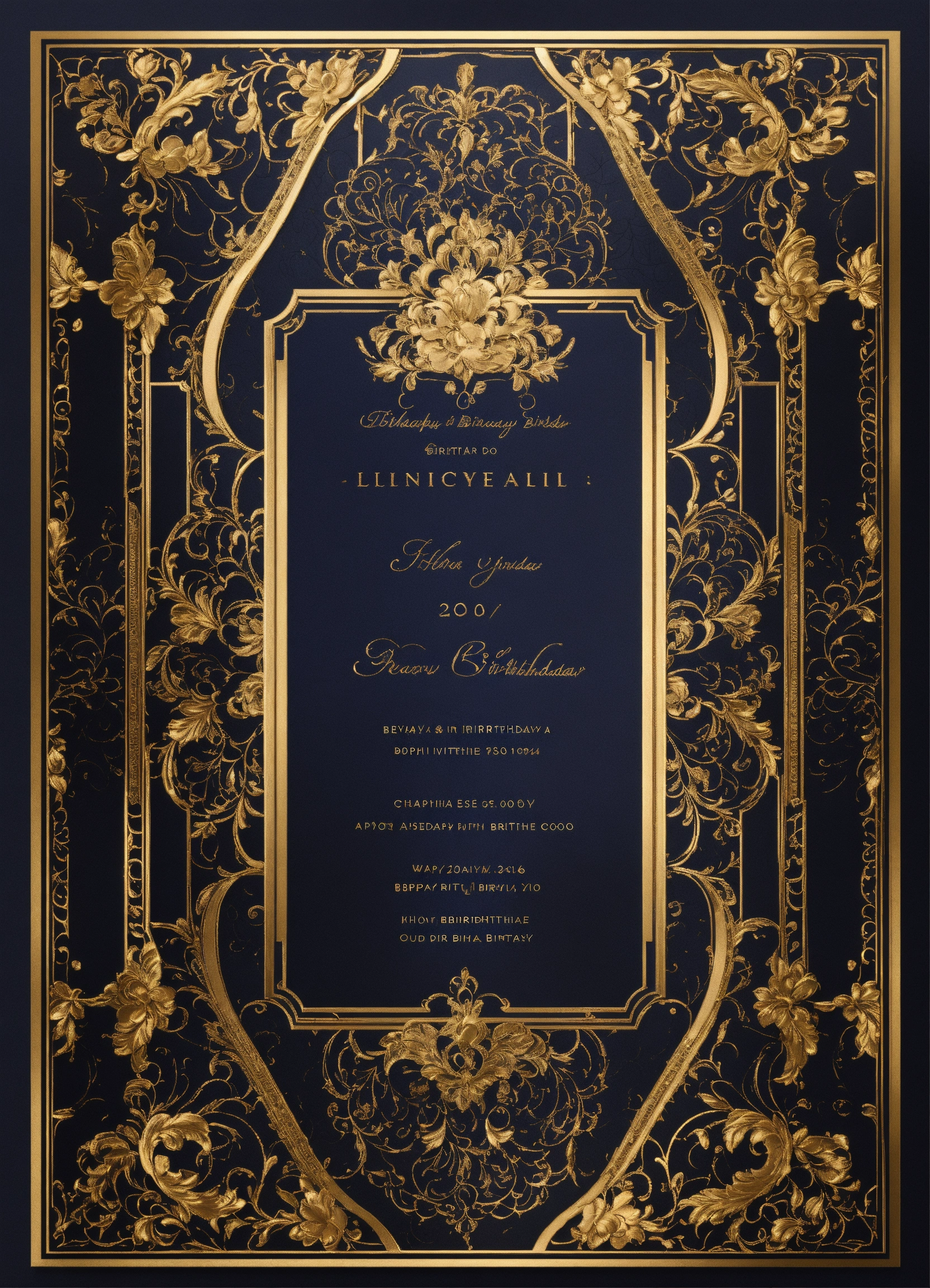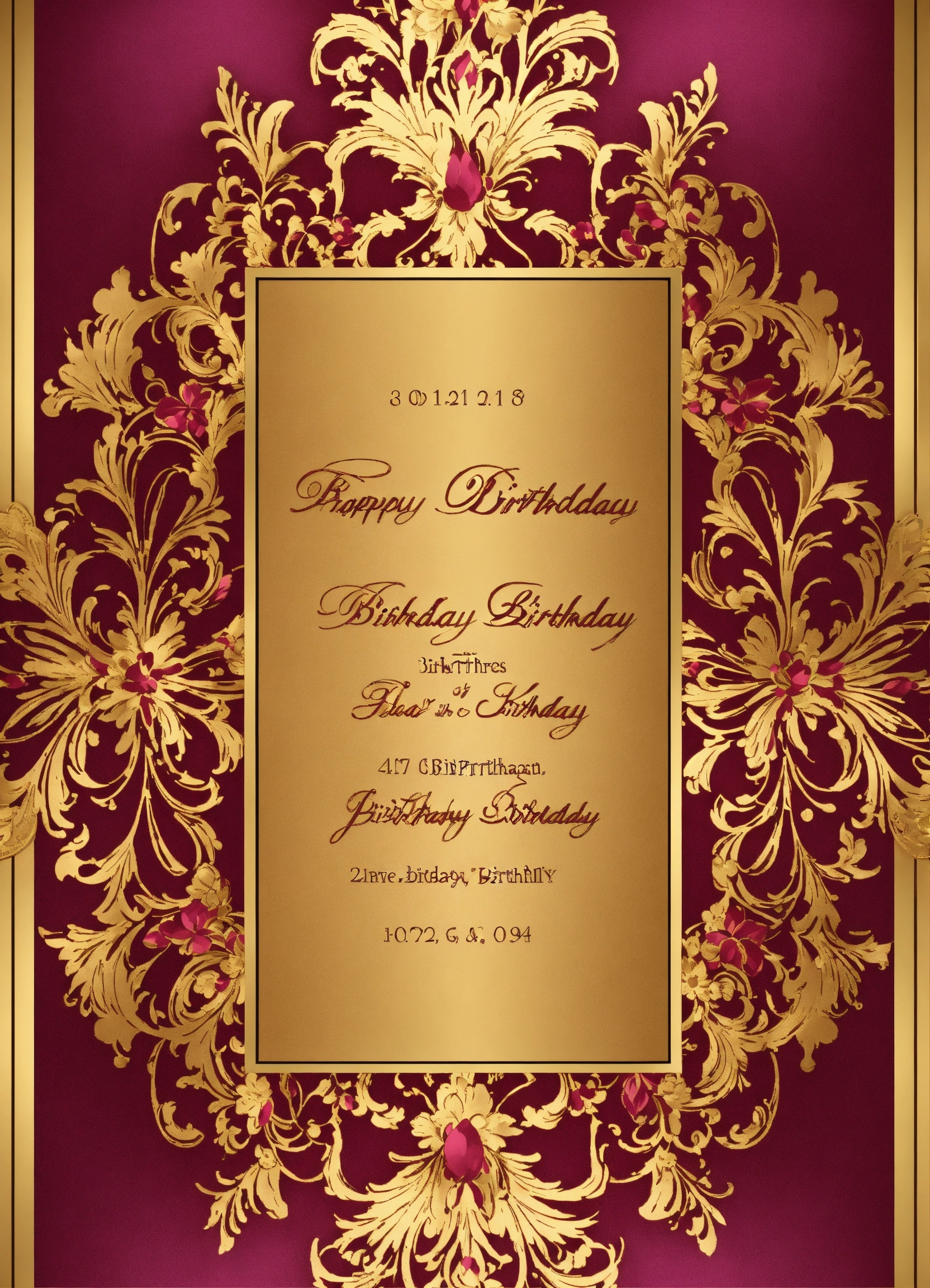 Design a birthday invitation template that exudes opulence and elegance, perfect for the discerning taste of wealthy women from prestigious locales such as dubai, the upper east side of manhattan, and beverly hills, california. this invitation should showcase timeless sophistication and luxury. the design should incorporate lavish elements, such as accents, intricate lace patterns, and perhaps a touch of sparkle. the color palette should consist of rich, regal hues that complement the theme. please create a blank template that allows for the easy customization of birthday details, ensuring that it evokes a sense of grandeur and exclusivity that resonates with the upper echelons of society.