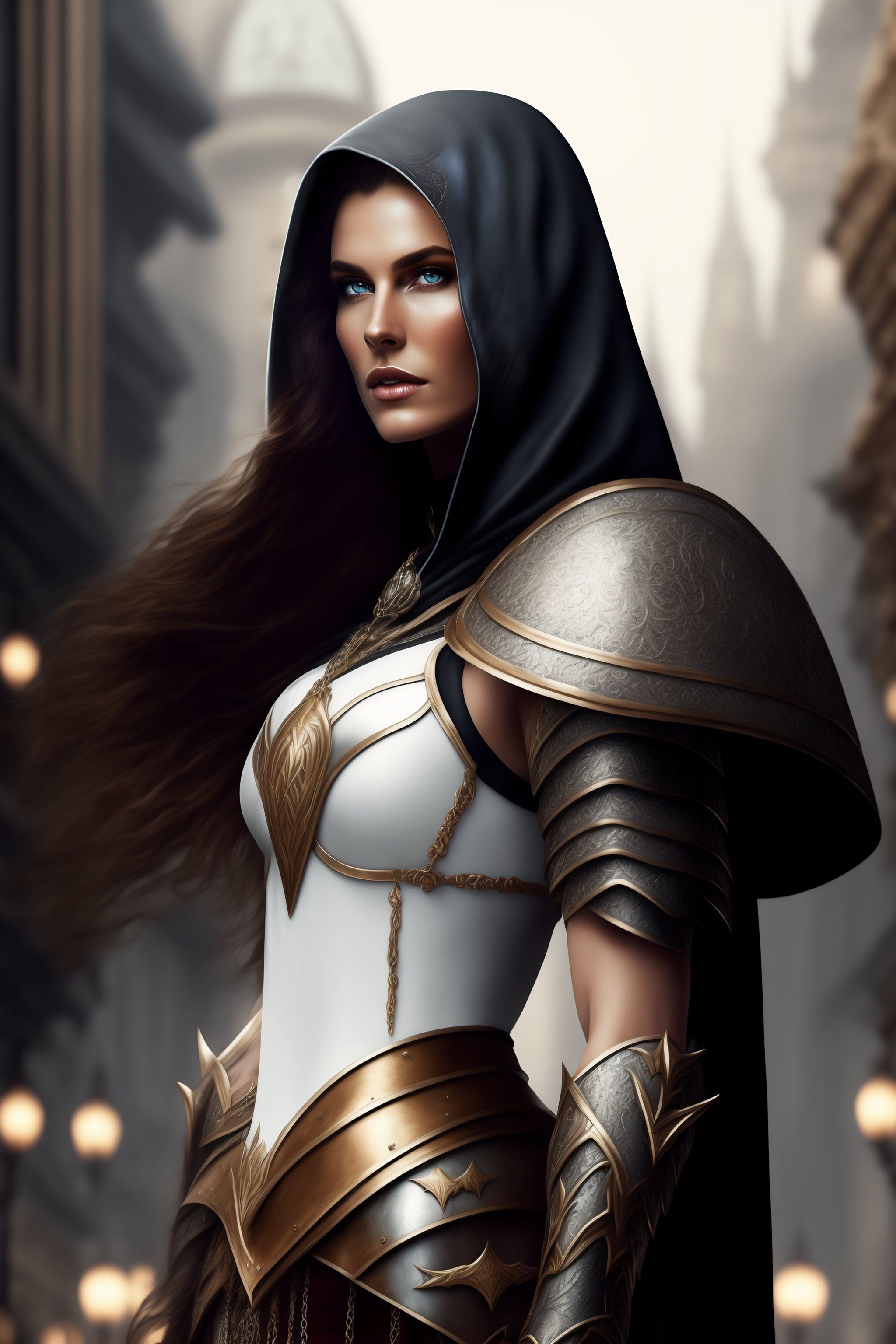 White female warrior brunette hair with metal full body and leg armour and a hooded cloak, overlooking a gothic massive city