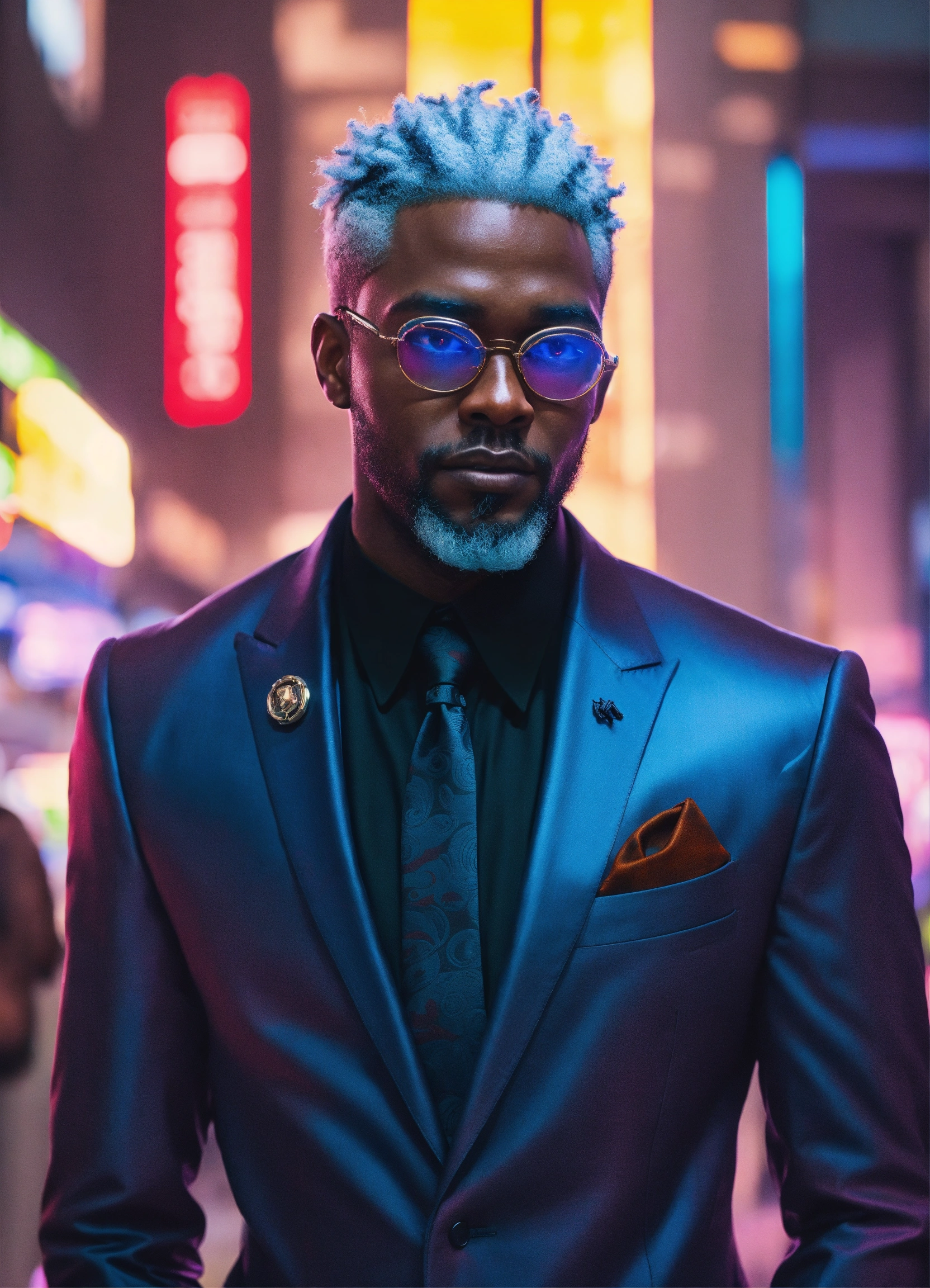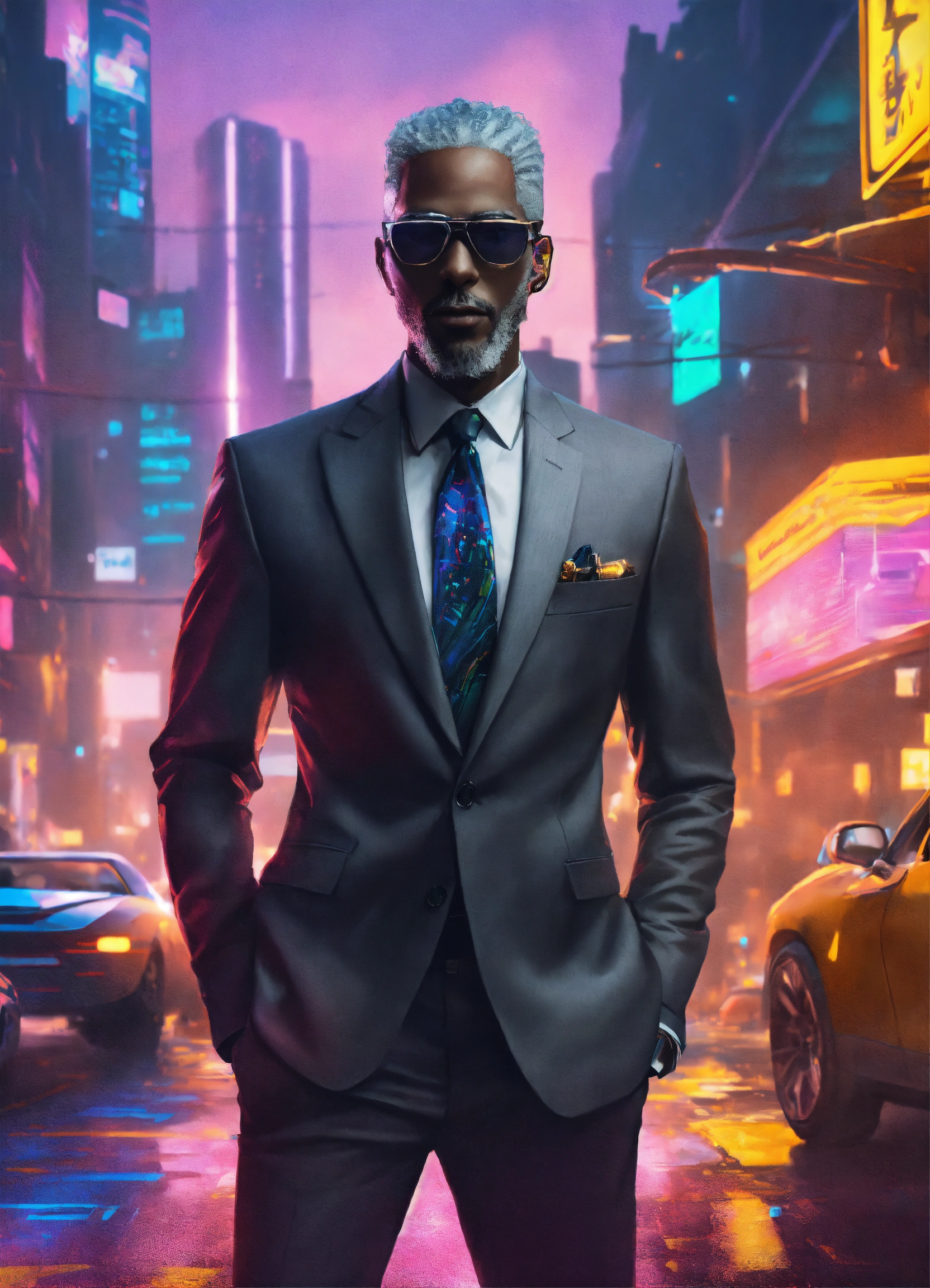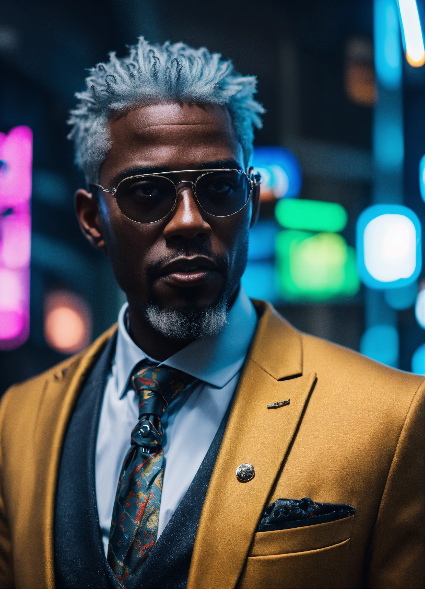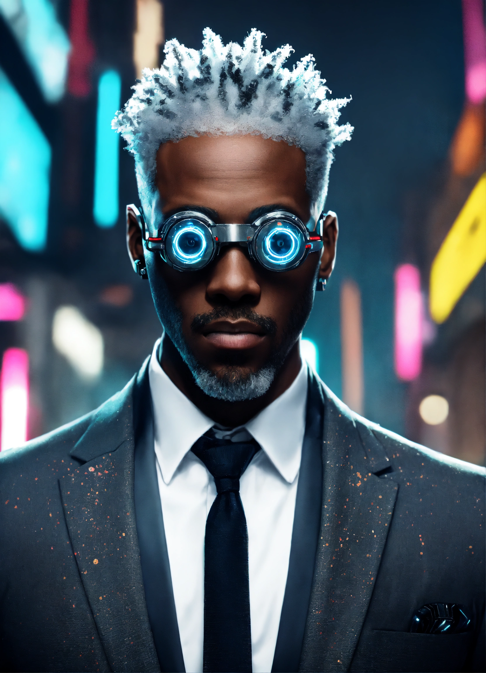 A black man with grey hair and robotic eyes dressed in a fashionable suit in a cyberpunk city