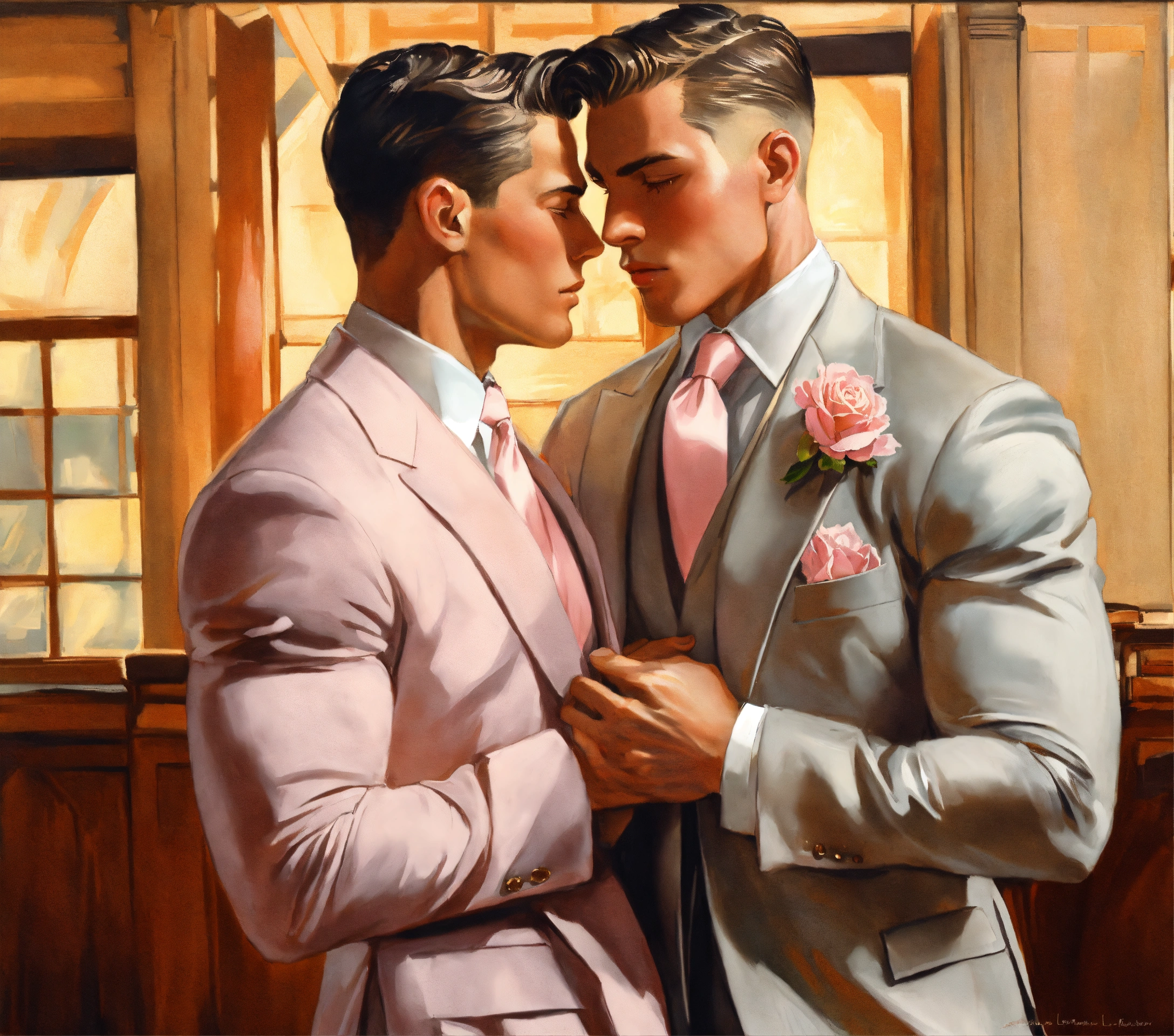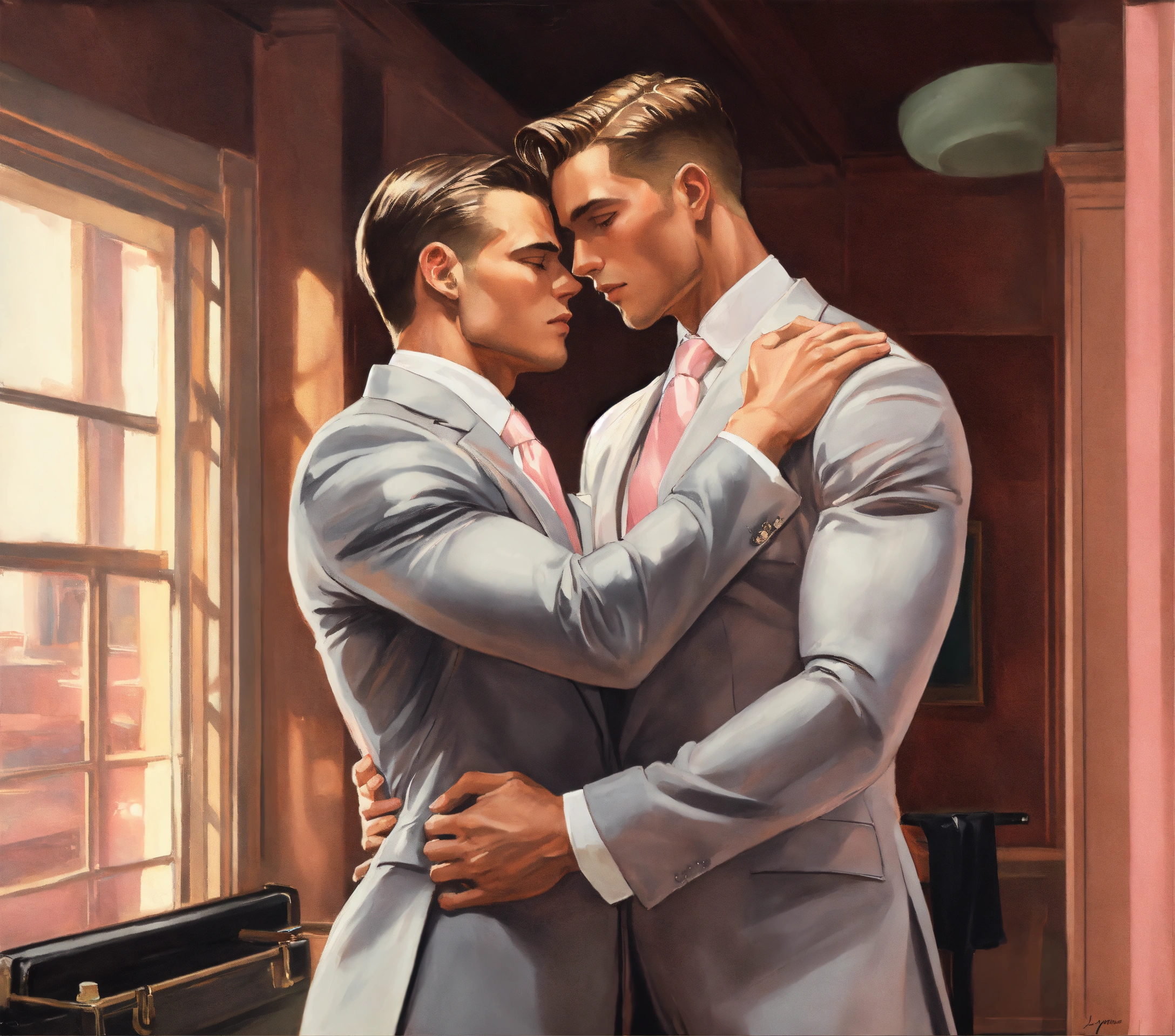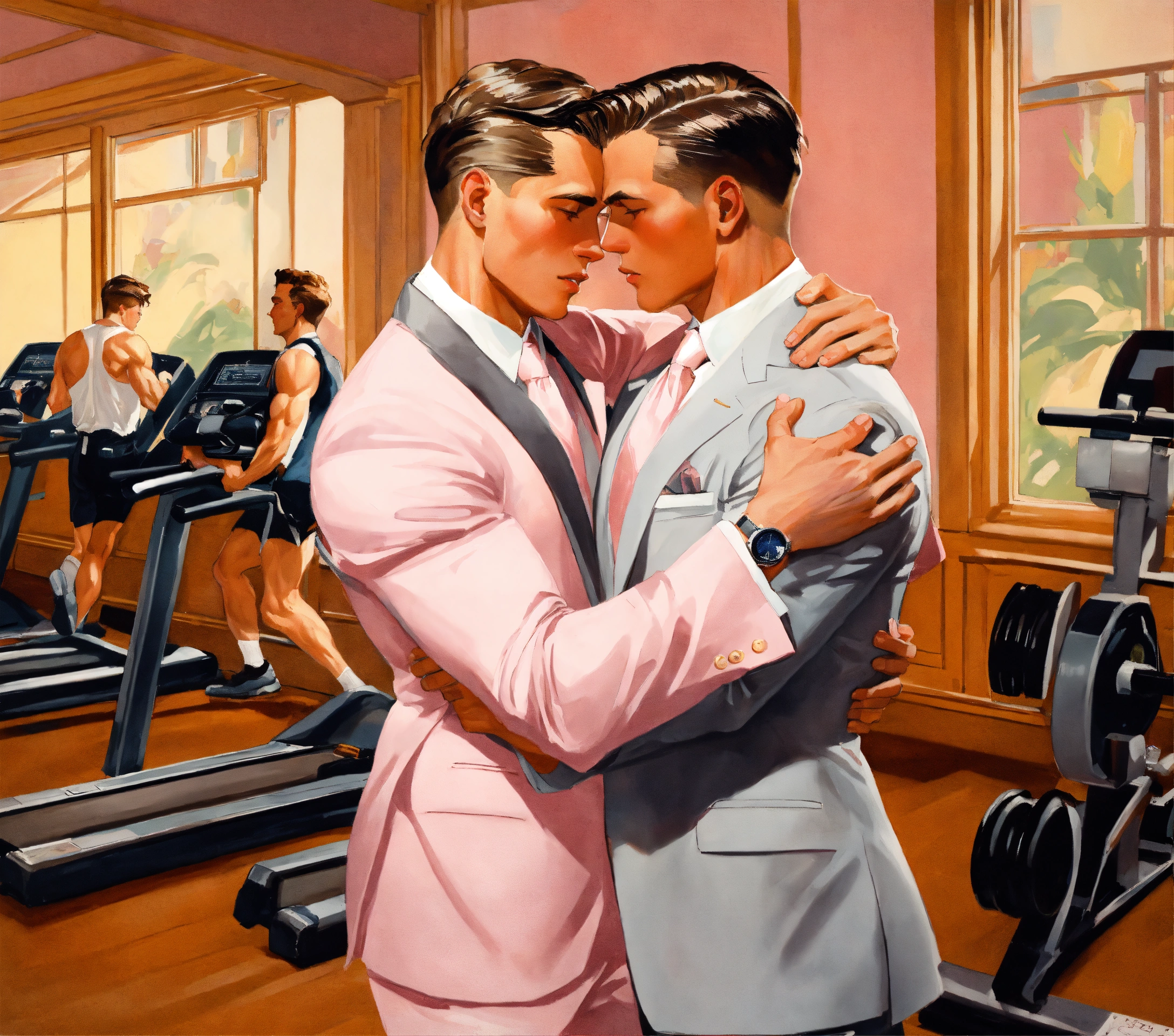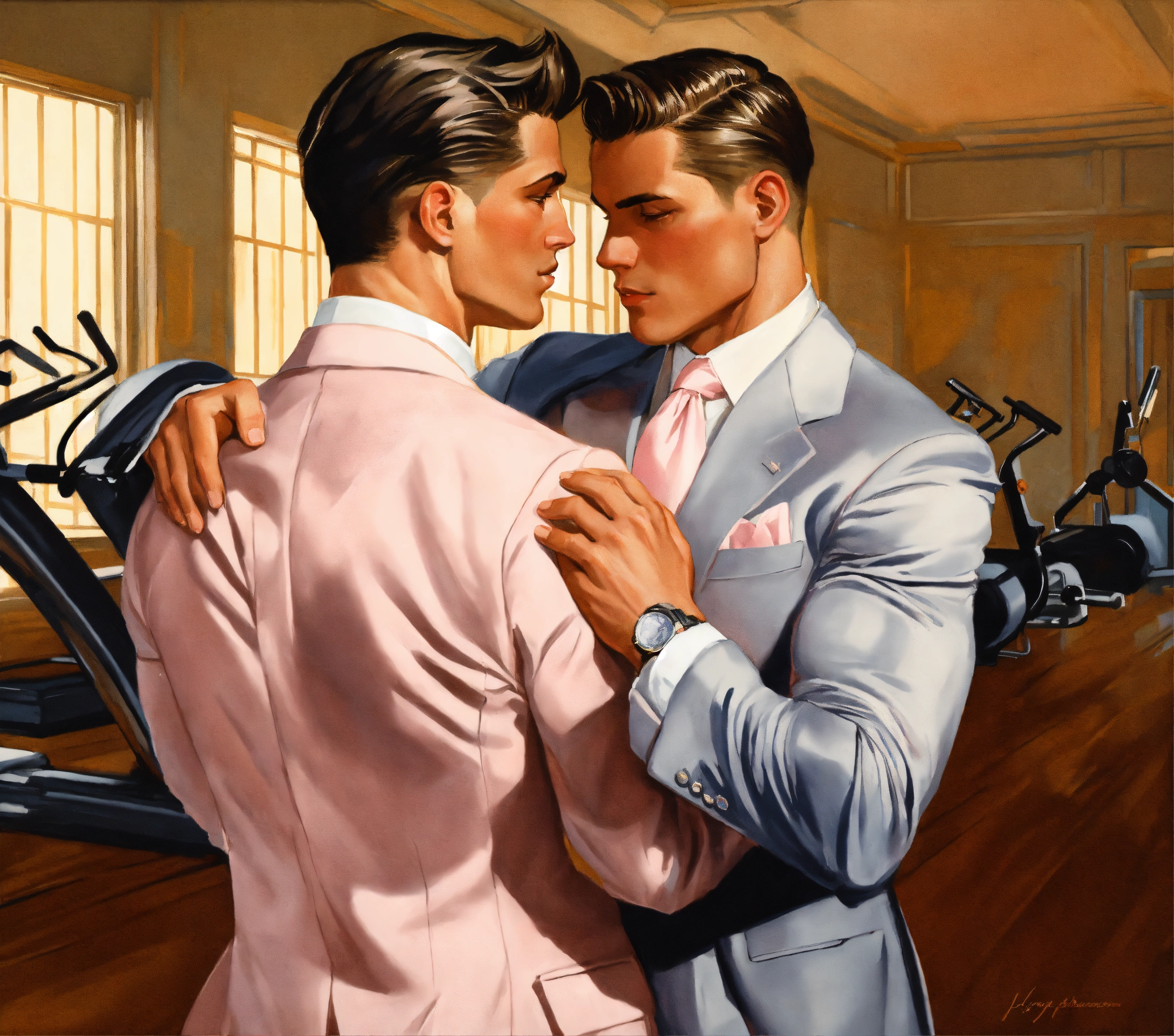 Two muscular sportsmen in light grey suit, pale pink tie, embracing in a fitness room, leyendecker style