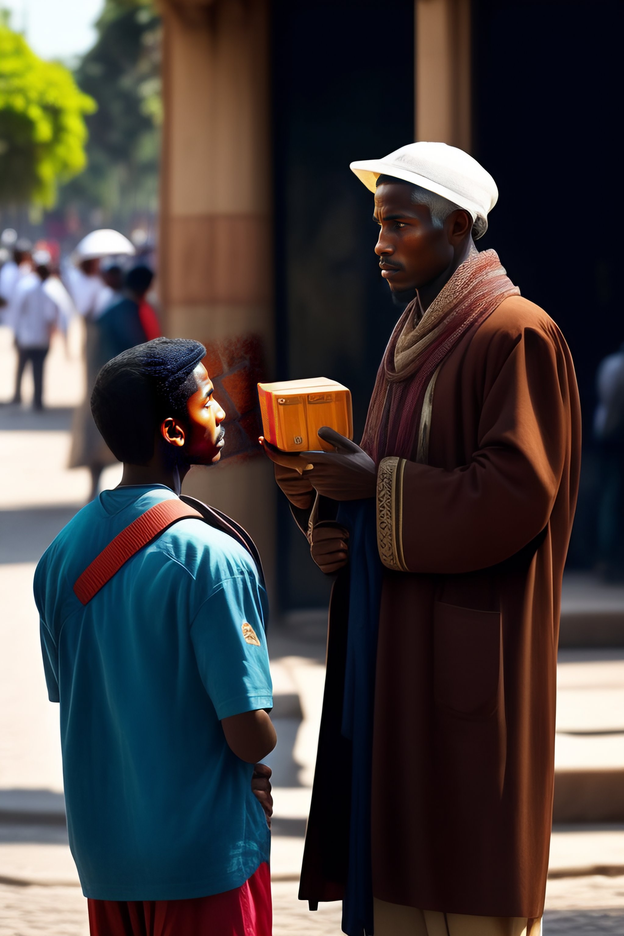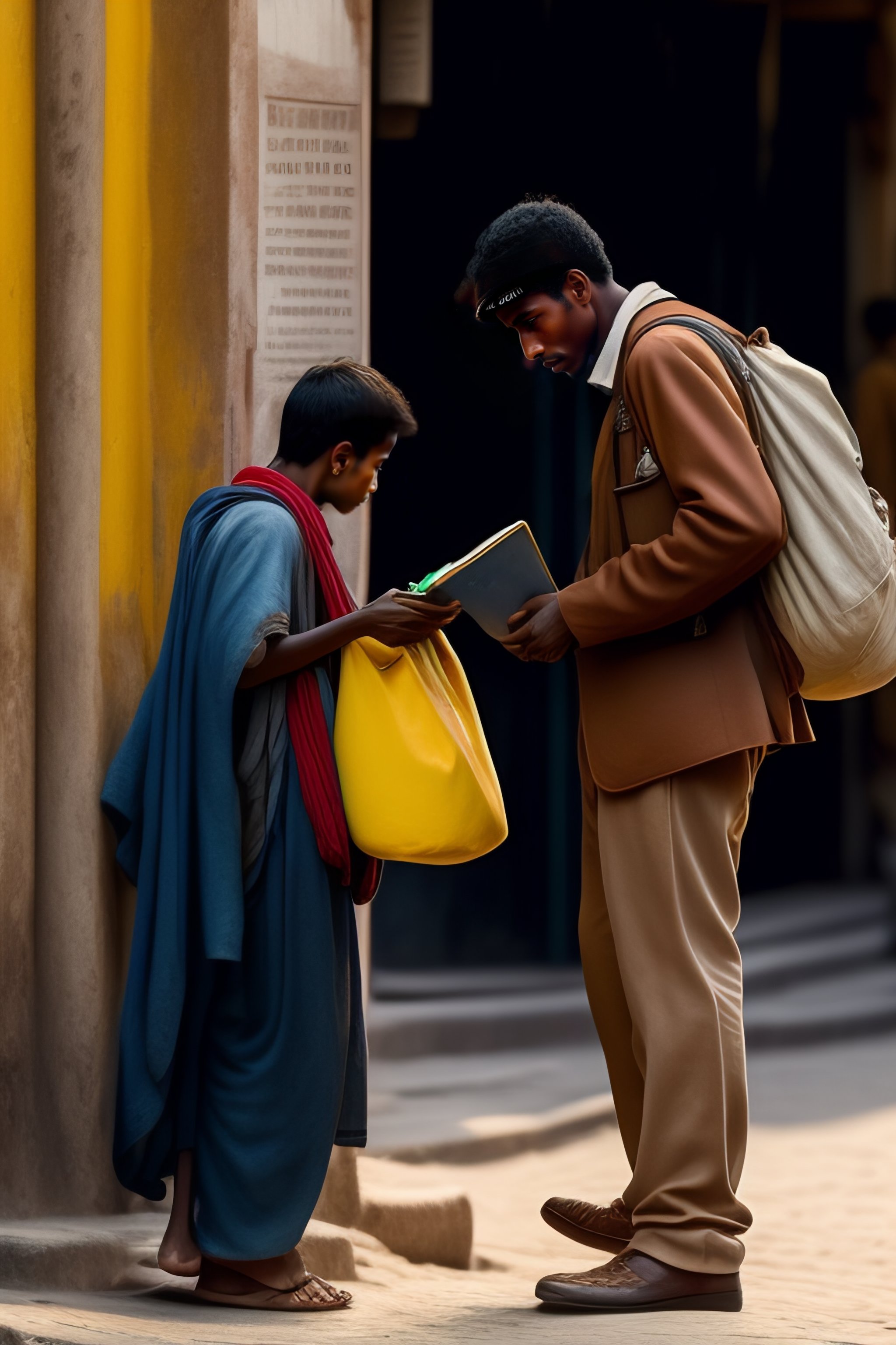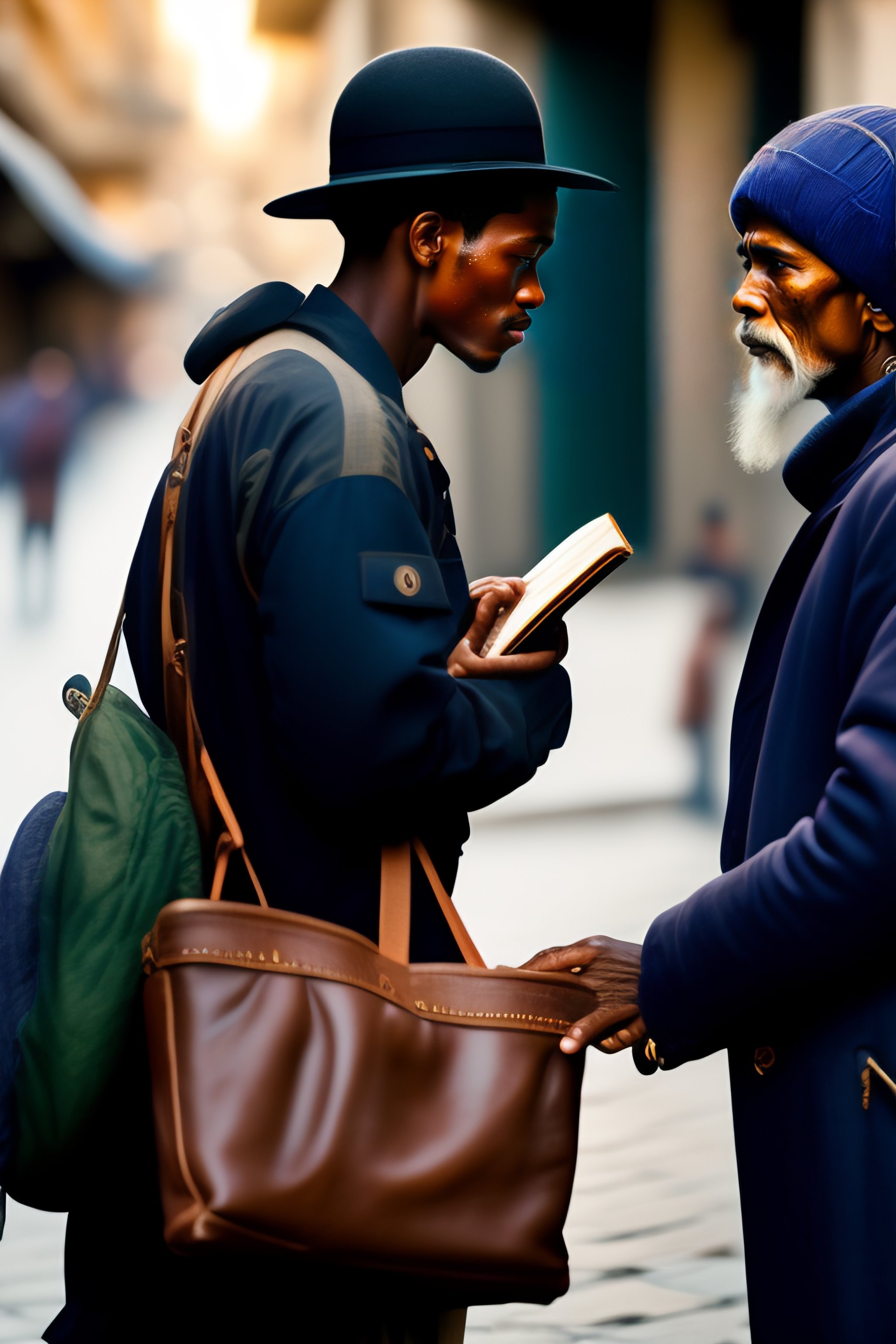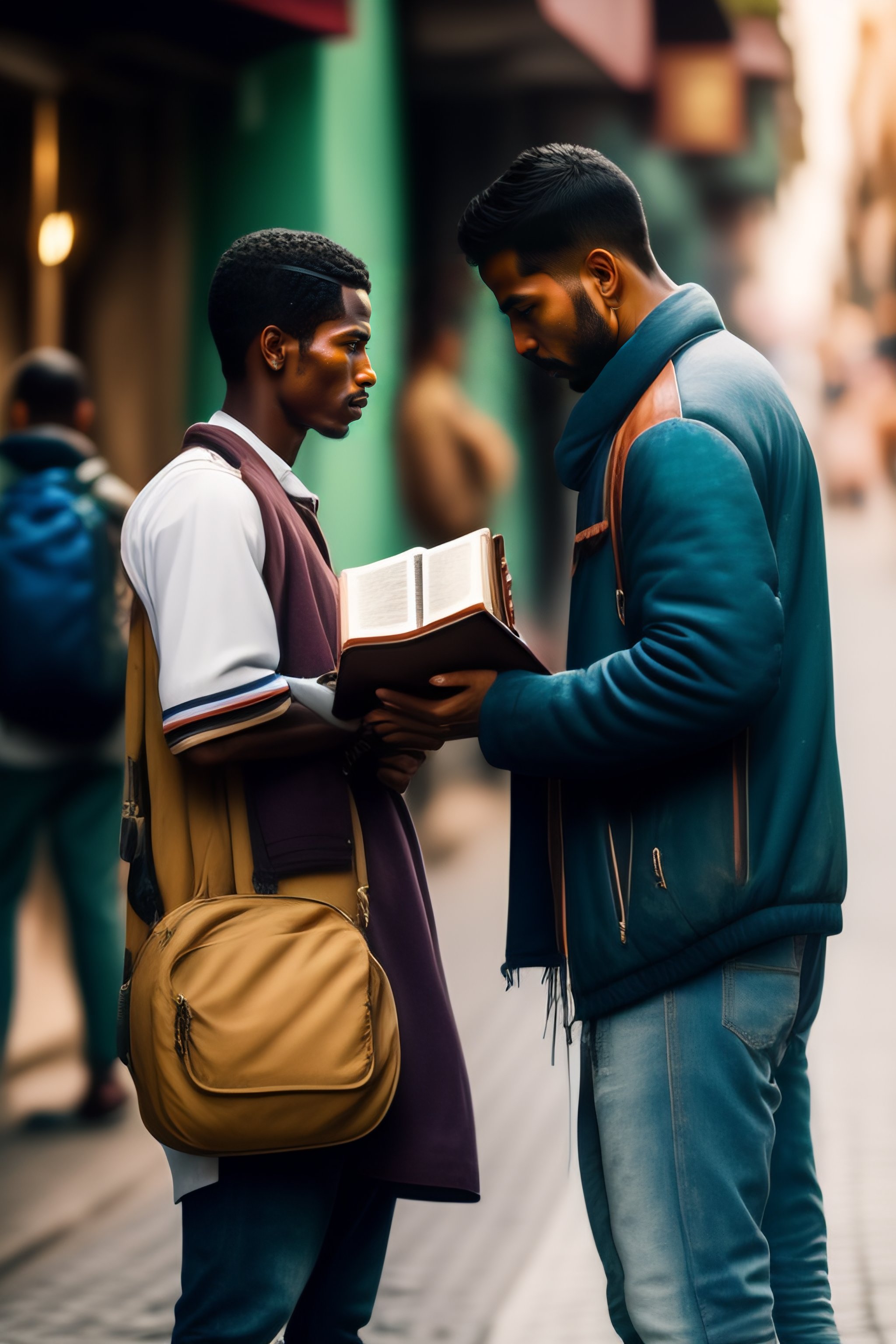 Young man, with a bible in his hand helping a beggar who is asking for alms on the street high realism, real photo, in the present day of 2023 in resende city of brazil