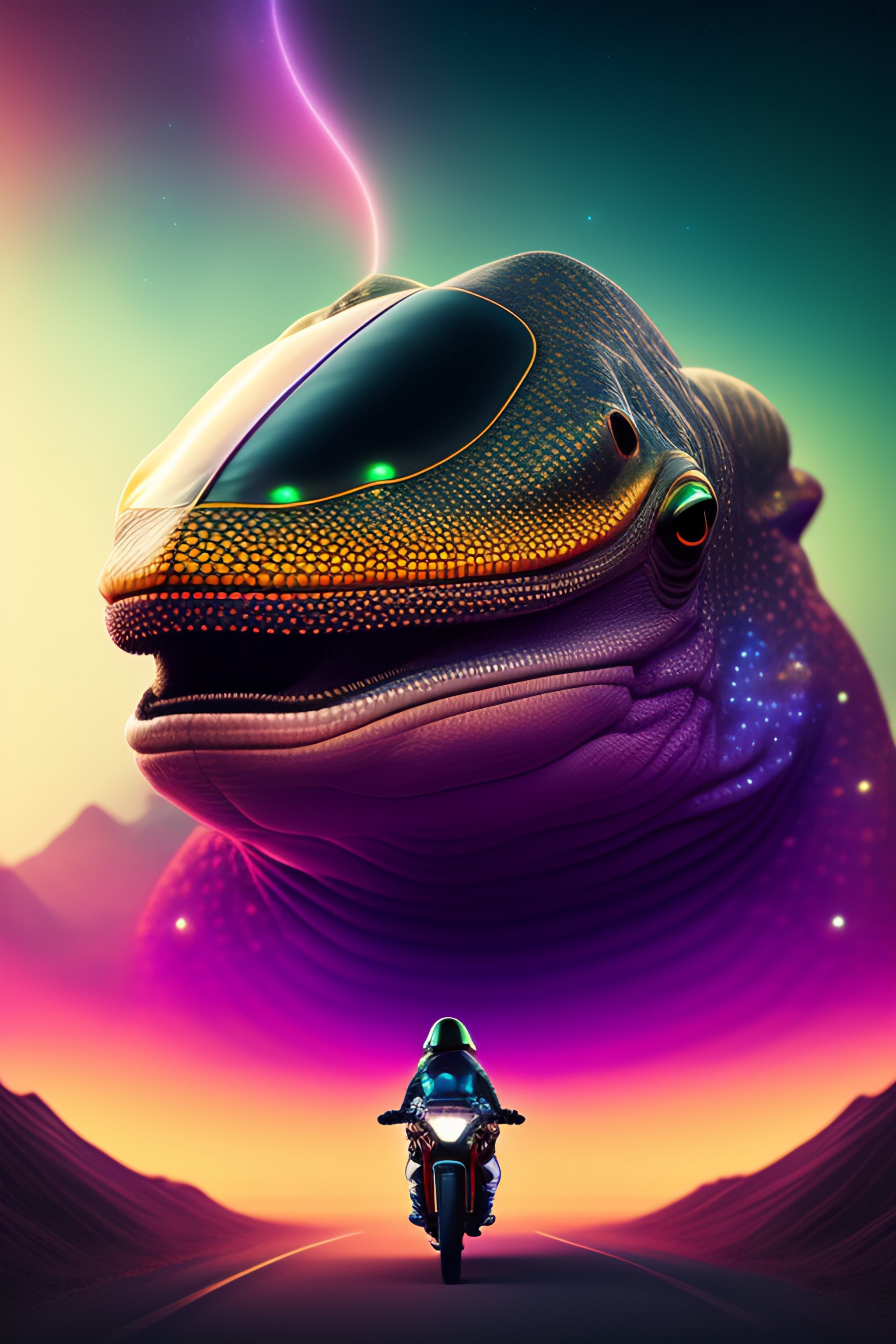 Slug alien lizard stingray child space suit vapor wave snake head medusa on a bike