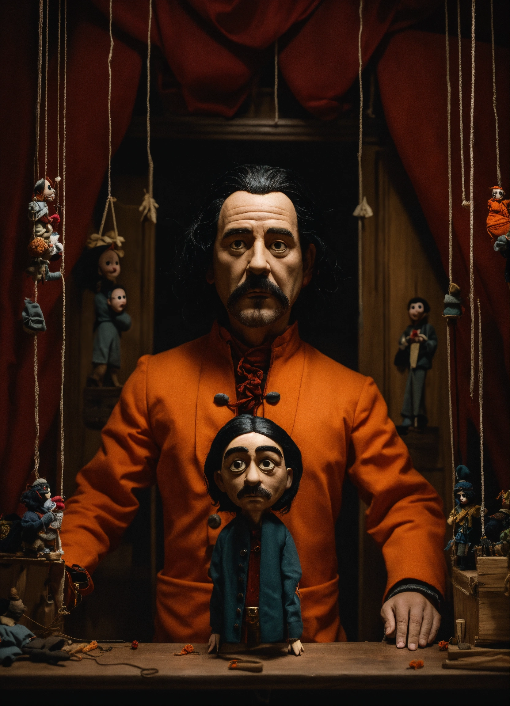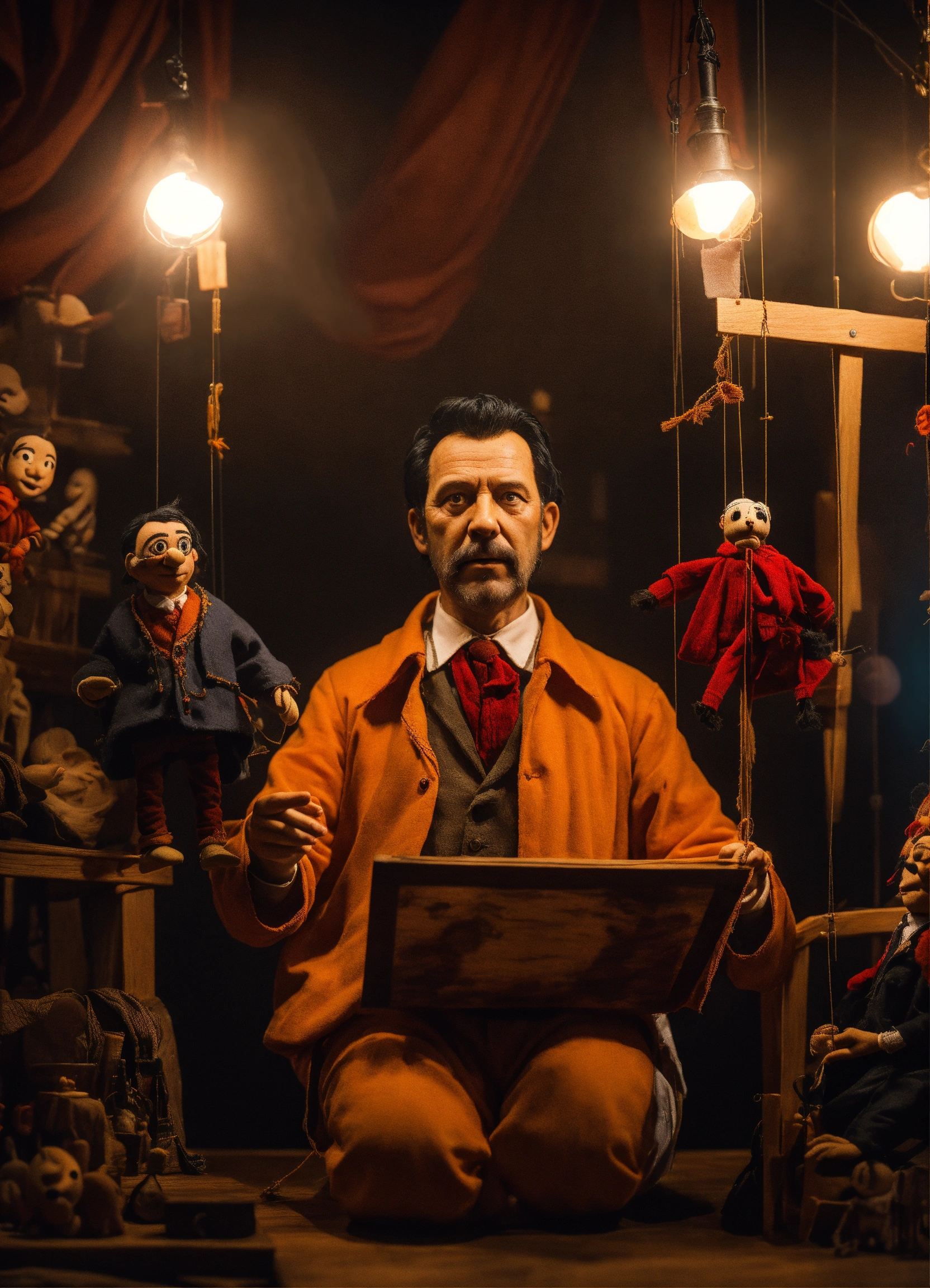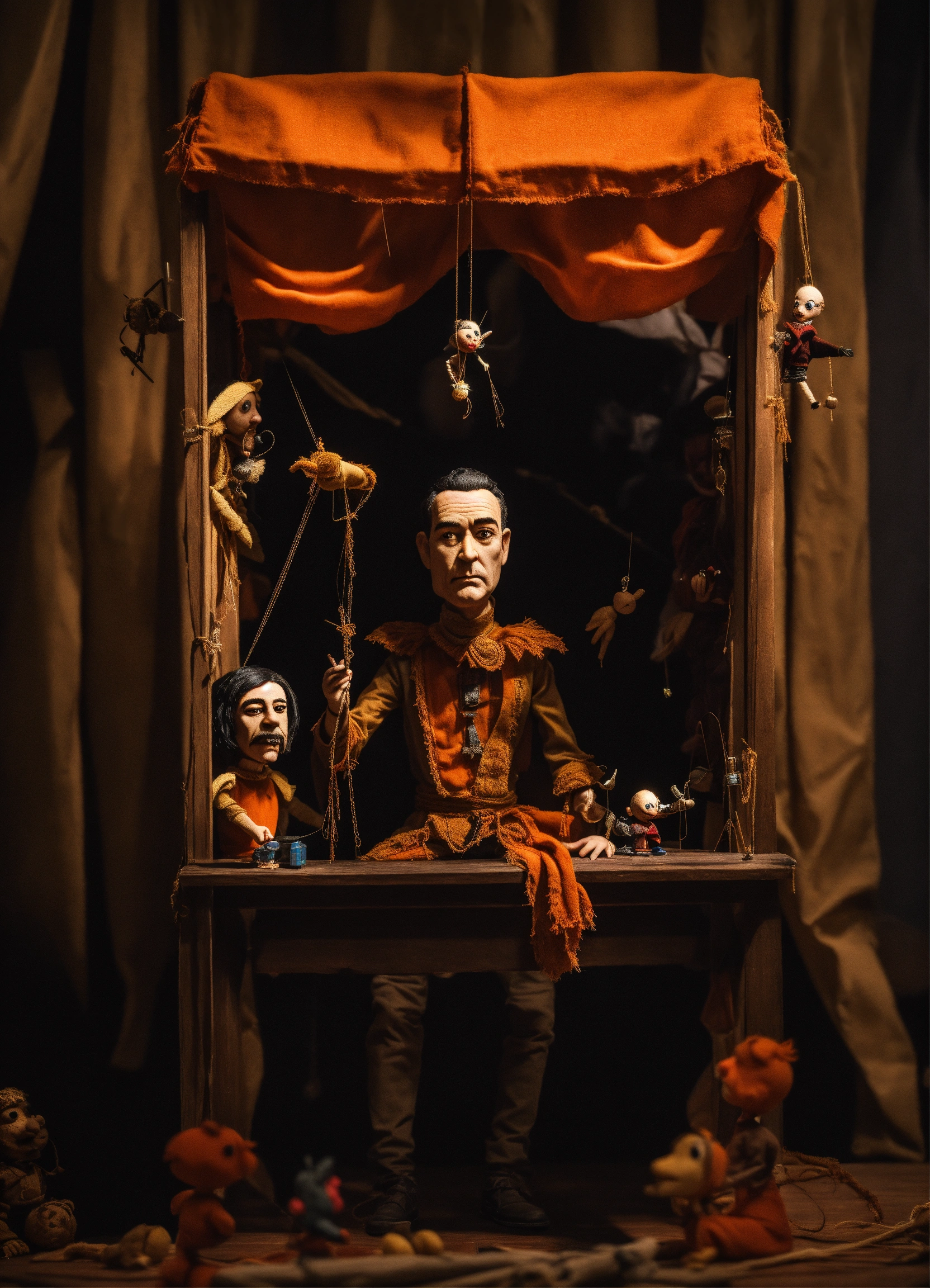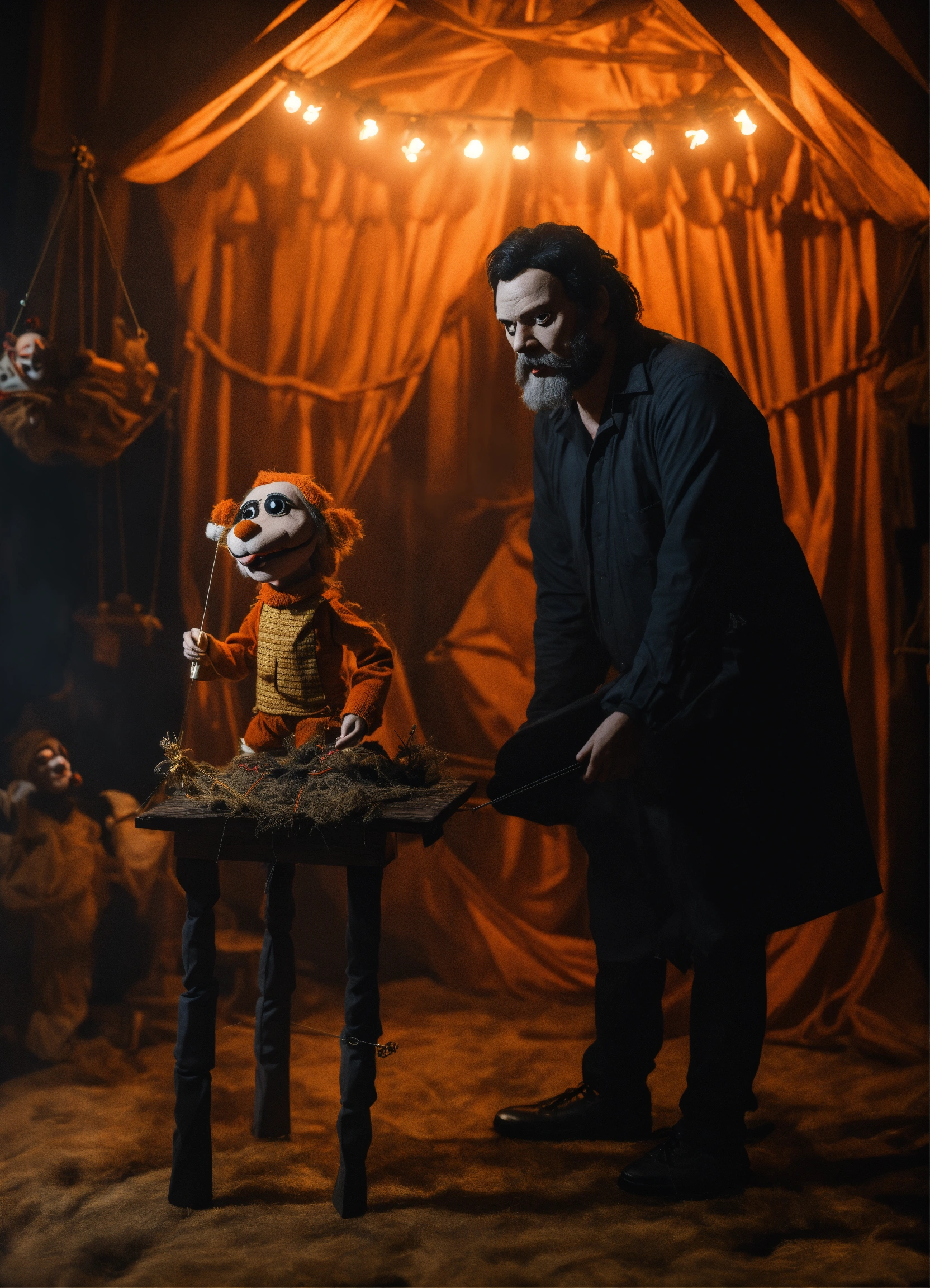 Voratus, god of consuming dread, paranoia and fear. he is a creepy, middle-aged man. he has black hair. he is a puppeteer. he is giving a puppet show with wooden marionettes. dark orange. 4k, ultra-realistic. high definition.