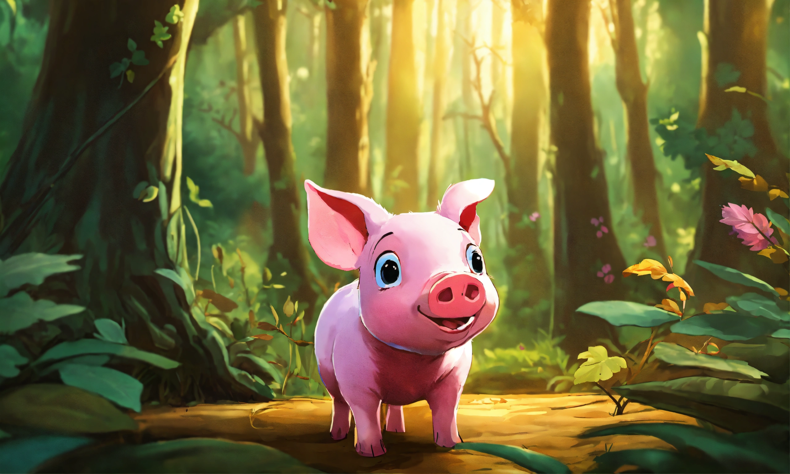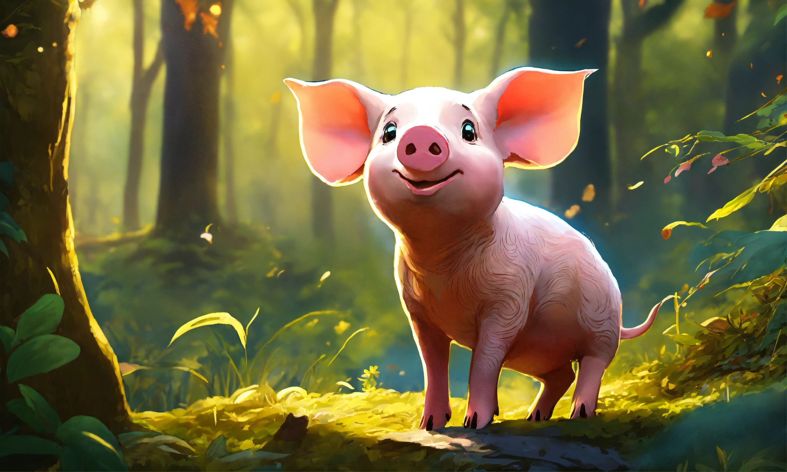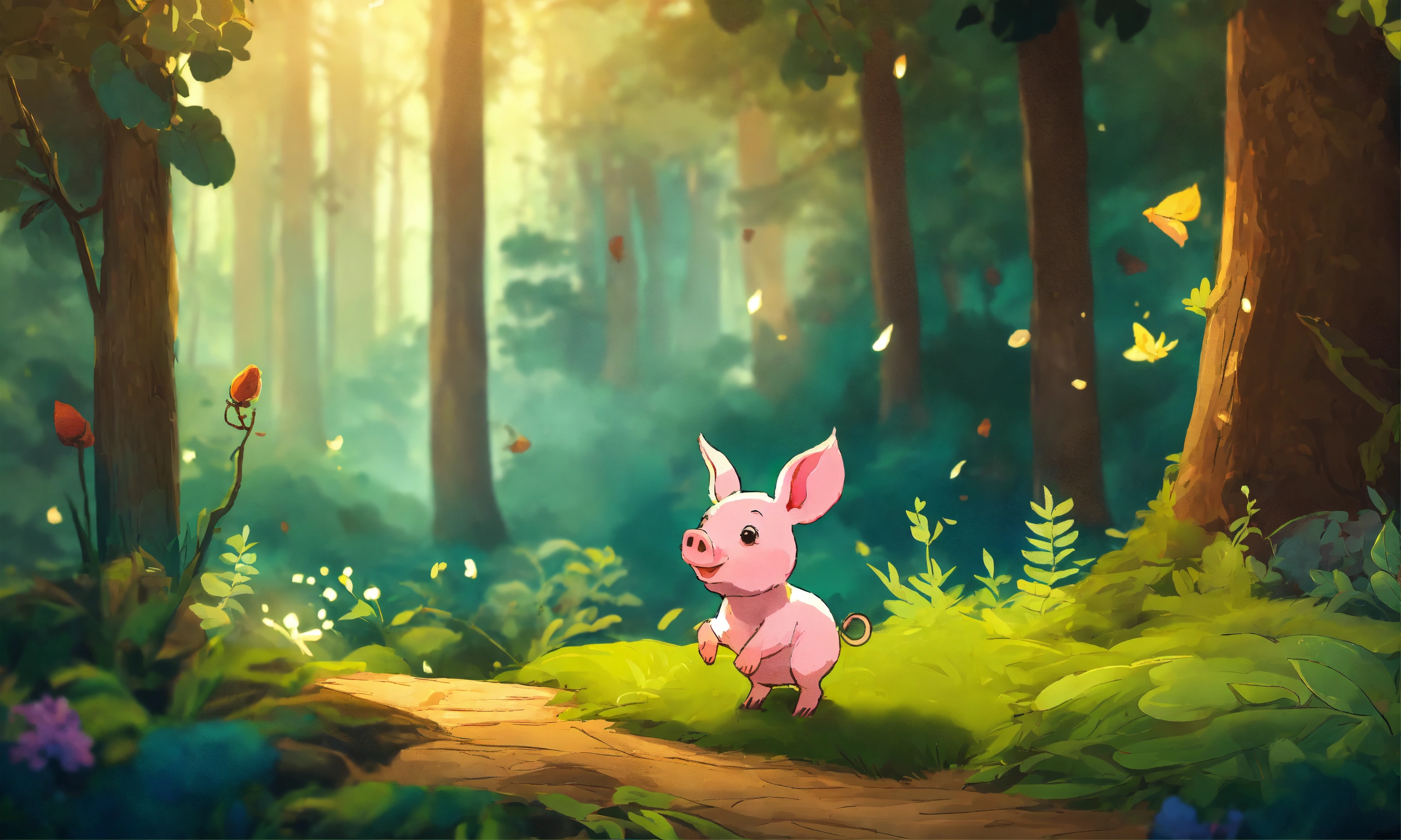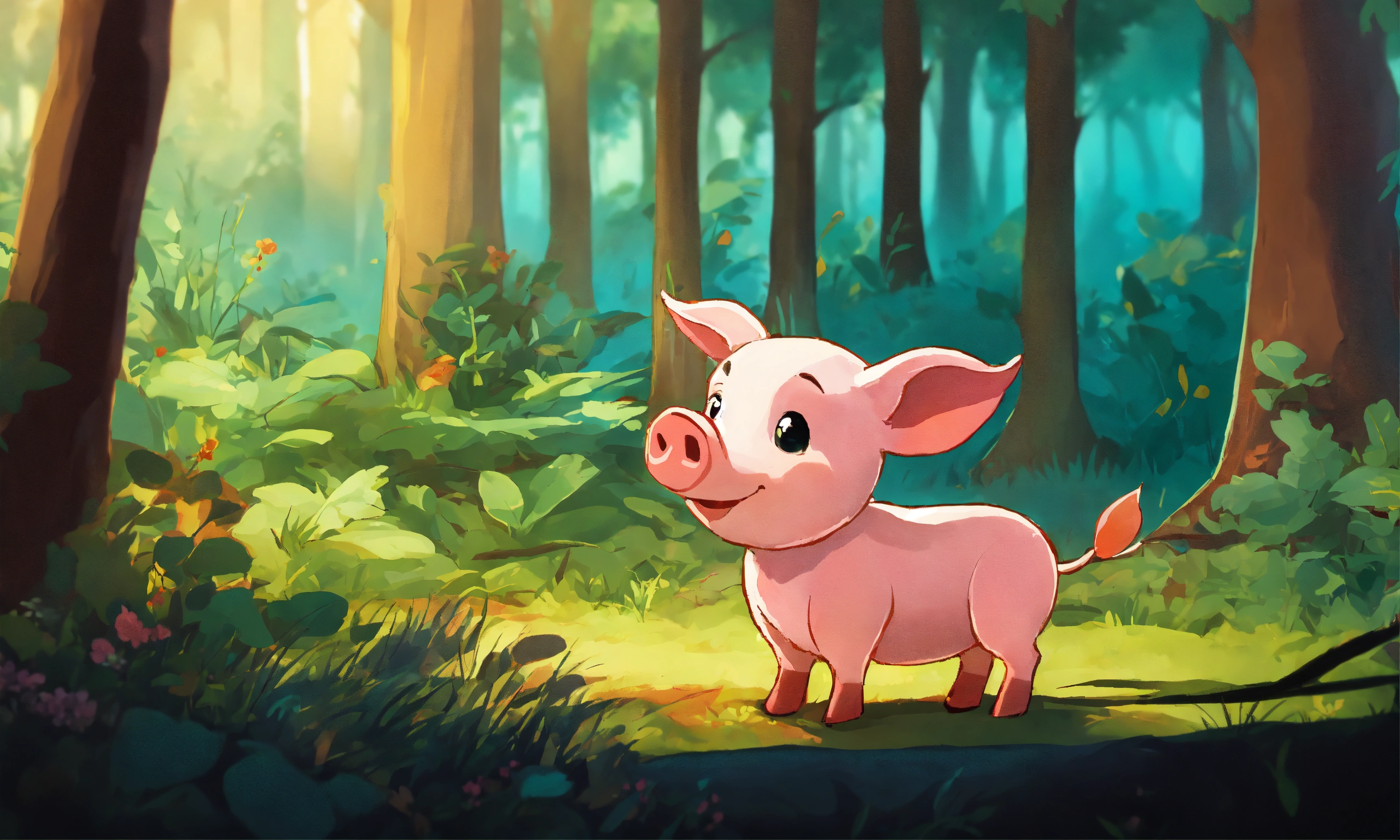 A cartoon style anthropoid piglet in the magical windy forest edge