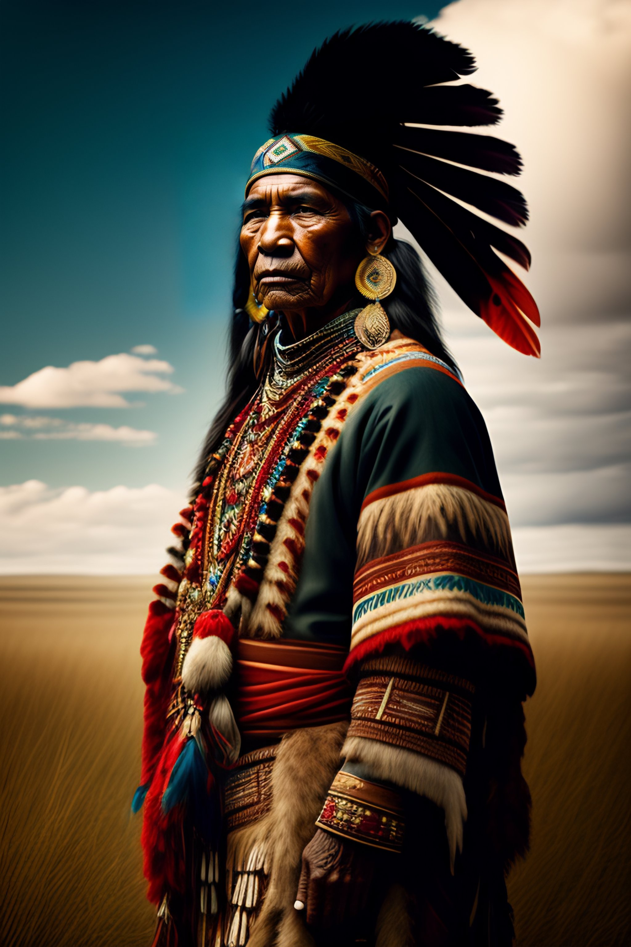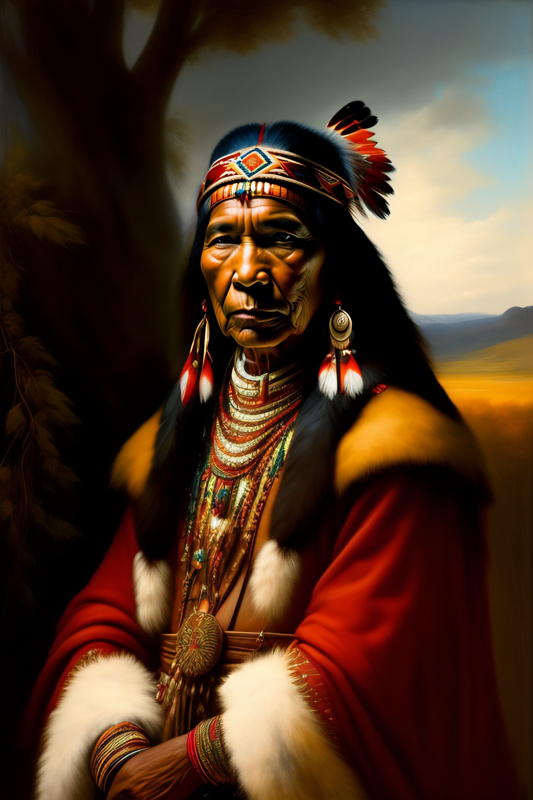 Native american in a rembrandt style with traditional native american clothing in a field