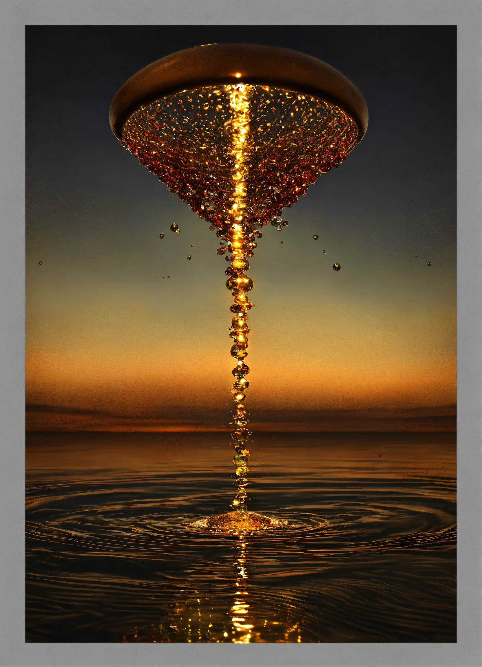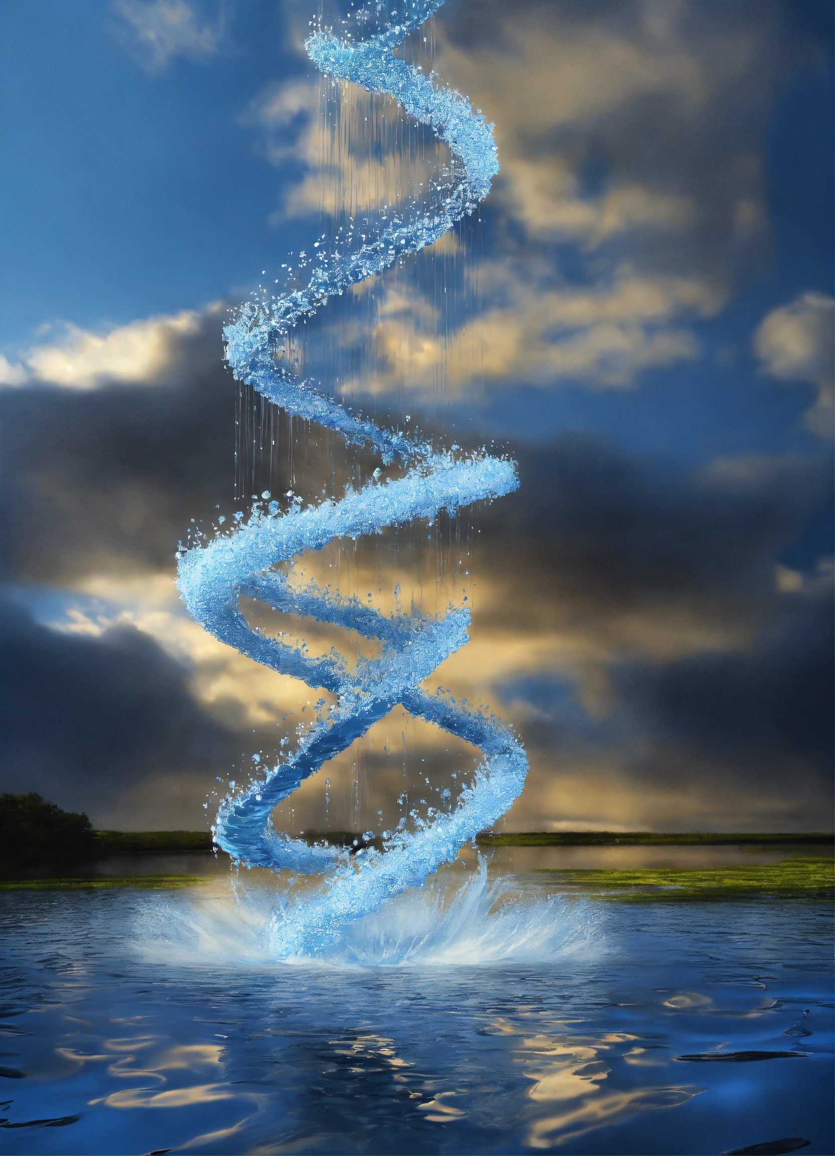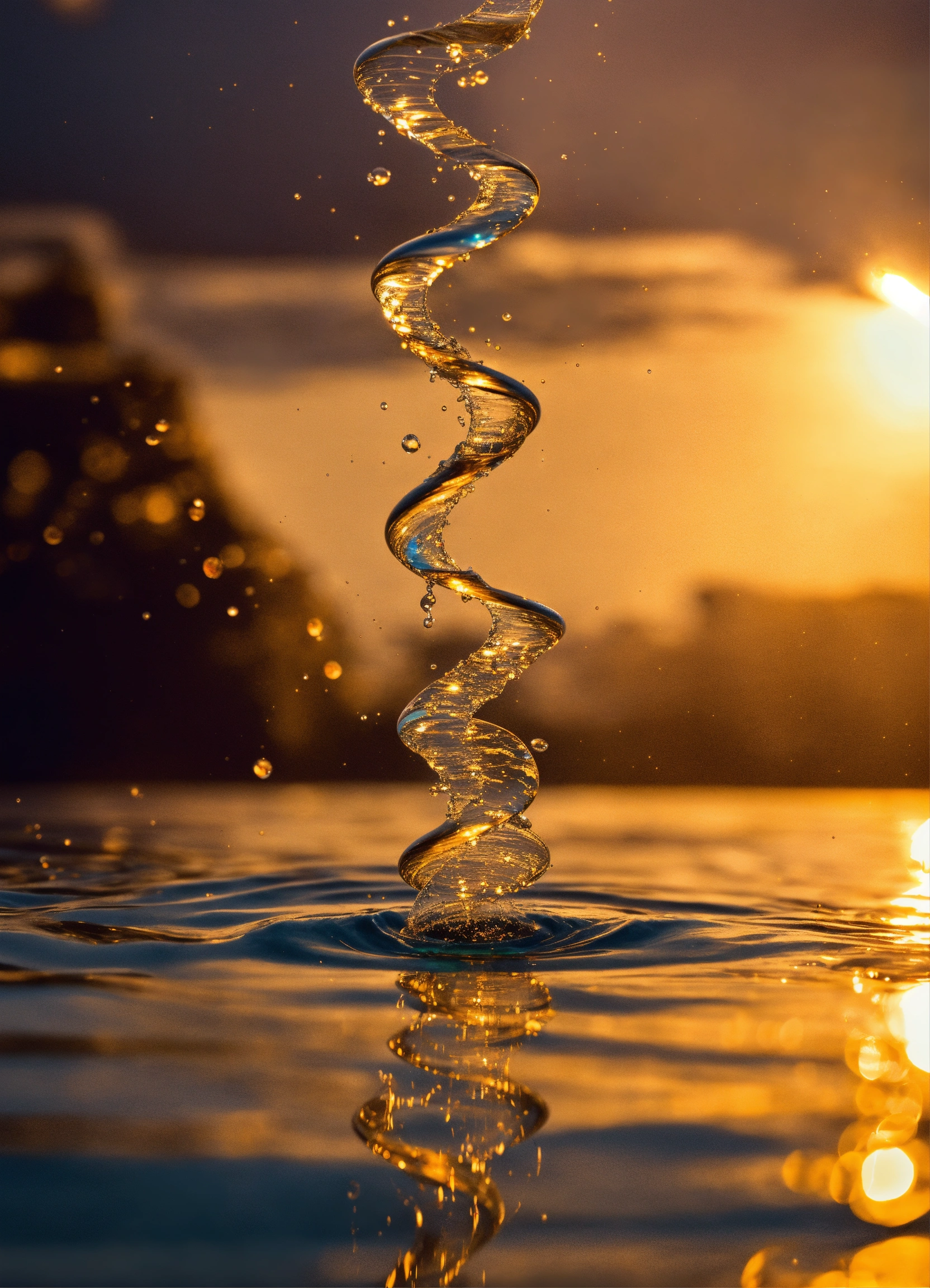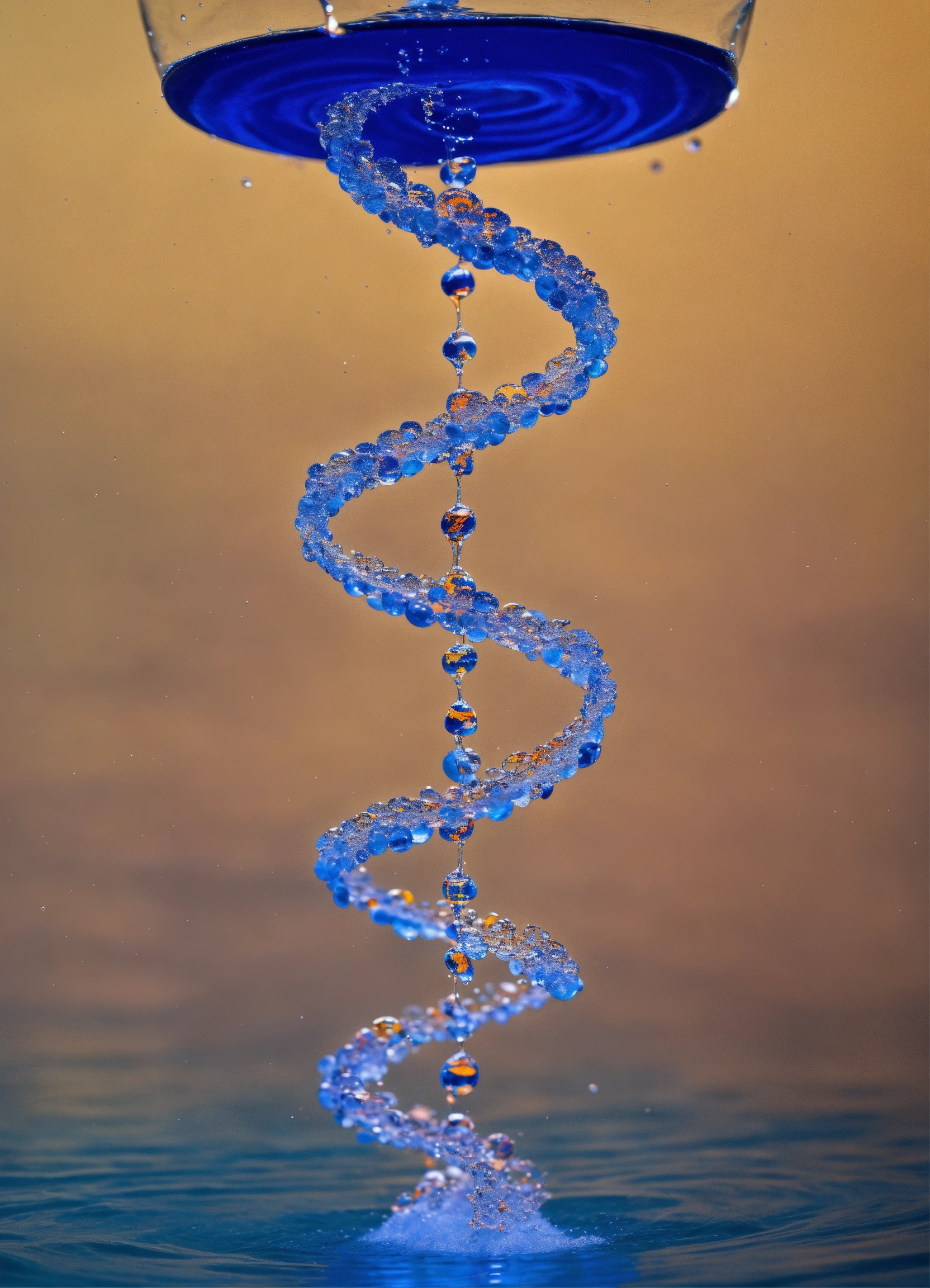 As the drop resurfaces, the drop divides into multiple smaller drops above the water surface, the splash engage in a mesmerizing dance of swirling, synchronized movements in the shape of dna