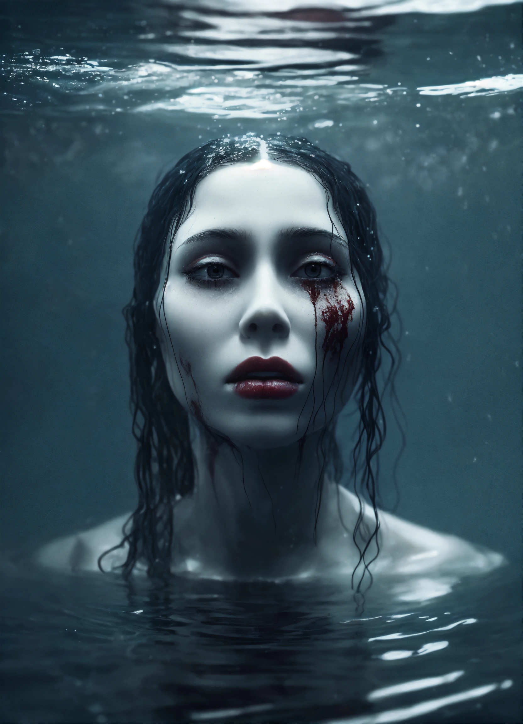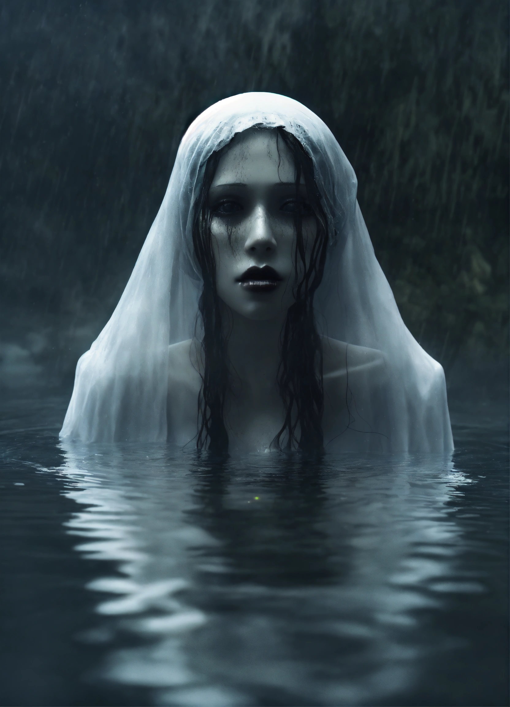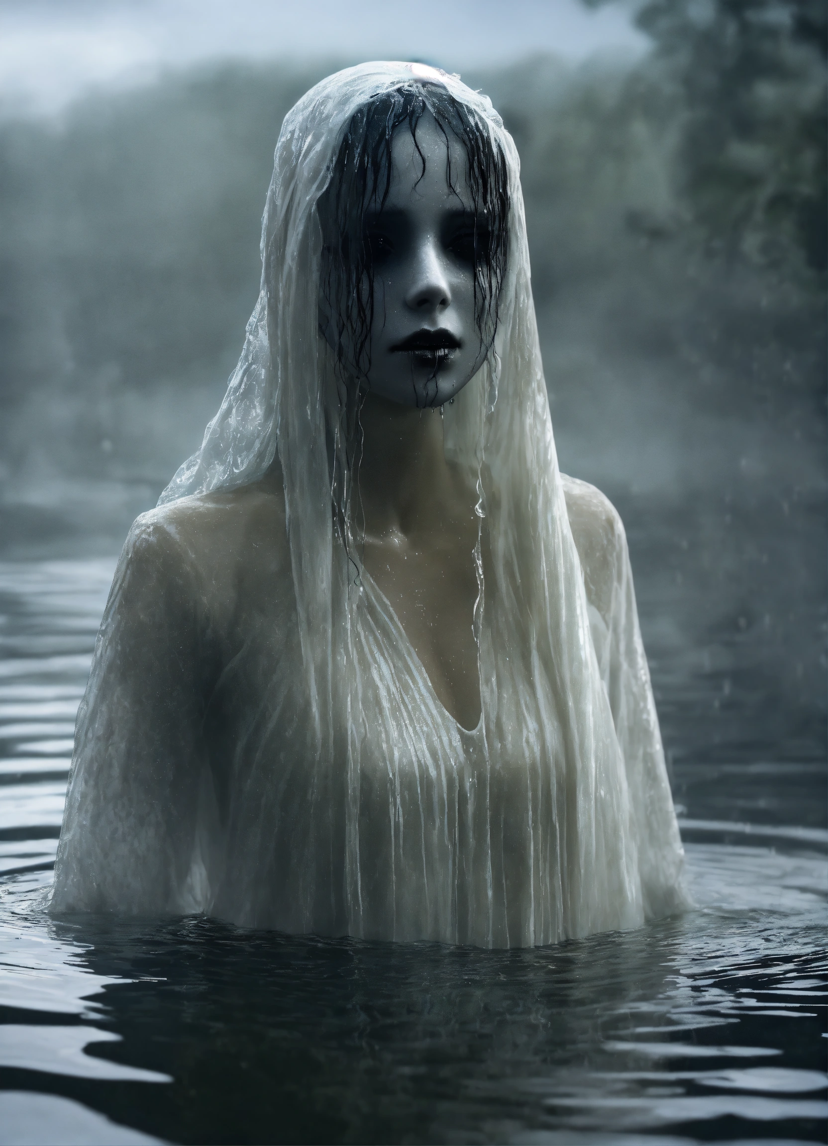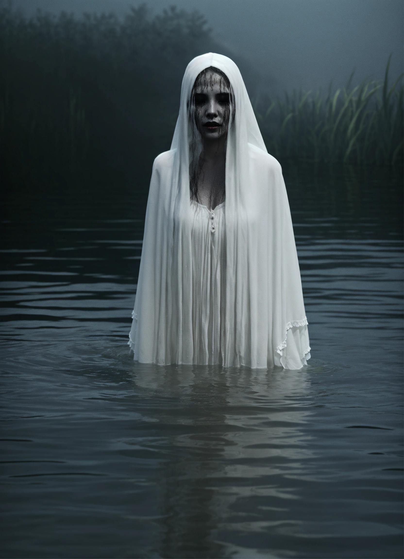 A scary la llorona in white in water. only the head and shoulders peep out of the water. she has no eyes, only black. she has black lips. pale mangled face she is wet. 3d computer model. dark. mist.