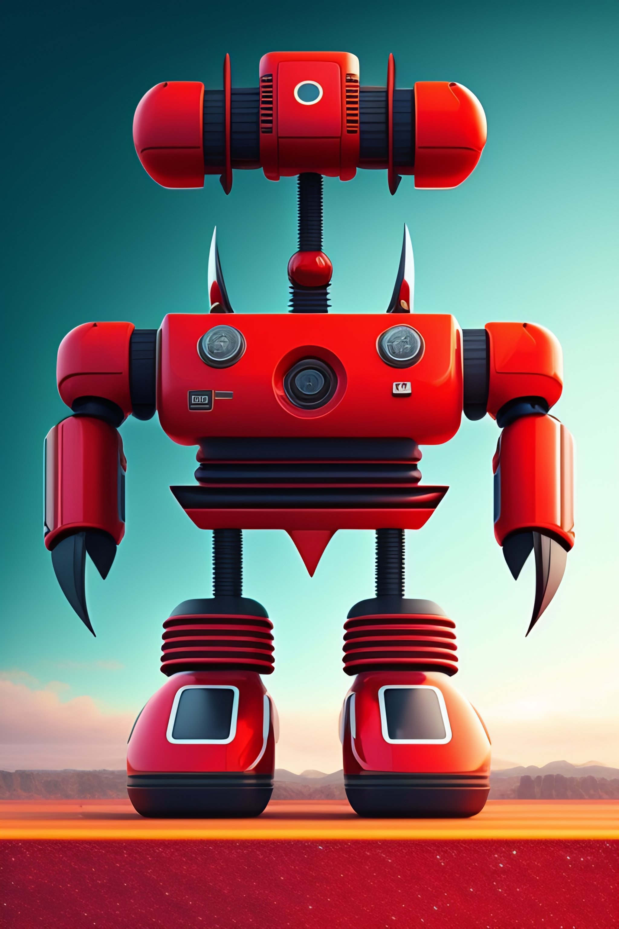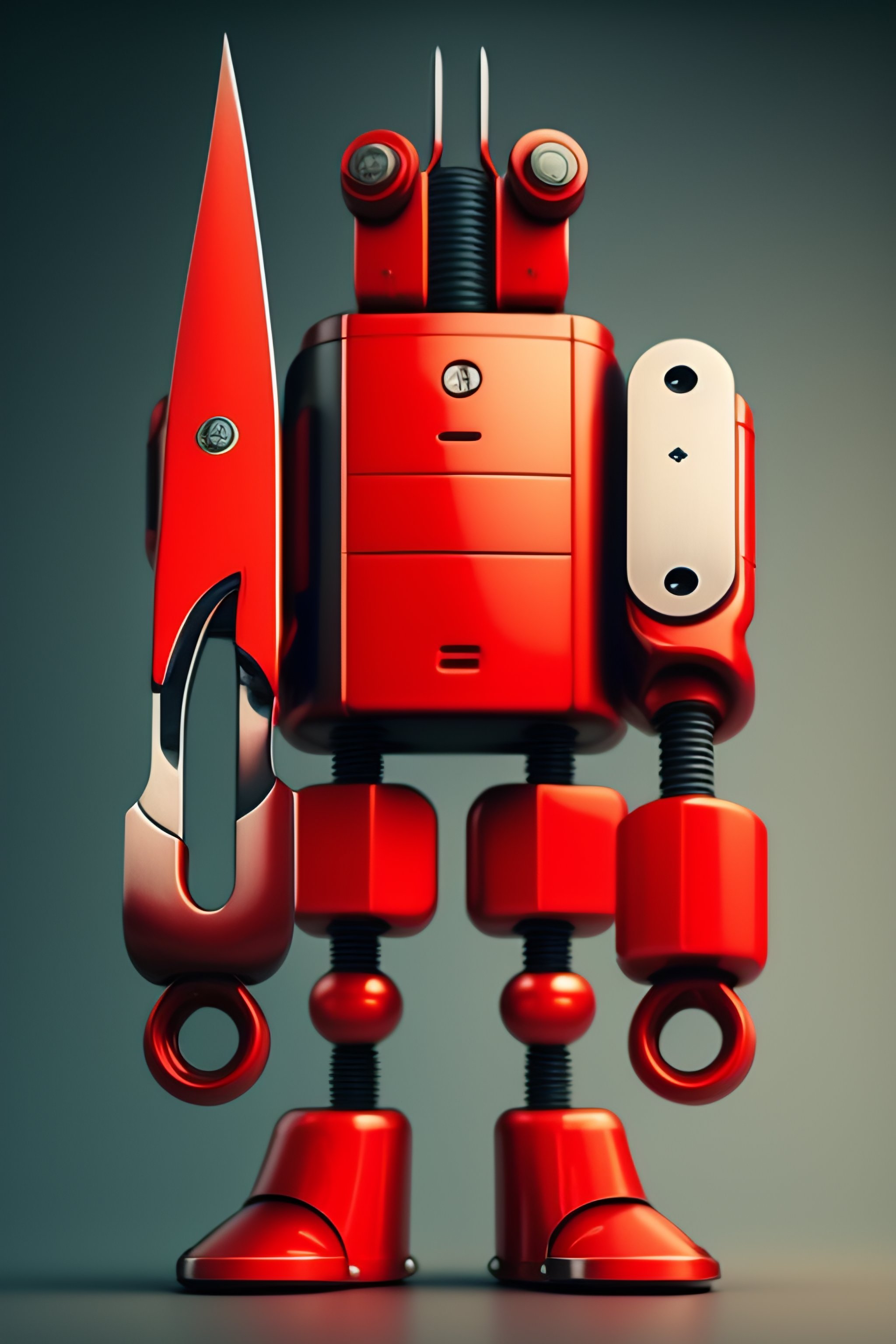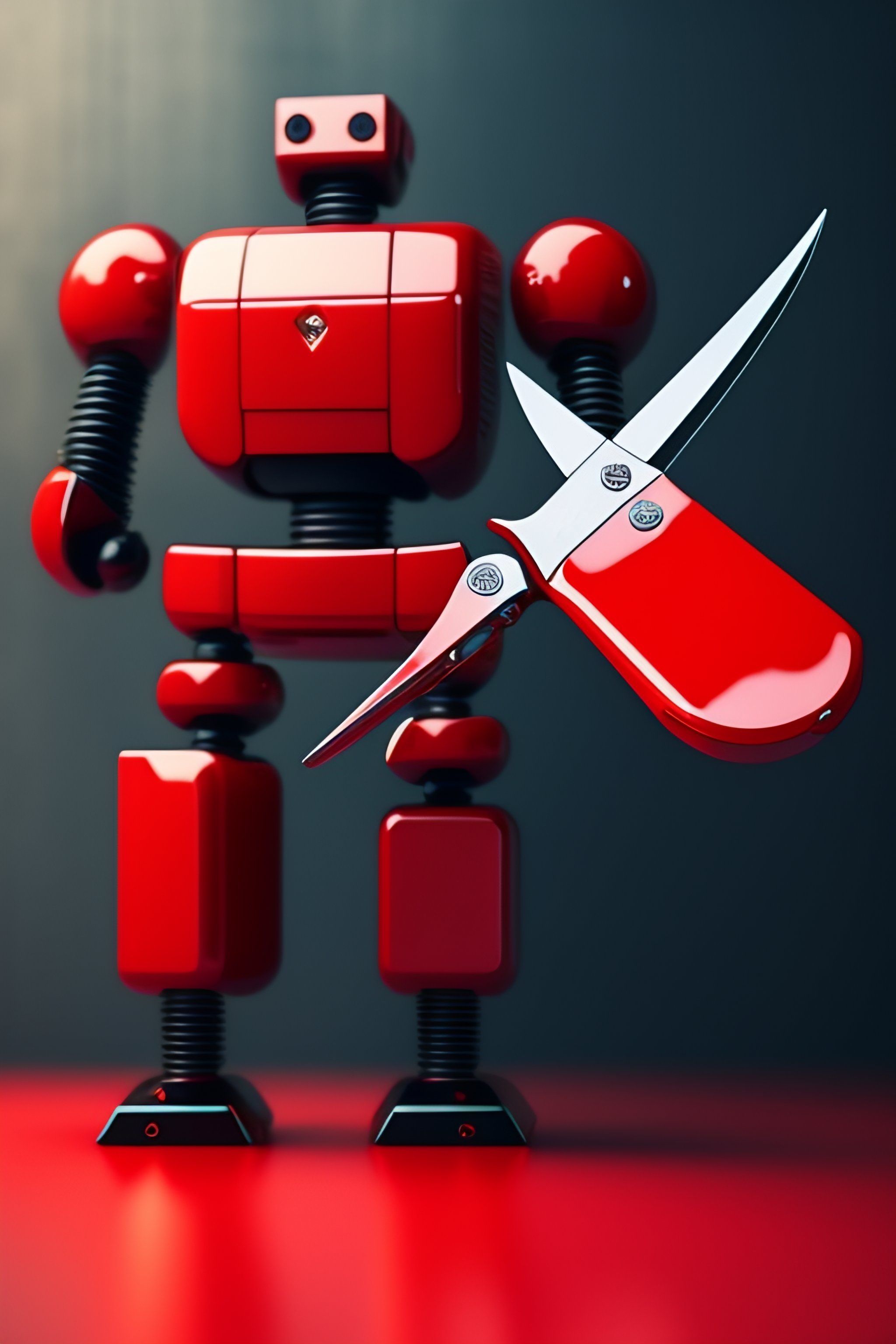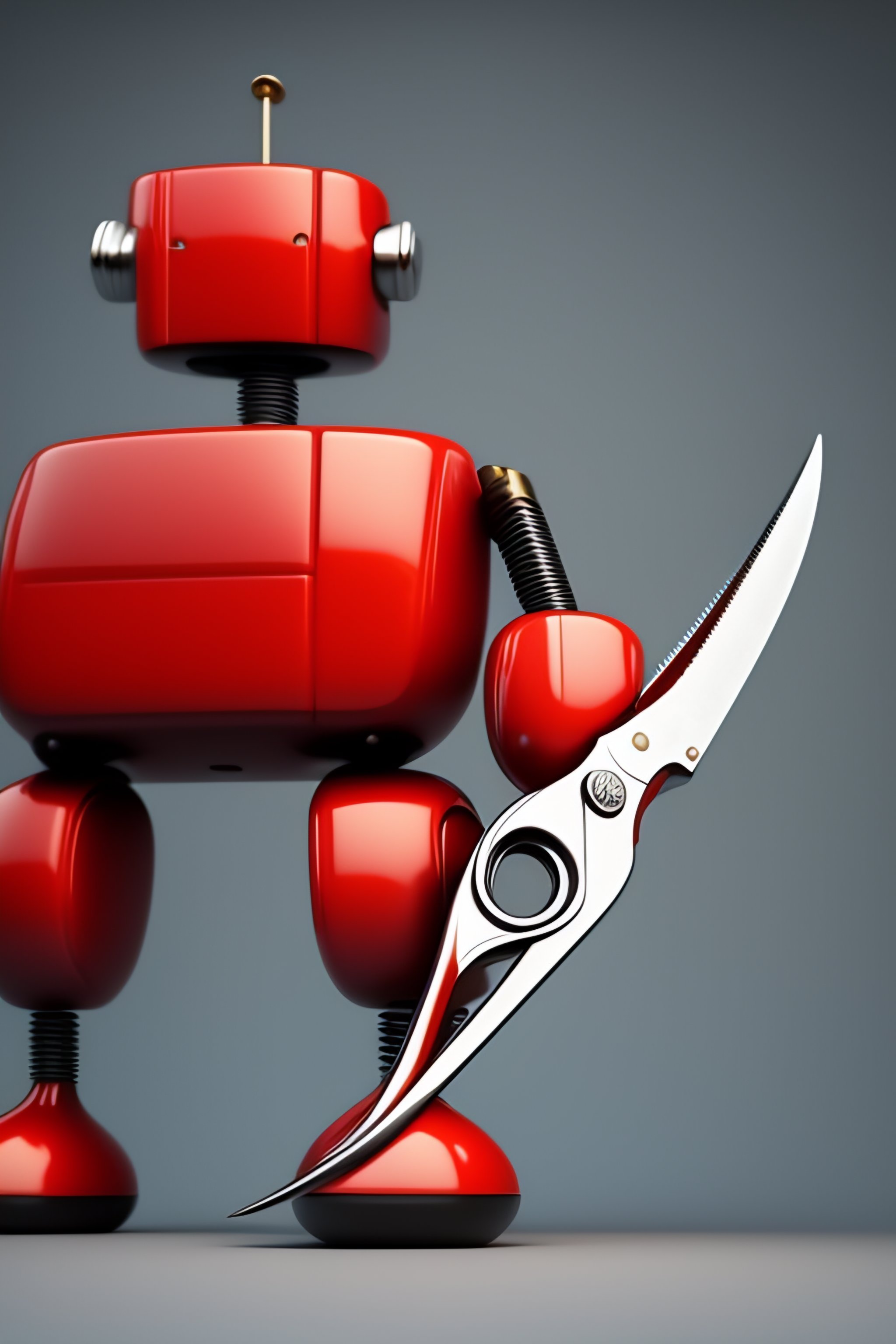 A giant pair of scissors standing on red robot legs