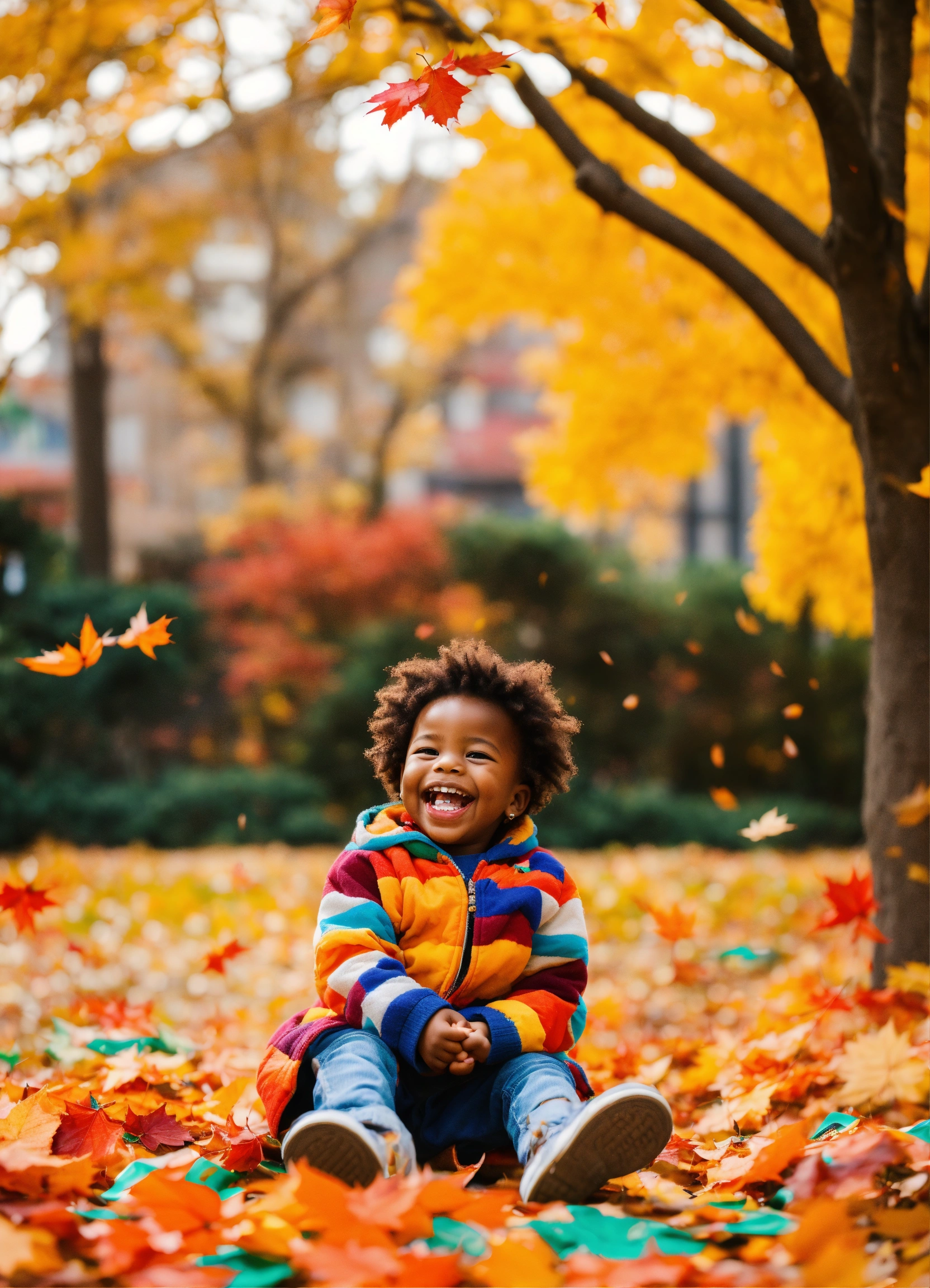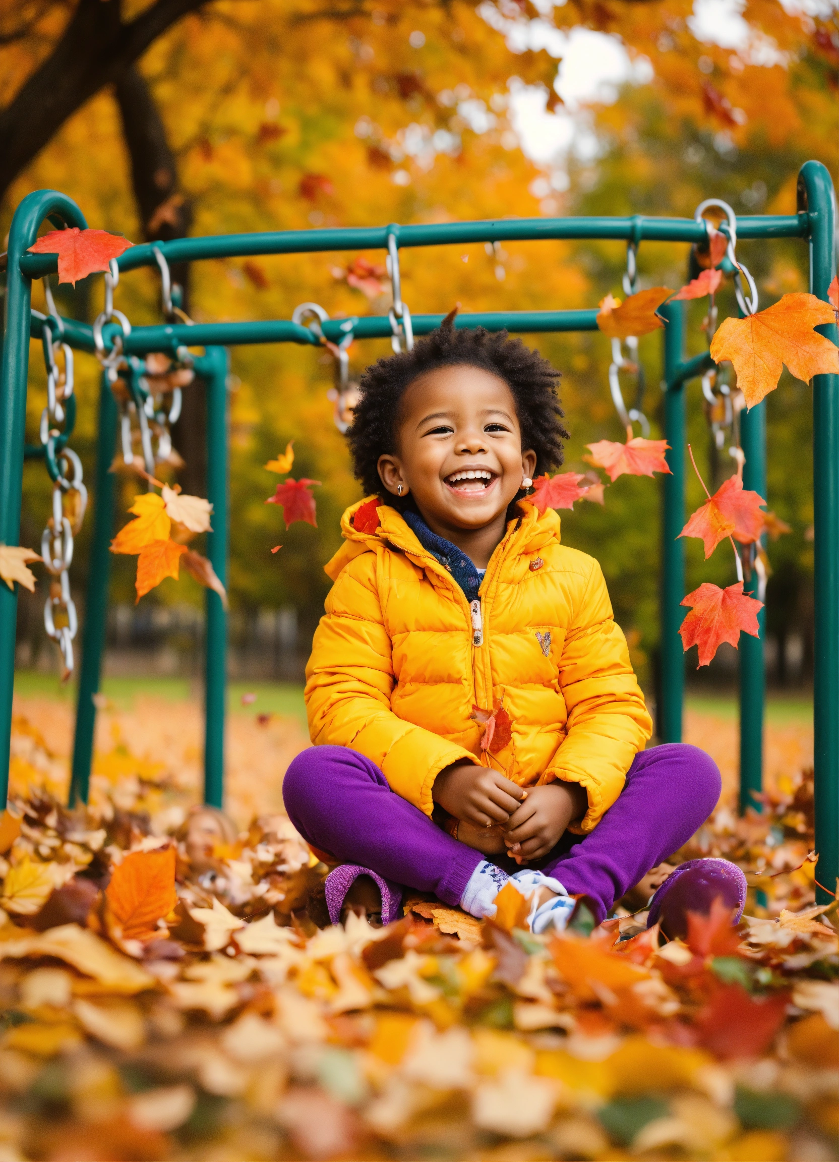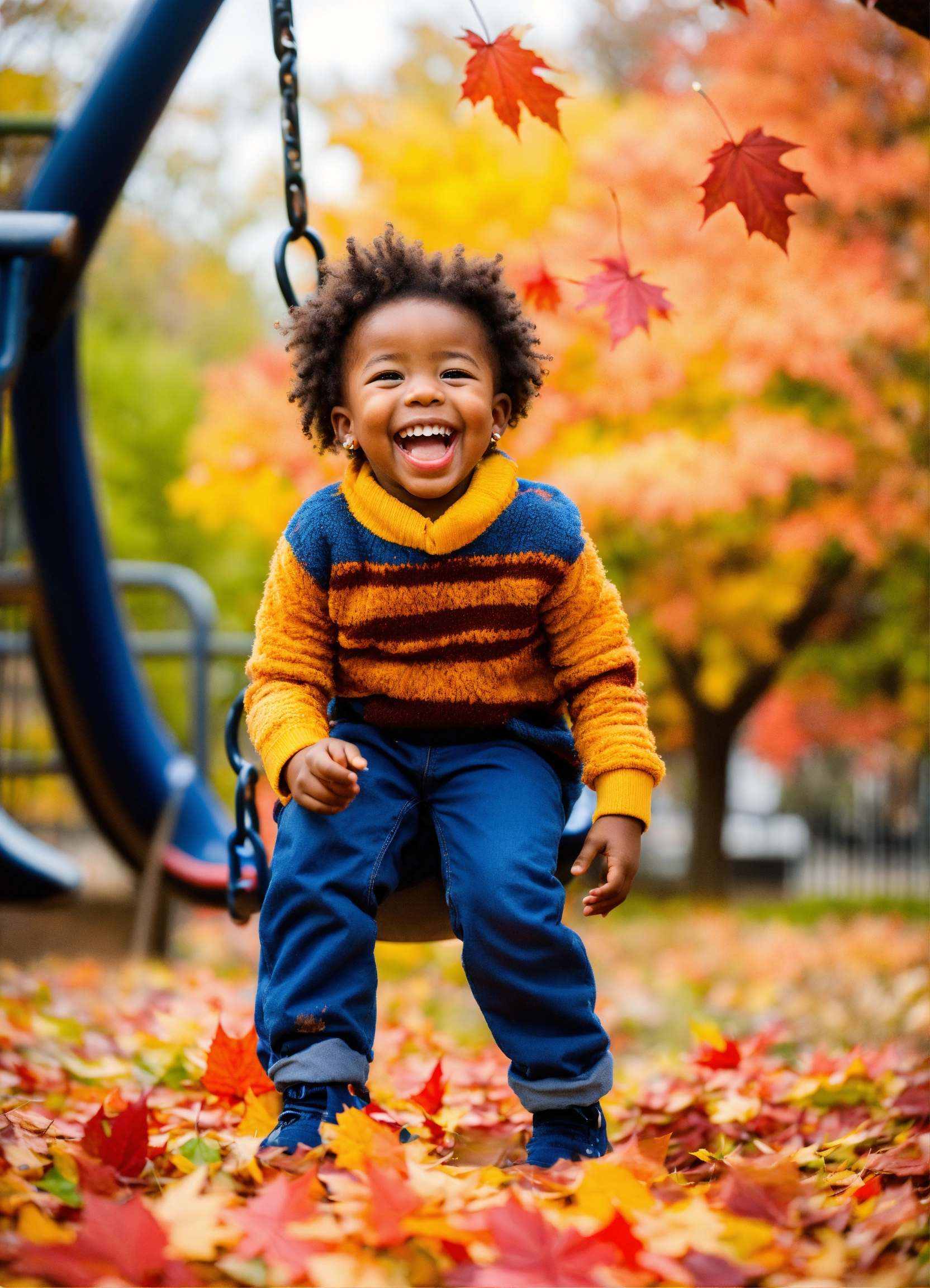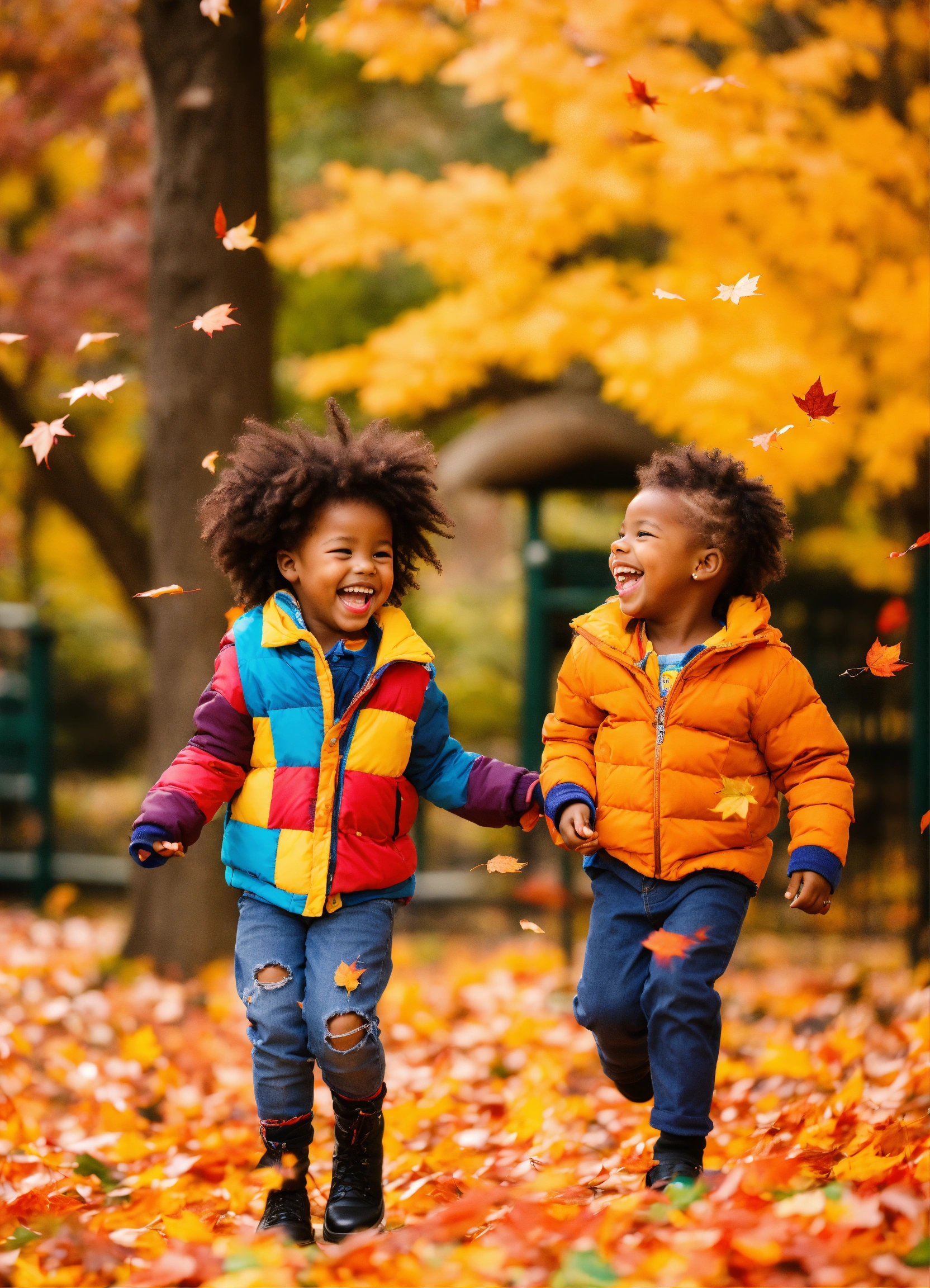 Very beautiful african american preschoolers laughing in a playground with beautiful vibrant colored fall leaves falling from trees all around them