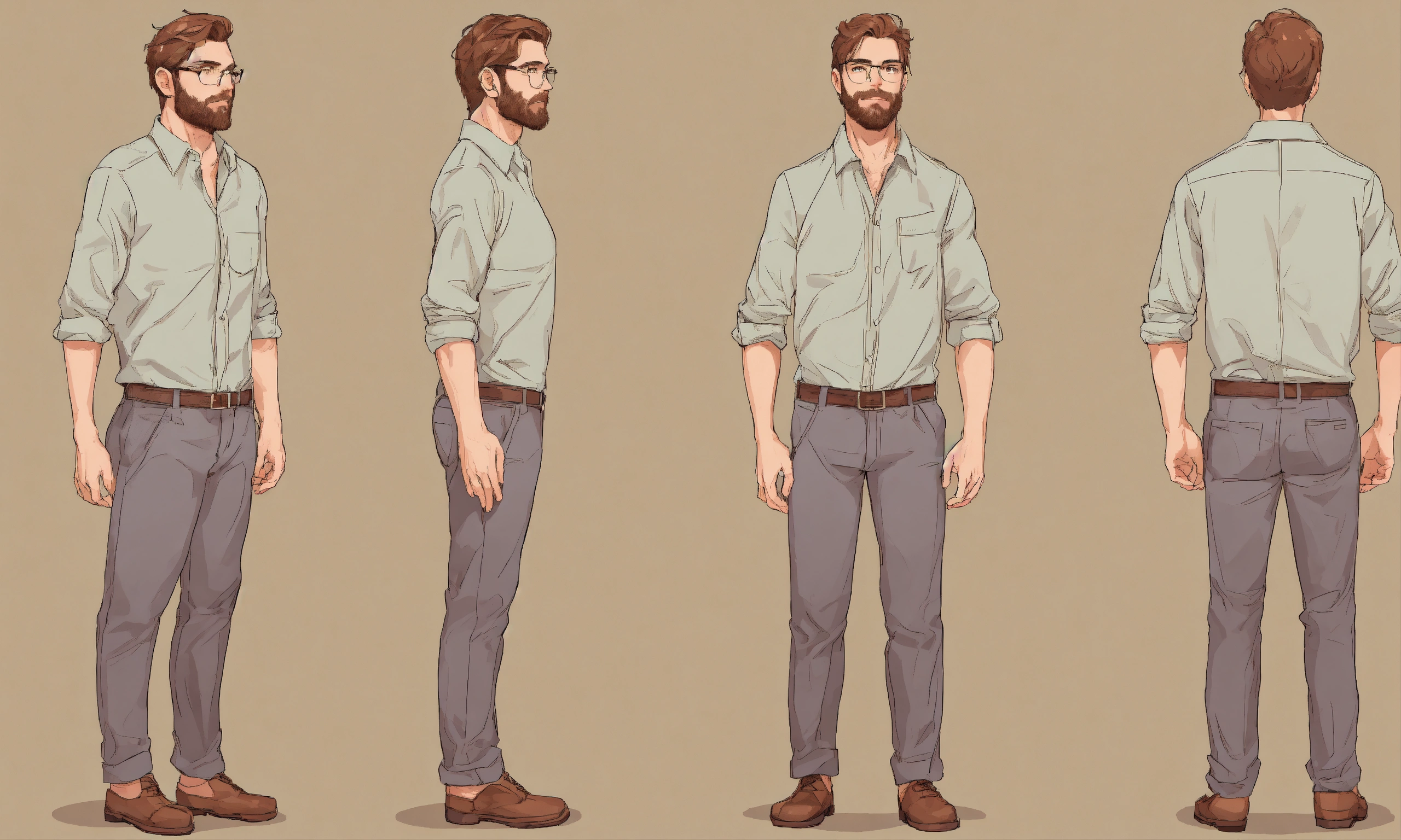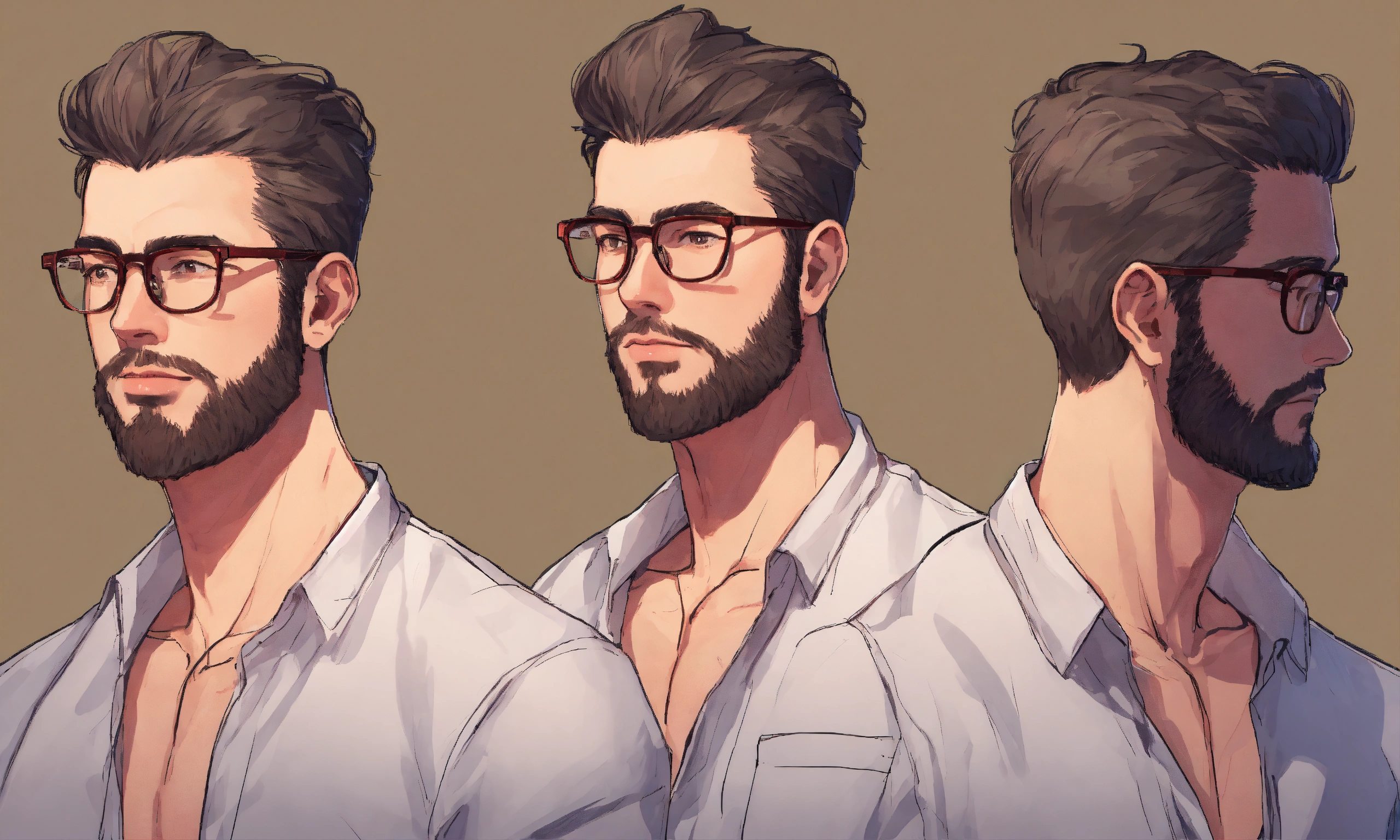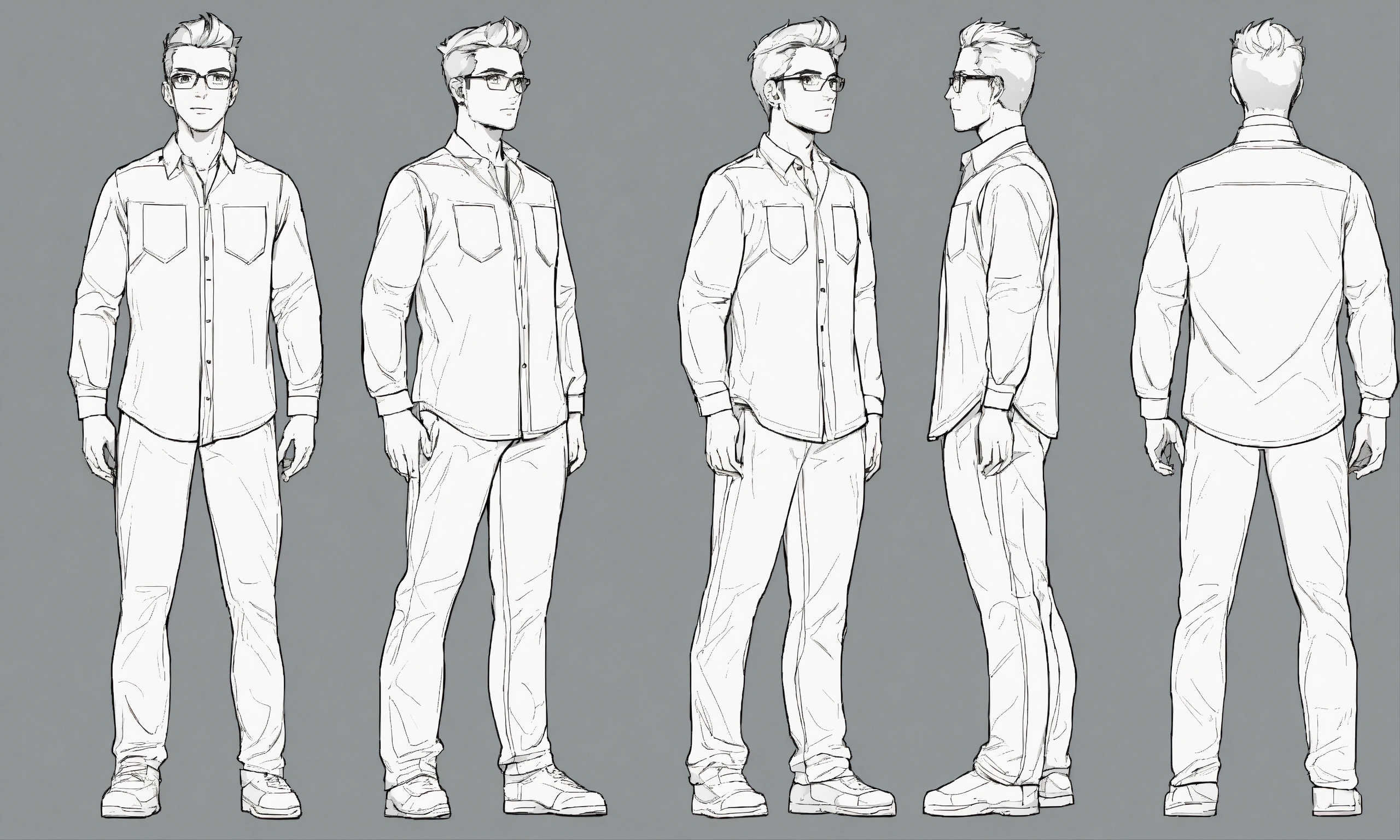 Full head to feet, front, back, side pose, very high detailed 2d vector character design for a handsome man with glasses in transparent nighty