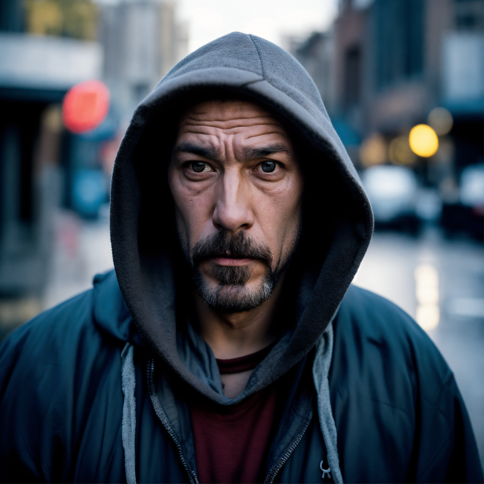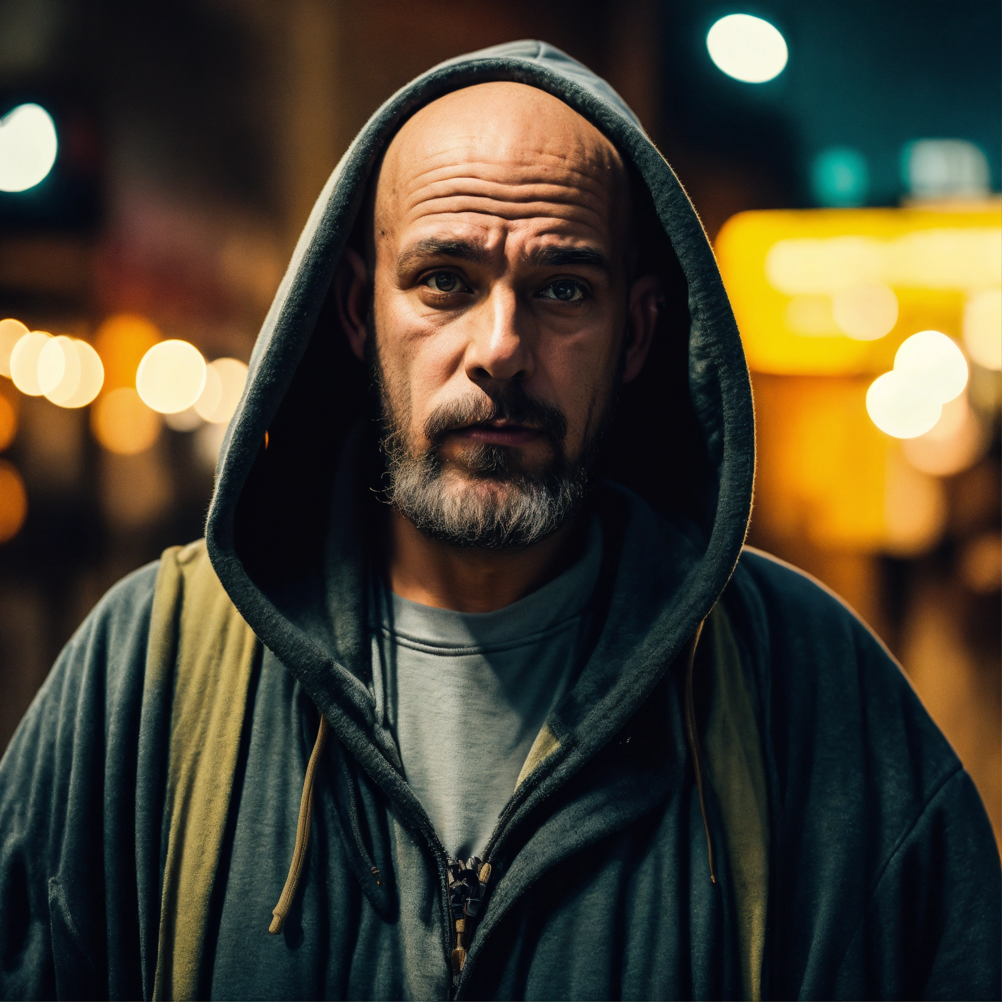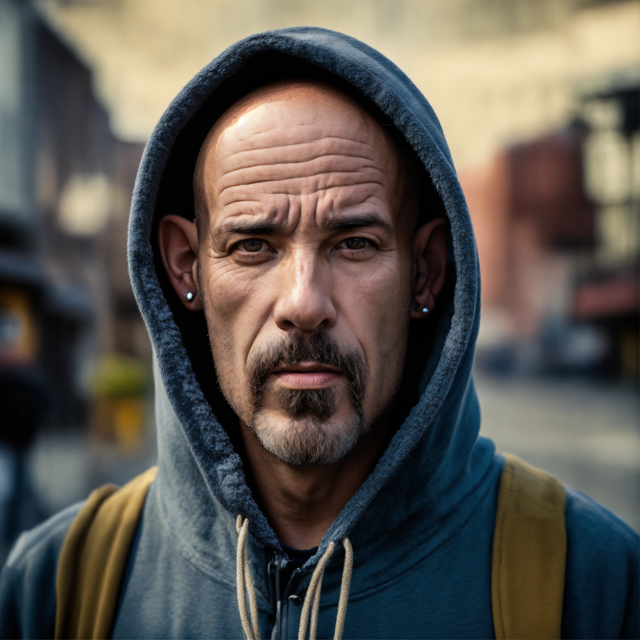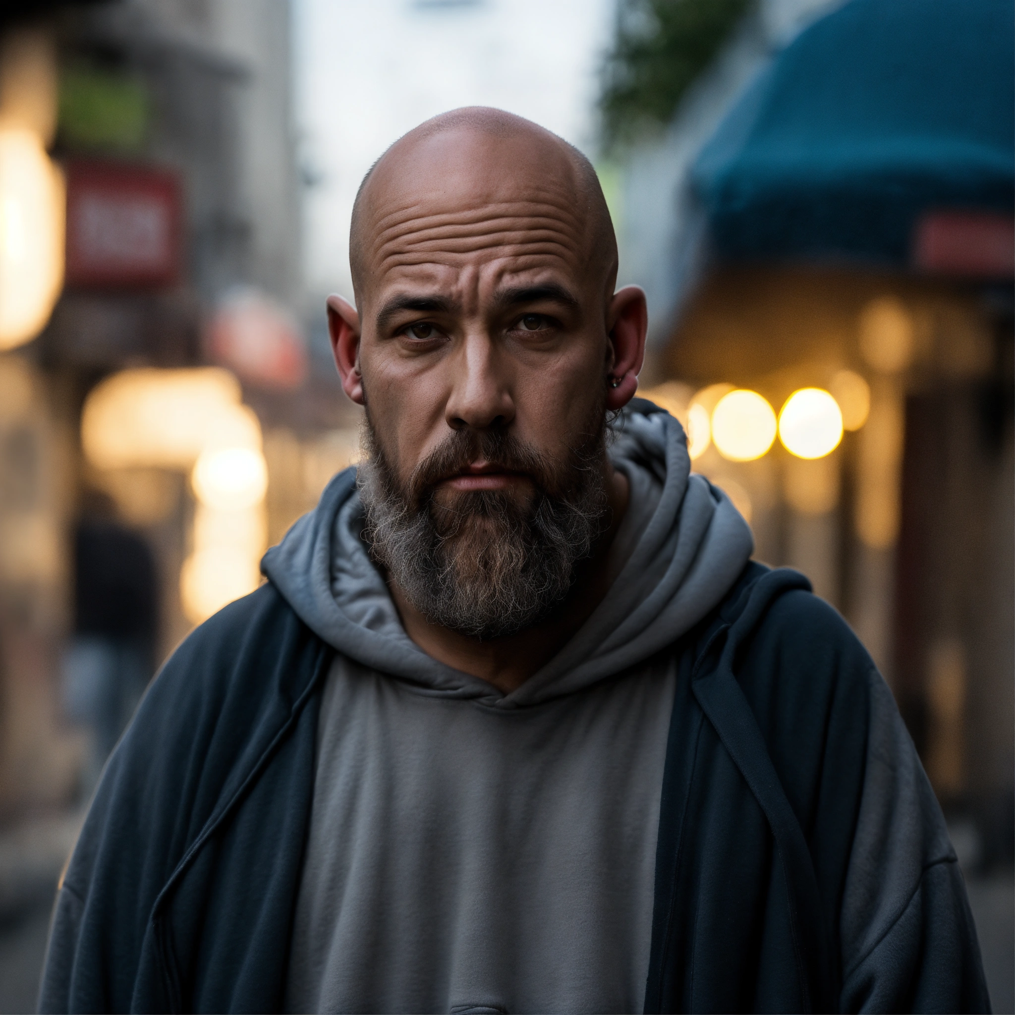 A homeless huge man with a huge lumpy bald head, a tiny goatee, protruding forehead, sunken silver eyes, crooked mouth, large ears, wearing a hoodie up over his head, standing in the street